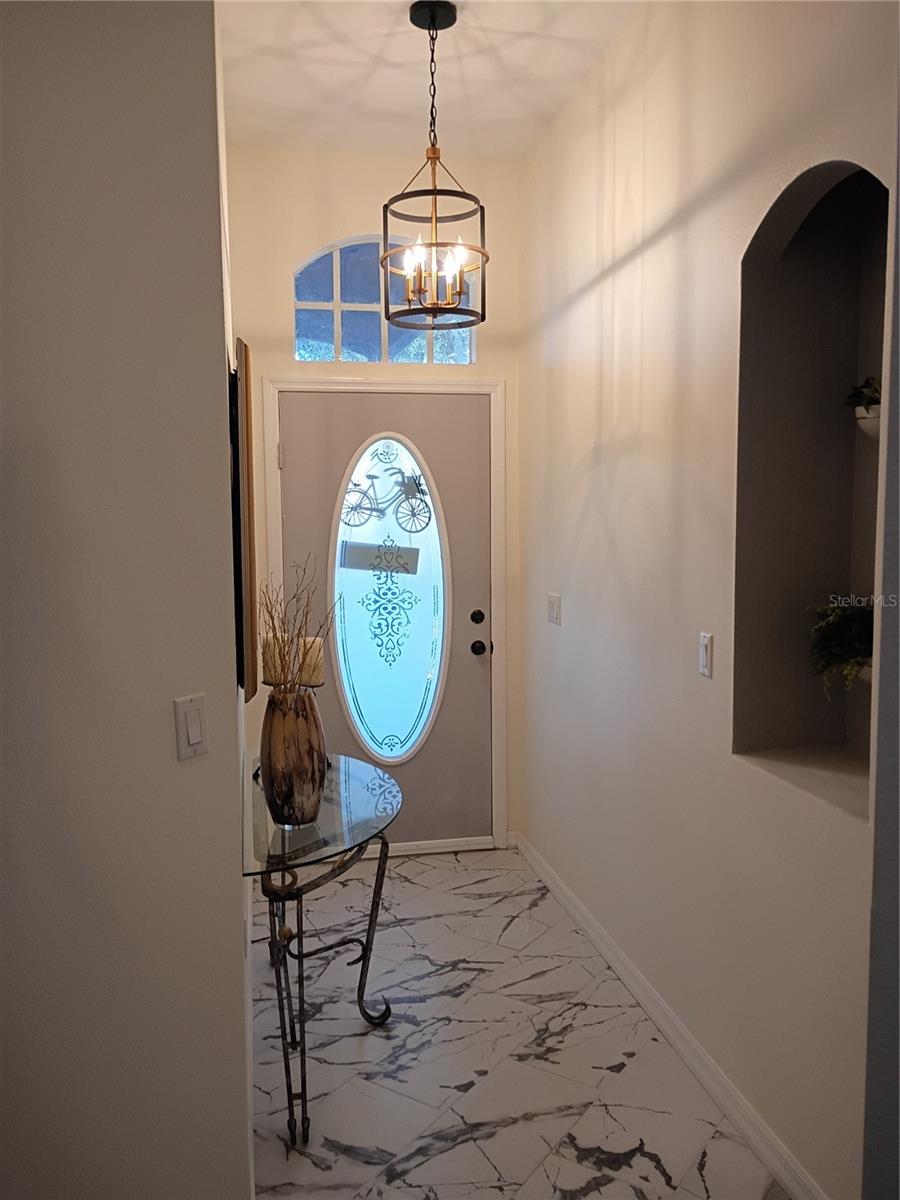 Welcome to this beautiful villa in the gated 55+ golf community of The Greens at Summertree. This pet-friendly neighborhood offers low-maintenance living with resort-style amenities. The bright, open floor plan features 10-foot ceilings and abundant natural light. The owner is currently using the flex room as a dining room, but it can also serve as a home office or hobby space. The 23 foot family room was originally designed with a dining area; the ceiling light was removed and capped but can be easily added back. The updated kitchen showcases quartz countertops, two-toned cabinetry, tile backsplash, gold-toned fixtures, and pendant lighting. The primary suite includes a walk-in closet and a renovated en suite bath with quartz counters and a walk-in shower. The guest bath offers a convertible shower/tub with updated tile and granite countertops. Enjoy outdoor living on the screened patio with peaceful views or relax on the front porch swing. Additional features include central vacuum, in-wall pest control, Ring doorbell, newer appliances, 2019 water softener, gutter guards, roof replaced 2021 and a brand new 2025 A/C with a 10-year transferable warranty. HOA covers internet, cable, lawn care, irrigation for the lawn and amenities including two pools (one heated), fitness center, sauna, steam room, tennis and bocce courts, ballroom, walking trails, ponds, and a nearby 9-hole pay-per-play golf course. Conveniently located near shopping, dining, and healthcare.