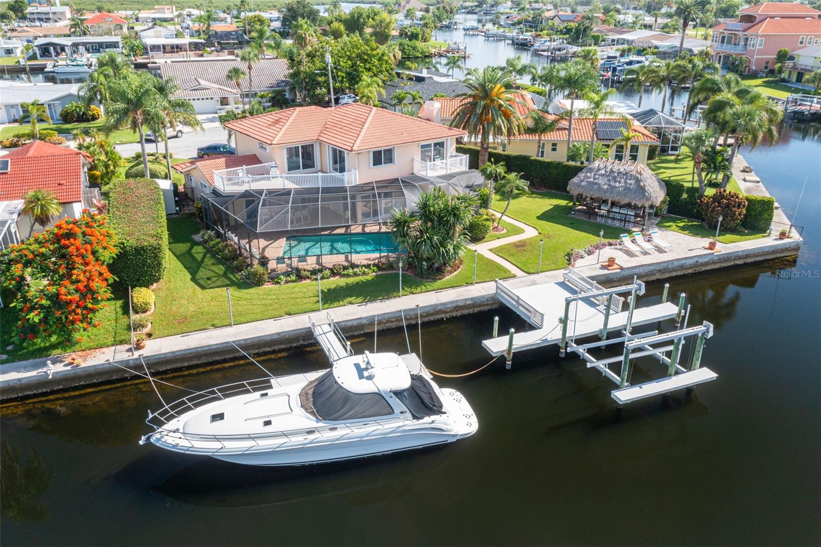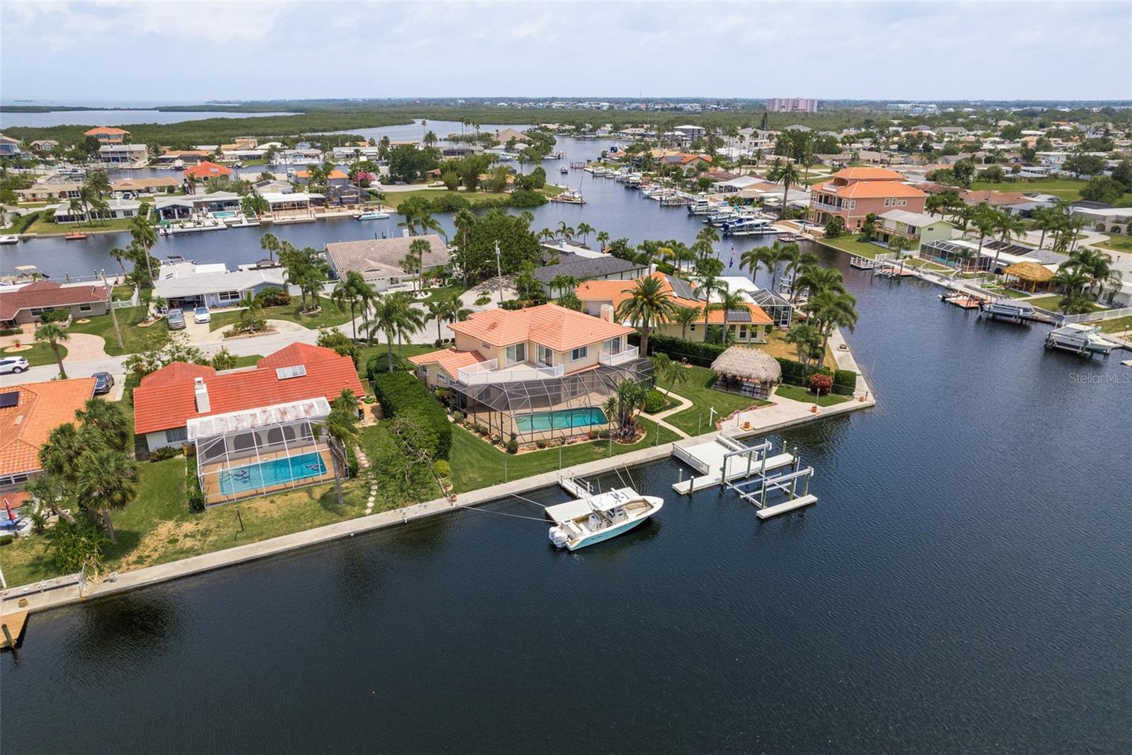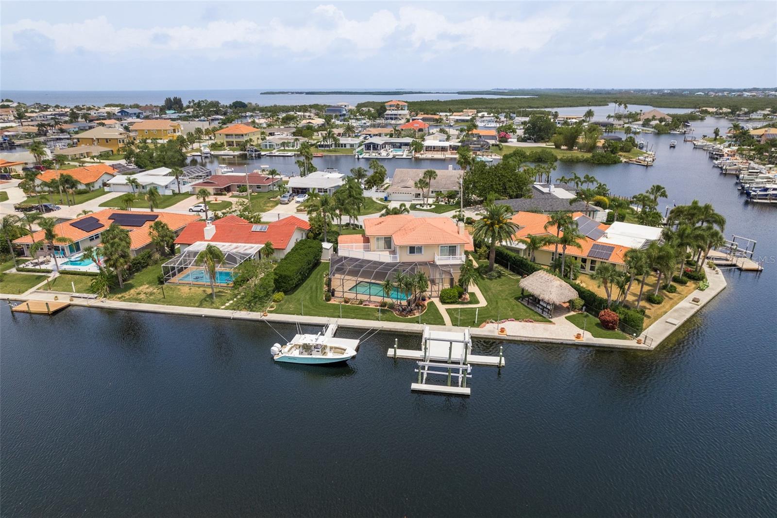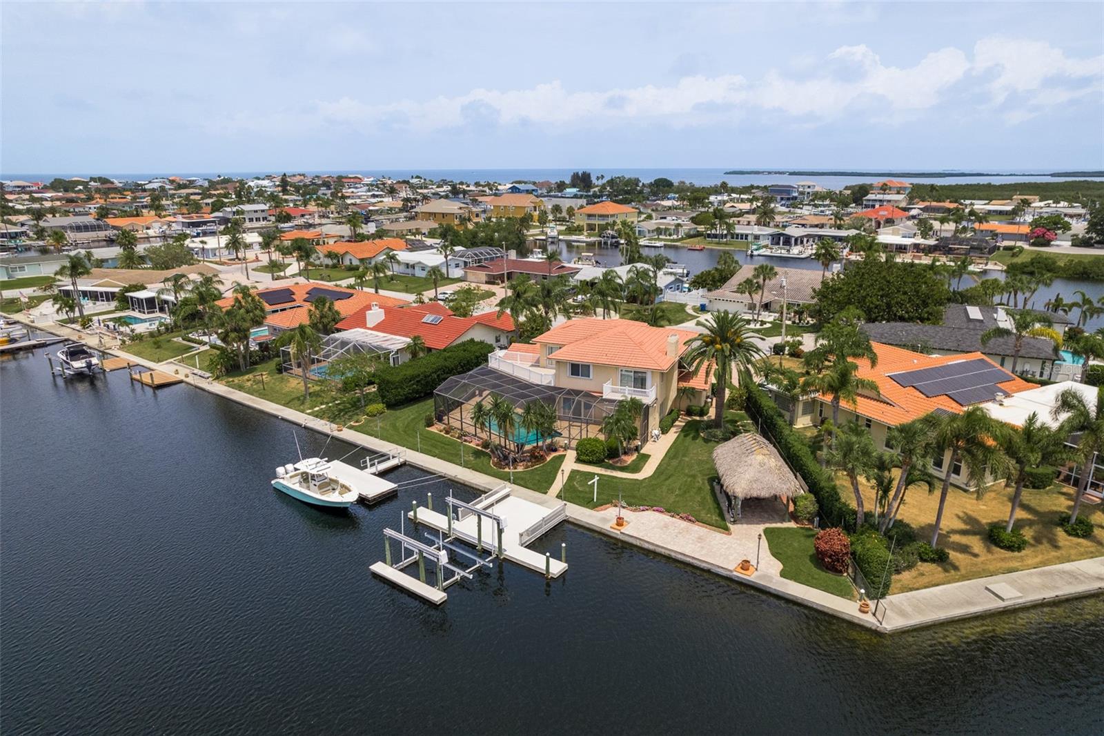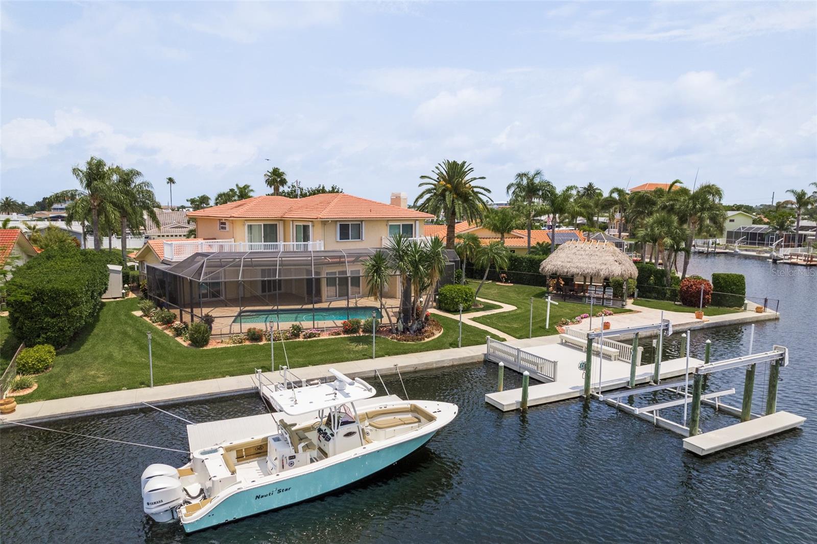 Discover your coastal paradise in an exquisite waterfront gem in the sought-after Gulf Harbors community! This 4 bedroom with den/office with 3 ½ bath impeccably maintained home is nestled on a quiet cul-de-sac and includes a fenced yard, mature landscaping, and privacy hedges around a refreshing screened pool, Tikki hut and bar under a covered lanai—steps away from 147’ of seawall / Bulkhead, a 24,000 lb boat lift, and two docks on a deep water canal. Whether you enjoy exploring the Gulf of Mexico, the fabulous restaurants, microbreweries, and shops in historic New Port Richey, or entertaining at home with surround sound throughout the open floor plan, you’ll enjoy immersing yourself in all this captivating property and community. With updated amenities, open design, and unrivaled proximity to the Gulf, owners of this 2,915 square foot home in a golf-cart community have access to a private beach, civic association, yacht club, two boat ramps, clubhouse, and a community park. With a formal dining room, bar, office, custom-designed kitchen with stainless steel appliances, granite counters, breakfast bar, and second-floor balconies with gorgeous ocean views, this is a rare opportunity for discerning buyers to own a slice of paradise. Contact me today for a list of upgrades, more information about this ultimate escape (a.k.a. your new home), and to schedule your private tour by water or land. Experience coastal living at its finest!