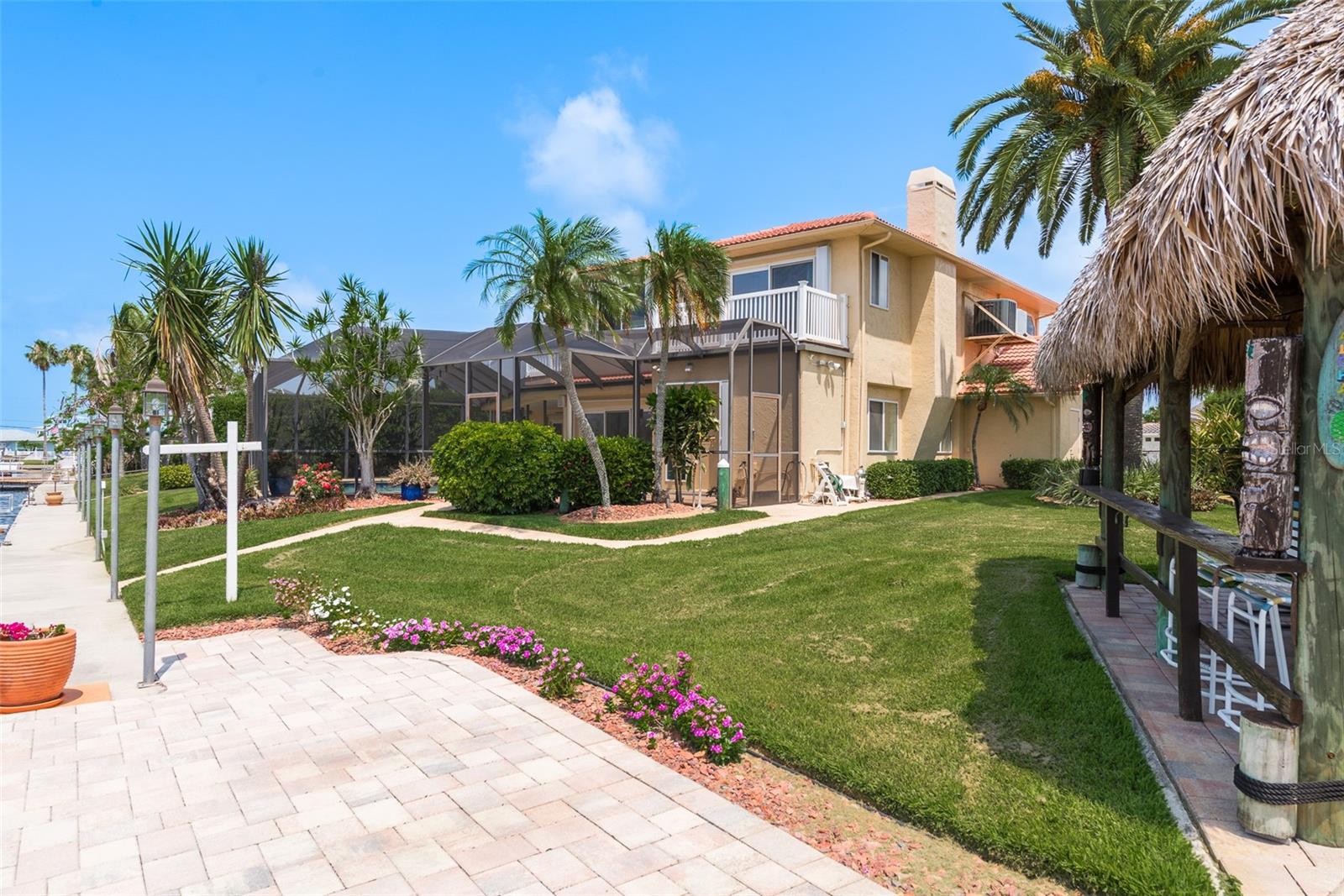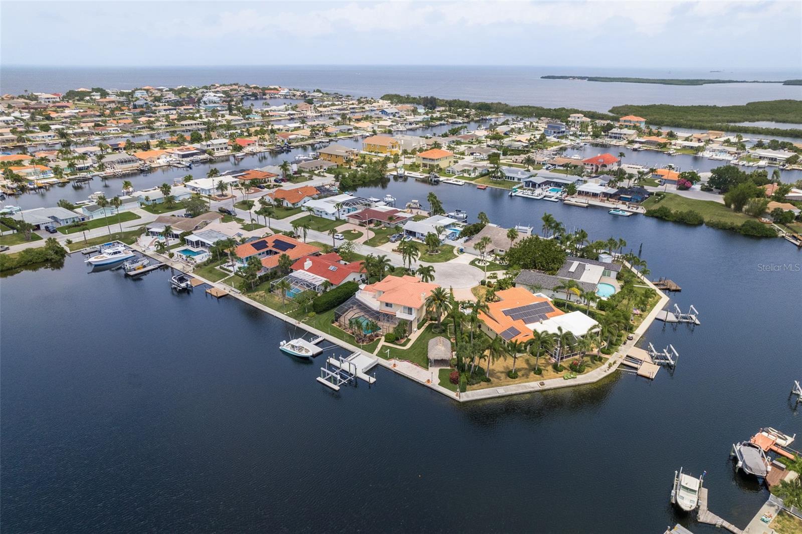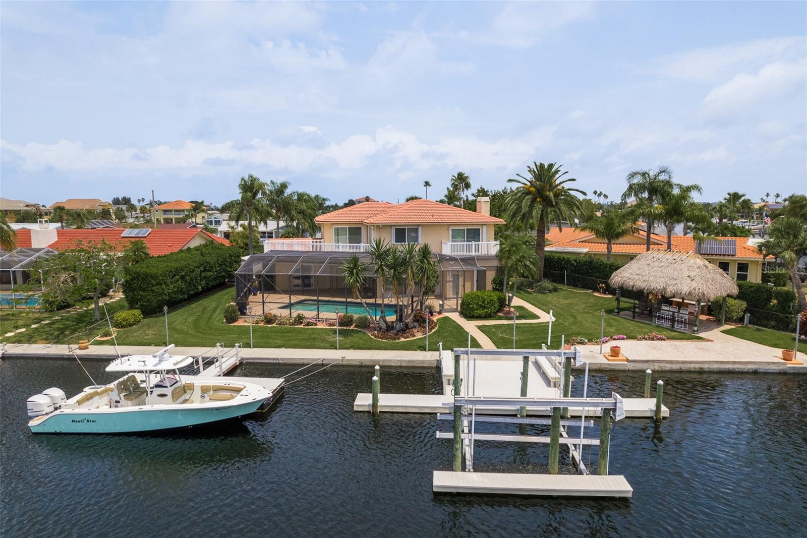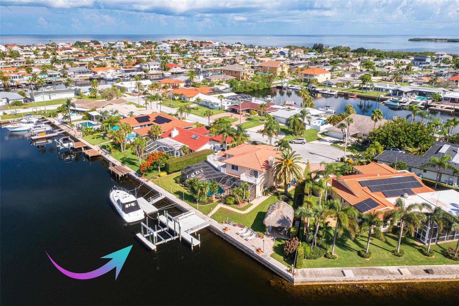 Discover your coastal paradise in an exquisite waterfront gem in the sought-after Gulf Harbors community! This 4 bedroom with den/office with 3 ½ bath impeccably maintained home is nestled on a quiet cul-de-sac and includes a fenced yard, mature landscaping, and privacy hedges around a refreshing screened pool, Tikki hut and bar under a covered lanai—steps away from 147’ of seawall / Bulkhead, a 24,000 lb boat lift, and two docks on a deep water canal. Whether you enjoy exploring the Gulf of Mexico, the fabulous restaurants, microbreweries, and shops in historic New Port Richey, or entertaining at home with surround sound throughout the open floor plan, you’ll enjoy immersing yourself in all this captivating property and community. With updated amenities, open design, and unrivaled proximity to the Gulf, owners of this 2,915 square foot home in a golf-cart community have access to a private beach, civic association, yacht club, two boat ramps, clubhouse, and a community park. With a formal dining room, bar, office, custom-designed kitchen with stainless steel appliances, granite counters, breakfast bar, and second-floor balconies with gorgeous ocean views, this is a rare opportunity for discerning buyers to own a slice of paradise. Contact me today for a list of upgrades, more information about this ultimate escape (a.k.a. your new home), and to schedule your private tour by water or land. Experience coastal living at its finest!