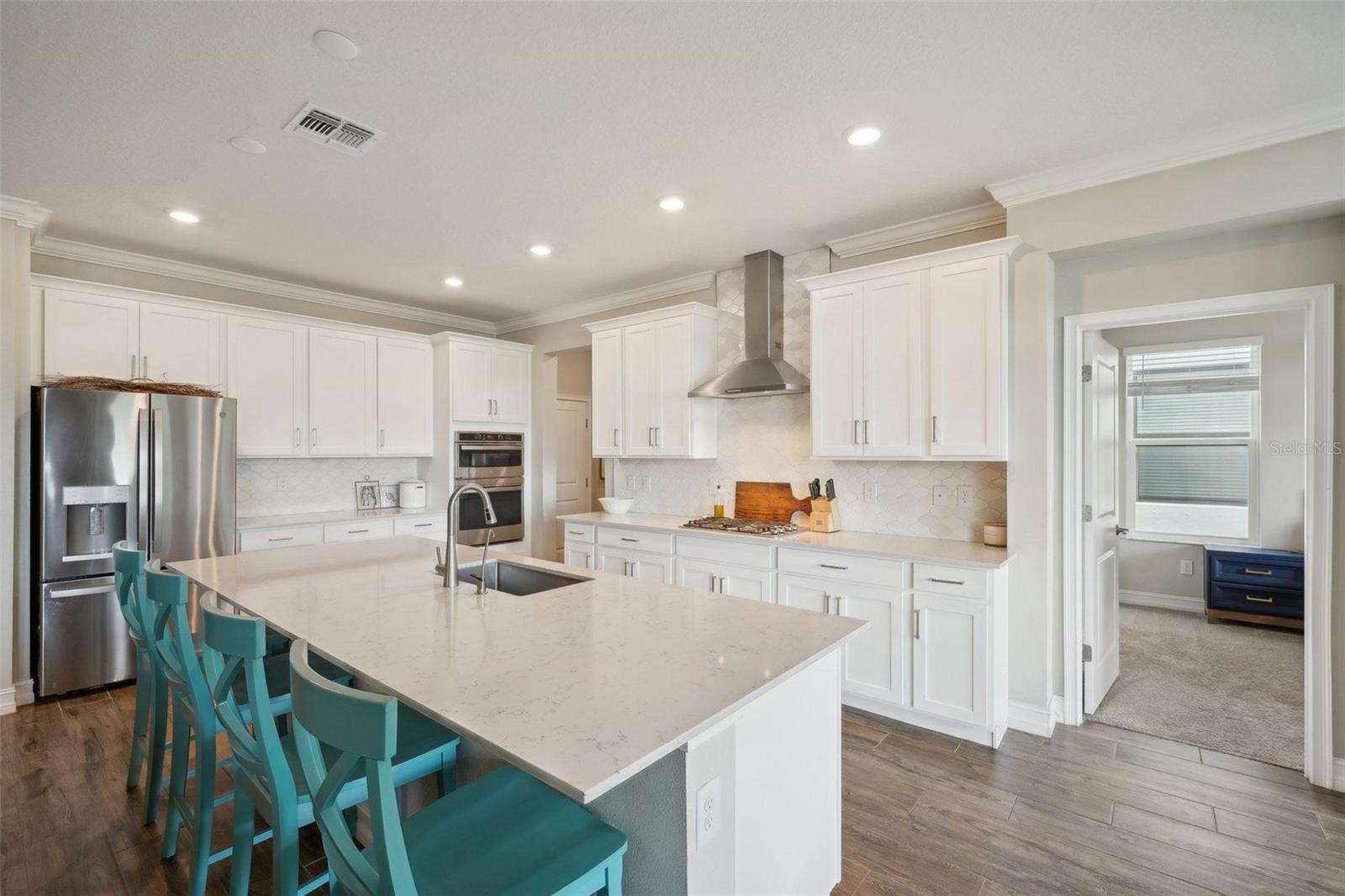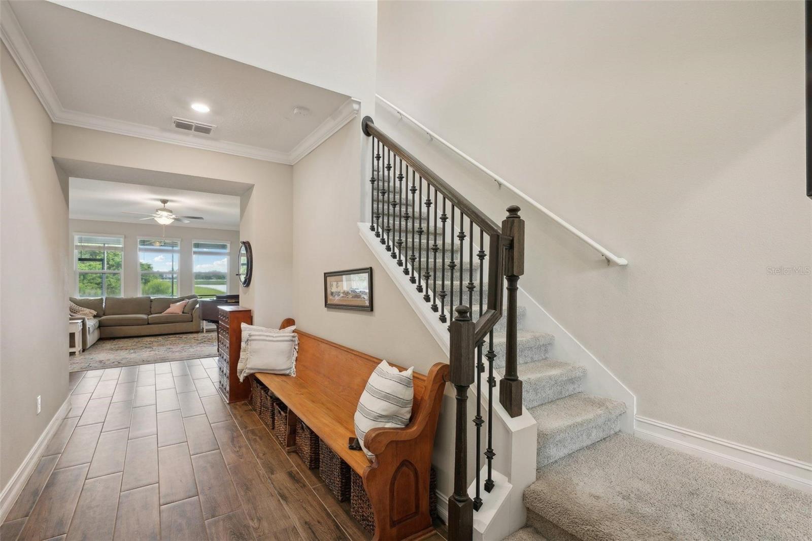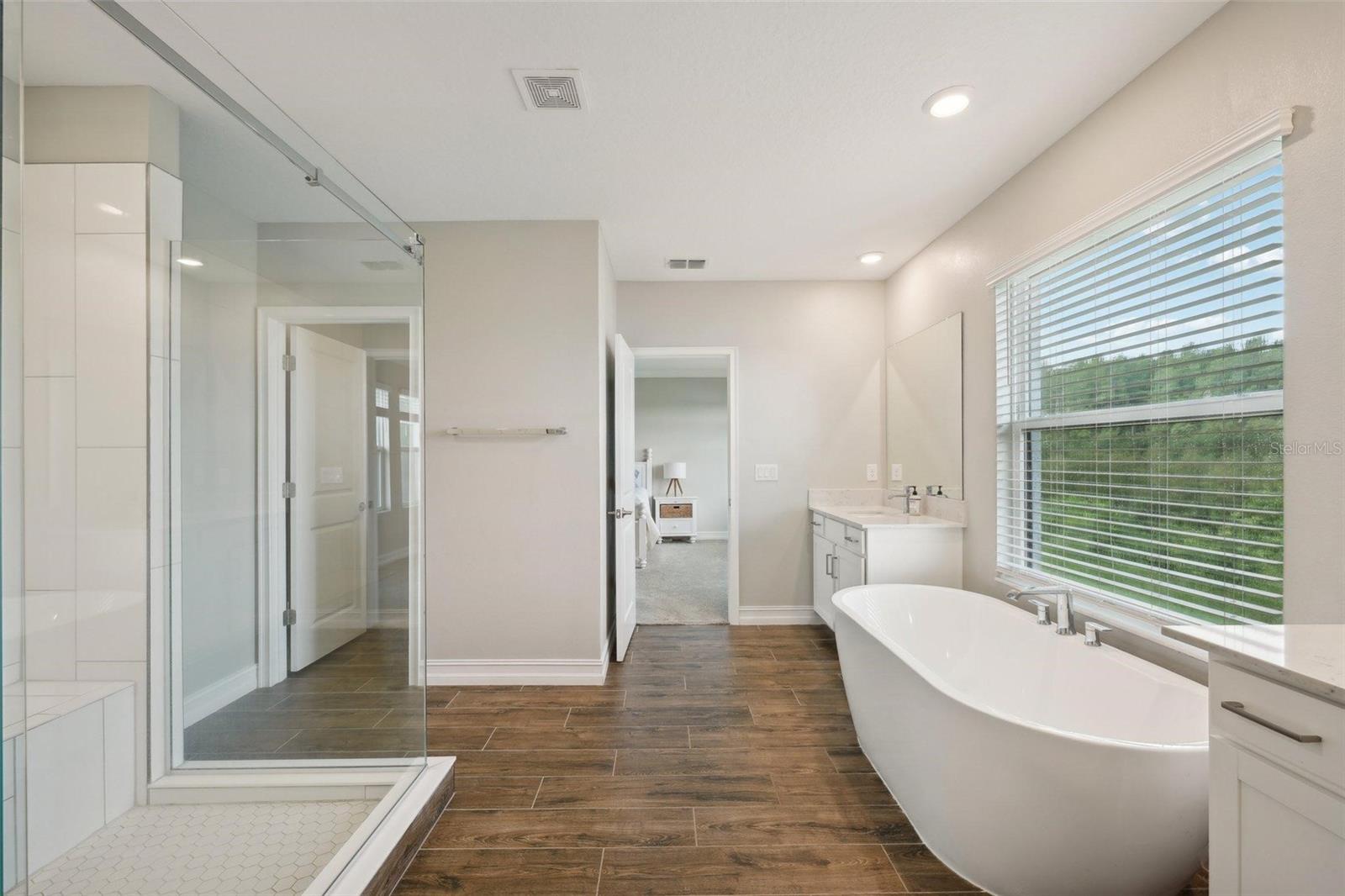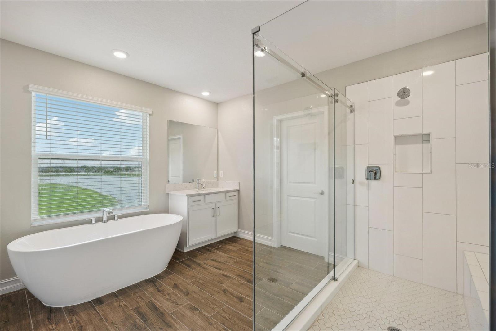 Welcome to your new beautiful spacious home in Bryant Square Estates. This 2022 home itself is stunning, and the location takes it to the next level. Situated on a premium lot with CONSERVATION and LAKE VIEWS, you can expect to see deer, otter, turtles, and bald eagles as you enjoy the SUNSET each night from the upgraded screened-in-lanai. The huge back yard allows for a pool if desired (ask for info on luxury plans with enclosure that have already been designed for this specific model). The home is within walking/golf cart distance to restaurants, grocery stores, multiple fitness facilities, and other great shopping. Not to mention, the neighborhood has its own designated walkway to the middle school and high school. Bryant Square also has 2 LARGE RESORT-LIKE POOLS and a playground with young families, food trucks, and many seasonal community events. Living at the center of Trinity, you are ideally located in the Tampa Bay area, making it easy to drive to Orlando, Tampa, St Pete, the airports, beaches, and many other popular spots. Now let's talk about the inside of this amazing home. The beautiful details of the interior begin in the foyer - vaulted ceilings, WOOD PLANK TILE throughout, and crown molding. Where the home really shows off is in the kitchen. The massive island doubles as a breakfast bar with room for four. Enjoy quartz countertops, GAS STOVE, double oven (microwave doubles as a convection oven), new Samsung fridge, and more cabinet space than you’ll know what to do with. LED lighting throughout with opportunity for pendant lights over the island and dining. Between the kitchen and garage is a separate mail/coffee area and massive WALK IN PANTRY. The living and dining rooms are right off the kitchen for an inviting, connected living space with large windows to let the outside in. Off the kitchen is a carpeted room with full bath and walk in closet, an exceptional en-suite for guests or in-laws. There is a half bath on your way upstairs. Coming to the second level, you'll walk into an incredible spacious entertaining space in the loft, complete with WET BAR, mini fridge, and quartz countertops. Upstairs you’ll also find the primary bedroom, laundry, and 3 bedrooms and 3 more baths. The primary bedroom is massive, with plenty of room for an office, home gym, or lounging area. The breathtaking bathroom is luxurious with large glass shower and SOAKING TUB, split sinks, with a separate toilet room. You can bird watch from the bathtub for the ultimate spa-like experience. The walk in closet is off the bathroom, providing nice separation from the bedroom. Walk through the laundry room to the other 3 bedrooms, one of which includes an en-suite bath and double closets (Yes, this home has THREE EN-SUITE BEDROOMS). It’s so hard to find a 3 CAR GARAGE with a large driveway and this house has it! HURRICANE IMPACT RESISTANT WINDOWS! After Helene AND Milton, the only damage was a slightly bent For-Sale sign out front. Low HOA. This smart home, has ring doorbell, app/voice control, UNLIMITED HOT WATER with the tankless GAS water heater and is turn key!