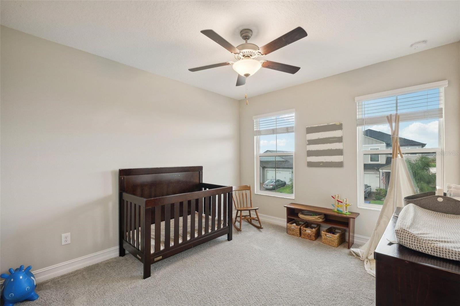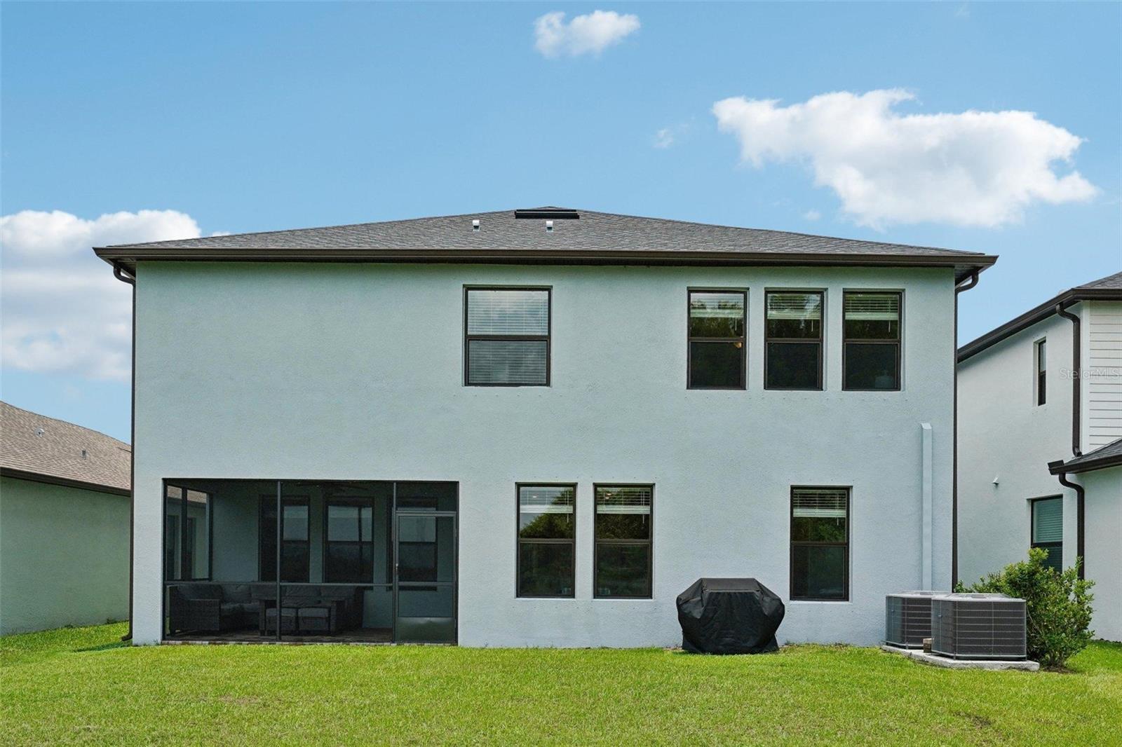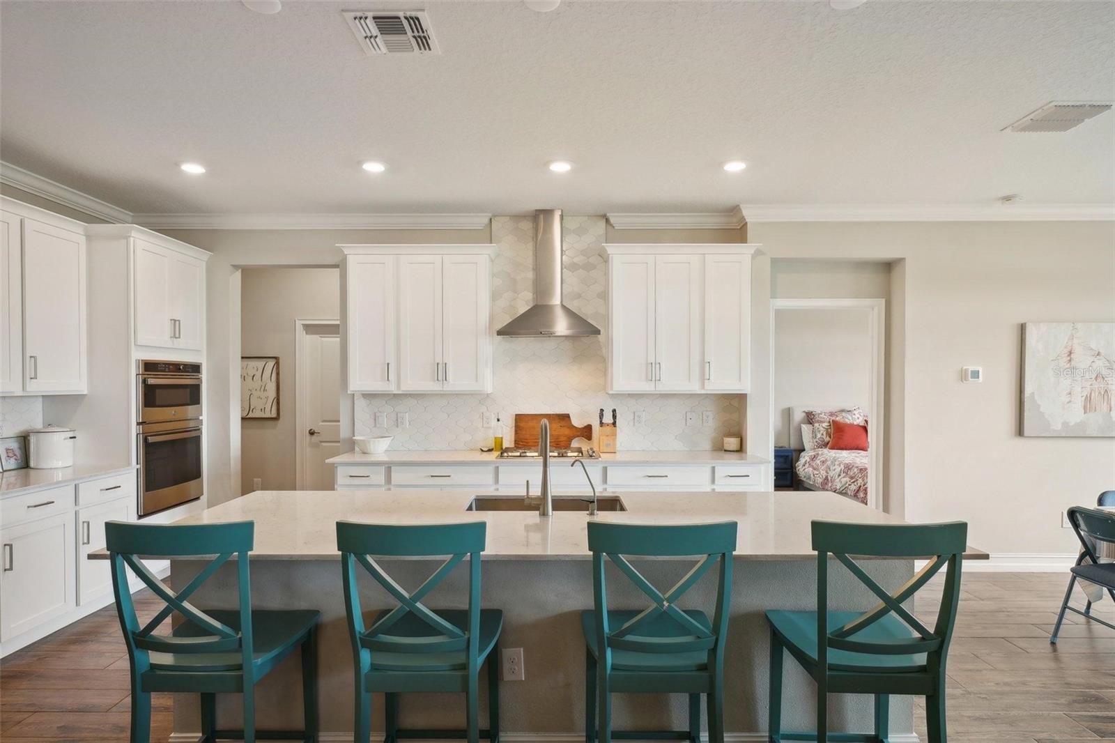 Welcome to your new beautiful spacious home in Bryant Square Estates. This 2022 home itself is stunning, and the location takes it to the next level. Situated on a premium lot with CONSERVATION and LAKE VIEWS, you can expect to see deer, otter, turtles, and bald eagles as you enjoy the SUNSET each night from the upgraded screened-in-lanai. The huge back yard allows for a pool if desired (ask for info on luxury plans with enclosure that have already been designed for this specific model). The home is within walking/golf cart distance to restaurants, grocery stores, multiple fitness facilities, and other great shopping. Not to mention, the neighborhood has its own designated walkway to the middle school and high school. Bryant Square also has 2 LARGE RESORT-LIKE POOLS and a playground with young families, food trucks, and many seasonal community events. Living at the center of Trinity, you are ideally located in the Tampa Bay area, making it easy to drive to Orlando, Tampa, St Pete, the airports, beaches, and many other popular spots. Now let's talk about the inside of this amazing home. The beautiful details of the interior begin in the foyer - vaulted ceilings, WOOD PLANK TILE throughout, and crown molding. Where the home really shows off is in the kitchen. The massive island doubles as a breakfast bar with room for four. Enjoy quartz countertops, GAS STOVE, double oven (microwave doubles as a convection oven), new Samsung fridge, and more cabinet space than you’ll know what to do with. LED lighting throughout with opportunity for pendant lights over the island and dining. Between the kitchen and garage is a separate mail/coffee area and massive WALK IN PANTRY. The living and dining rooms are right off the kitchen for an inviting, connected living space with large windows to let the outside in. Off the kitchen is a carpeted room with full bath and walk in closet, an exceptional en-suite for guests or in-laws. There is a half bath on your way upstairs. Coming to the second level, you'll walk into an incredible spacious entertaining space in the loft, complete with WET BAR, mini fridge, and quartz countertops. Upstairs you’ll also find the primary bedroom, laundry, and 3 bedrooms and 3 more baths. The primary bedroom is massive, with plenty of room for an office, home gym, or lounging area. The breathtaking bathroom is luxurious with large glass shower and SOAKING TUB, split sinks, with a separate toilet room. You can bird watch from the bathtub for the ultimate spa-like experience. The walk in closet is off the bathroom, providing nice separation from the bedroom. Walk through the laundry room to the other 3 bedrooms, one of which includes an en-suite bath and double closets (Yes, this home has THREE EN-SUITE BEDROOMS). It’s so hard to find a 3 CAR GARAGE with a large driveway and this house has it! HURRICANE IMPACT RESISTANT WINDOWS! After Helene AND Milton, the only damage was a slightly bent For-Sale sign out front. Low HOA. This smart home, has ring doorbell, app/voice control, UNLIMITED HOT WATER with the tankless GAS water heater and is turn key!