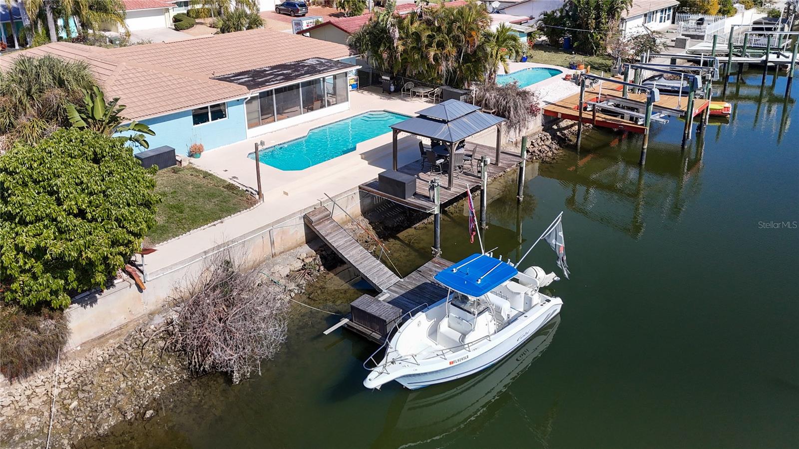 Big Price Reduction - Must see beautiful waterfront home with large pool in the highly sought after Gulf Harbors community in New Port Richey. Enjoy coastal living in this spacious home on a canal with easy access to the South Channel. Enjoy the relaxed lifestyle whether you like to go boating, fishing or meet your friends and neighbors out at the island or at the sandbar. It's a short ride out the South Channel to the open Gulf of Mexico. This home has 3 bedrooms and 2 bathrooms with a split plan and a bonus room. The living/dining/kitchen is an open plan making it great for family gatherings and entertaining. All new stainless Whirlpool kitchen appliances. Enjoy a day on your boat and return to your float dock and relax by the pool or in the large enclosed porch. Pool has an automatic cleaner and the pump was replaced in 2025. There is plenty of room for seating around the pool and under the gazebo on the large fixed dock where you can watch dolphins, manatees, pelicans and heron in your own backyard. 2002 Cobia 254 Center Console with Suzuki 250hp with only 170 hours - BOAT is available for negotiation with home sale. The original garage was converted to a bonus room and an additional storage/work area complete with workbench and shelving. This space could be converted back to a two car garage very easily. Residents enjoy access to two private boat ramps, optional gated private beach membership ($200 annually), optional HOA and Civic Association ($125 annually) and a community park. The beach has shaded pavilions with picnic tables, grills, restrooms, wifi and amazing sunsets. The Civic Association offers numerous clubs and activities. Conveniently located to shopping, dining and golf - this location has it all.