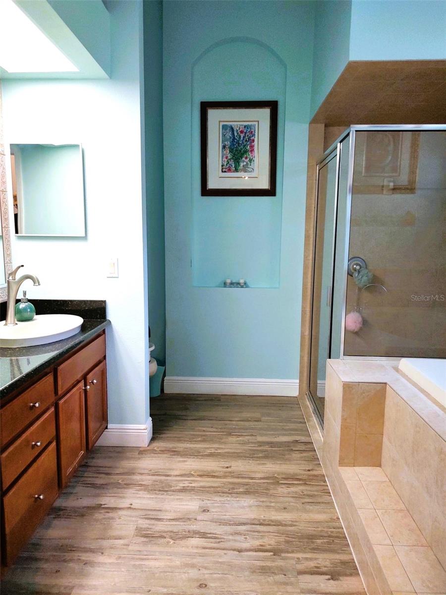 MAKE AN APPOINTMENT TODAY to view this exceptional Windjammer home. This 3-bedroom 2 bath offers a beautifully maintained interior/exterior and comes complete with generous living spaces. Seller has just installed a NEW roof. This home is located on a quiet street with minimal traffic. Whip up gourmet meals in this NEW chef-inspired completely modernized KUCHT kitchen package, equipped with quartz countertops AND custom stainless steel/copper hood. The comfortably sized master suite is made for relaxation and boasts a spacious bathroom and a walk-in closet. It also includes a walk-in shower, soaking tub, his-and-hers sinks with quartz countertops. Enjoy brand-new luxury vinyl flooring throughout the home. Your indoor/outdoor lifestyle includes your pebble finish saltwater pool with hot tub. A wonderful space for fun and completely fenced in and features just the active atmosphere you are looking for. Enjoys a prime location in a sought green community of Longleaf with parks around every corner. Close to Starkey Park, hiking trails, bike paths, lakes and playgrounds. Restaurants, great shopping, grocery stores, cafes, bars, farmers market and specialty stores. This Longleaf residence is less than a mile from everything you need. Located close to highly rated public and private schools. Keep your vehicles clean and dry with a workshop 2-car attached garage. For your security and insurance savings, the home has a system of CUSTOM METAL WINDOW STORM ENCLOSURES. Come see for yourself. (No Flood Insurance Required)