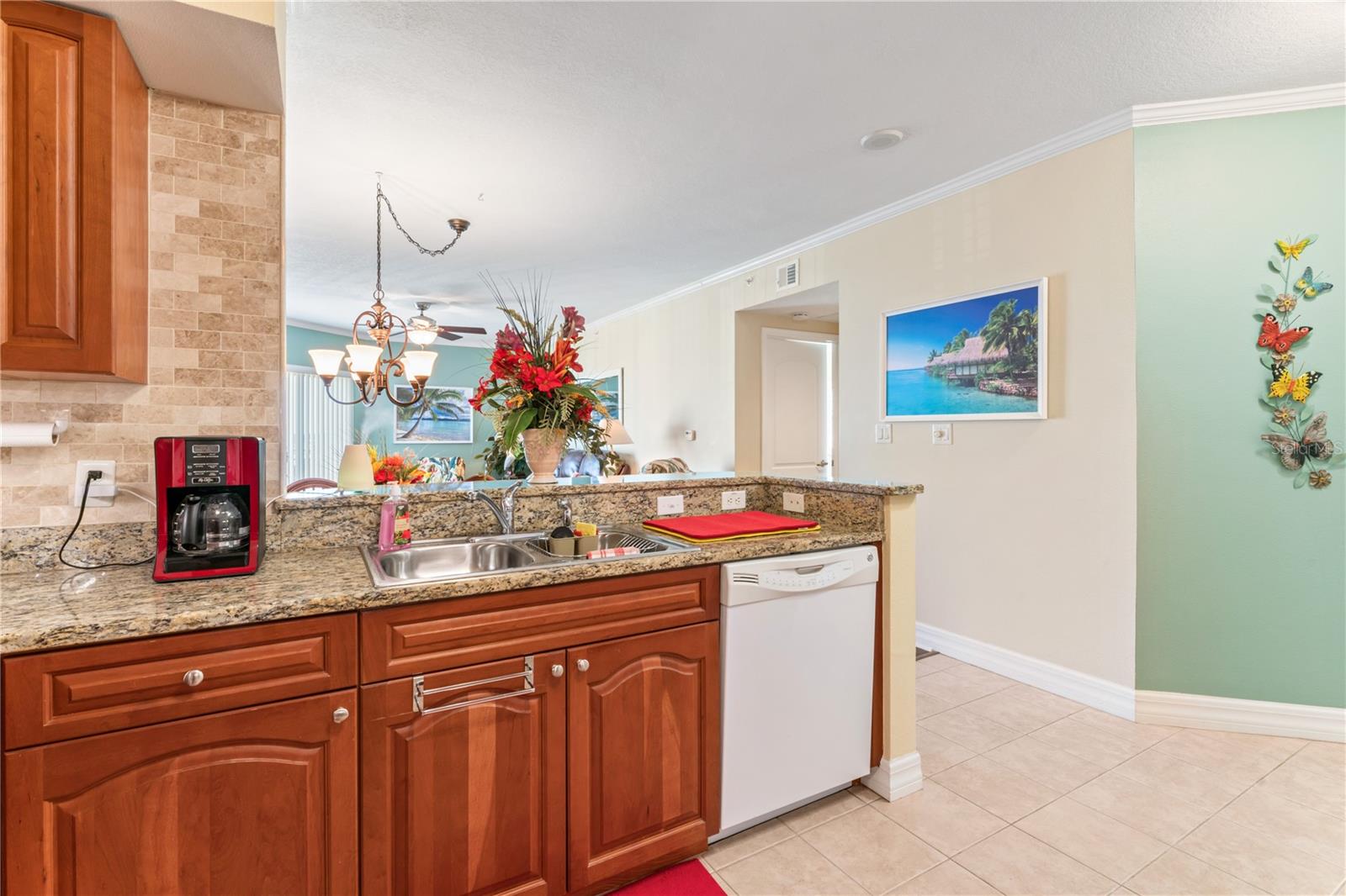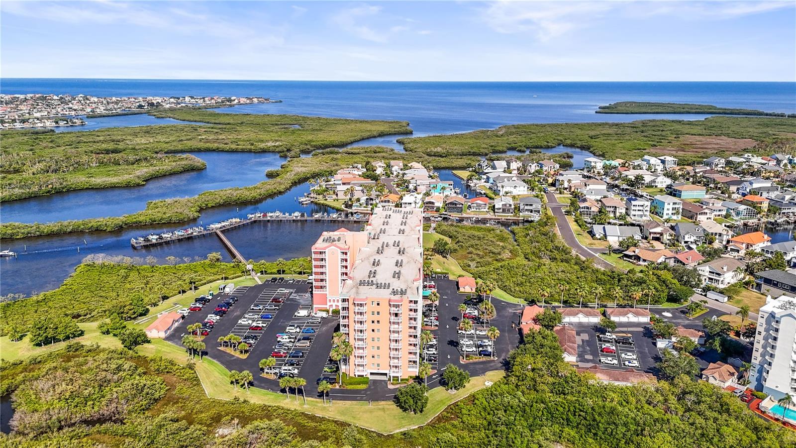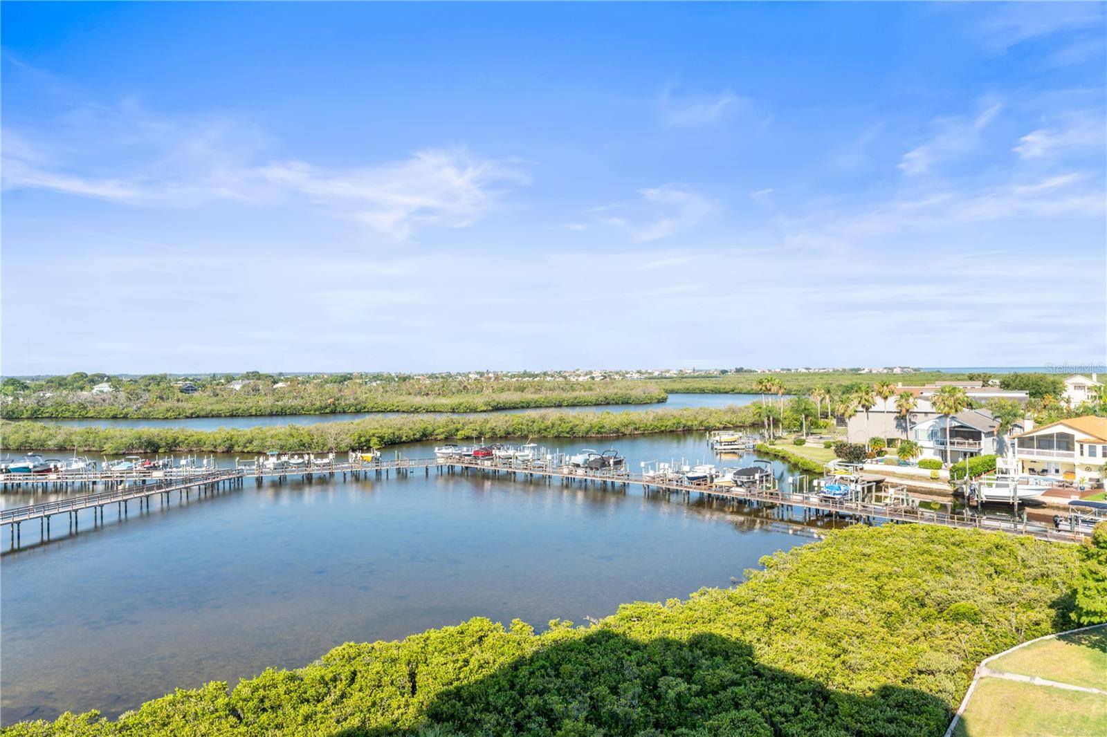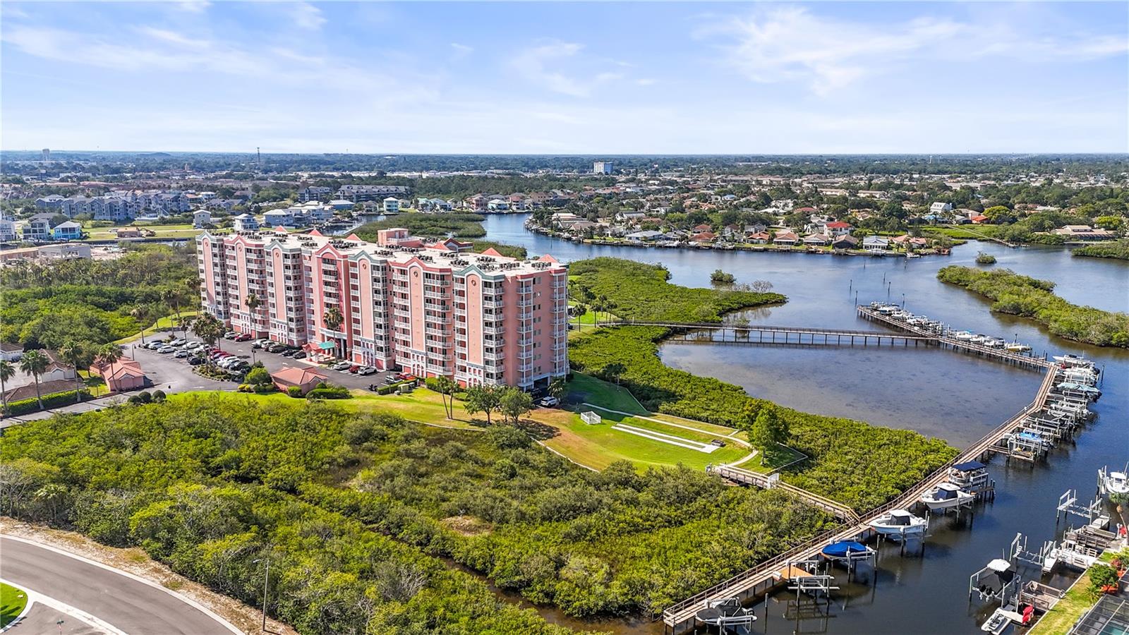 WATERFRONT HIDDEN LUXURY GEM in NPR! BEAUTIFUL 2 Bed, 2 Bath meticulously maintained unit comes TURN KEY (Everything in the unit stays, just bring your suitcase)! 6th Floor END UNIT with STUNNING VIEWS of the Gulf of Mexico and surrounding canals, 3 BALCONIES, and BOAT SLIP with 10,000 LB LIFT! Enter the unit and notice the 9ft ceilings, OPEN FLOOR PLAN, and TONS OF NATURAL LIGHT. The kitchen has pretty wood cabinets, granite countertops, and matching appliances. Recently updated LUXURY VINYL PLANK FLOORING run through the living and dining rooms as well as the bedrooms. The PRIMARY SUITE is spacious and showcases an ENSUITE BATH with deep tub, separate shower, LARGE WALK-IN CLOSET, DUAL SINK VANITY. Access 1 of the private balconies from the primary to witness gorgeous SUNSET VIEWS. The guest bedroom is spacious and has access to a FULL BATH with shower/tub combo and a private balcony to sip a morning cup of coffee or enjoy a sunset dinner. The 3rd private balcony can be accessed through the living space sliding glass doors. The condo fee INCLUDES water, sewer, trash, cable, recreational activities, private road, flood insurance, maintenance & manager. Unit includes owned water softener. AMAZING AMENITIES include: private beach access for strolling the sand or launching a kayak, fishing dock, rooftop deck, heated pool with a separate spa, cabana area, and poolside gas grills for afternoon barbecues, clubroom features a catering kitchen, billiards table, baby grand piano and big-screen TV, library, conference room, and office area for remote work, aerobics studio, exercise room, and men's and women's saunas. PET FRIENDLY COMMUNITY and NO AGE RESTRICTIONS. CONVENIENTLY LOCATED just minutes away from Historical Main Street district with shops and restaurants, and concerts at Sim's Park. Additional shopping is even closer, just a short golf cart ride away. Maintenance free living at its finest!