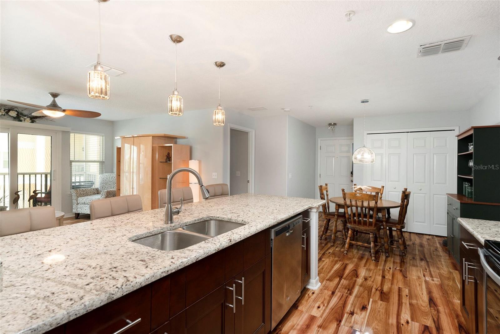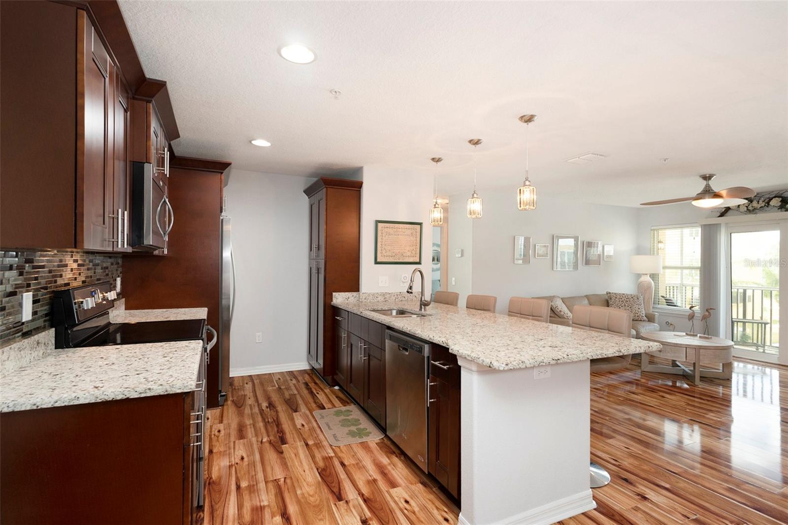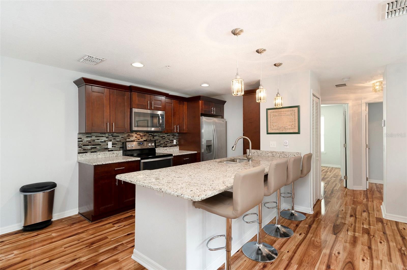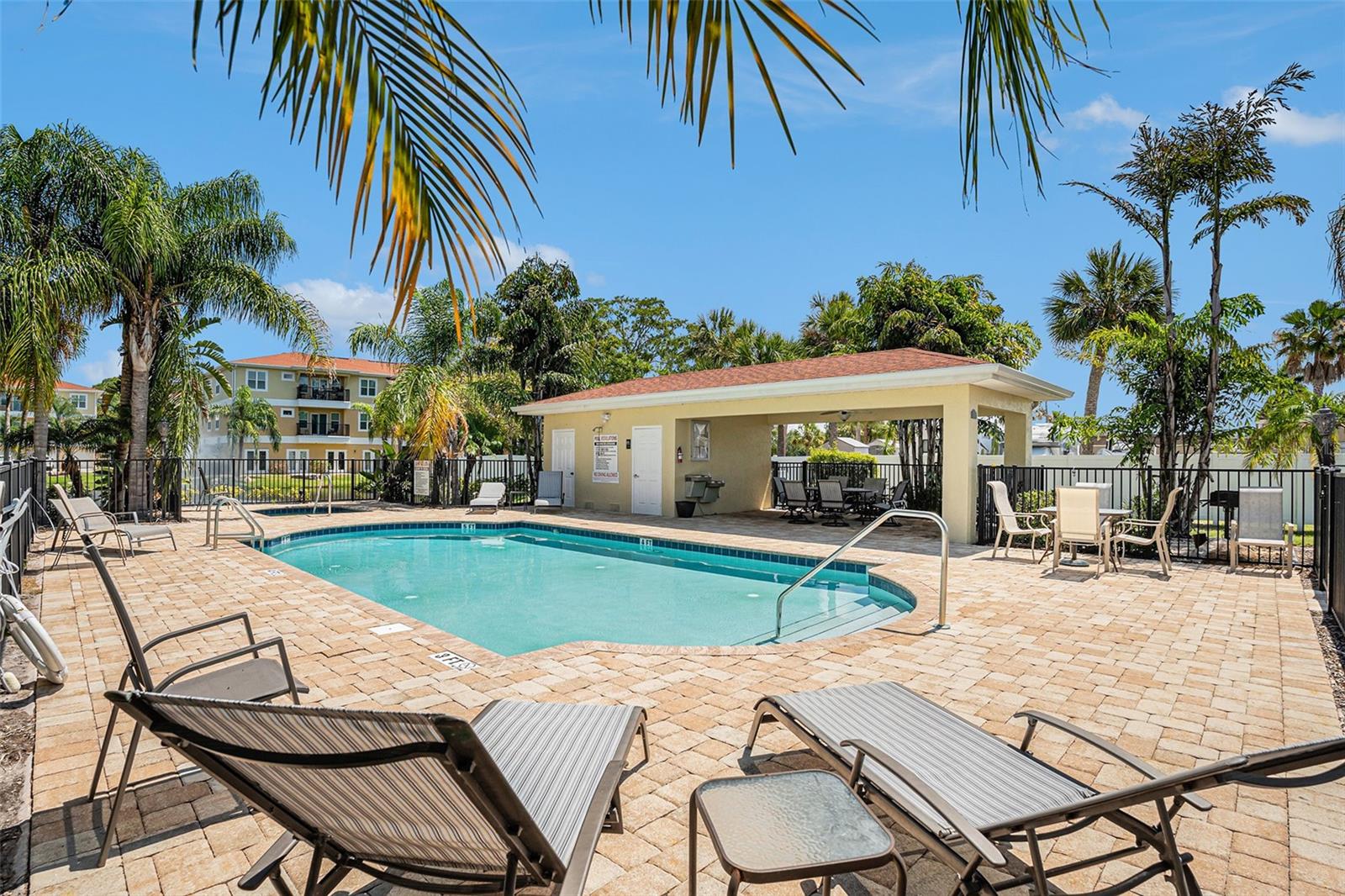 Immerse yourself in the allure of this move-in-ready 3-bed, 2-bath condo, with elevator access, ideally situated near dining, shopping, and downtown New Port Richey. Luxurious finishes, low-maintenance flooring, and a screened-in patio await your enjoyment. Access to a private pool, spa, and Gulf Harbors Beach Club heighten the appeal. Gulf Harbor Beach is available for $200! The chef's kitchen boasts espresso cabinets, granite countertops, and stainless-steel appliances. A spacious dining area and included front loader washer and dryer simplify daily tasks. Flooded with natural light, the living space offers a welcoming open floor plan. Retreat to the master bedroom with its walk-in closet and en suite bath, while two additional bedrooms share a stylish main bath. Plus, enjoy the added bonuses of a garage for convenient parking and an air-conditioned bonus room for versatile living space. This condo offers both luxury and practicality in one. Low HOA fee includes Water, Trash removal, Pool and Spa Access, Internet, and Tv Cable, & Maintenace