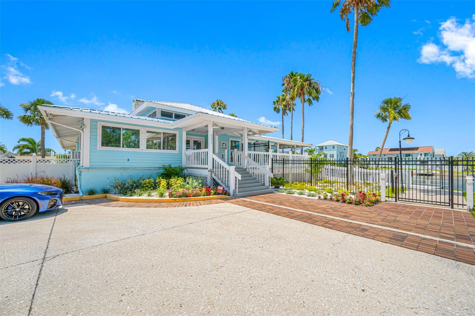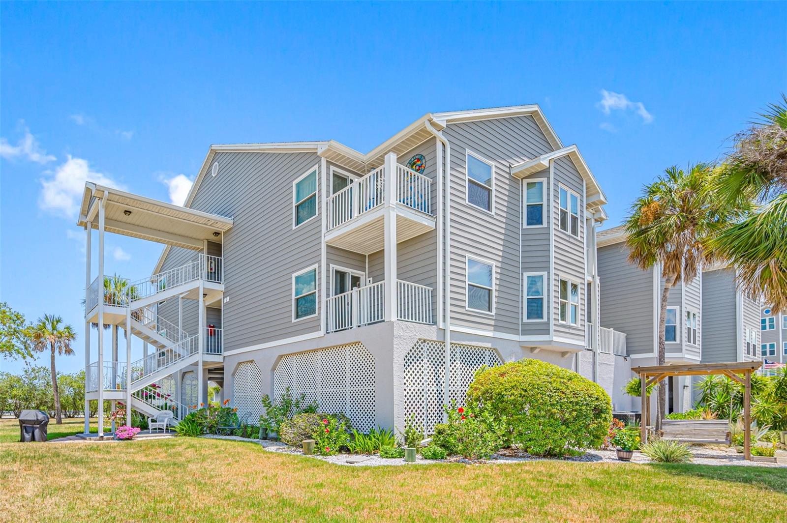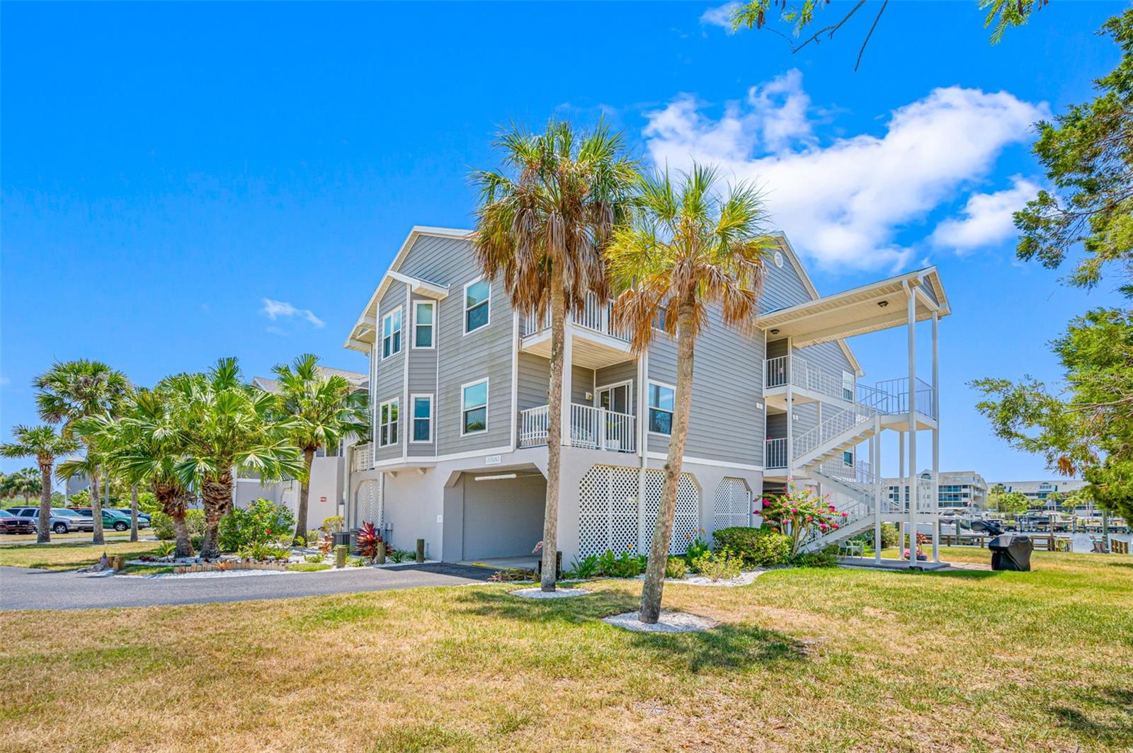 Stunning, elevated, waterfront home in the community of Mariners Way. Waterfront living without the worry about flooding! The best of both worlds! This home features an open floorplan with an abundance of natural light. The kitchen has been updated with solid wood cabinets, granite counters, a breakfast bar and stainless-steel appliances. The living room features a large bay window and sliding glass doors to your private balcony. The primary bedroom has a second private balcony you can enjoy the waterfront view from. The primary bedroom also has its own access to updated bathroom featuring a double vanity, granite countertops and the washer and dryer closet. Use the building elevator for ease of accessing the home. This elevated first floor home is great for flood mitigation as well as covered parking and kayak or bike storage under the building. This community has it all with two pools, a private boat launch, tennis and pickleball courts and Gulf Harbors Private Beach Club for access to the pristine, private, gulf beach. The city of New Port Richey has an amazing waterfront downtown, parks, restaurants and nightlife.