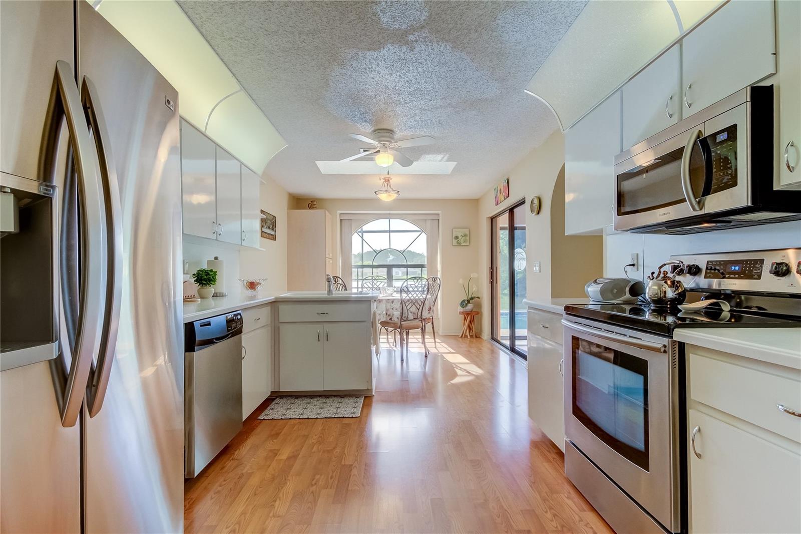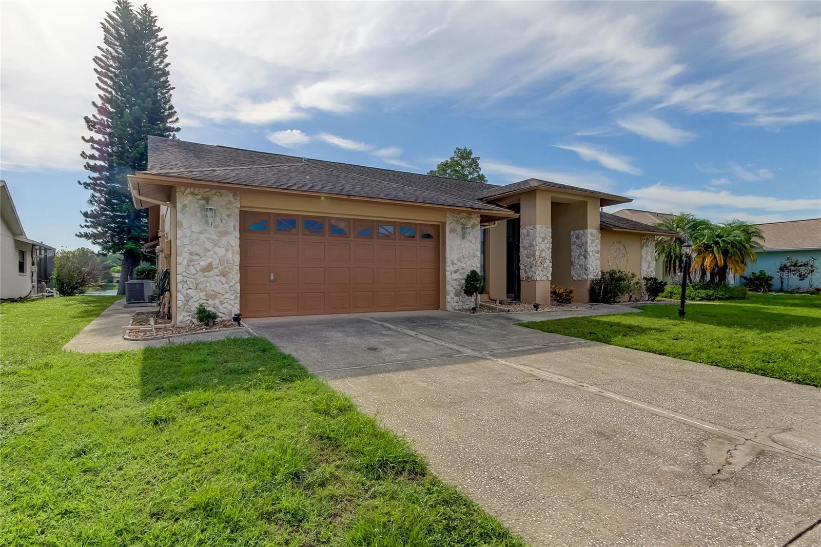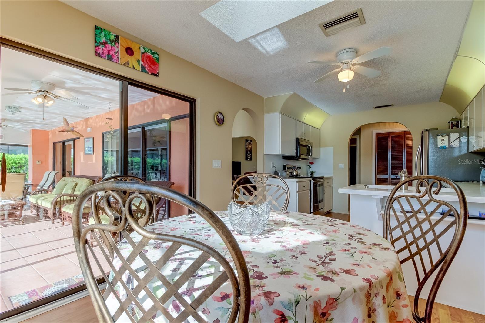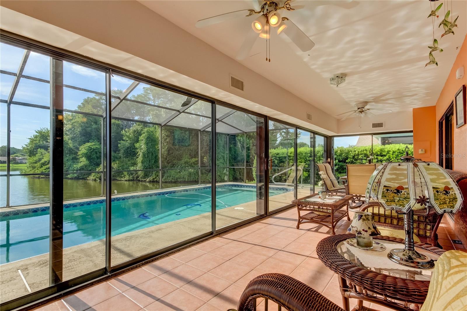 Beautiful waterfront pool home! Vaulted ceilings in the living room with skylights. The dining room has a wonderful outside view of the swimming pool and lake. Split floor plan. Large primary bedroom with separate sitting room or office. Air conditioned Florida room with sliding glass doors on all sides. Both bathrooms have been completely renovated. Main AC replaced in 2020.