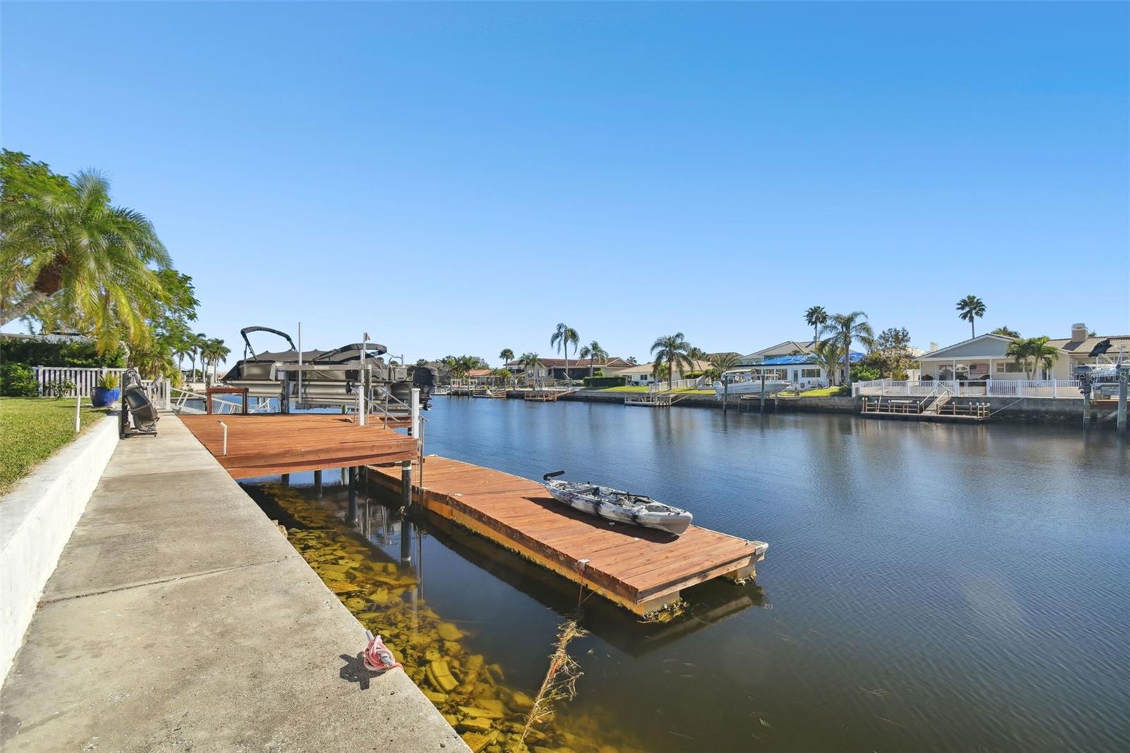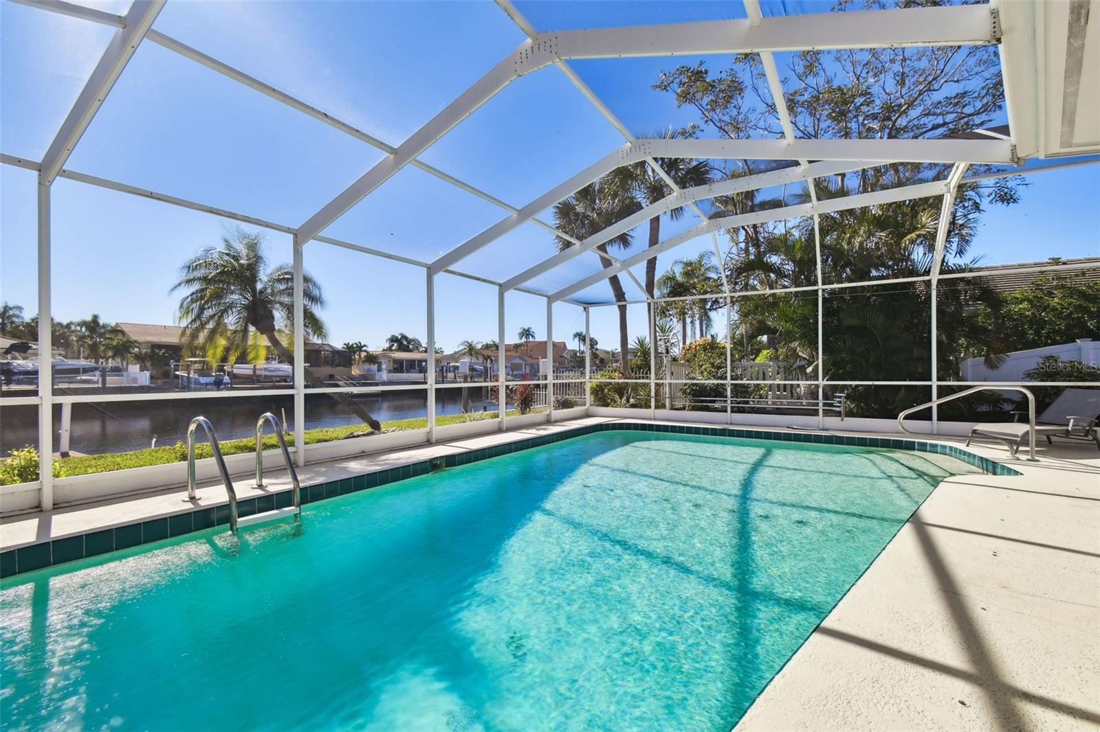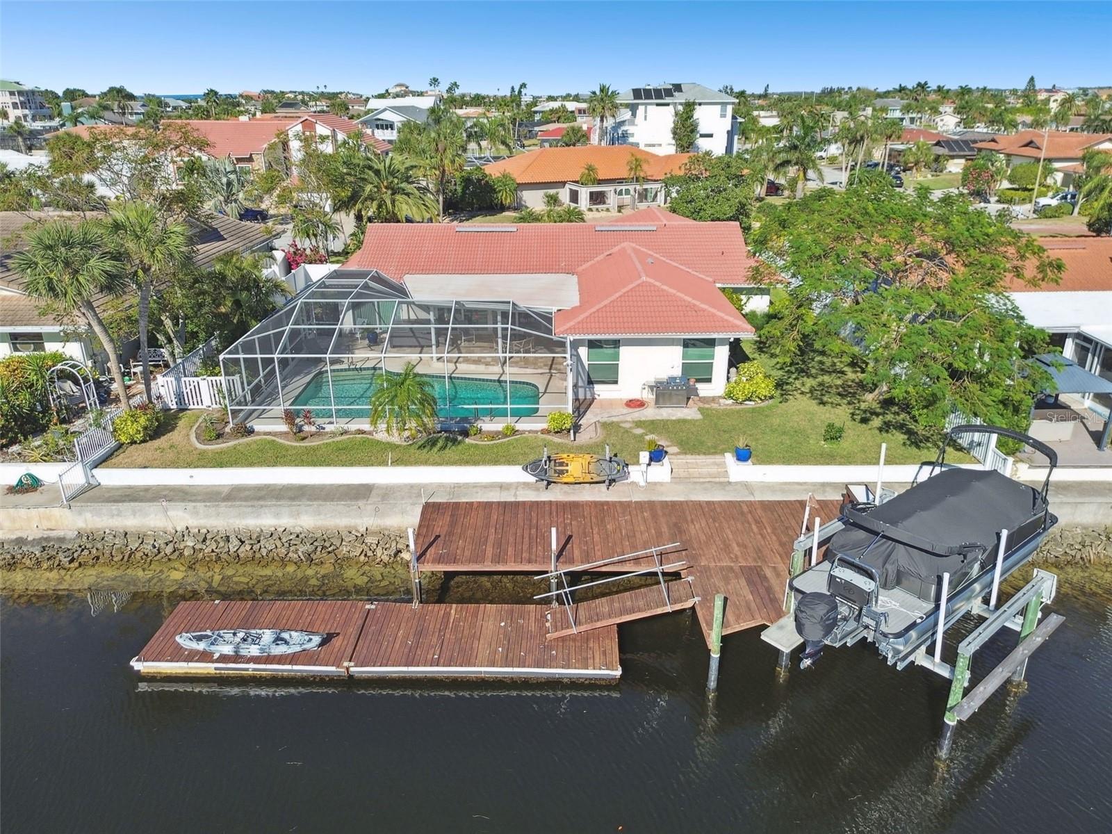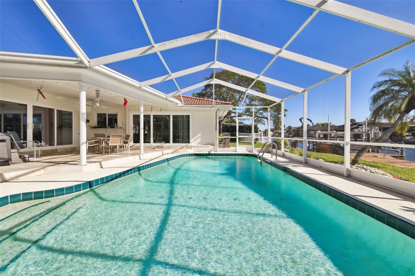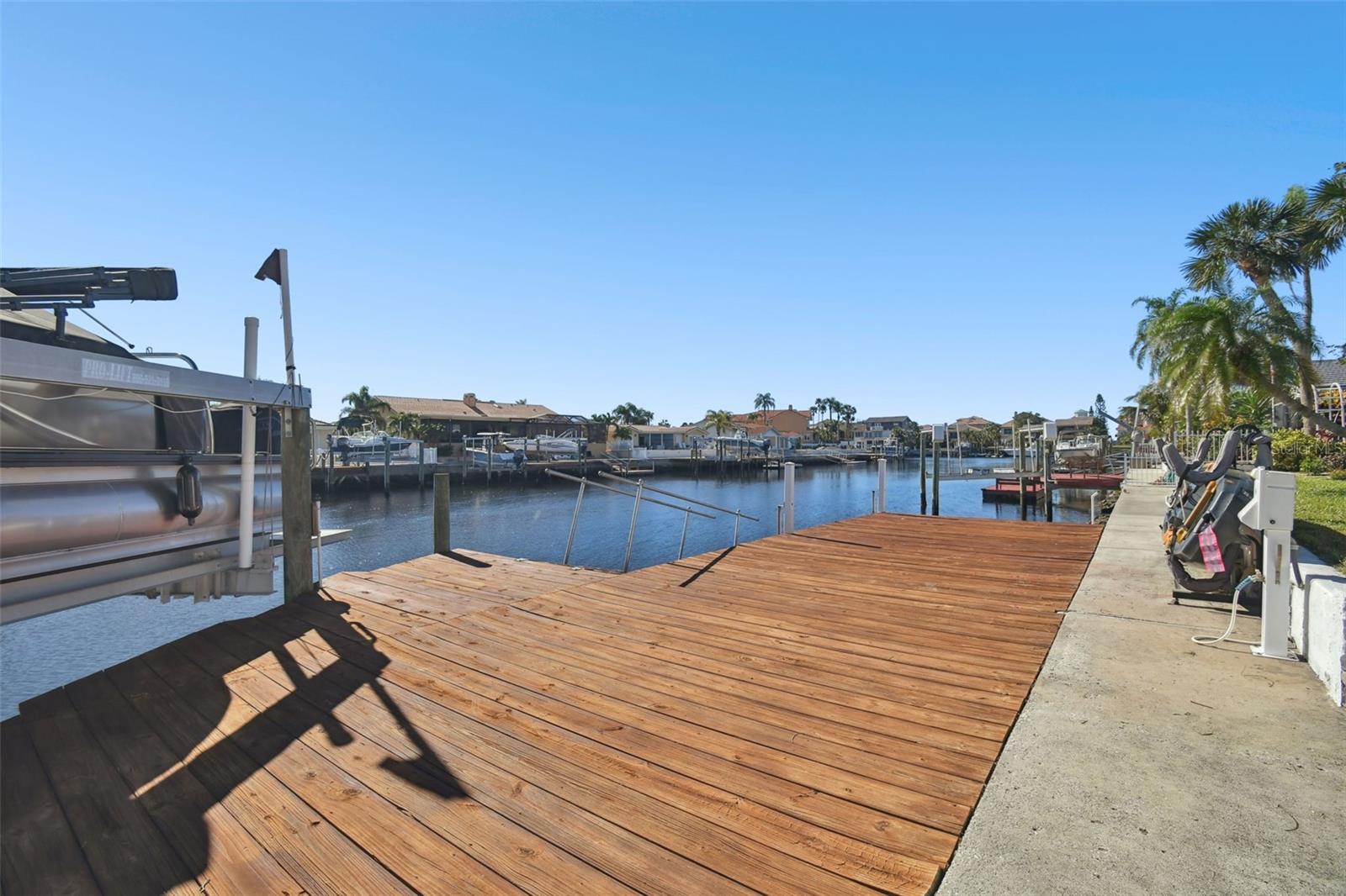 Welcome to your tropical waterfront paradise located in the premier southwestern area of Gulf Harbors, less than two minutes by boat from the beautiful open gulf waters! With over 90ft of seawall, and a 12,000 lbs. boat lift on an extra wide, crystal clear, 28ft deep canal, any boat, even a large sailboat can be accommodated. Watch manatees and dolphins frolic from over 400 sq ft of dock space, a great place for a Tiki bar perhaps? Sit by the sparkling saltwater pool, in the large screened-in lanai, under the covered patio or the shade tree in the big private, fenced-in backyard. The inviting tropical landscaping includes flowering trees, citrus, mango, and an asparagus bed. There is a separate fenced-in yard for your pets and a floating dock, great for kayaking and fishing. All new Impact-Resistant Exterior doors and windows, including two big sliding pocket doors, and an impact resistant garage door, were installed in 2022 to decrease insurance cost. 3RD nails were added to the professionally inspected and cleaned roof in 2022. New tile, installed throughout in 2023, includes baseboard tiles that run throughout the home. In the last three years this beautiful home has been meticulously updated with quality, high-end materials, and fresh paint inside and out. The expansive custom, gourmet kitchen with ample cabinet space, quartz countertops, built-in stainless-steel appliances with modern technology, and a large breakfast bar is perfect for entertaining. The spacious private, master bedroom suite offers views of the water, and a large walk-in closet with built-in custom cabinets. The master bathroom features modern tile, undermount cabinet lighting, dual sinks, quartz countertops, and a rainfall shower head. Two large additional bedrooms offer plenty of room for your guests or office. The guest bath features a large walk-in shower. Other home features include a water purification system added in 2022 and a dual- zone AC system. Florida sunshine, fresh ocean breezes, light and bright coastal colors, and beautiful pool and water views all invigorate your senses right as you walk through the front entry. NO HOA is required! A private beach neighborhood beach (small membership fee) is a short walk away.