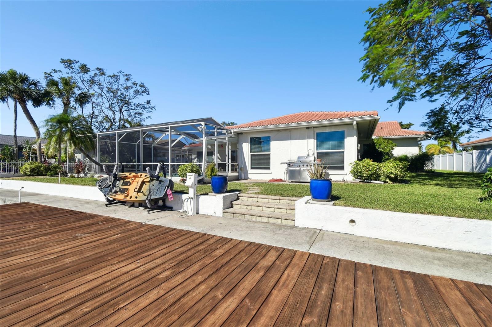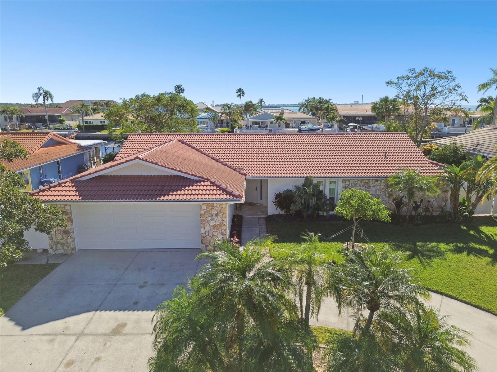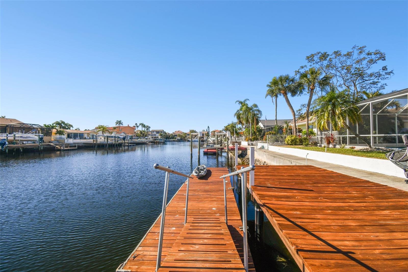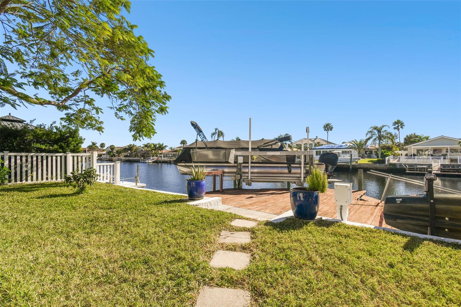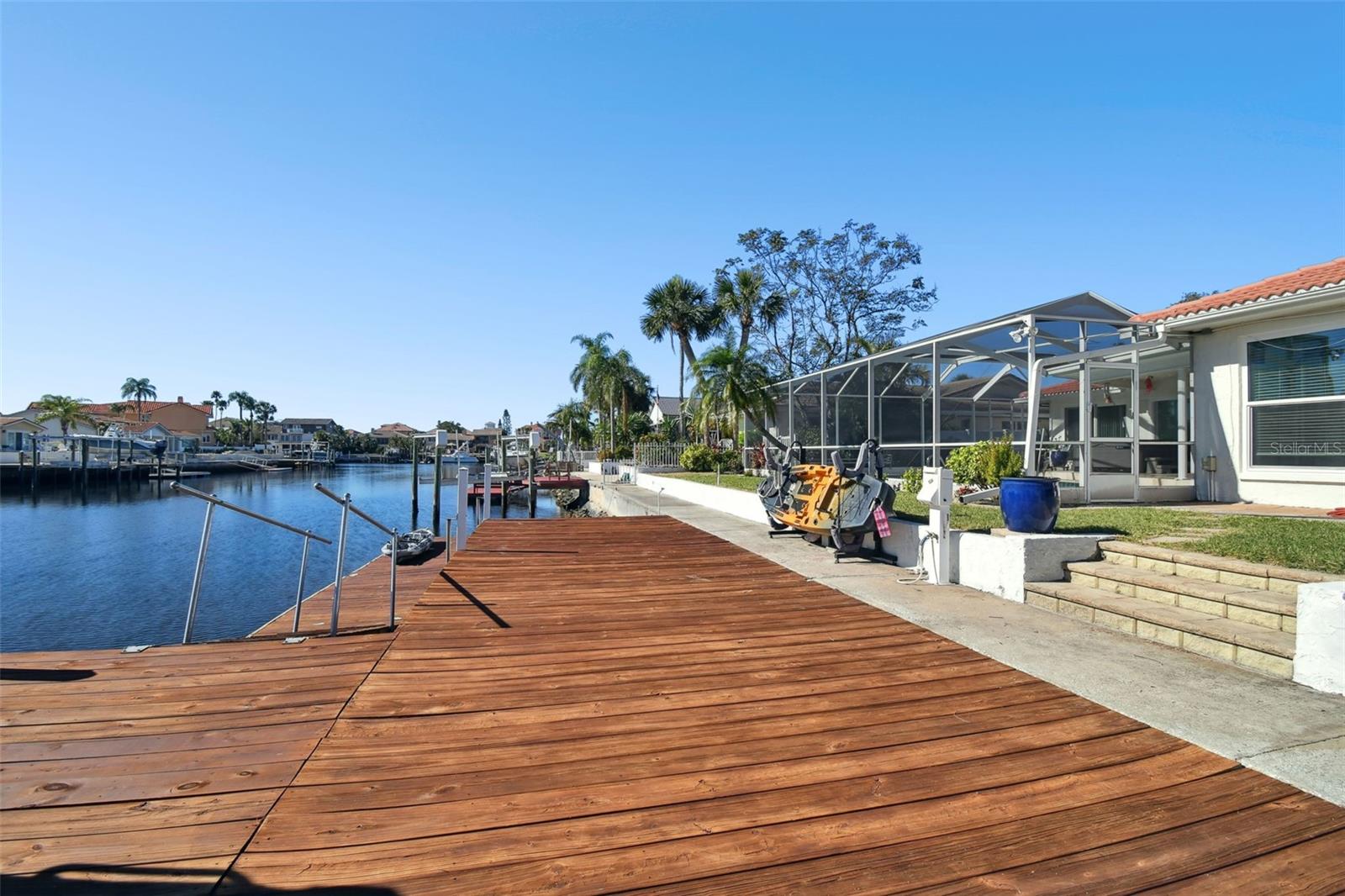 Welcome to your tropical waterfront paradise located in the premier southwestern area of Gulf Harbors, less than two minutes by boat from the beautiful open gulf waters! With over 90ft of seawall, and a 12,000 lbs. boat lift on an extra wide, crystal clear, 28ft deep canal, any boat, even a large sailboat can be accommodated. Watch manatees and dolphins frolic from over 400 sq ft of dock space, a great place for a Tiki bar perhaps? Sit by the sparkling saltwater pool, in the large screened-in lanai, under the covered patio or the shade tree in the big private, fenced-in backyard. The inviting tropical landscaping includes flowering trees, citrus, mango, and an asparagus bed. There is a separate fenced-in yard for your pets and a floating dock, great for kayaking and fishing. All new Impact-Resistant Exterior doors and windows, including two big sliding pocket doors, and an impact resistant garage door, were installed in 2022 to decrease insurance cost. 3RD nails were added to the professionally inspected and cleaned roof in 2022. New tile, installed throughout in 2023, includes baseboard tiles that run throughout the home. In the last three years this beautiful home has been meticulously updated with quality, high-end materials, and fresh paint inside and out. The expansive custom, gourmet kitchen with ample cabinet space, quartz countertops, built-in stainless-steel appliances with modern technology, and a large breakfast bar is perfect for entertaining. The spacious private, master bedroom suite offers views of the water, and a large walk-in closet with built-in custom cabinets. The master bathroom features modern tile, undermount cabinet lighting, dual sinks, quartz countertops, and a rainfall shower head. Two large additional bedrooms offer plenty of room for your guests or office. The guest bath features a large walk-in shower. Other home features include a water purification system added in 2022 and a dual- zone AC system. Florida sunshine, fresh ocean breezes, light and bright coastal colors, and beautiful pool and water views all invigorate your senses right as you walk through the front entry. NO HOA is required! A private beach neighborhood beach (small membership fee) is a short walk away.
