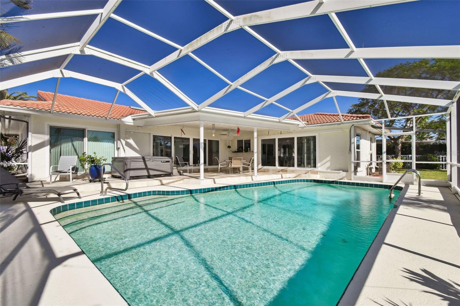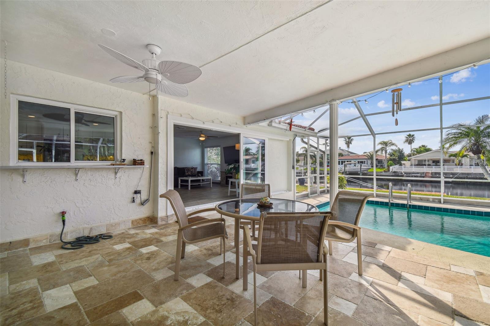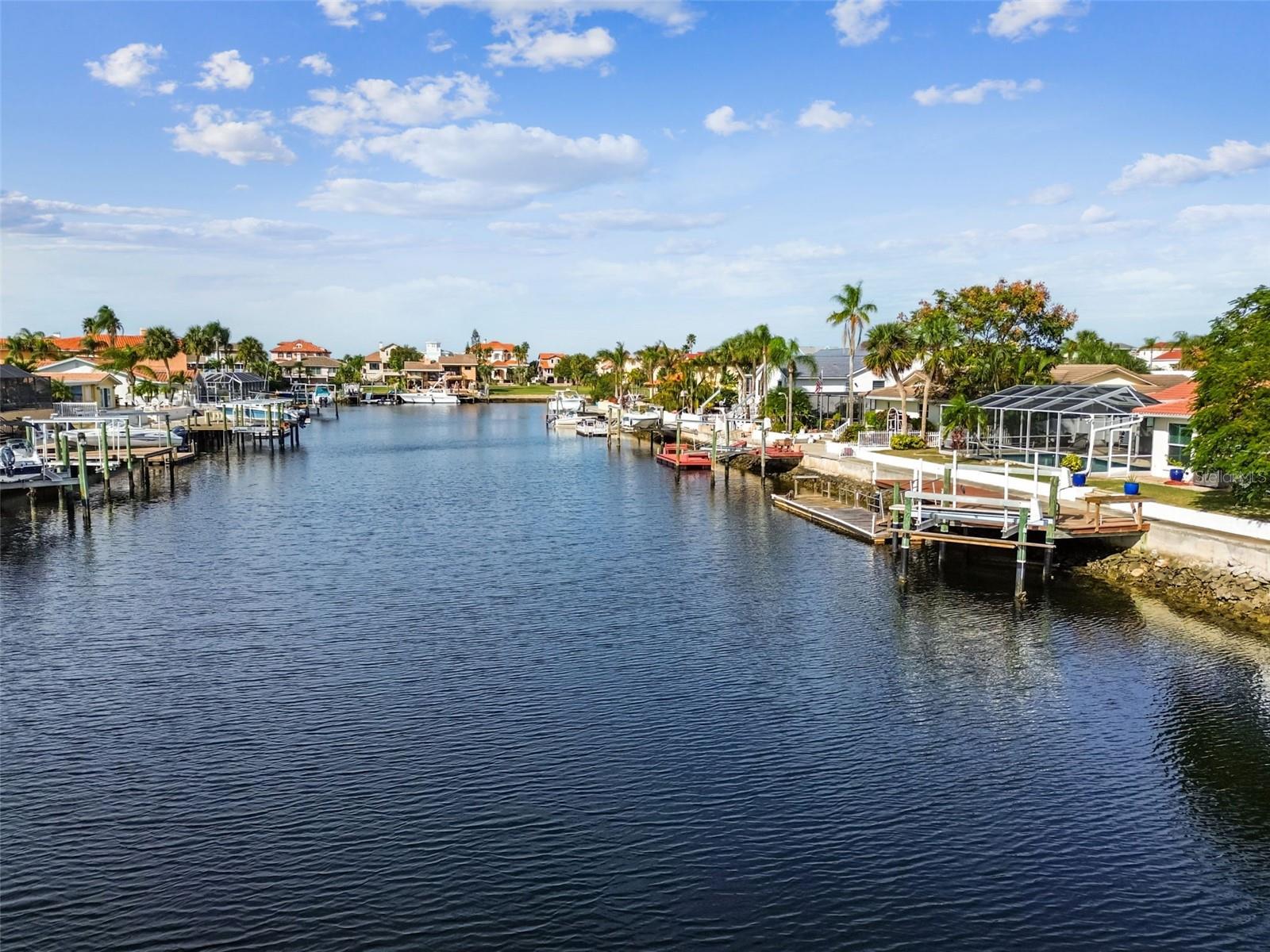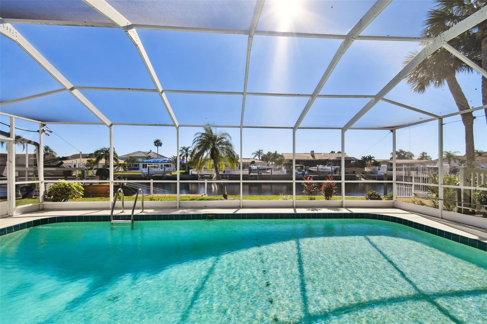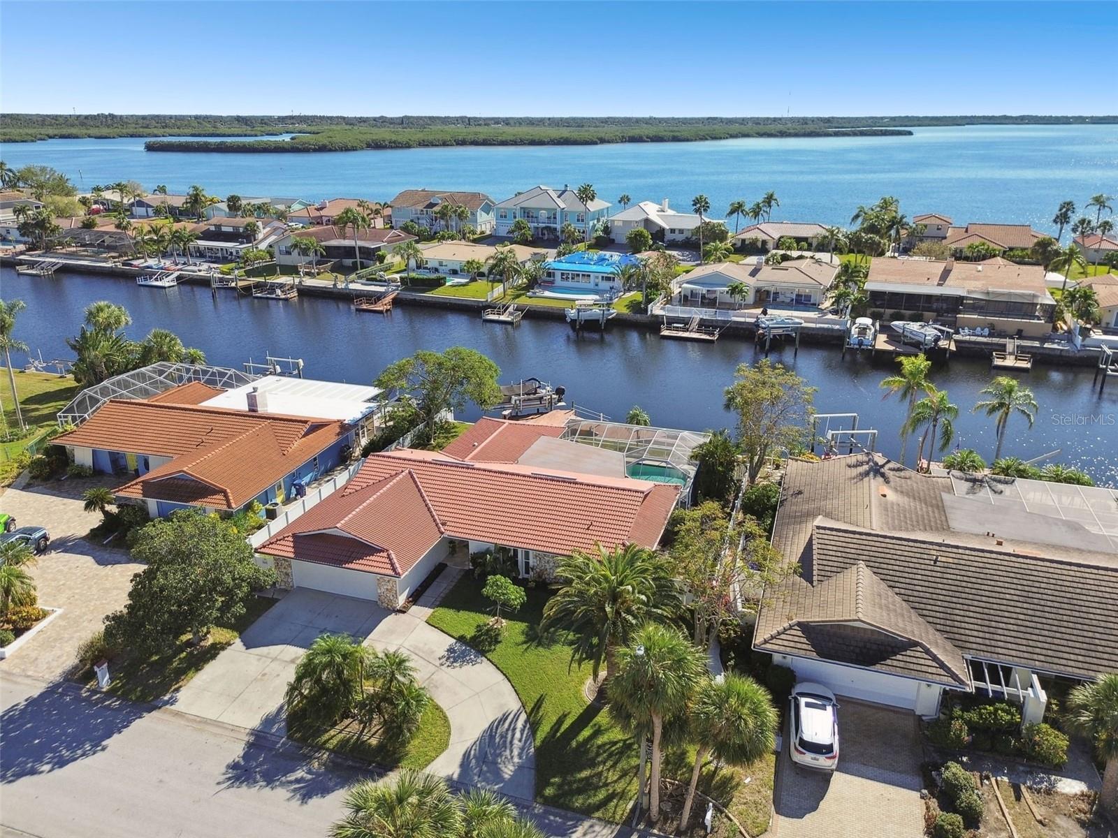 Welcome to your tropical waterfront paradise located in the premier southwestern area of Gulf Harbors, less than two minutes by boat from the beautiful open gulf waters! With over 90ft of seawall, and a 12,000 lbs. boat lift on an extra wide, crystal clear, 28ft deep canal, any boat, even a large sailboat can be accommodated. Watch manatees and dolphins frolic from over 400 sq ft of dock space, a great place for a Tiki bar perhaps? Sit by the sparkling saltwater pool, in the large screened-in lanai, under the covered patio or the shade tree in the big private, fenced-in backyard. The inviting tropical landscaping includes flowering trees, citrus, mango, and an asparagus bed. There is a separate fenced-in yard for your pets and a floating dock, great for kayaking and fishing. All new Impact-Resistant Exterior doors and windows, including two big sliding pocket doors, and an impact resistant garage door, were installed in 2022 to decrease insurance cost. 3RD nails were added to the professionally inspected and cleaned roof in 2022. New tile, installed throughout in 2023, includes baseboard tiles that run throughout the home. In the last three years this beautiful home has been meticulously updated with quality, high-end materials, and fresh paint inside and out. The expansive custom, gourmet kitchen with ample cabinet space, quartz countertops, built-in stainless-steel appliances with modern technology, and a large breakfast bar is perfect for entertaining. The spacious private, master bedroom suite offers views of the water, and a large walk-in closet with built-in custom cabinets. The master bathroom features modern tile, undermount cabinet lighting, dual sinks, quartz countertops, and a rainfall shower head. Two large additional bedrooms offer plenty of room for your guests or office. The guest bath features a large walk-in shower. Other home features include a water purification system added in 2022 and a dual- zone AC system. Florida sunshine, fresh ocean breezes, light and bright coastal colors, and beautiful pool and water views all invigorate your senses right as you walk through the front entry. NO HOA is required! A private beach neighborhood beach (small membership fee) is a short walk away.