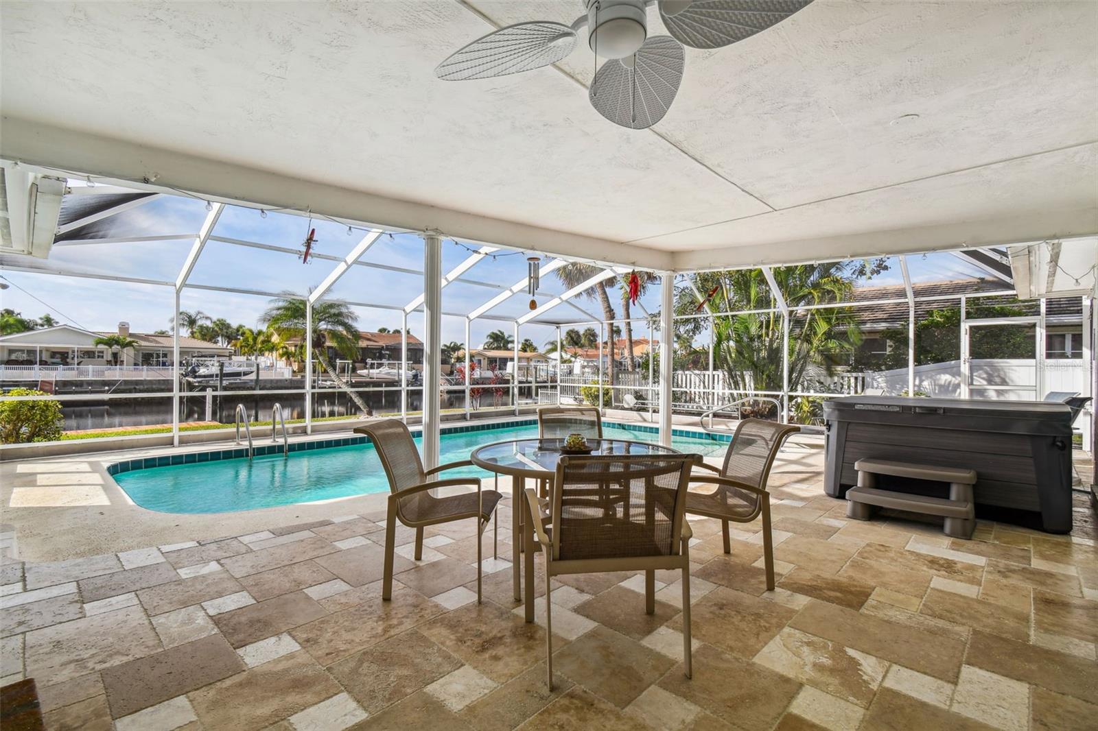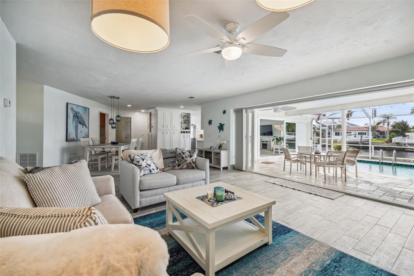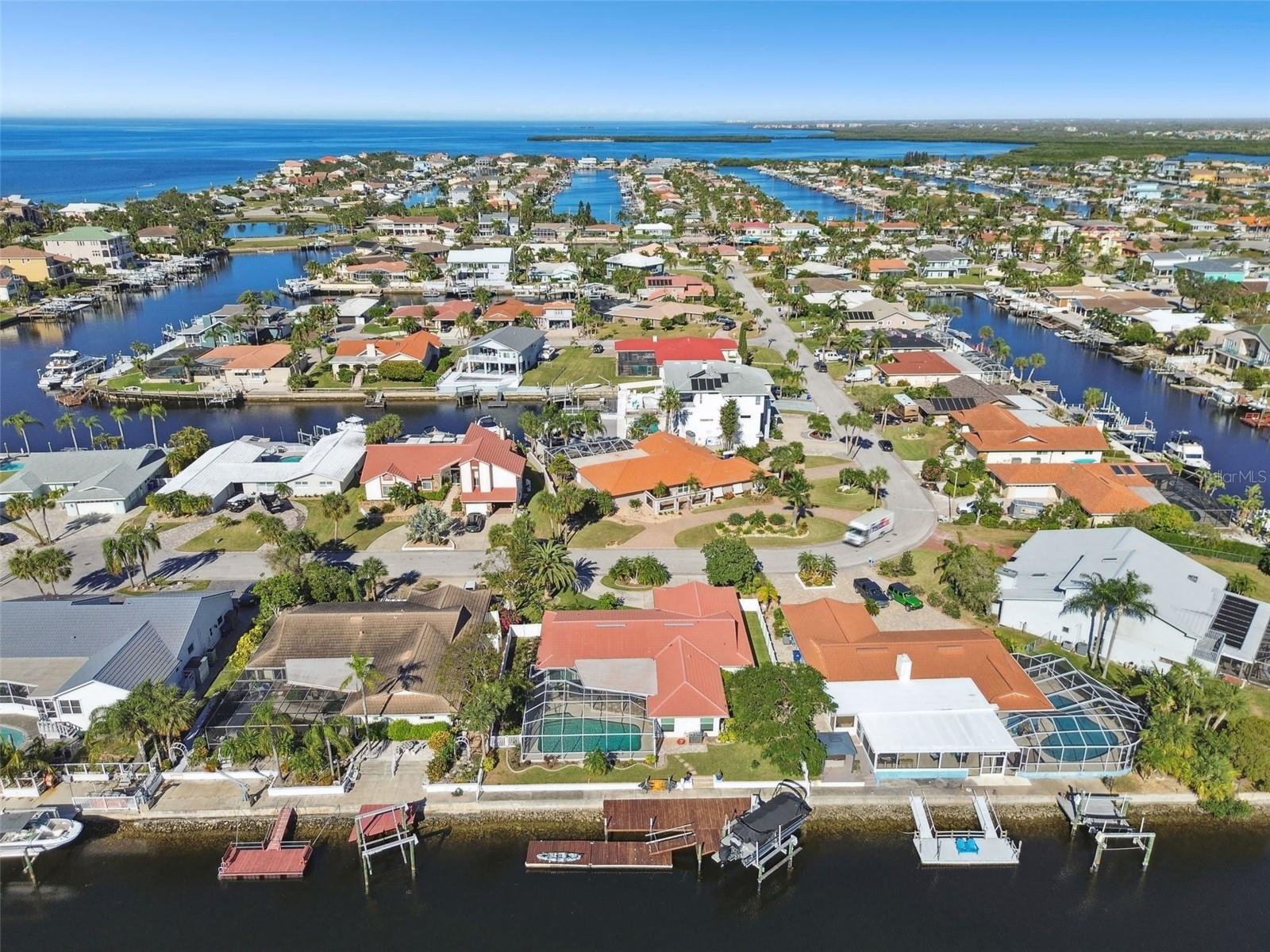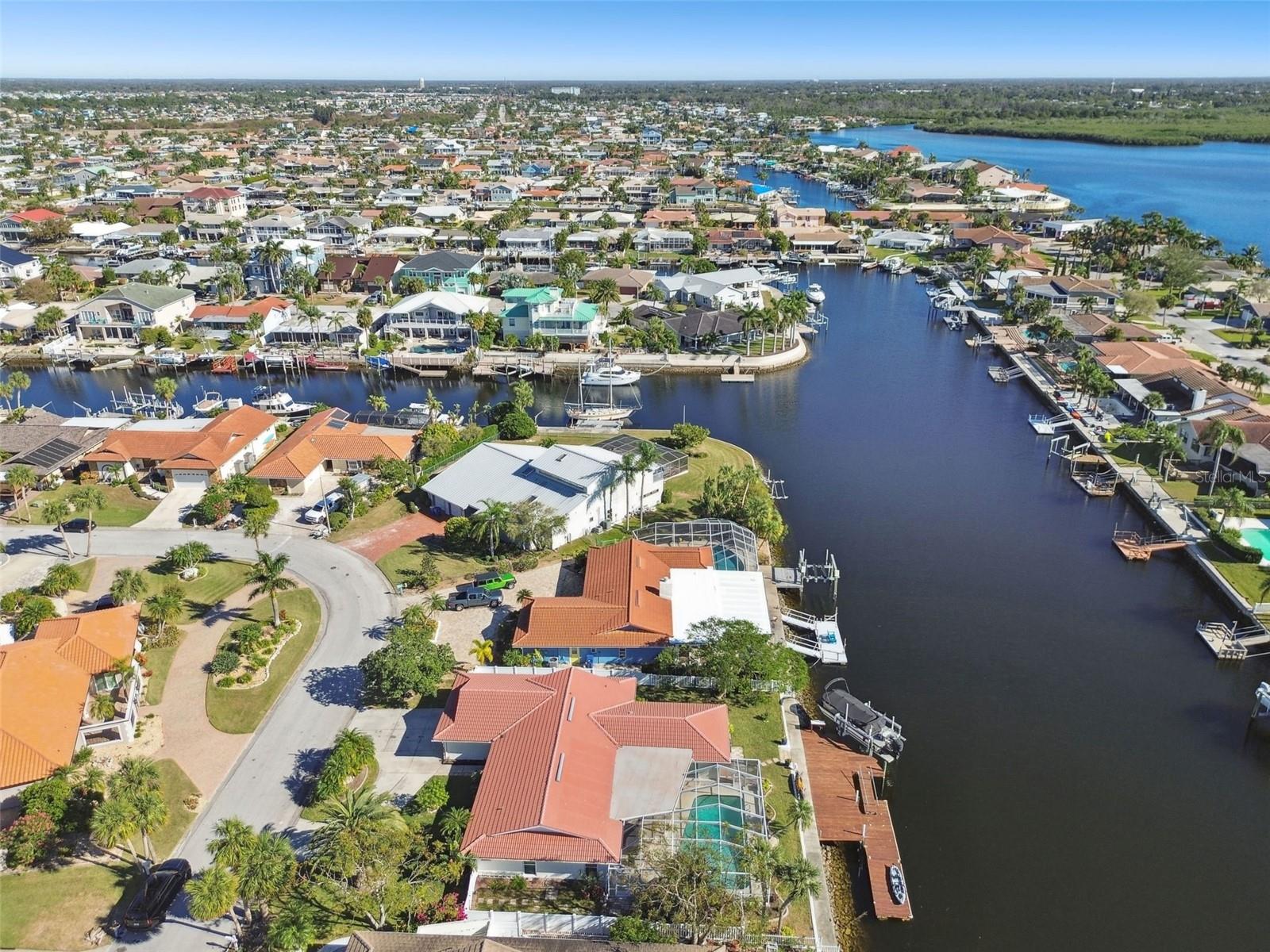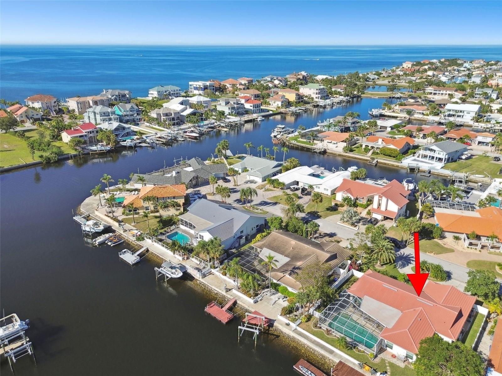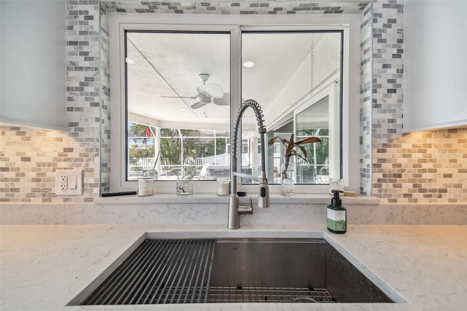 Welcome to your tropical waterfront paradise located in the premier southwestern area of Gulf Harbors, less than two minutes by boat from the beautiful open gulf waters! With over 90ft of seawall, and a 12,000 lbs. boat lift on an extra wide, crystal clear, 28ft deep canal, any boat, even a large sailboat can be accommodated. Watch manatees and dolphins frolic from over 400 sq ft of dock space, a great place for a Tiki bar perhaps? Sit by the sparkling saltwater pool, in the large screened-in lanai, under the covered patio or the shade tree in the big private, fenced-in backyard. The inviting tropical landscaping includes flowering trees, citrus, mango, and an asparagus bed. There is a separate fenced-in yard for your pets and a floating dock, great for kayaking and fishing. All new Impact-Resistant Exterior doors and windows, including two big sliding pocket doors, and an impact resistant garage door, were installed in 2022 to decrease insurance cost. 3RD nails were added to the professionally inspected and cleaned roof in 2022. New tile, installed throughout in 2023, includes baseboard tiles that run throughout the home. In the last three years this beautiful home has been meticulously updated with quality, high-end materials, and fresh paint inside and out. The expansive custom, gourmet kitchen with ample cabinet space, quartz countertops, built-in stainless-steel appliances with modern technology, and a large breakfast bar is perfect for entertaining. The spacious private, master bedroom suite offers views of the water, and a large walk-in closet with built-in custom cabinets. The master bathroom features modern tile, undermount cabinet lighting, dual sinks, quartz countertops, and a rainfall shower head. Two large additional bedrooms offer plenty of room for your guests or office. The guest bath features a large walk-in shower. Other home features include a water purification system added in 2022 and a dual- zone AC system. Florida sunshine, fresh ocean breezes, light and bright coastal colors, and beautiful pool and water views all invigorate your senses right as you walk through the front entry. NO HOA is required! A private beach neighborhood beach (small membership fee) is a short walk away.