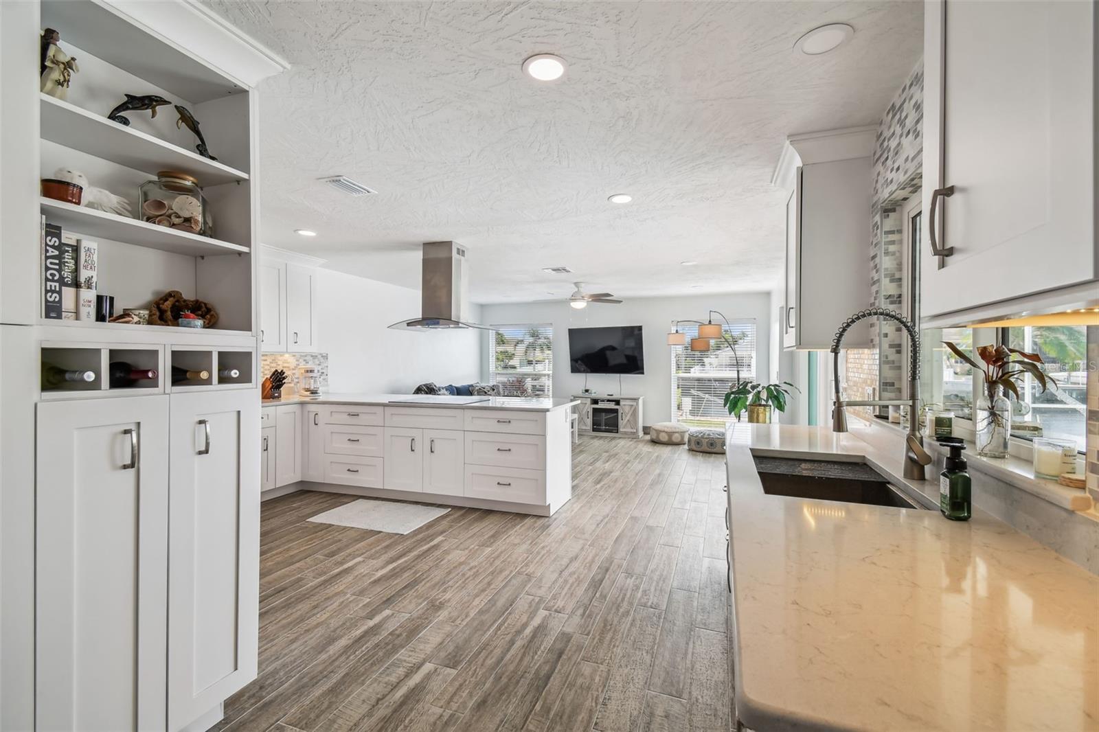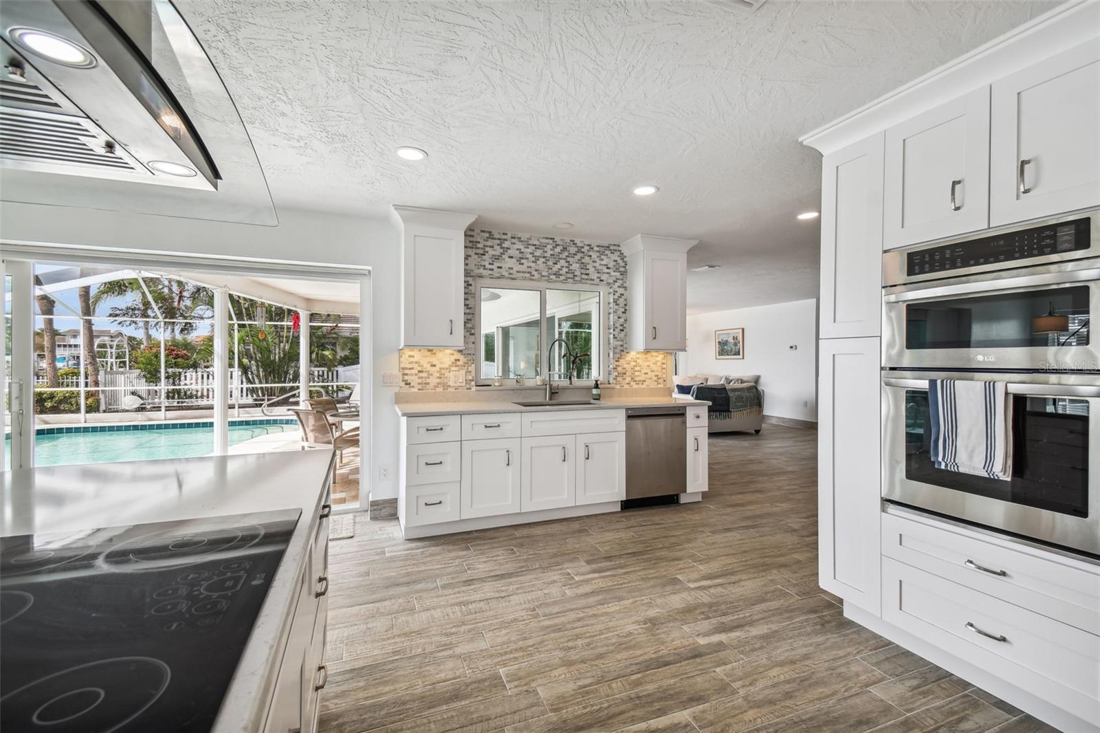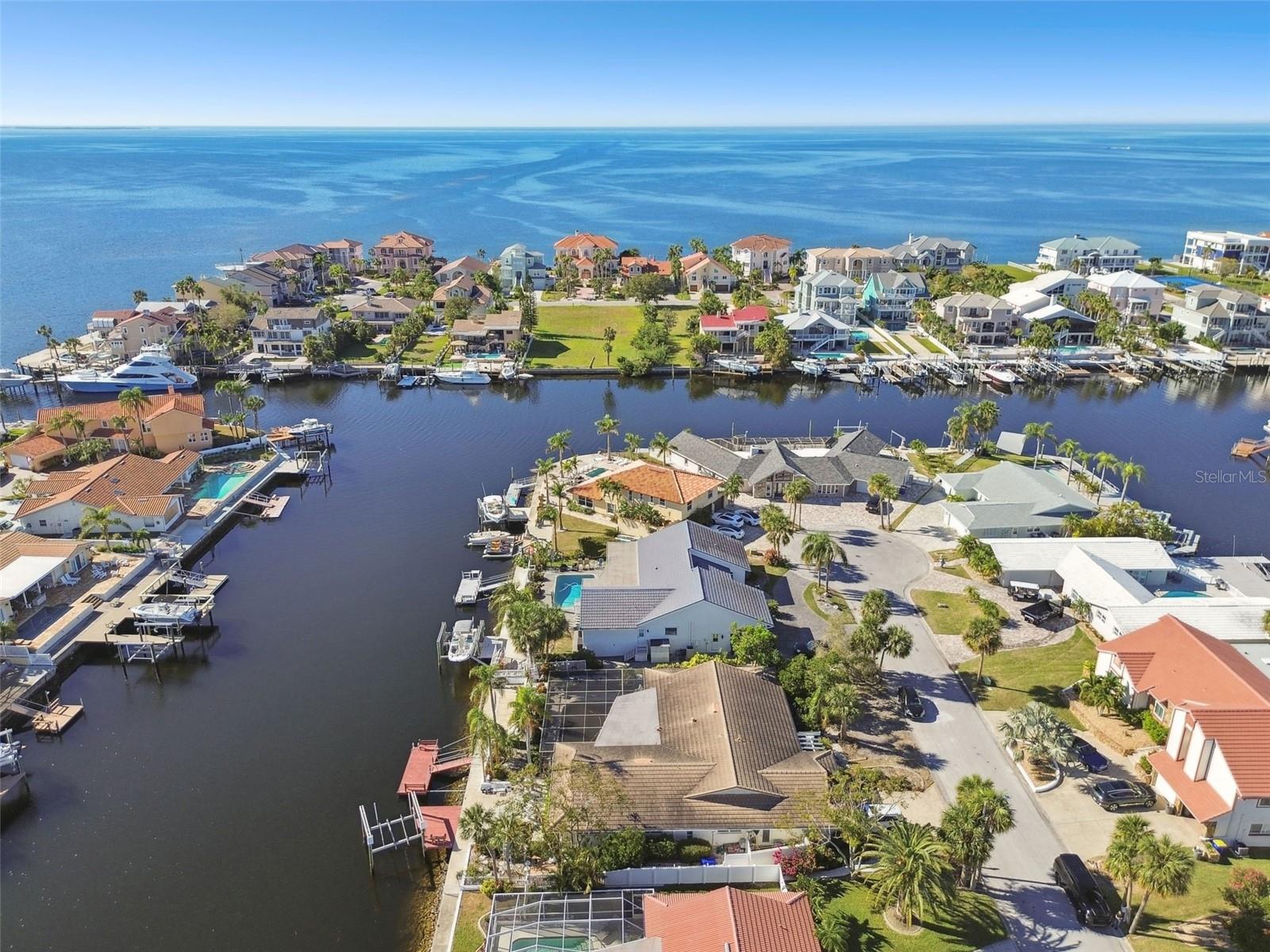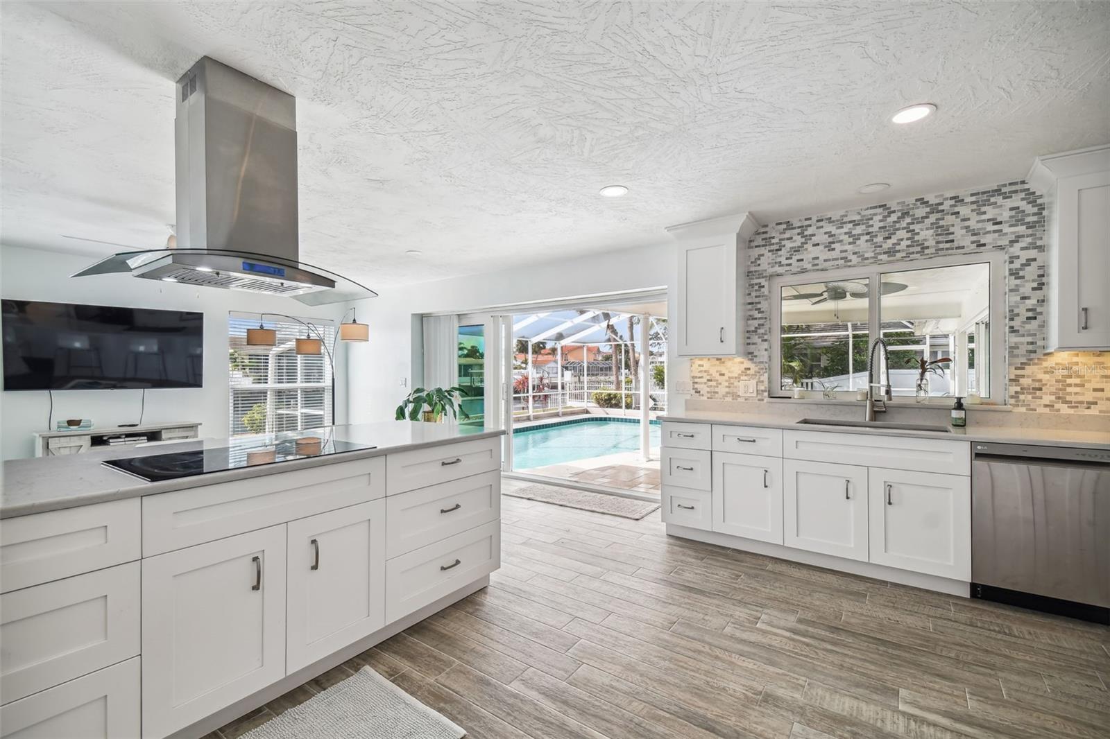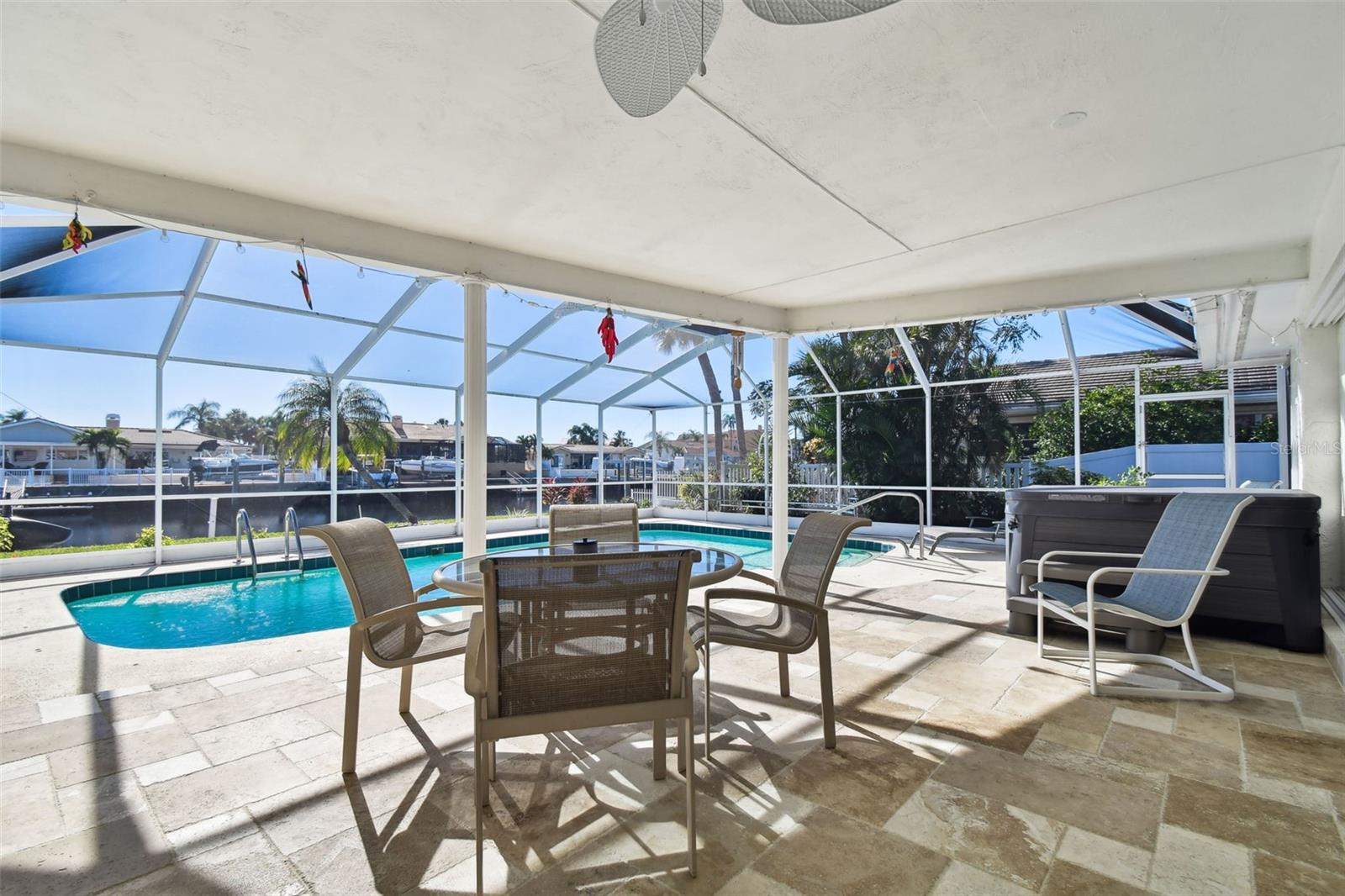 Welcome to your tropical waterfront paradise located in the premier southwestern area of Gulf Harbors, less than two minutes by boat from the beautiful open gulf waters! With over 90ft of seawall, and a 12,000 lbs. boat lift on an extra wide, crystal clear, 28ft deep canal, any boat, even a large sailboat can be accommodated. Watch manatees and dolphins frolic from over 400 sq ft of dock space, a great place for a Tiki bar perhaps? Sit by the sparkling saltwater pool, in the large screened-in lanai, under the covered patio or the shade tree in the big private, fenced-in backyard. The inviting tropical landscaping includes flowering trees, citrus, mango, and an asparagus bed. There is a separate fenced-in yard for your pets and a floating dock, great for kayaking and fishing. All new Impact-Resistant Exterior doors and windows, including two big sliding pocket doors, and an impact resistant garage door, were installed in 2022 to decrease insurance cost. 3RD nails were added to the professionally inspected and cleaned roof in 2022. New tile, installed throughout in 2023, includes baseboard tiles that run throughout the home. In the last three years this beautiful home has been meticulously updated with quality, high-end materials, and fresh paint inside and out. The expansive custom, gourmet kitchen with ample cabinet space, quartz countertops, built-in stainless-steel appliances with modern technology, and a large breakfast bar is perfect for entertaining. The spacious private, master bedroom suite offers views of the water, and a large walk-in closet with built-in custom cabinets. The master bathroom features modern tile, undermount cabinet lighting, dual sinks, quartz countertops, and a rainfall shower head. Two large additional bedrooms offer plenty of room for your guests or office. The guest bath features a large walk-in shower. Other home features include a water purification system added in 2022 and a dual- zone AC system. Florida sunshine, fresh ocean breezes, light and bright coastal colors, and beautiful pool and water views all invigorate your senses right as you walk through the front entry. NO HOA is required! A private beach neighborhood beach (small membership fee) is a short walk away.