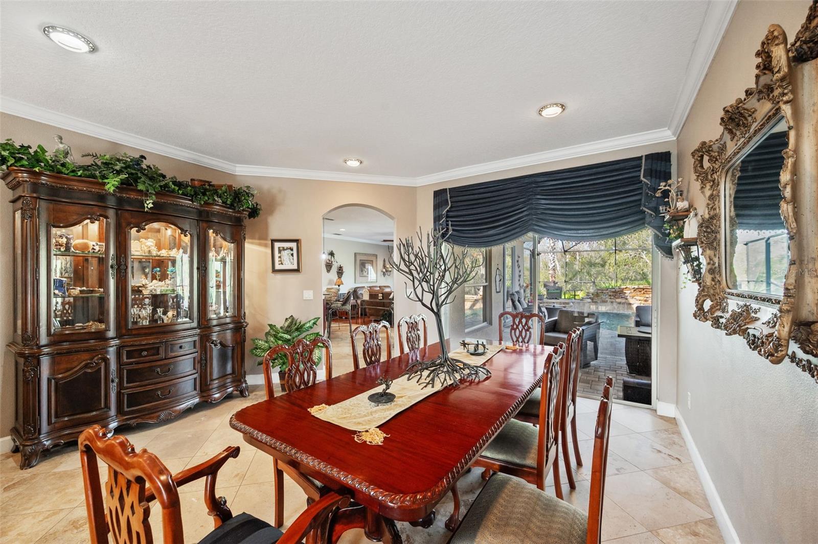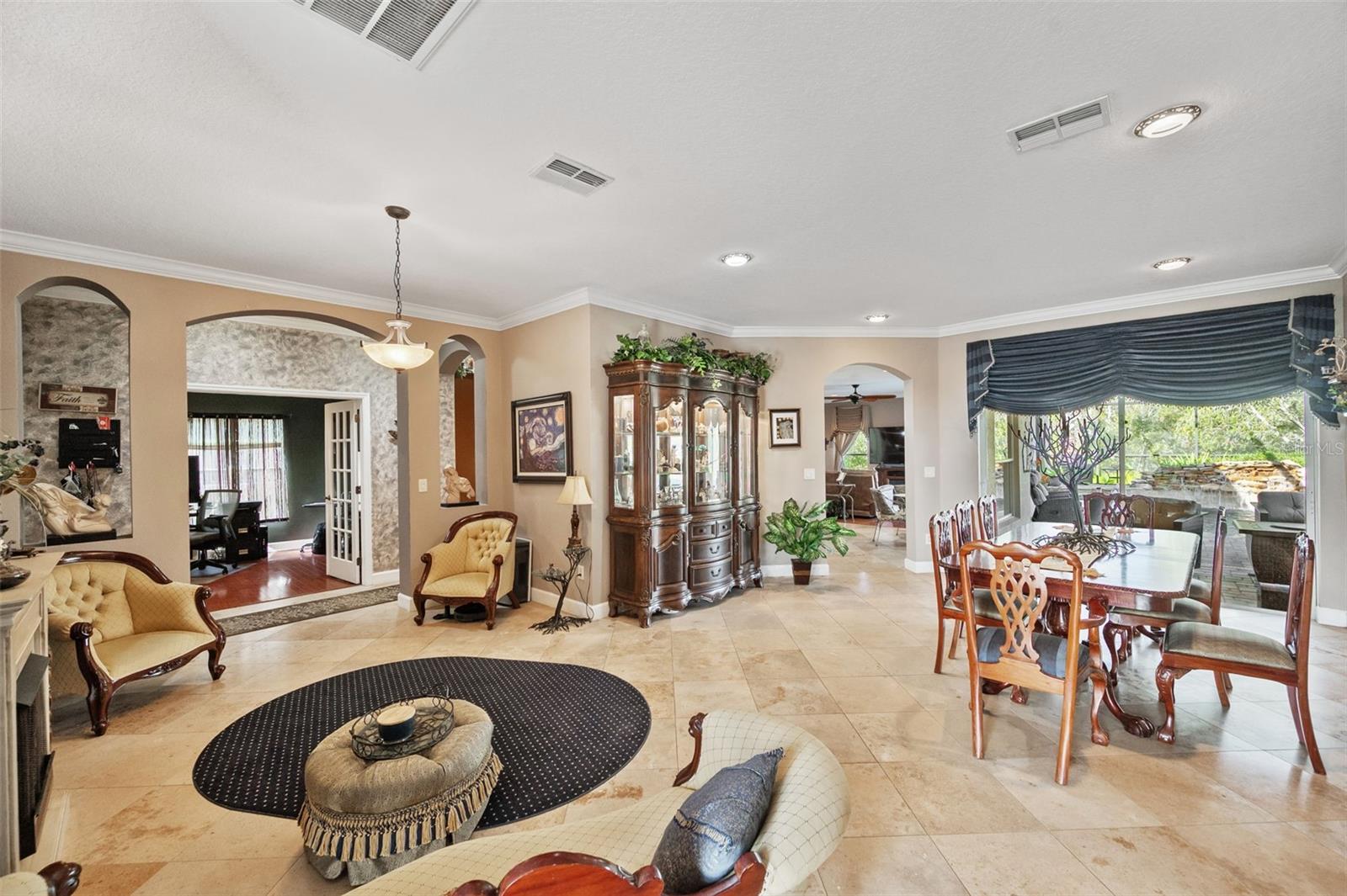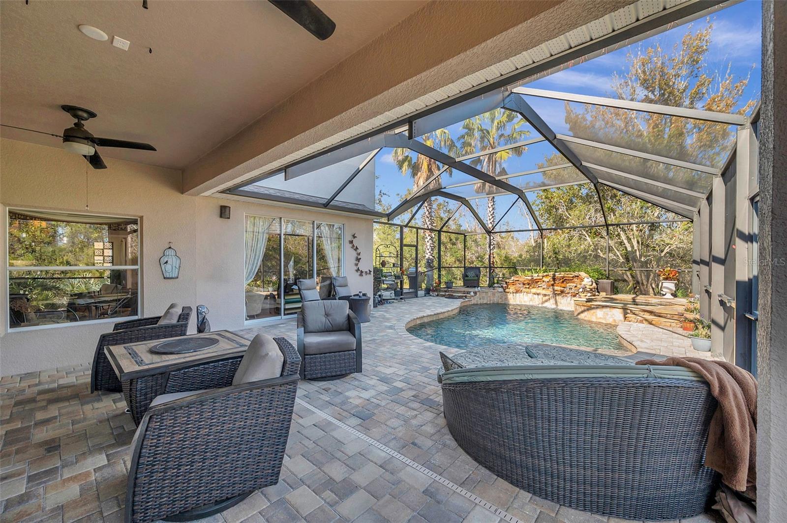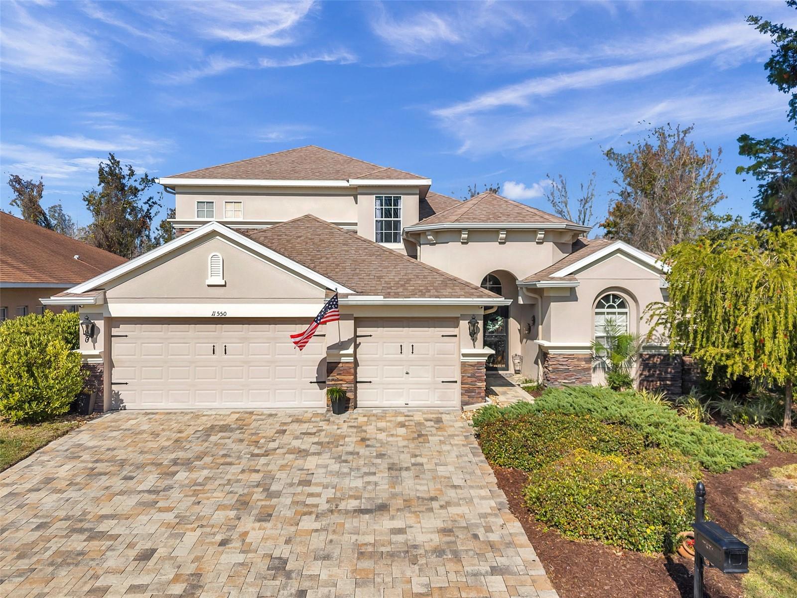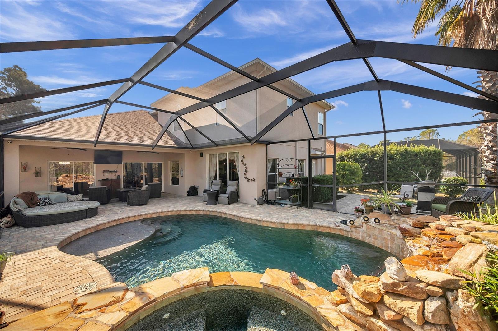 Set on a conservation lot, the property offers unparalleled privacy, with no neighbors to the right of the home, none behind the home, and none visible from the pool area. This peaceful and secluded setting is paired with the featured Huntington floorplan—the only home in the neighborhood with this unique elevation, making it a standout property. Offering 3,331 square feet of living space, 5 bedrooms, 4 bathrooms, a dedicated office, an upstairs bonus room, and a three-car garage, this home seamlessly blends thoughtful design with luxurious upgrades, creating the perfect retreat for modern living. Step inside and take in the carefully chosen details, starting with the diagonal travertine flooring throughout the common areas, an upgraded feature that adds a touch of sophistication. The gourmet kitchen is a chef’s dream, boasting custom glass cabinets with built-in lighting, Corian countertops, and a double ice-maker refrigerator. The open-concept design creates a seamless flow between the kitchen, dining, and living spaces, making it perfect for hosting family and friends. The primary bedroom suite, located on the main floor, is a luxurious sanctuary, featuring his-and-her walk-in closets, a chandelier-lit soaking tub, and a double shower with multiple heads. All bathrooms feature granite countertops, porcelain sinks, and upgraded light fixtures. Upstairs, you’ll find a bonus room, ideal for a game room or additional living space, along with four spacious bedrooms, a Jack-and-Jill bathroom, and a convenient laundry chute. The built-in intercom system ensures easy communication throughout the home. Outside, the backyard oasis awaits, centered around a heated saltwater pool and spa with self-cleaning pop-ups, requiring minimal maintenance—just rinse the filter every six weeks. The pool area, surrounded by a two-story pool cage, includes a working waterfall, a sun deck with pavers and slate rock, and a handheld remote control for the pool, spa, and waterfall settings. The propane hookup powers the pool heater and includes a convenient connector for your outdoor grill, making it a perfect setup for backyard gatherings. The home also features crown molding, wood flooring in the office, a generator hookup, an epoxy-finished garage floor, and a wired security system with exterior cameras connected to a monitor in the primary suite. The exterior features pavered driveways and walkways, upgraded gutters, and a screen door leading to the garage, ensuring functionality and curb appeal. Waters Edge offers a resort-style lifestyle with amenities such as a clubhouse, fitness center, community pool, and scenic lakes. With its unparalleled privacy, upgraded features, and one-of-a-kind floorplan, this home is more than a residence—it’s a lifestyle. Don’t miss your chance to own this rare and exceptional property. Schedule your private showing today!