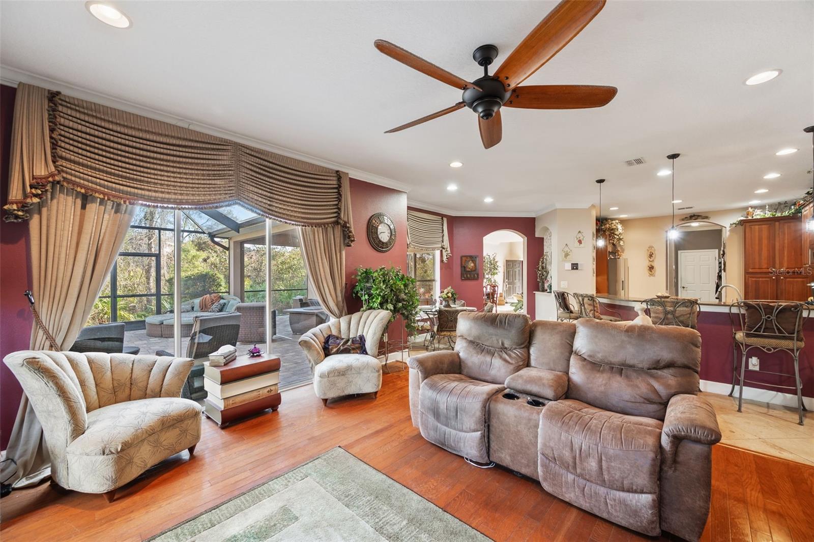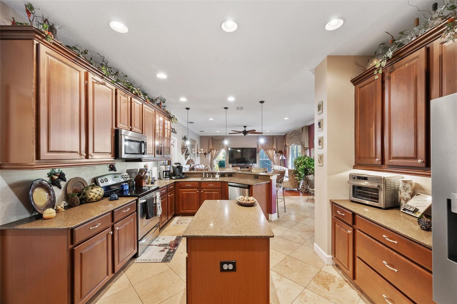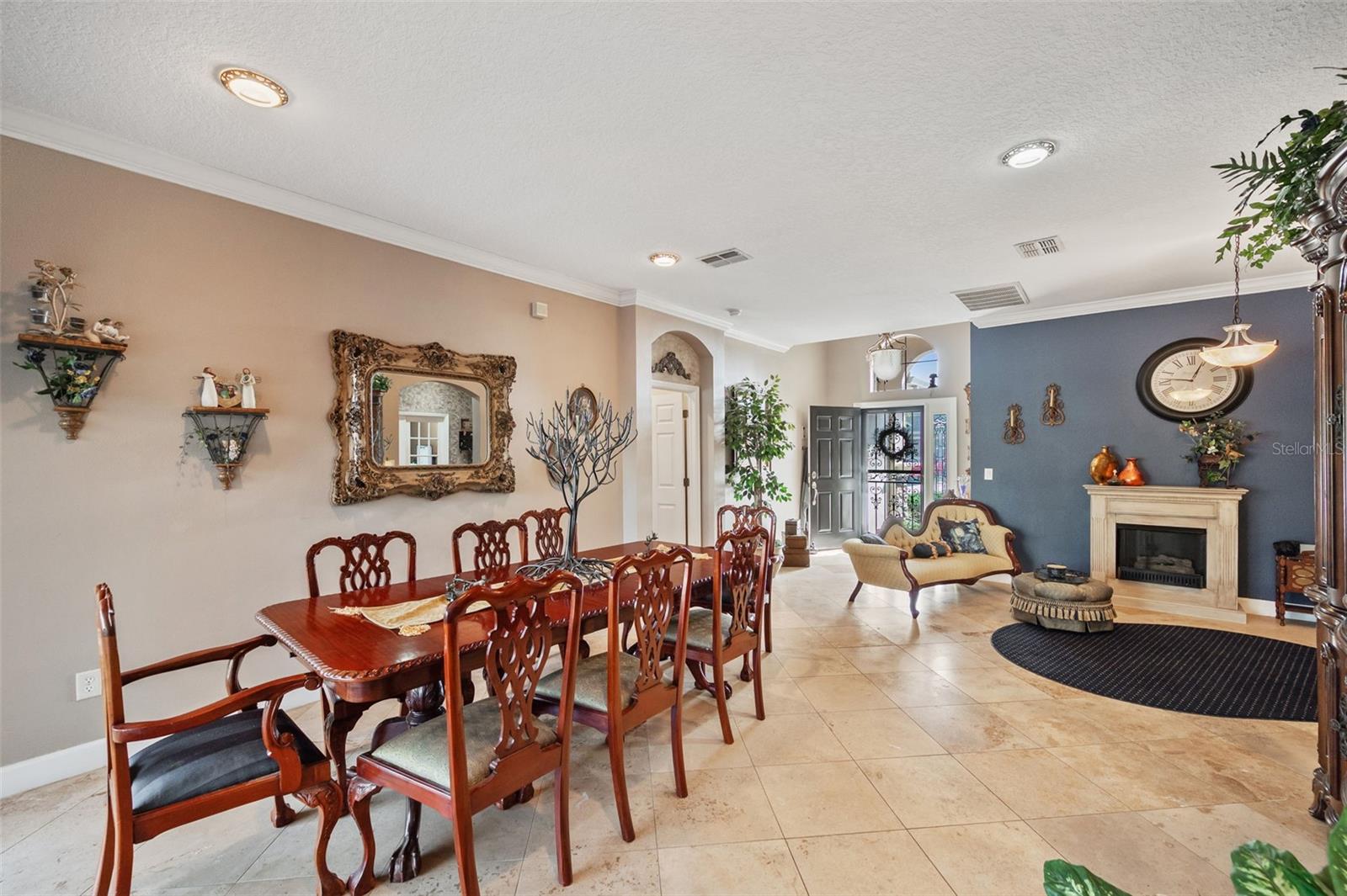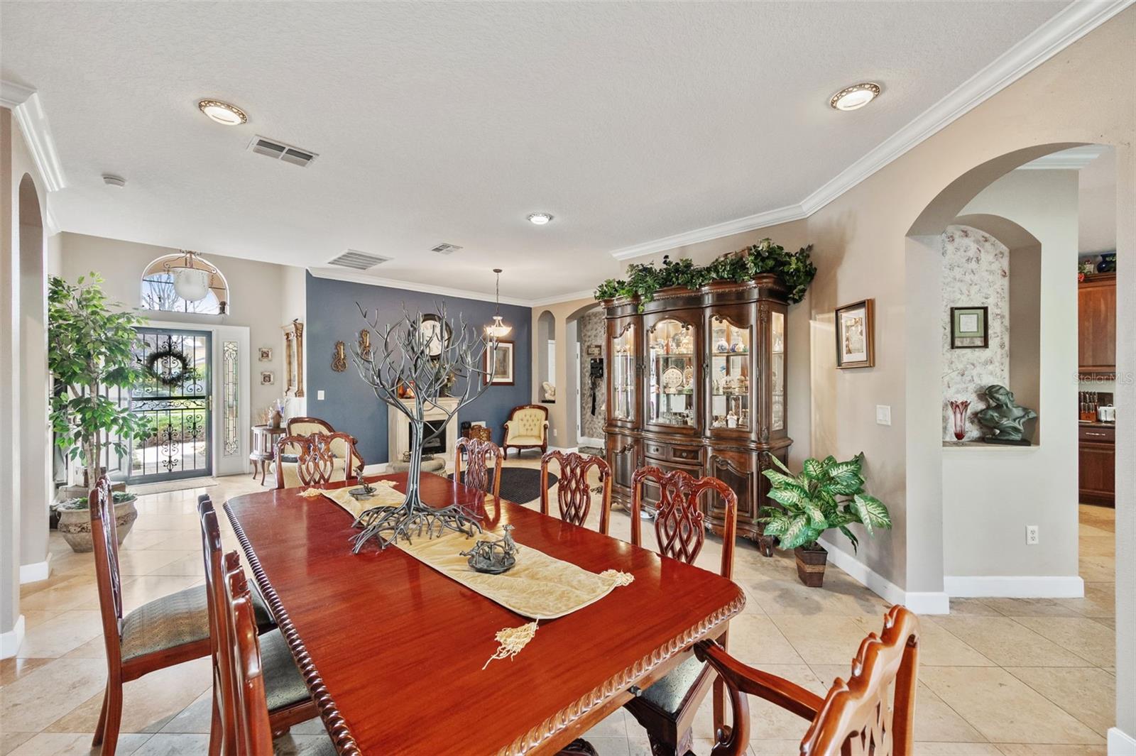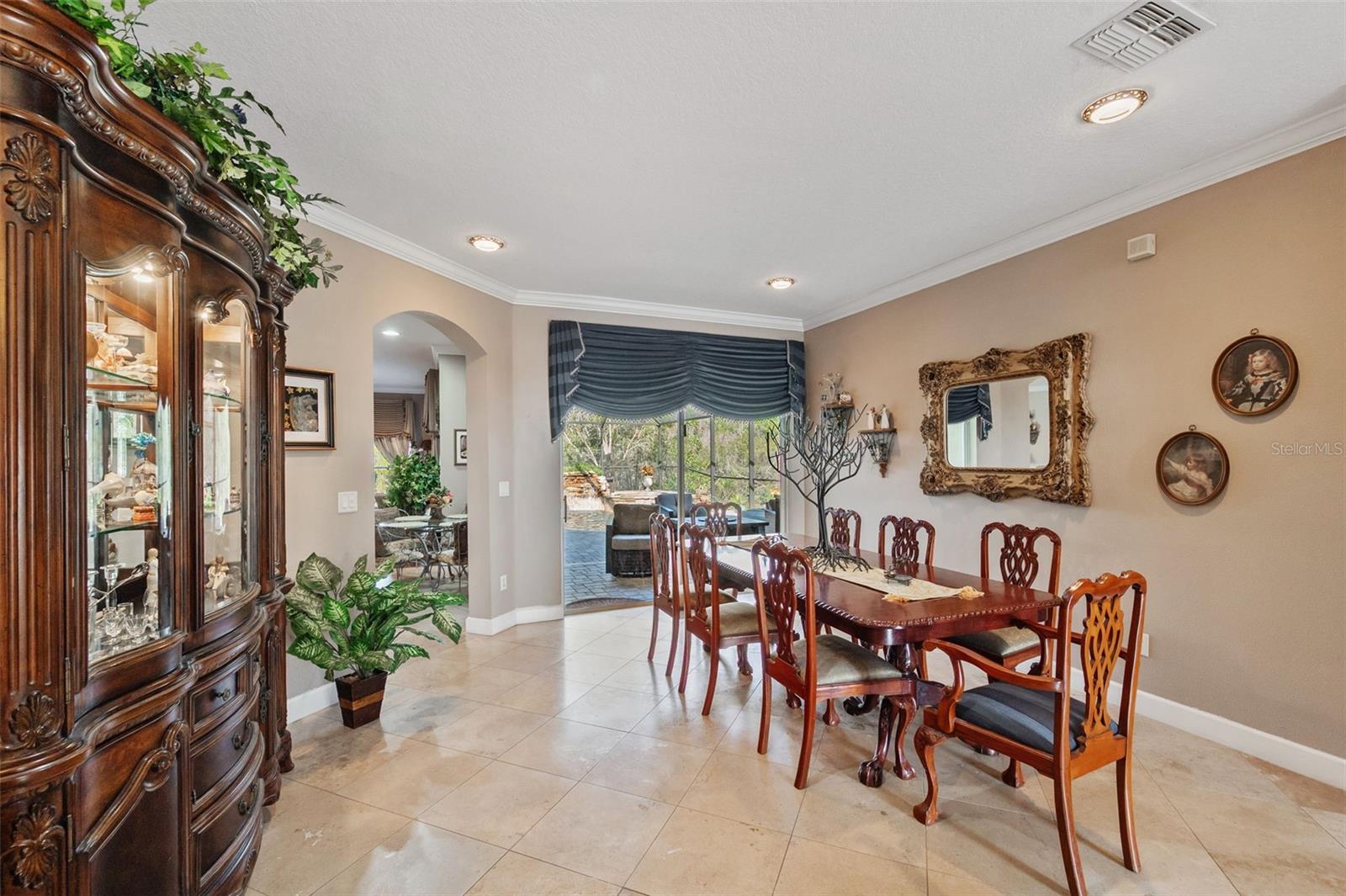 Set on a conservation lot, the property offers unparalleled privacy, with no neighbors to the right of the home, none behind the home, and none visible from the pool area. This peaceful and secluded setting is paired with the featured Huntington floorplan—the only home in the neighborhood with this unique elevation, making it a standout property. Offering 3,331 square feet of living space, 5 bedrooms, 4 bathrooms, a dedicated office, an upstairs bonus room, and a three-car garage, this home seamlessly blends thoughtful design with luxurious upgrades, creating the perfect retreat for modern living. Step inside and take in the carefully chosen details, starting with the diagonal travertine flooring throughout the common areas, an upgraded feature that adds a touch of sophistication. The gourmet kitchen is a chef’s dream, boasting custom glass cabinets with built-in lighting, Corian countertops, and a double ice-maker refrigerator. The open-concept design creates a seamless flow between the kitchen, dining, and living spaces, making it perfect for hosting family and friends. The primary bedroom suite, located on the main floor, is a luxurious sanctuary, featuring his-and-her walk-in closets, a chandelier-lit soaking tub, and a double shower with multiple heads. All bathrooms feature granite countertops, porcelain sinks, and upgraded light fixtures. Upstairs, you’ll find a bonus room, ideal for a game room or additional living space, along with four spacious bedrooms, a Jack-and-Jill bathroom, and a convenient laundry chute. The built-in intercom system ensures easy communication throughout the home. Outside, the backyard oasis awaits, centered around a heated saltwater pool and spa with self-cleaning pop-ups, requiring minimal maintenance—just rinse the filter every six weeks. The pool area, surrounded by a two-story pool cage, includes a working waterfall, a sun deck with pavers and slate rock, and a handheld remote control for the pool, spa, and waterfall settings. The propane hookup powers the pool heater and includes a convenient connector for your outdoor grill, making it a perfect setup for backyard gatherings. The home also features crown molding, wood flooring in the office, a generator hookup, an epoxy-finished garage floor, and a wired security system with exterior cameras connected to a monitor in the primary suite. The exterior features pavered driveways and walkways, upgraded gutters, and a screen door leading to the garage, ensuring functionality and curb appeal. Waters Edge offers a resort-style lifestyle with amenities such as a clubhouse, fitness center, community pool, and scenic lakes. With its unparalleled privacy, upgraded features, and one-of-a-kind floorplan, this home is more than a residence—it’s a lifestyle. Don’t miss your chance to own this rare and exceptional property. Schedule your private showing today!