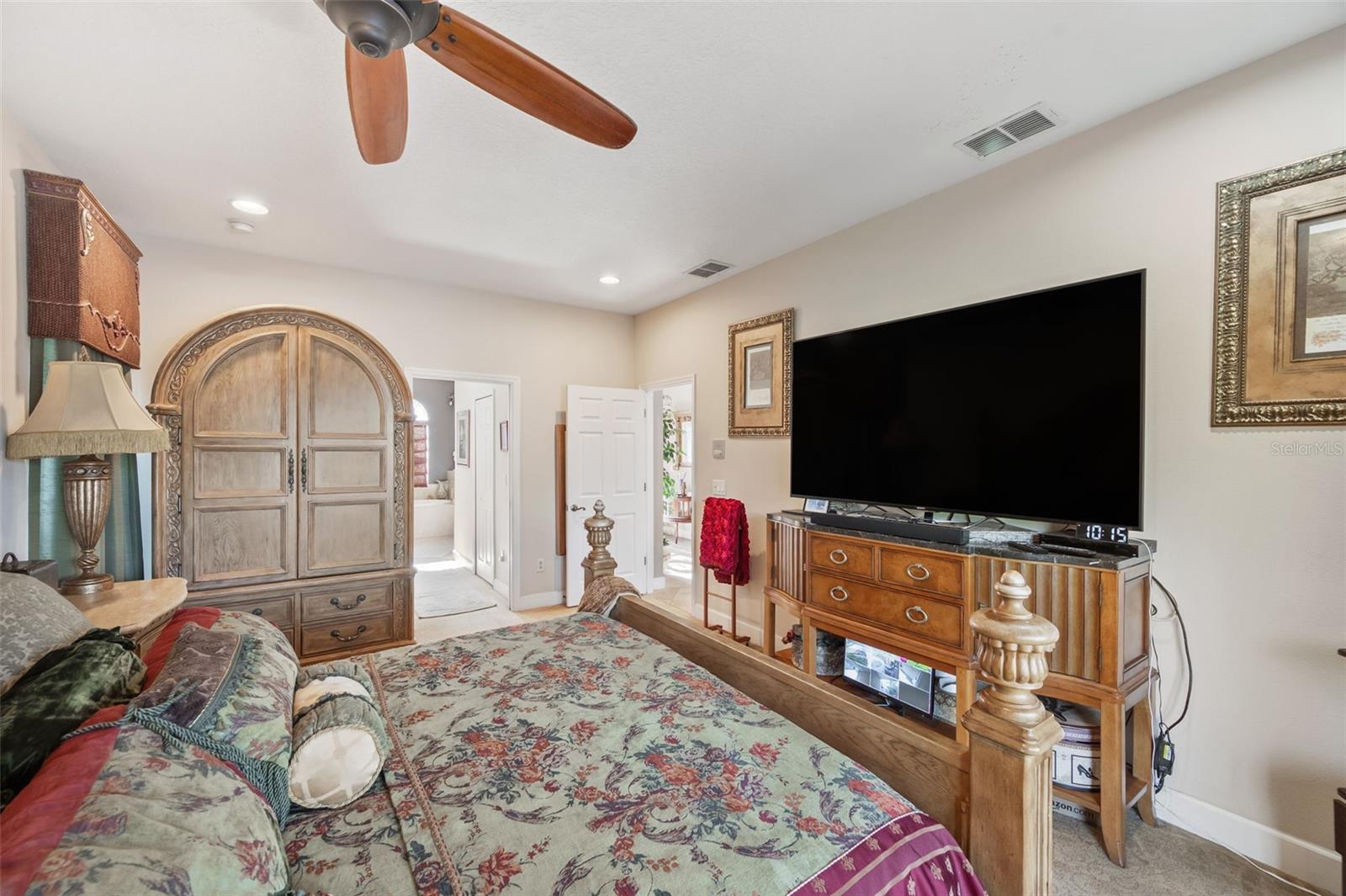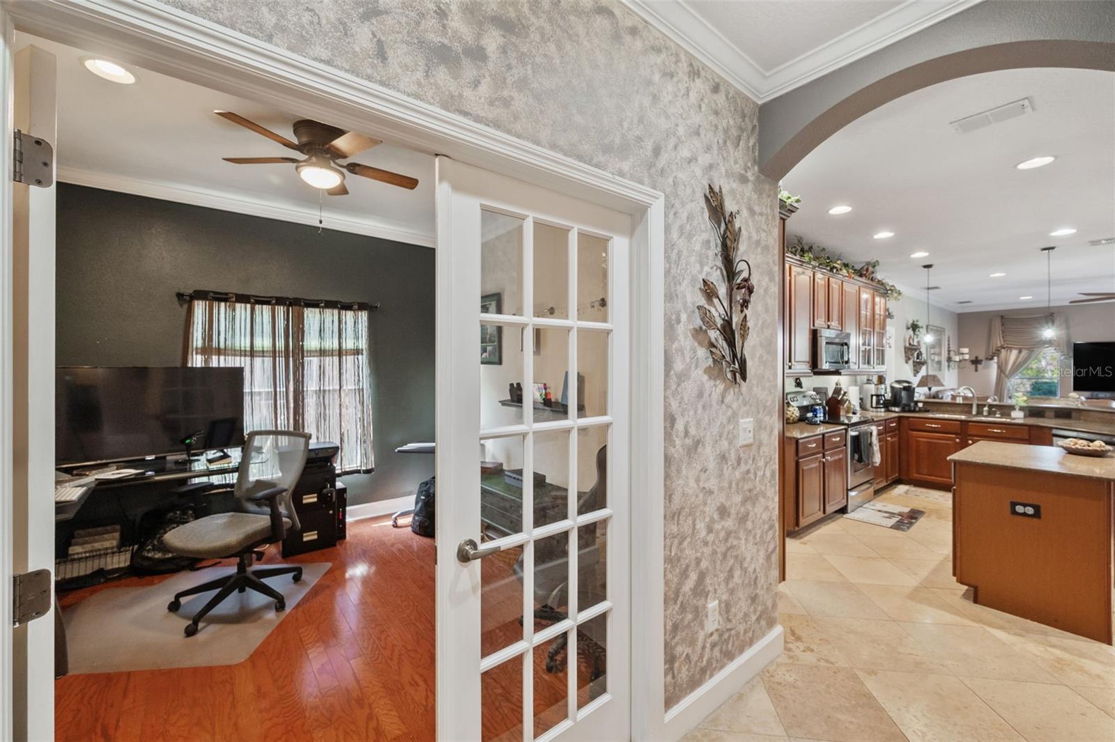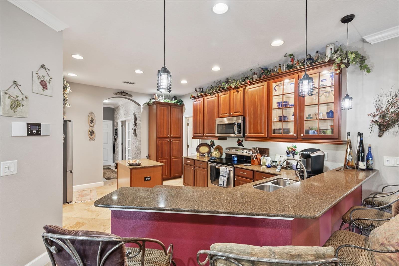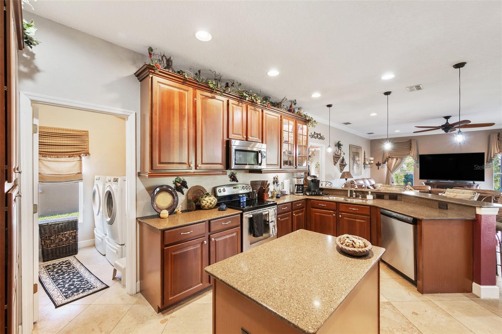 Set on a conservation lot, the property offers unparalleled privacy, with no neighbors to the right of the home, none behind the home, and none visible from the pool area. This peaceful and secluded setting is paired with the featured Huntington floorplan—the only home in the neighborhood with this unique elevation, making it a standout property. Offering 3,331 square feet of living space, 5 bedrooms, 4 bathrooms, a dedicated office, an upstairs bonus room, and a three-car garage, this home seamlessly blends thoughtful design with luxurious upgrades, creating the perfect retreat for modern living. Step inside and take in the carefully chosen details, starting with the diagonal travertine flooring throughout the common areas, an upgraded feature that adds a touch of sophistication. The gourmet kitchen is a chef’s dream, boasting custom glass cabinets with built-in lighting, Corian countertops, and a double ice-maker refrigerator. The open-concept design creates a seamless flow between the kitchen, dining, and living spaces, making it perfect for hosting family and friends. The primary bedroom suite, located on the main floor, is a luxurious sanctuary, featuring his-and-her walk-in closets, a chandelier-lit soaking tub, and a double shower with multiple heads. All bathrooms feature granite countertops, porcelain sinks, and upgraded light fixtures. Upstairs, you’ll find a bonus room, ideal for a game room or additional living space, along with four spacious bedrooms, a Jack-and-Jill bathroom, and a convenient laundry chute. The built-in intercom system ensures easy communication throughout the home. Outside, the backyard oasis awaits, centered around a heated saltwater pool and spa with self-cleaning pop-ups, requiring minimal maintenance—just rinse the filter every six weeks. The pool area, surrounded by a two-story pool cage, includes a working waterfall, a sun deck with pavers and slate rock, and a handheld remote control for the pool, spa, and waterfall settings. The propane hookup powers the pool heater and includes a convenient connector for your outdoor grill, making it a perfect setup for backyard gatherings. The home also features crown molding, wood flooring in the office, a generator hookup, an epoxy-finished garage floor, and a wired security system with exterior cameras connected to a monitor in the primary suite. The exterior features pavered driveways and walkways, upgraded gutters, and a screen door leading to the garage, ensuring functionality and curb appeal. Waters Edge offers a resort-style lifestyle with amenities such as a clubhouse, fitness center, community pool, and scenic lakes. With its unparalleled privacy, upgraded features, and one-of-a-kind floorplan, this home is more than a residence—it’s a lifestyle. Don’t miss your chance to own this rare and exceptional property. Schedule your private showing today!
