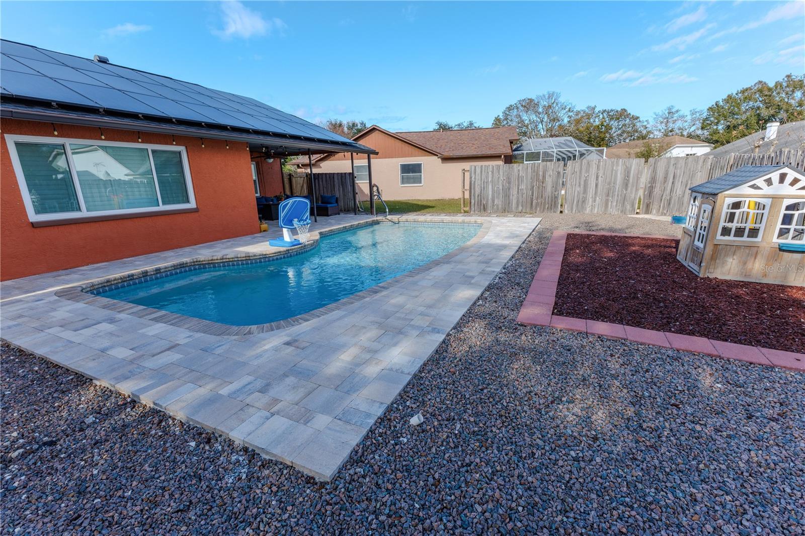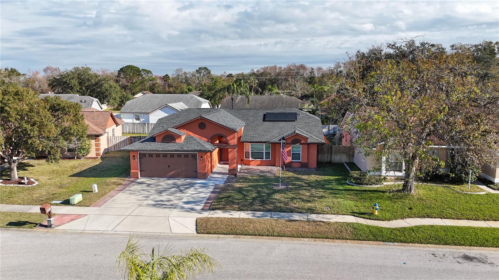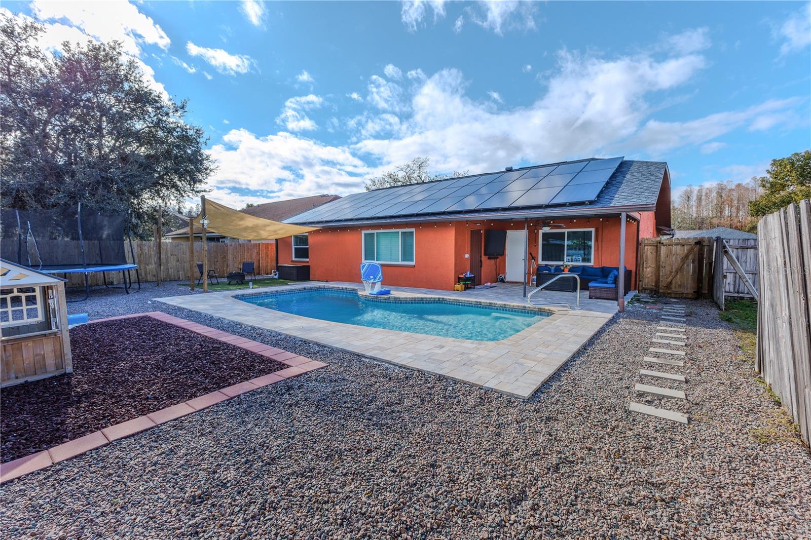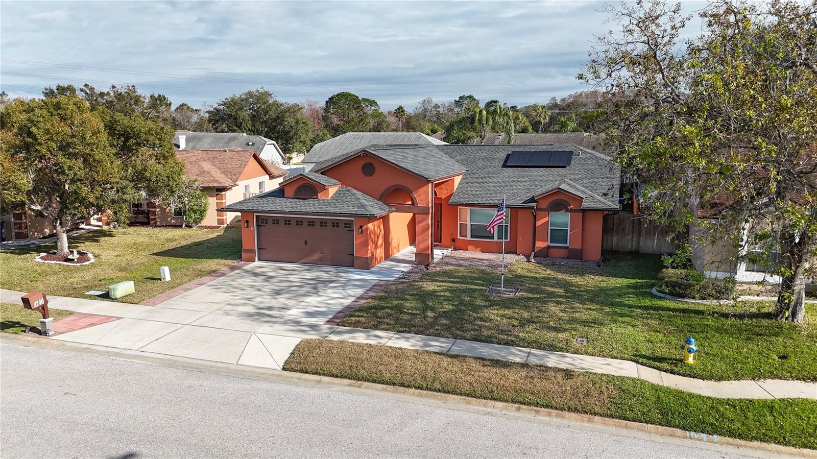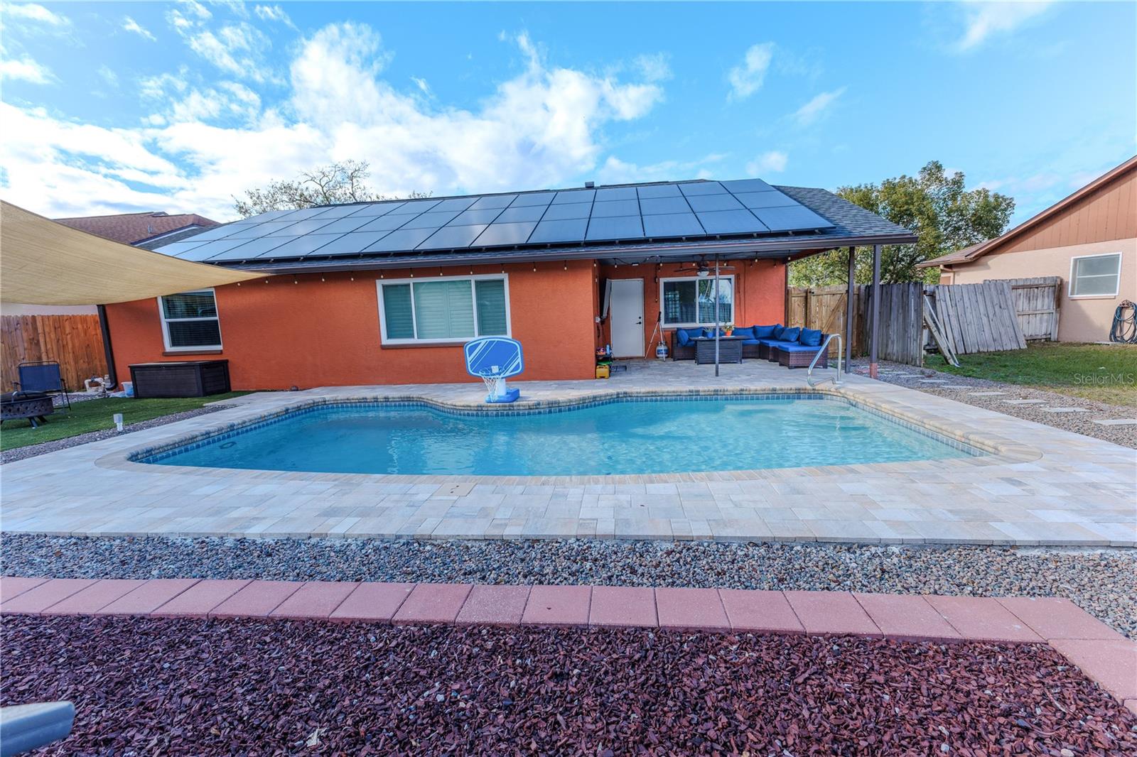 Discover the highly sought-after Mill Run Community! Zoned for Deer Park Elementary & River Ridge Middle and High Schools! This is an adorable, like new, and move-in ready home with 3 bedrooms (split bedroom plan), 2 baths, 1,677 square feet, with two-car garage which has been partially converted into heated and cooled office space. New Roof and rain gutters 2021! Full solar panel system 2021! New windows and doors 2020. Flexible fabric hurricane screens for the windows! Smart home features include: My-Q Quiet Wi-Fi Smart Garage Door Opener, hardwired 8-camera security system for enhanced safety, fingerprint front door lock for keyless convenience, Nest thermostat for efficient temperature control, smart wi-fi oven/range, and Ring doorbell system, and in-ceiling surround sound system with pre-wiring. The home is nestled on a quiet cul-de-sac with a great community feel. Out front you will find a large front parking area and plenty of curb appeal. Inside the home you will find a well-lit and spacious wide-open floorplan! Much of the home has vaulted ceilings. The majority of the home has luxury plank vinyl and the remaining areas have tile. The kitchen is central to the main living area, has been updated, and includes a huge breakfast bar island, stainless range with double convection ovens, dishwasher, microwave, and French door refrigerator, wood cabinets, granite counters, stainless undermount sink, cup washer at the sink, can lighting and more! The home has many LED can lights which also have a rare nightlight feature. Features like oversized barn doors and plantation shutters add to the designer feel of the home! The master bedroom is large and has a large walk-in closet with built in shelving! The master bath has been luxuriously upgraded with a walk-in shower and lighted and heated vanity mirror. The guest bath has a tub/shower combo. The pool is the perfect place to relax and enjoy the sun while cooling off! The pool has a pavered pool deck, saltwater chlorinator, and a variable speed pool pump. There is a large under roof area for outdoor dining, watching your favorite shows while swimming, entertaining, lounging around the pool, and more! The back yard has xeriscape landscaping and rubber mulch play area. The garage has been partially converted to accommodate interior office space but could potentially still fit one car or remove the office if you prefer a two car garage. The garage has a full front screen door enclosure system and a side utility door. The attic above the garage has been professionally converted into a storage attic. No CDD fees and low HOA/fees! Whether you're sitting on the patio, swimming in the pool, enjoying the warmth of your residence, or enjoying a cookout with guests, this is a fantastic place to call home! This captivating home is a rare gem that promises comfort, elegance, and a touch of luxury. Great location near shopping, world famous beaches, airport, dining, medical facilities, world class golfing, world-class entertainment, Tampa International Airport, colleges/universities & more! All measurements approx. Schedule your appointment today.