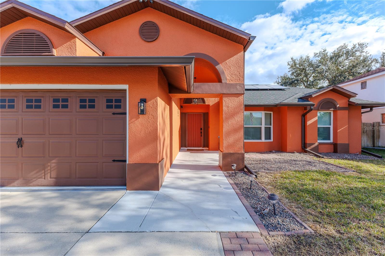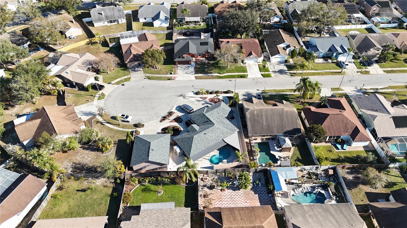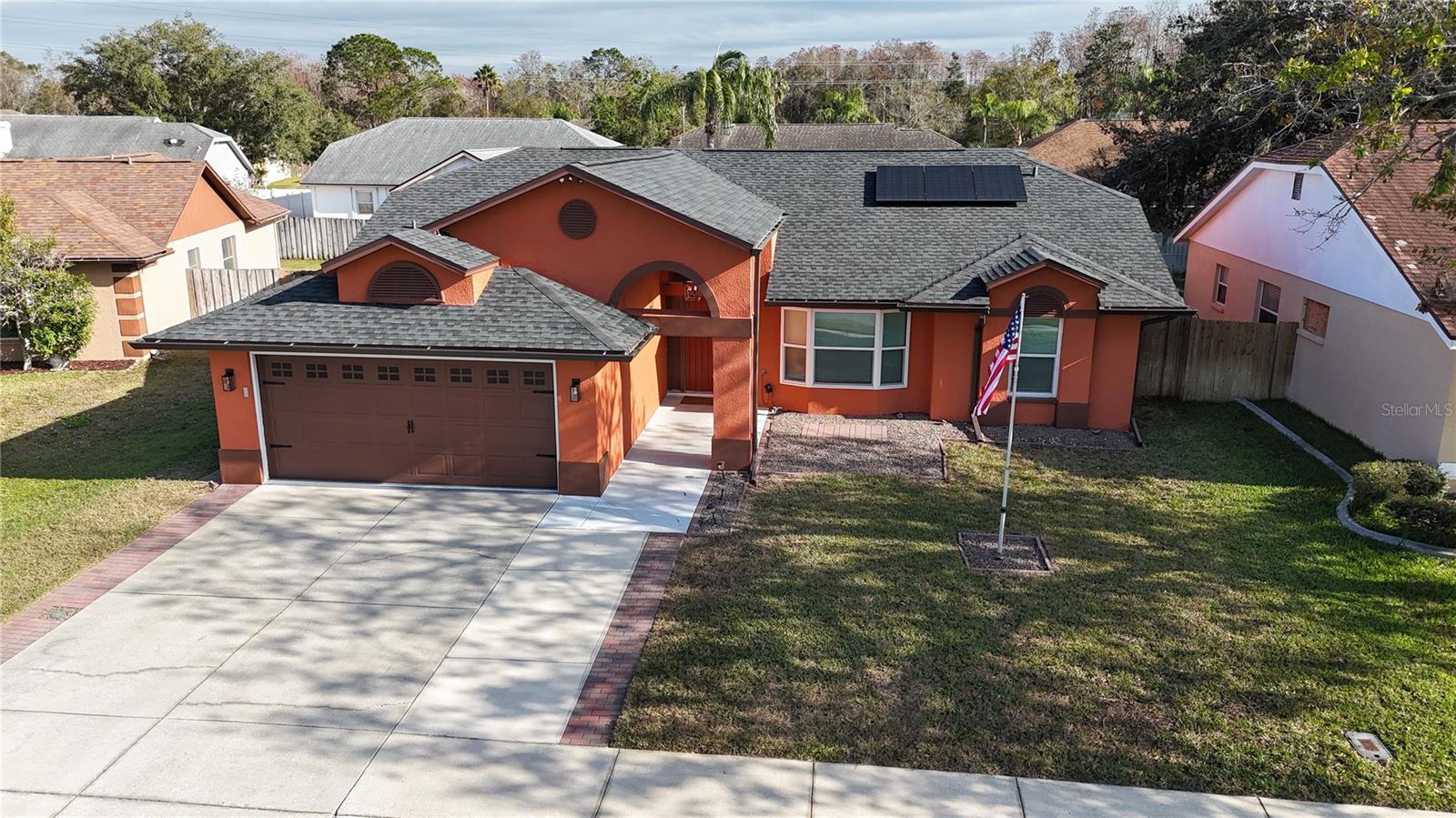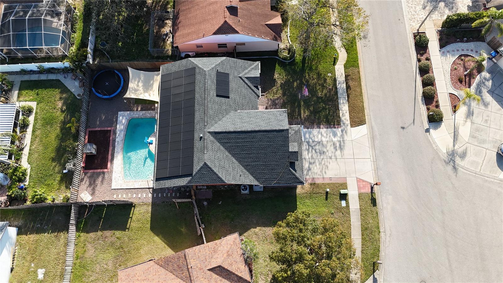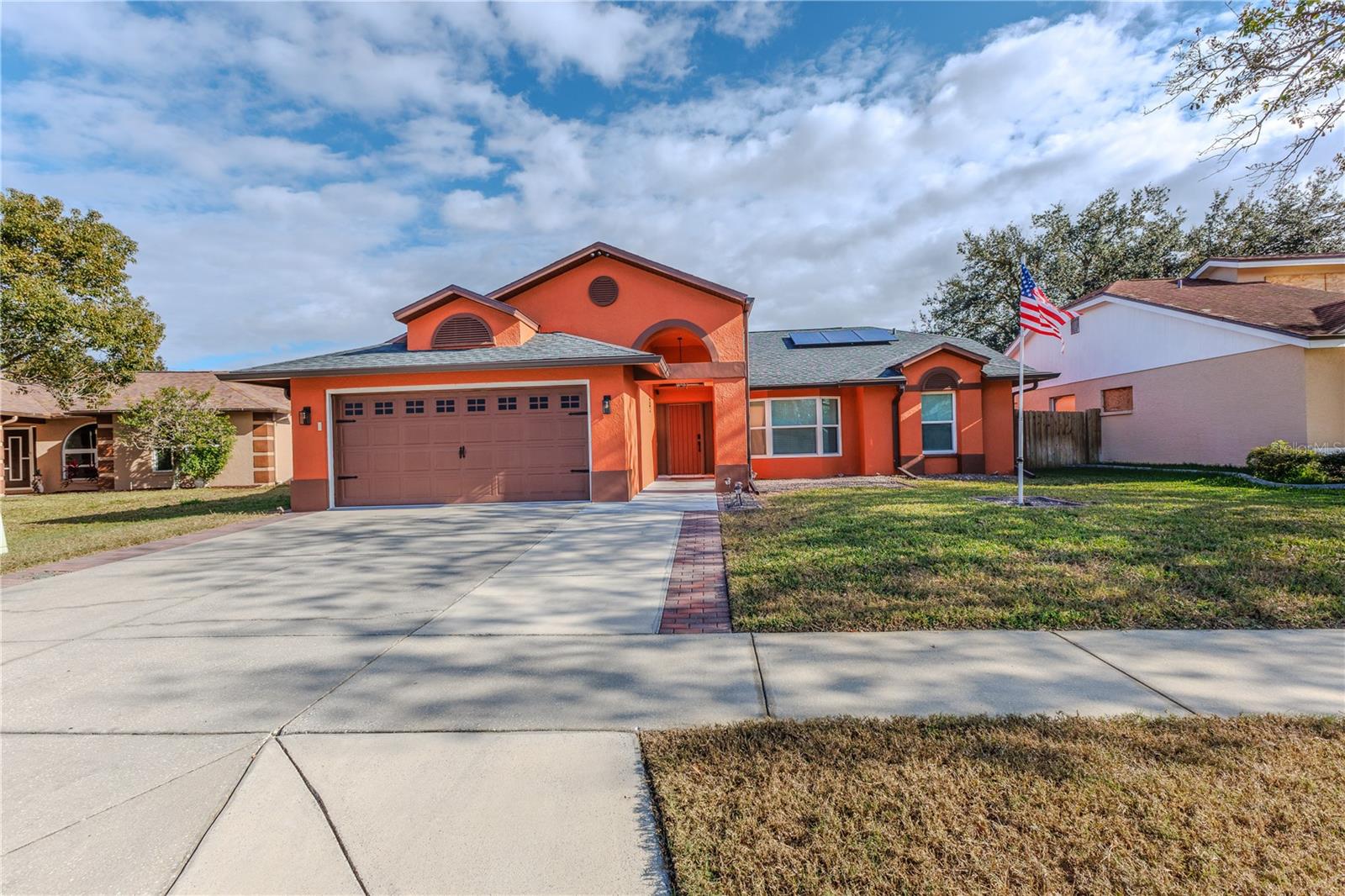 Discover the highly sought-after Mill Run Community! Zoned for Deer Park Elementary & River Ridge Middle and High Schools! This is an adorable, like new, and move-in ready home with 3 bedrooms (split bedroom plan), 2 baths, 1,677 square feet, with two-car garage which has been partially converted into heated and cooled office space. New Roof and rain gutters 2021! Full solar panel system 2021! New windows and doors 2020. Flexible fabric hurricane screens for the windows! Smart home features include: My-Q Quiet Wi-Fi Smart Garage Door Opener, hardwired 8-camera security system for enhanced safety, fingerprint front door lock for keyless convenience, Nest thermostat for efficient temperature control, smart wi-fi oven/range, and Ring doorbell system, and in-ceiling surround sound system with pre-wiring. The home is nestled on a quiet cul-de-sac with a great community feel. Out front you will find a large front parking area and plenty of curb appeal. Inside the home you will find a well-lit and spacious wide-open floorplan! Much of the home has vaulted ceilings. The majority of the home has luxury plank vinyl and the remaining areas have tile. The kitchen is central to the main living area, has been updated, and includes a huge breakfast bar island, stainless range with double convection ovens, dishwasher, microwave, and French door refrigerator, wood cabinets, granite counters, stainless undermount sink, cup washer at the sink, can lighting and more! The home has many LED can lights which also have a rare nightlight feature. Features like oversized barn doors and plantation shutters add to the designer feel of the home! The master bedroom is large and has a large walk-in closet with built in shelving! The master bath has been luxuriously upgraded with a walk-in shower and lighted and heated vanity mirror. The guest bath has a tub/shower combo. The pool is the perfect place to relax and enjoy the sun while cooling off! The pool has a pavered pool deck, saltwater chlorinator, and a variable speed pool pump. There is a large under roof area for outdoor dining, watching your favorite shows while swimming, entertaining, lounging around the pool, and more! The back yard has xeriscape landscaping and rubber mulch play area. The garage has been partially converted to accommodate interior office space but could potentially still fit one car or remove the office if you prefer a two car garage. The garage has a full front screen door enclosure system and a side utility door. The attic above the garage has been professionally converted into a storage attic. No CDD fees and low HOA/fees! Whether you're sitting on the patio, swimming in the pool, enjoying the warmth of your residence, or enjoying a cookout with guests, this is a fantastic place to call home! This captivating home is a rare gem that promises comfort, elegance, and a touch of luxury. Great location near shopping, world famous beaches, airport, dining, medical facilities, world class golfing, world-class entertainment, Tampa International Airport, colleges/universities & more! All measurements approx. Schedule your appointment today.