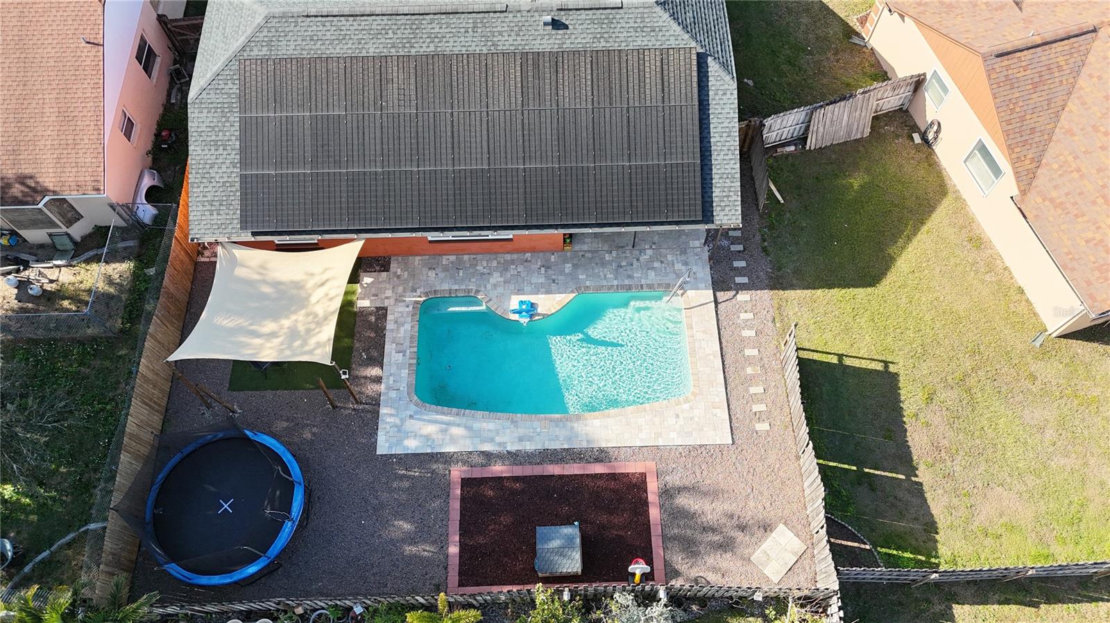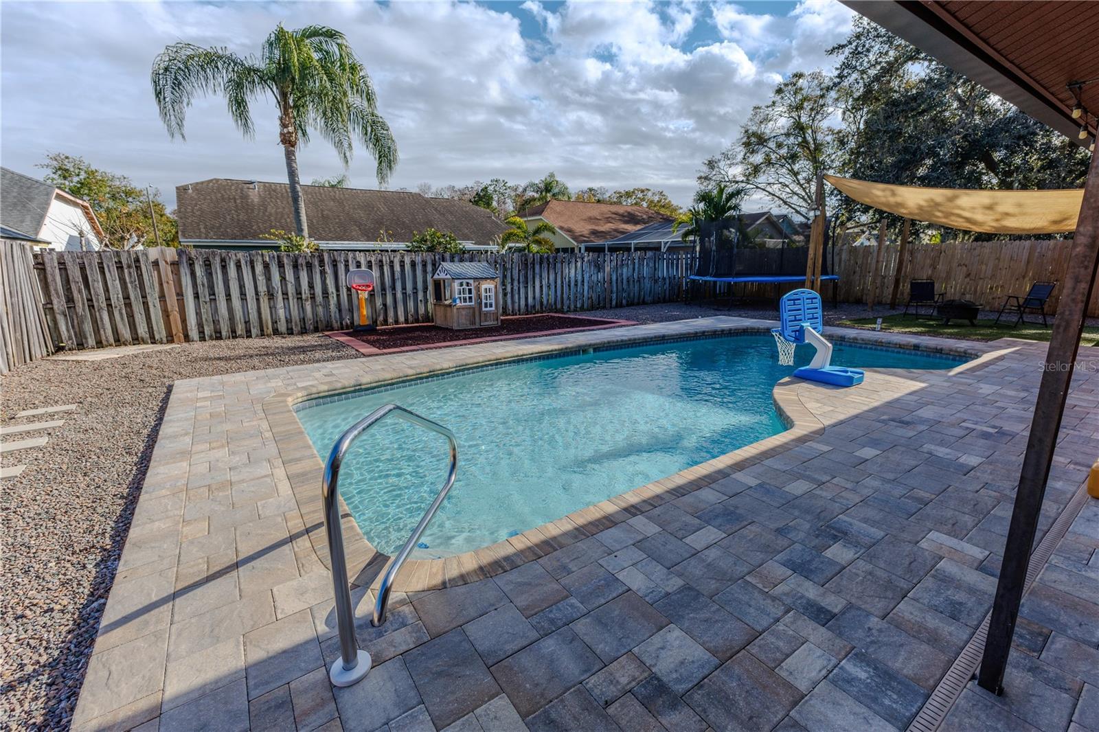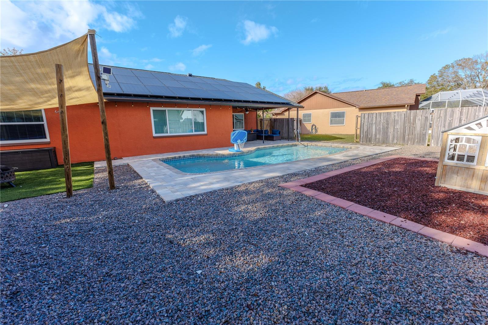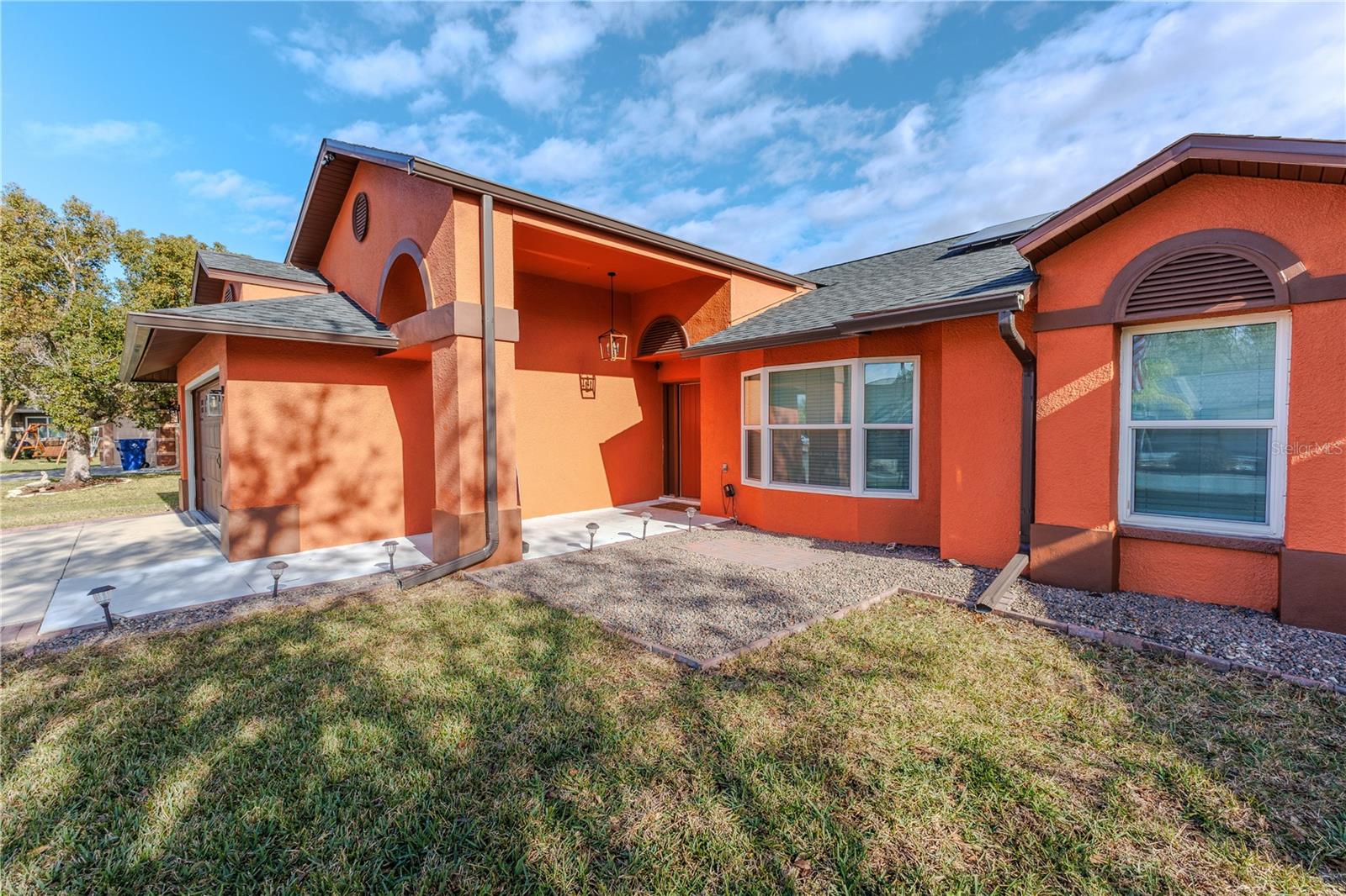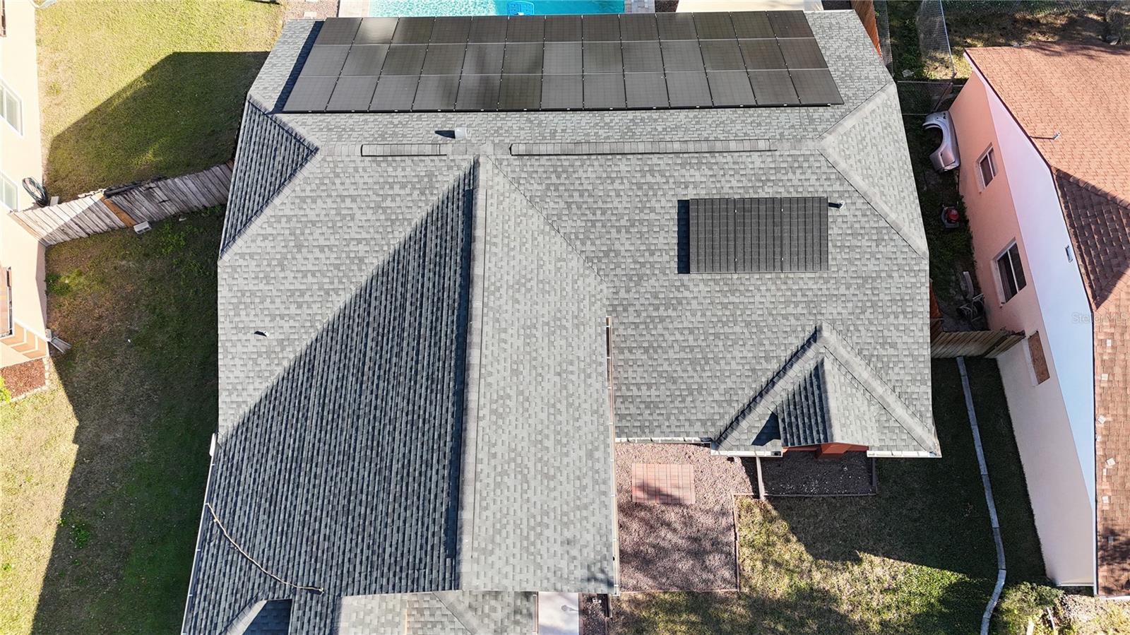 Discover the highly sought-after Mill Run Community! Zoned for Deer Park Elementary & River Ridge Middle and High Schools! This is an adorable, like new, and move-in ready home with 3 bedrooms (split bedroom plan), 2 baths, 1,677 square feet, with two-car garage which has been partially converted into heated and cooled office space. New Roof and rain gutters 2021! Full solar panel system 2021! New windows and doors 2020. Flexible fabric hurricane screens for the windows! Smart home features include: My-Q Quiet Wi-Fi Smart Garage Door Opener, hardwired 8-camera security system for enhanced safety, fingerprint front door lock for keyless convenience, Nest thermostat for efficient temperature control, smart wi-fi oven/range, and Ring doorbell system, and in-ceiling surround sound system with pre-wiring. The home is nestled on a quiet cul-de-sac with a great community feel. Out front you will find a large front parking area and plenty of curb appeal. Inside the home you will find a well-lit and spacious wide-open floorplan! Much of the home has vaulted ceilings. The majority of the home has luxury plank vinyl and the remaining areas have tile. The kitchen is central to the main living area, has been updated, and includes a huge breakfast bar island, stainless range with double convection ovens, dishwasher, microwave, and French door refrigerator, wood cabinets, granite counters, stainless undermount sink, cup washer at the sink, can lighting and more! The home has many LED can lights which also have a rare nightlight feature. Features like oversized barn doors and plantation shutters add to the designer feel of the home! The master bedroom is large and has a large walk-in closet with built in shelving! The master bath has been luxuriously upgraded with a walk-in shower and lighted and heated vanity mirror. The guest bath has a tub/shower combo. The pool is the perfect place to relax and enjoy the sun while cooling off! The pool has a pavered pool deck, saltwater chlorinator, and a variable speed pool pump. There is a large under roof area for outdoor dining, watching your favorite shows while swimming, entertaining, lounging around the pool, and more! The back yard has xeriscape landscaping and rubber mulch play area. The garage has been partially converted to accommodate interior office space but could potentially still fit one car or remove the office if you prefer a two car garage. The garage has a full front screen door enclosure system and a side utility door. The attic above the garage has been professionally converted into a storage attic. No CDD fees and low HOA/fees! Whether you're sitting on the patio, swimming in the pool, enjoying the warmth of your residence, or enjoying a cookout with guests, this is a fantastic place to call home! This captivating home is a rare gem that promises comfort, elegance, and a touch of luxury. Great location near shopping, world famous beaches, airport, dining, medical facilities, world class golfing, world-class entertainment, Tampa International Airport, colleges/universities & more! All measurements approx. Schedule your appointment today.