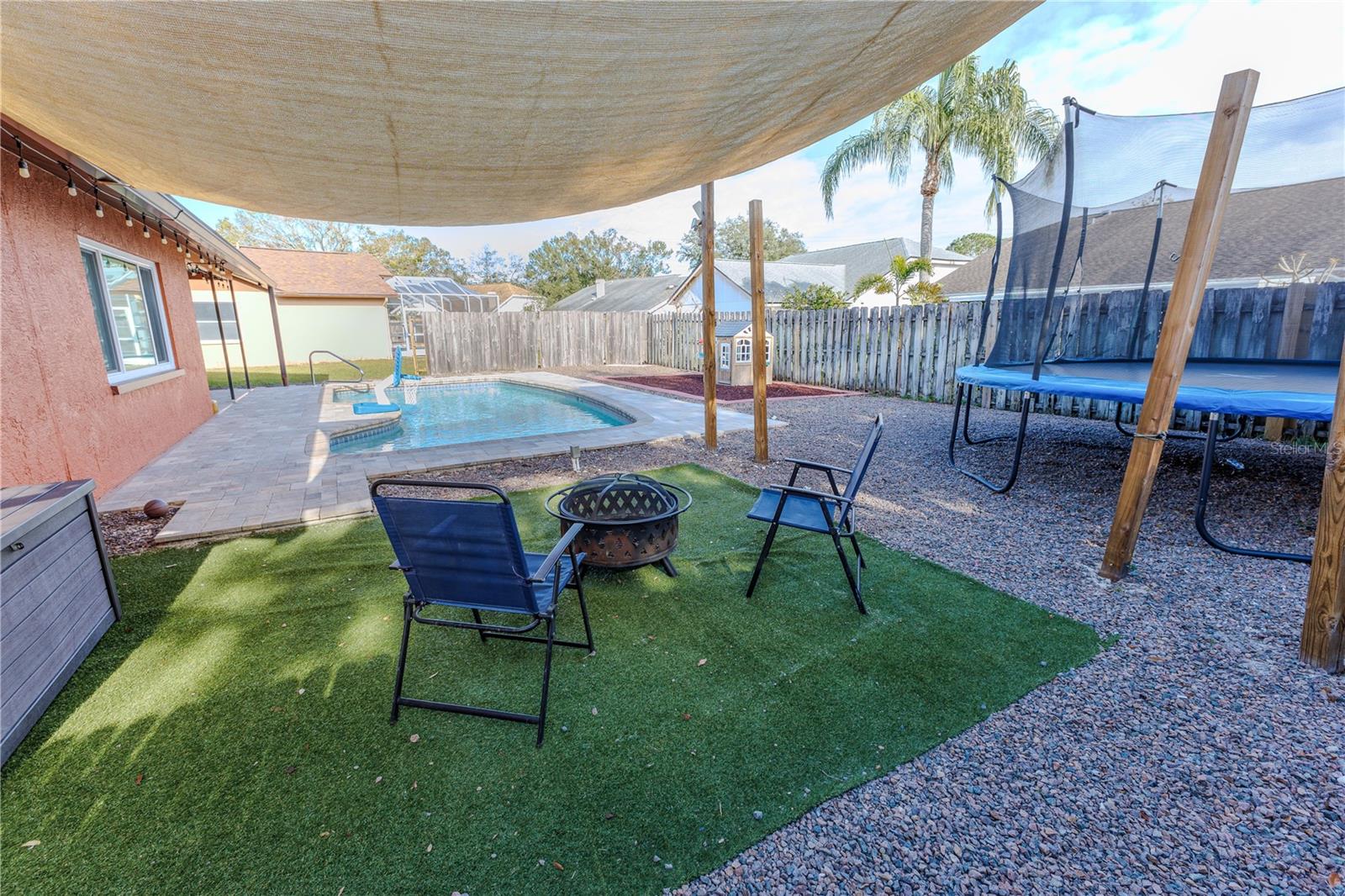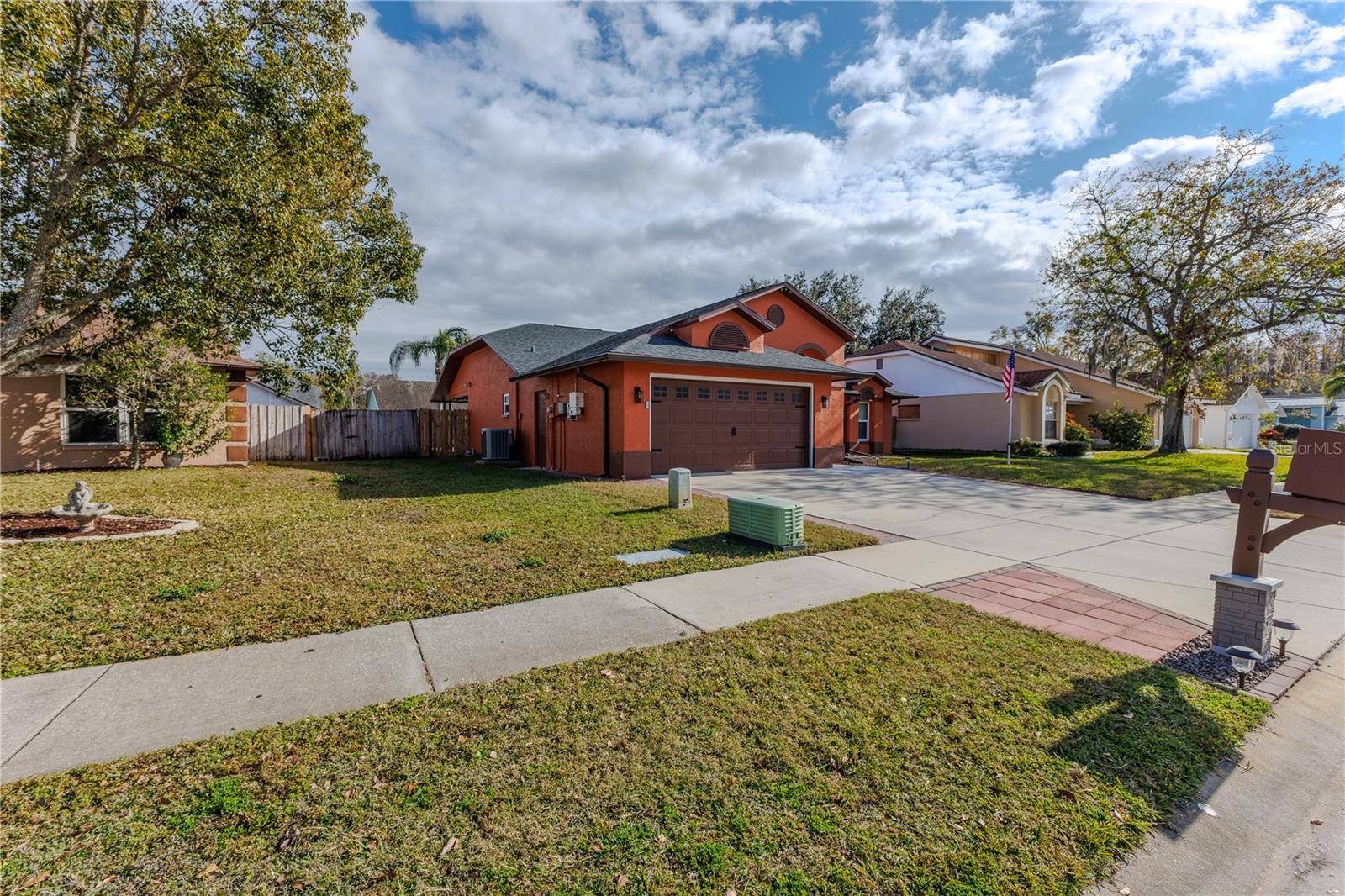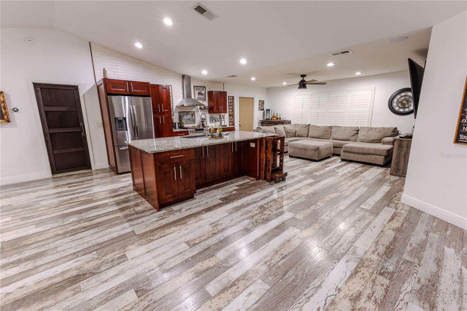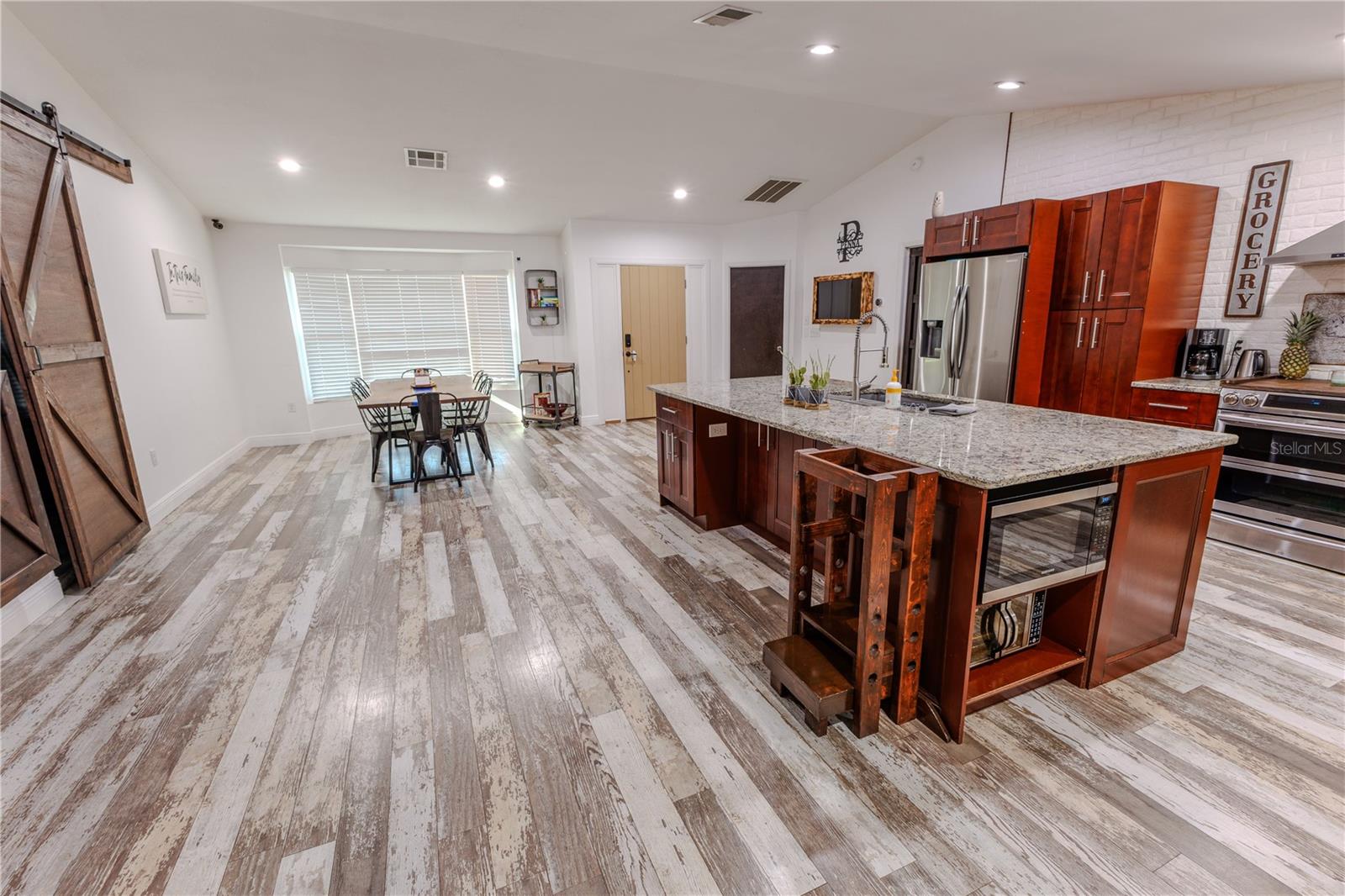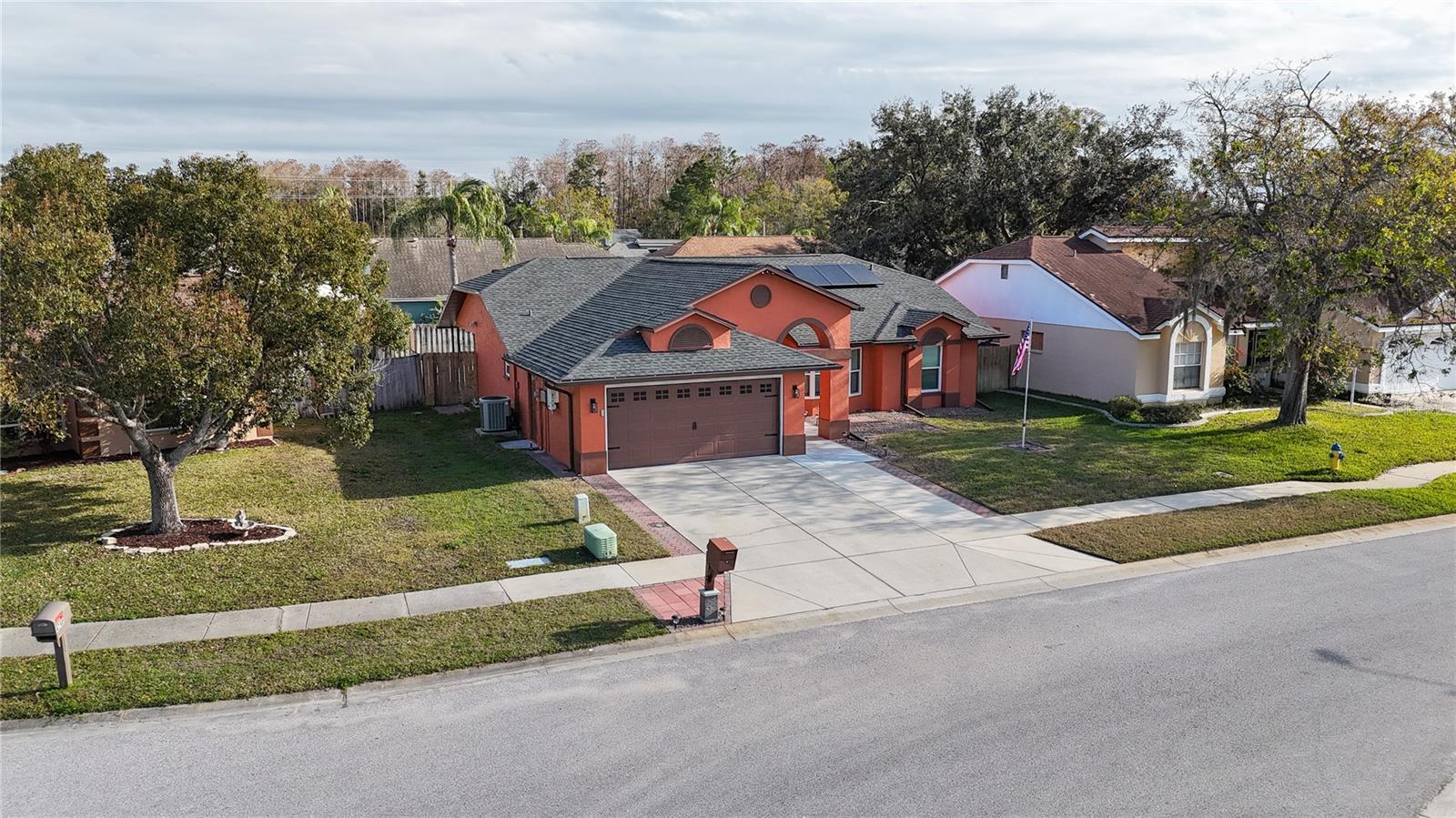 Discover the highly sought-after Mill Run Community! Zoned for Deer Park Elementary & River Ridge Middle and High Schools! This is an adorable, like new, and move-in ready home with 3 bedrooms (split bedroom plan), 2 baths, 1,677 square feet, with two-car garage which has been partially converted into heated and cooled office space. New Roof and rain gutters 2021! Full solar panel system 2021! New windows and doors 2020. Flexible fabric hurricane screens for the windows! Smart home features include: My-Q Quiet Wi-Fi Smart Garage Door Opener, hardwired 8-camera security system for enhanced safety, fingerprint front door lock for keyless convenience, Nest thermostat for efficient temperature control, smart wi-fi oven/range, and Ring doorbell system, and in-ceiling surround sound system with pre-wiring. The home is nestled on a quiet cul-de-sac with a great community feel. Out front you will find a large front parking area and plenty of curb appeal. Inside the home you will find a well-lit and spacious wide-open floorplan! Much of the home has vaulted ceilings. The majority of the home has luxury plank vinyl and the remaining areas have tile. The kitchen is central to the main living area, has been updated, and includes a huge breakfast bar island, stainless range with double convection ovens, dishwasher, microwave, and French door refrigerator, wood cabinets, granite counters, stainless undermount sink, cup washer at the sink, can lighting and more! The home has many LED can lights which also have a rare nightlight feature. Features like oversized barn doors and plantation shutters add to the designer feel of the home! The master bedroom is large and has a large walk-in closet with built in shelving! The master bath has been luxuriously upgraded with a walk-in shower and lighted and heated vanity mirror. The guest bath has a tub/shower combo. The pool is the perfect place to relax and enjoy the sun while cooling off! The pool has a pavered pool deck, saltwater chlorinator, and a variable speed pool pump. There is a large under roof area for outdoor dining, watching your favorite shows while swimming, entertaining, lounging around the pool, and more! The back yard has xeriscape landscaping and rubber mulch play area. The garage has been partially converted to accommodate interior office space but could potentially still fit one car or remove the office if you prefer a two car garage. The garage has a full front screen door enclosure system and a side utility door. The attic above the garage has been professionally converted into a storage attic. No CDD fees and low HOA/fees! Whether you're sitting on the patio, swimming in the pool, enjoying the warmth of your residence, or enjoying a cookout with guests, this is a fantastic place to call home! This captivating home is a rare gem that promises comfort, elegance, and a touch of luxury. Great location near shopping, world famous beaches, airport, dining, medical facilities, world class golfing, world-class entertainment, Tampa International Airport, colleges/universities & more! All measurements approx. Schedule your appointment today.