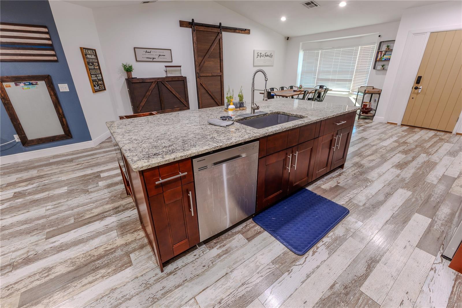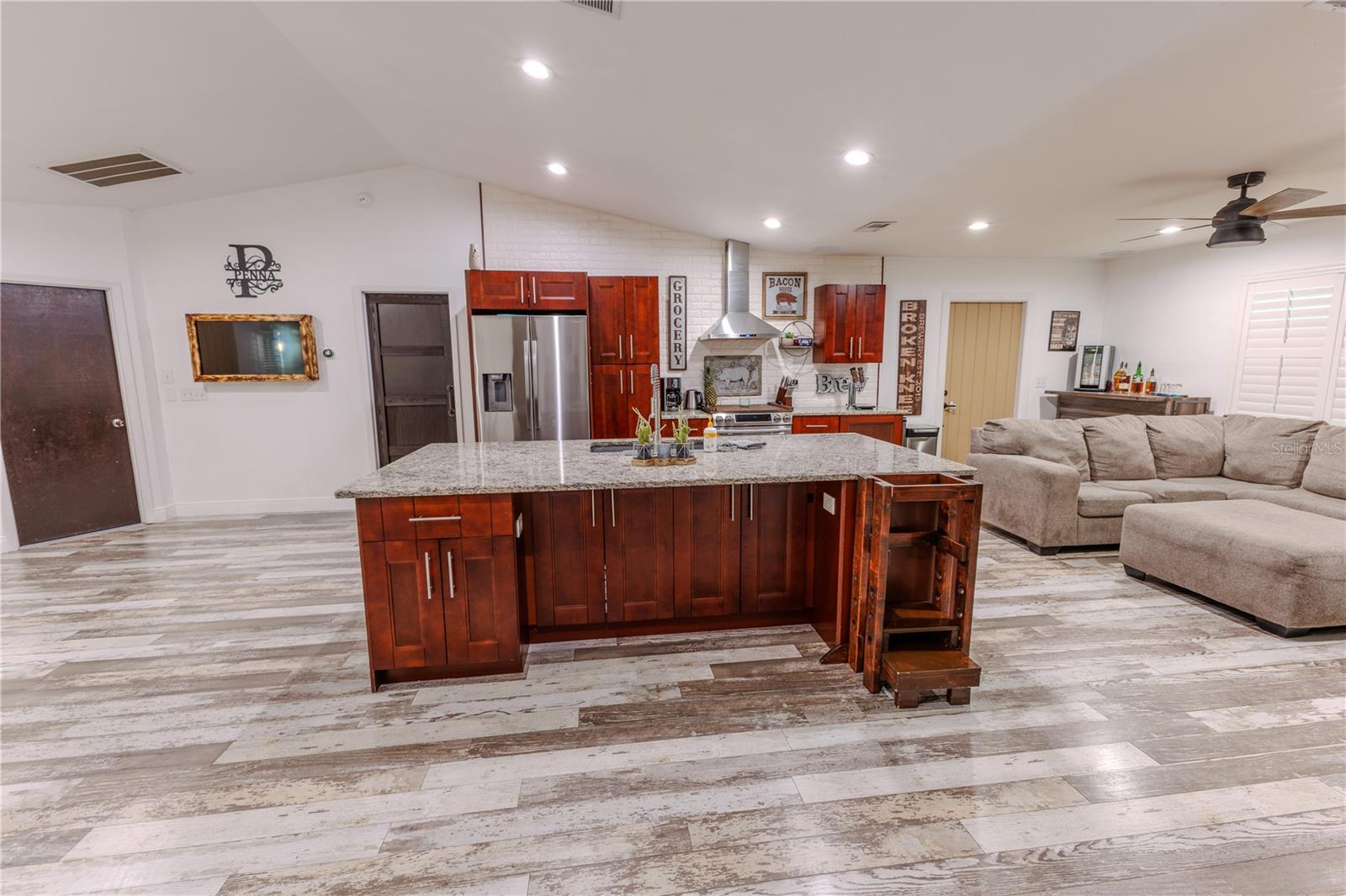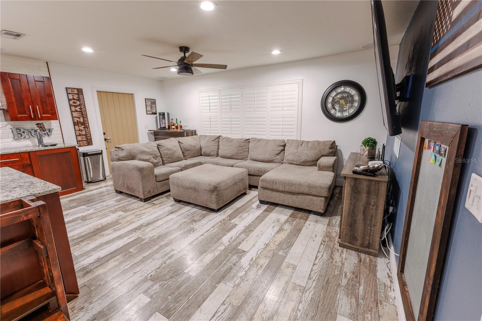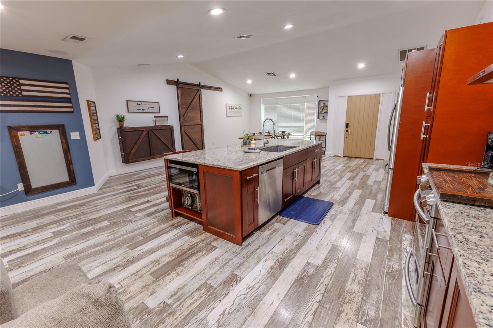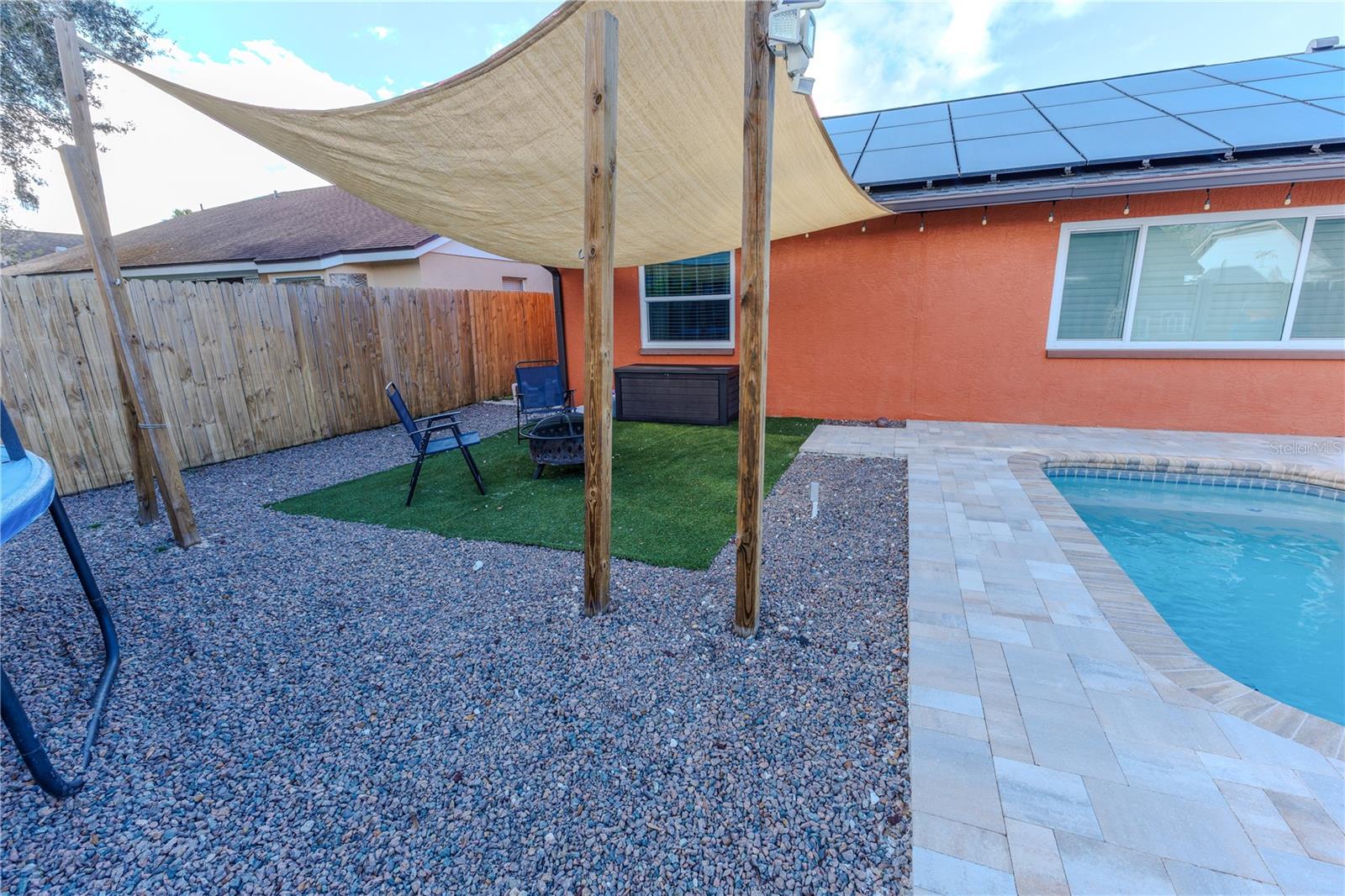 Discover the highly sought-after Mill Run Community! Zoned for Deer Park Elementary & River Ridge Middle and High Schools! This is an adorable, like new, and move-in ready home with 3 bedrooms (split bedroom plan), 2 baths, 1,677 square feet, with two-car garage which has been partially converted into heated and cooled office space. New Roof and rain gutters 2021! Full solar panel system 2021! New windows and doors 2020. Flexible fabric hurricane screens for the windows! Smart home features include: My-Q Quiet Wi-Fi Smart Garage Door Opener, hardwired 8-camera security system for enhanced safety, fingerprint front door lock for keyless convenience, Nest thermostat for efficient temperature control, smart wi-fi oven/range, and Ring doorbell system, and in-ceiling surround sound system with pre-wiring. The home is nestled on a quiet cul-de-sac with a great community feel. Out front you will find a large front parking area and plenty of curb appeal. Inside the home you will find a well-lit and spacious wide-open floorplan! Much of the home has vaulted ceilings. The majority of the home has luxury plank vinyl and the remaining areas have tile. The kitchen is central to the main living area, has been updated, and includes a huge breakfast bar island, stainless range with double convection ovens, dishwasher, microwave, and French door refrigerator, wood cabinets, granite counters, stainless undermount sink, cup washer at the sink, can lighting and more! The home has many LED can lights which also have a rare nightlight feature. Features like oversized barn doors and plantation shutters add to the designer feel of the home! The master bedroom is large and has a large walk-in closet with built in shelving! The master bath has been luxuriously upgraded with a walk-in shower and lighted and heated vanity mirror. The guest bath has a tub/shower combo. The pool is the perfect place to relax and enjoy the sun while cooling off! The pool has a pavered pool deck, saltwater chlorinator, and a variable speed pool pump. There is a large under roof area for outdoor dining, watching your favorite shows while swimming, entertaining, lounging around the pool, and more! The back yard has xeriscape landscaping and rubber mulch play area. The garage has been partially converted to accommodate interior office space but could potentially still fit one car or remove the office if you prefer a two car garage. The garage has a full front screen door enclosure system and a side utility door. The attic above the garage has been professionally converted into a storage attic. No CDD fees and low HOA/fees! Whether you're sitting on the patio, swimming in the pool, enjoying the warmth of your residence, or enjoying a cookout with guests, this is a fantastic place to call home! This captivating home is a rare gem that promises comfort, elegance, and a touch of luxury. Great location near shopping, world famous beaches, airport, dining, medical facilities, world class golfing, world-class entertainment, Tampa International Airport, colleges/universities & more! All measurements approx. Schedule your appointment today.