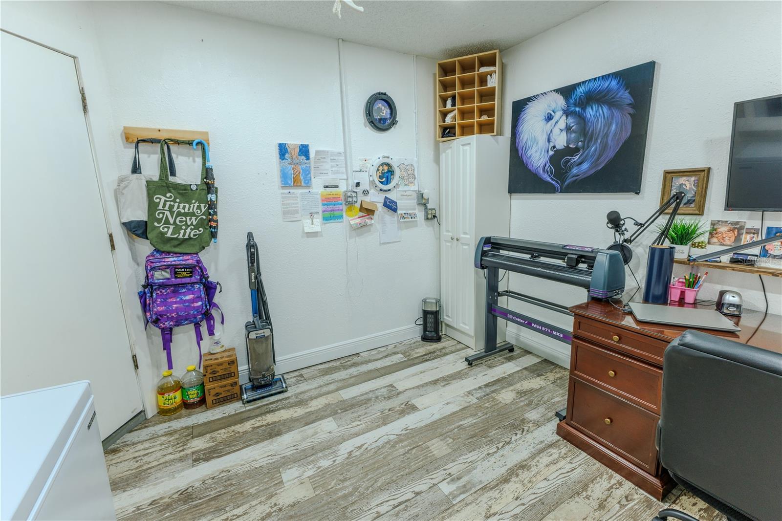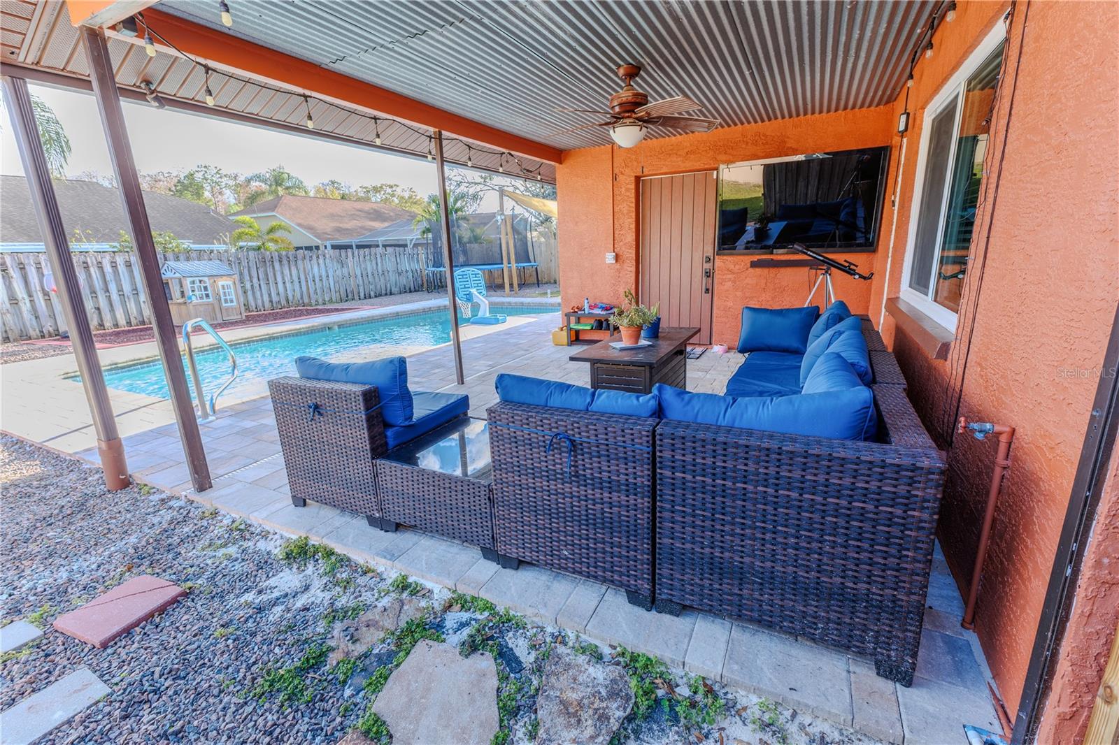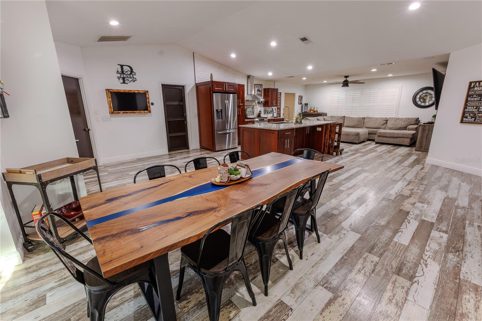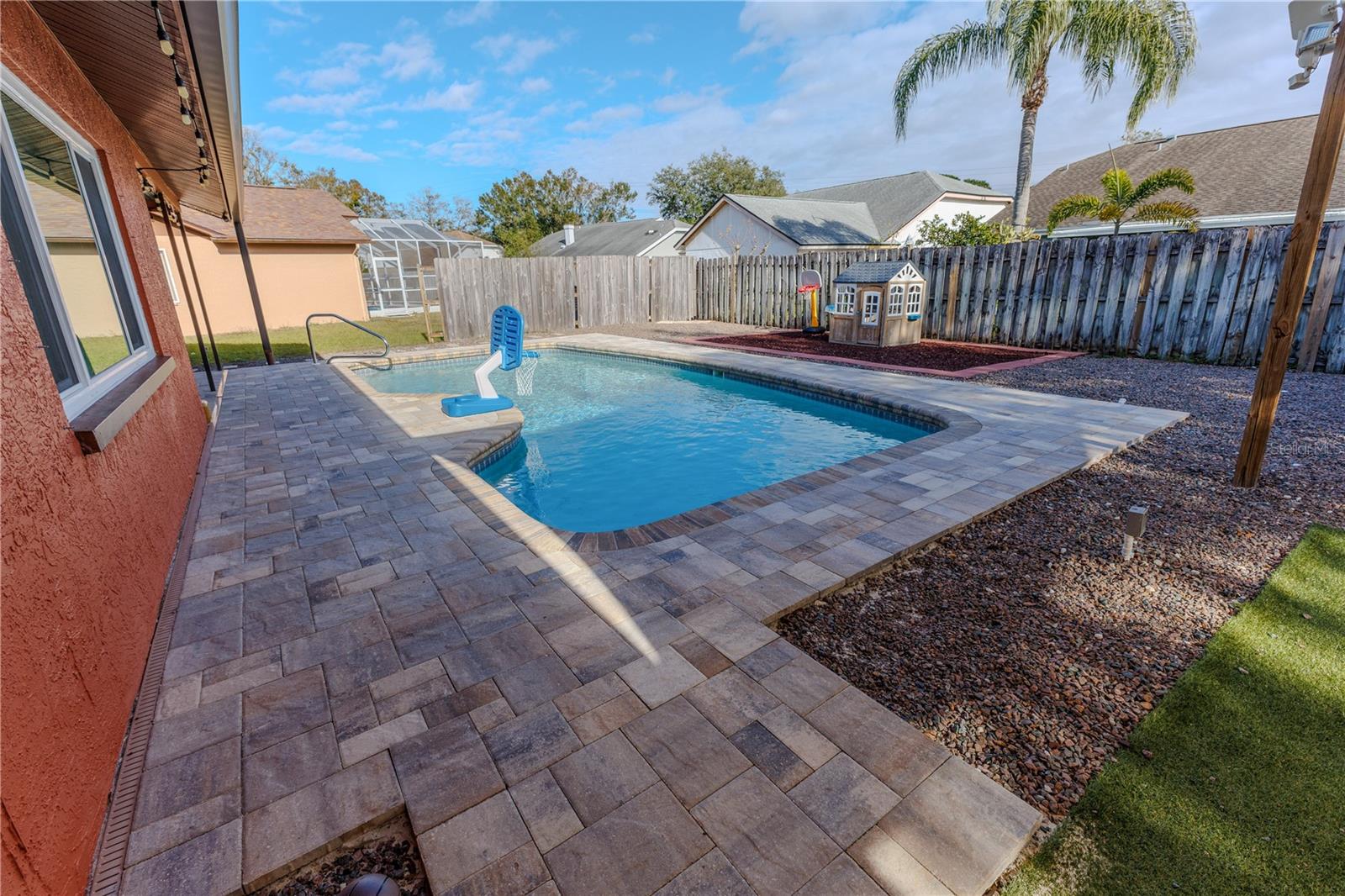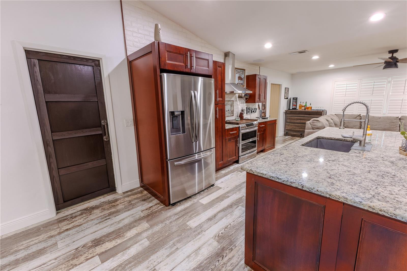 Discover the highly sought-after Mill Run Community! Zoned for Deer Park Elementary & River Ridge Middle and High Schools! This is an adorable, like new, and move-in ready home with 3 bedrooms (split bedroom plan), 2 baths, 1,677 square feet, with two-car garage which has been partially converted into heated and cooled office space. New Roof and rain gutters 2021! Full solar panel system 2021! New windows and doors 2020. Flexible fabric hurricane screens for the windows! Smart home features include: My-Q Quiet Wi-Fi Smart Garage Door Opener, hardwired 8-camera security system for enhanced safety, fingerprint front door lock for keyless convenience, Nest thermostat for efficient temperature control, smart wi-fi oven/range, and Ring doorbell system, and in-ceiling surround sound system with pre-wiring. The home is nestled on a quiet cul-de-sac with a great community feel. Out front you will find a large front parking area and plenty of curb appeal. Inside the home you will find a well-lit and spacious wide-open floorplan! Much of the home has vaulted ceilings. The majority of the home has luxury plank vinyl and the remaining areas have tile. The kitchen is central to the main living area, has been updated, and includes a huge breakfast bar island, stainless range with double convection ovens, dishwasher, microwave, and French door refrigerator, wood cabinets, granite counters, stainless undermount sink, cup washer at the sink, can lighting and more! The home has many LED can lights which also have a rare nightlight feature. Features like oversized barn doors and plantation shutters add to the designer feel of the home! The master bedroom is large and has a large walk-in closet with built in shelving! The master bath has been luxuriously upgraded with a walk-in shower and lighted and heated vanity mirror. The guest bath has a tub/shower combo. The pool is the perfect place to relax and enjoy the sun while cooling off! The pool has a pavered pool deck, saltwater chlorinator, and a variable speed pool pump. There is a large under roof area for outdoor dining, watching your favorite shows while swimming, entertaining, lounging around the pool, and more! The back yard has xeriscape landscaping and rubber mulch play area. The garage has been partially converted to accommodate interior office space but could potentially still fit one car or remove the office if you prefer a two car garage. The garage has a full front screen door enclosure system and a side utility door. The attic above the garage has been professionally converted into a storage attic. No CDD fees and low HOA/fees! Whether you're sitting on the patio, swimming in the pool, enjoying the warmth of your residence, or enjoying a cookout with guests, this is a fantastic place to call home! This captivating home is a rare gem that promises comfort, elegance, and a touch of luxury. Great location near shopping, world famous beaches, airport, dining, medical facilities, world class golfing, world-class entertainment, Tampa International Airport, colleges/universities & more! All measurements approx. Schedule your appointment today.