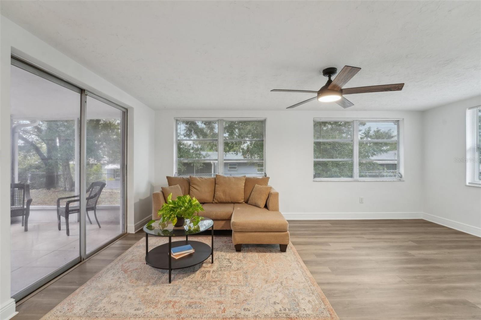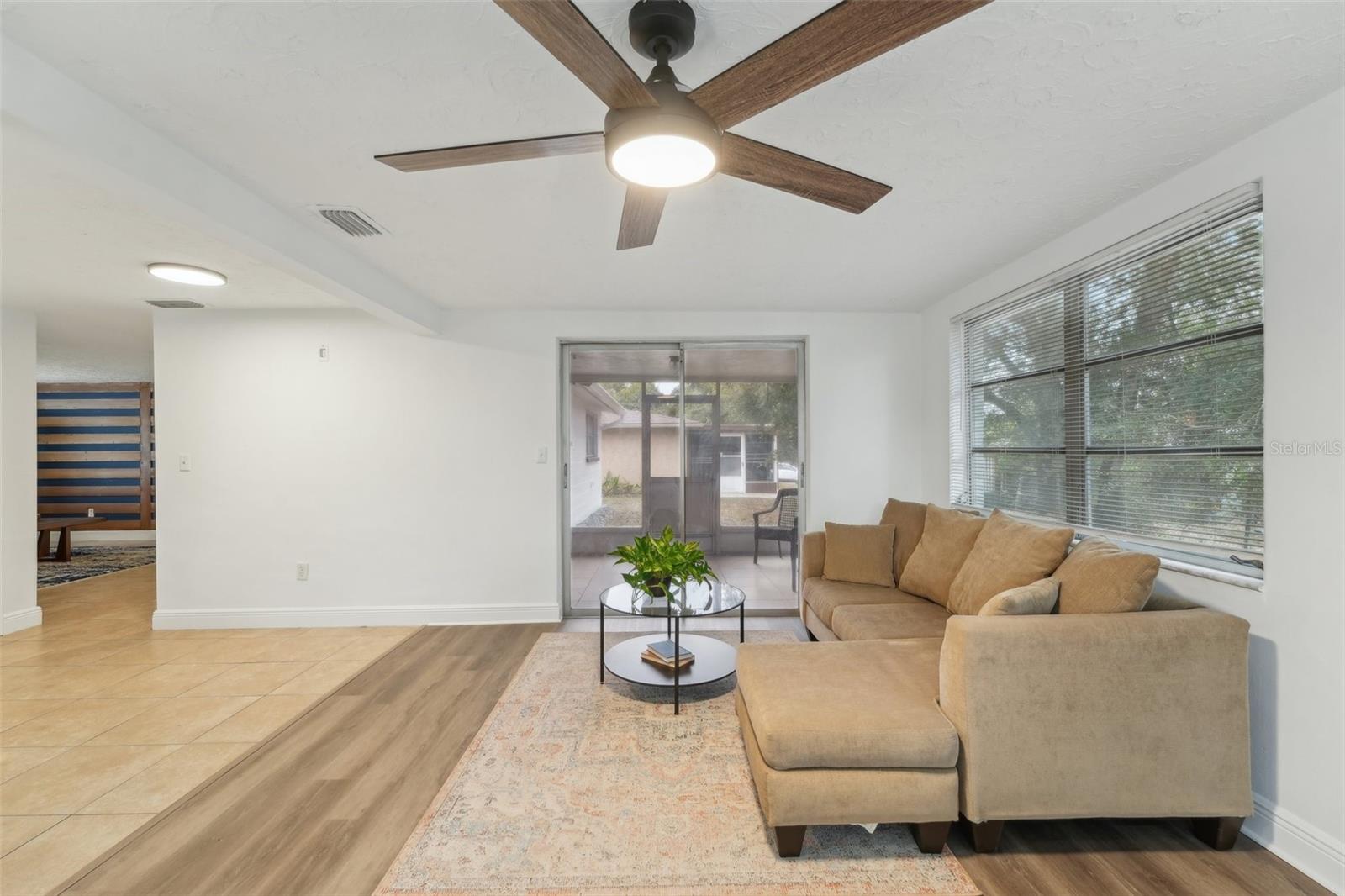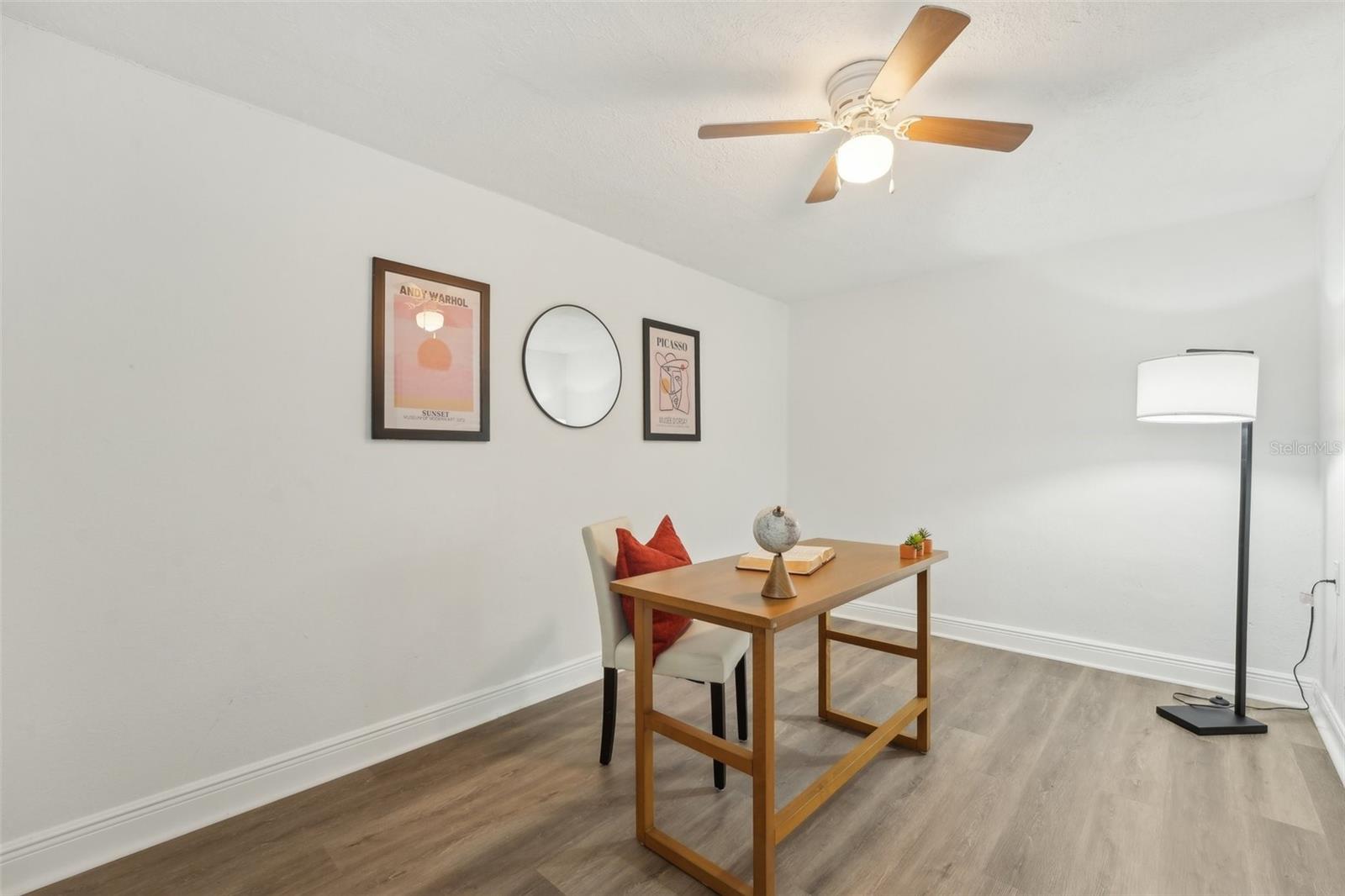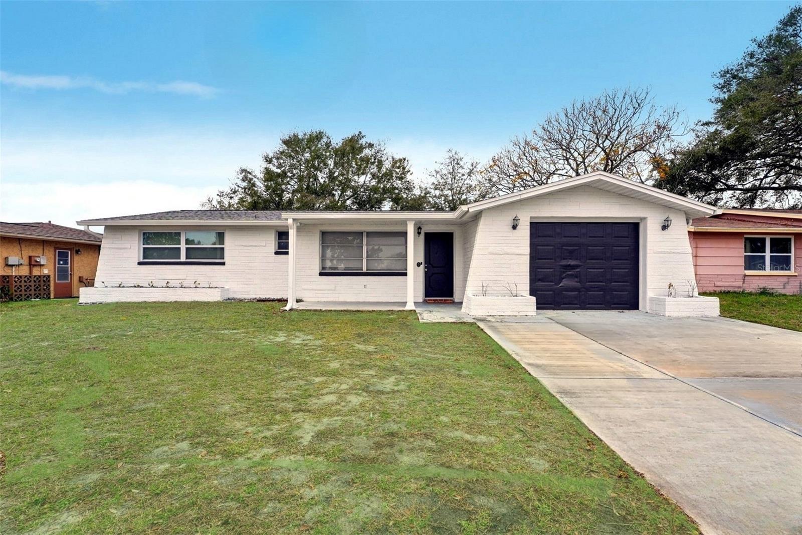 Seller will offer $5k buyer credit to use towards closing costs and/or buying down the rate. This beautifully updated home combines modern comforts with timeless charm, making it the perfect retreat for a small family or anyone seeking a low-maintenance lifestyle. Ideally located near shopping, dining, and major travel routes, this property offers unparalleled convenience and appeal. Step inside to discover elegant ceramic tile flooring in the living room and kitchen area and brand new laminate flooring in the bedrooms. The heart of the home is the upgraded kitchen, featuring sleek stainless steel appliances, stunning Quartz countertops, and ample space for meal prep and entertaining. Both bathrooms have been fully renovated, showcasing modern finishes and thoughtful design. Recent upgrades include a newer roof, fresh interior and exterior paint jobs, and energy-efficient LED lighting throughout. The garage has been expertly converted into a spacious office/laundry room, now equipped with a new split-unit air conditioner and newly replaced windows, making it an ideal space for remote work or hobbies. Five additional updated windows enhance the home’s natural light and energy efficiency. The lanai, complete with a nearly new grill, is perfect for hosting outdoor gatherings or enjoying quiet evenings. This home is truly move-in ready, with every detail thoughtfully addressed to provide a cozy and modern living experience. Don’t miss the chance to own this gem! Schedule your showing today and make it yours before it’s gone!