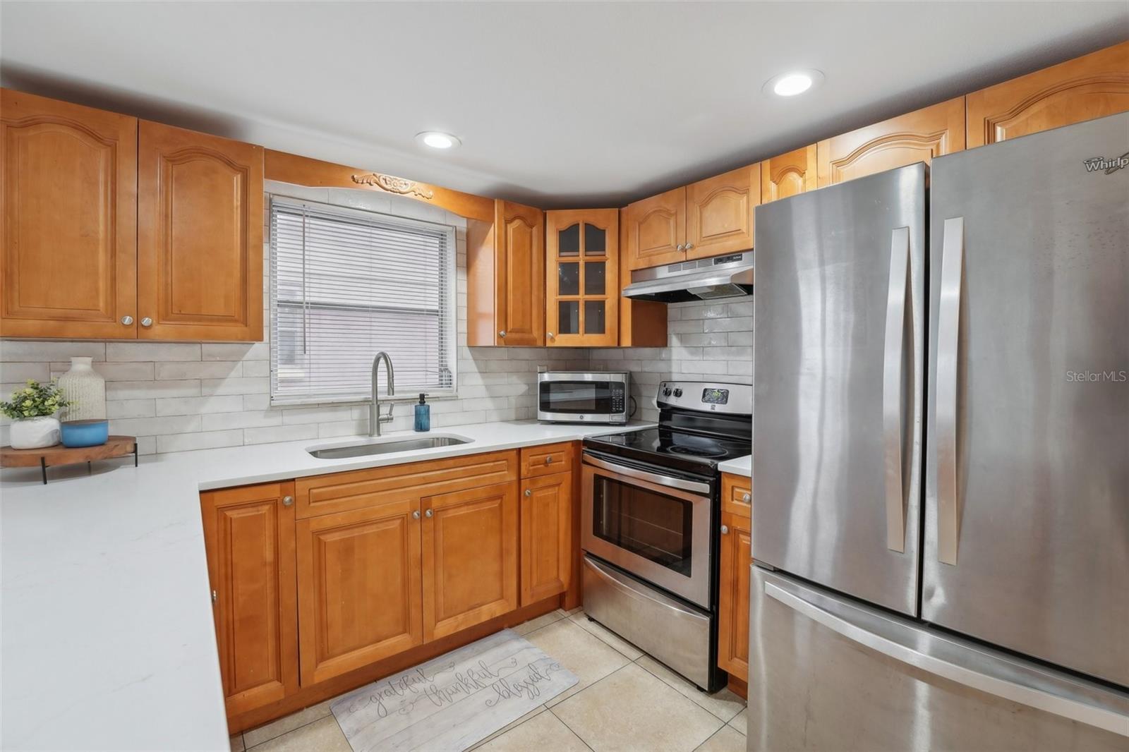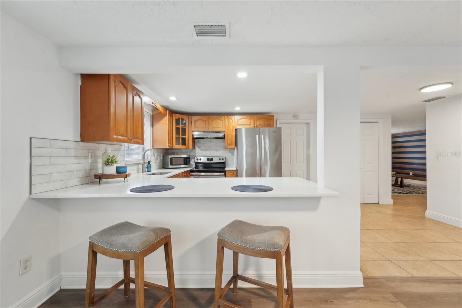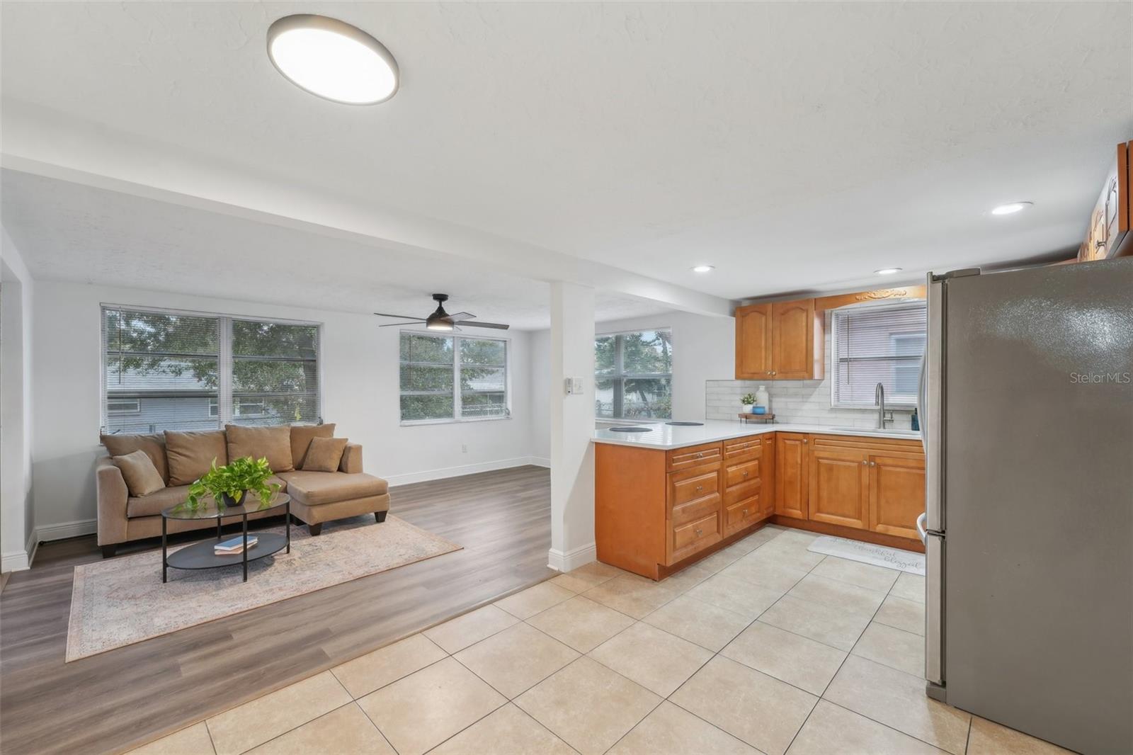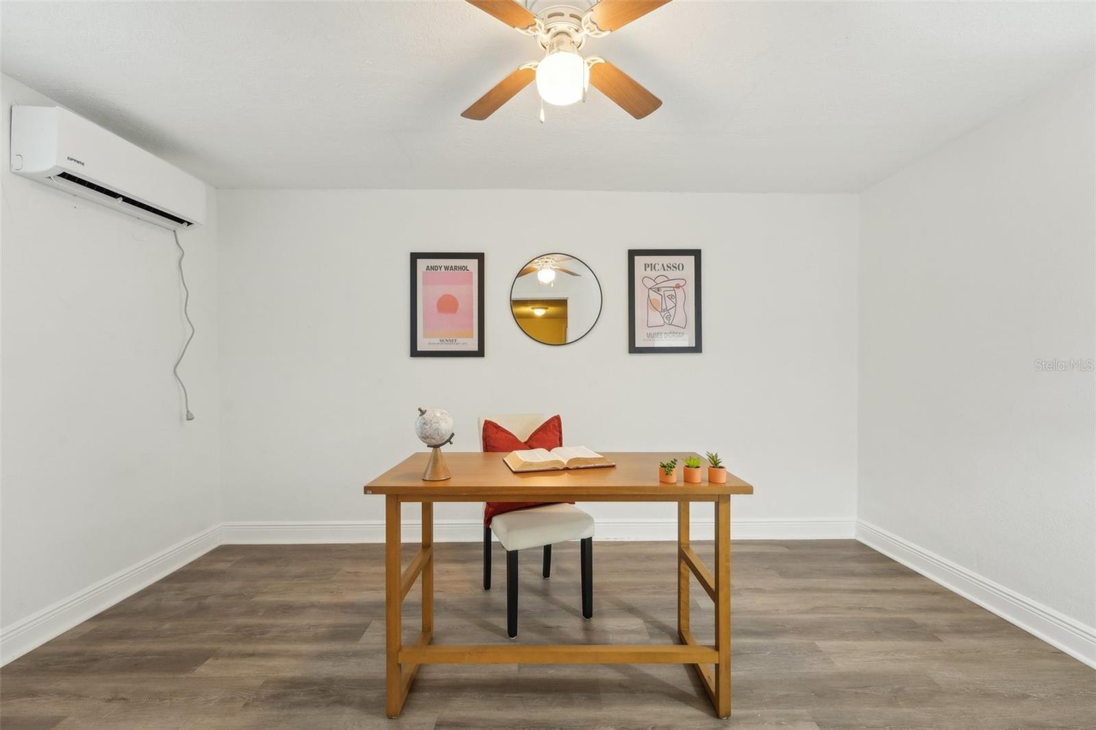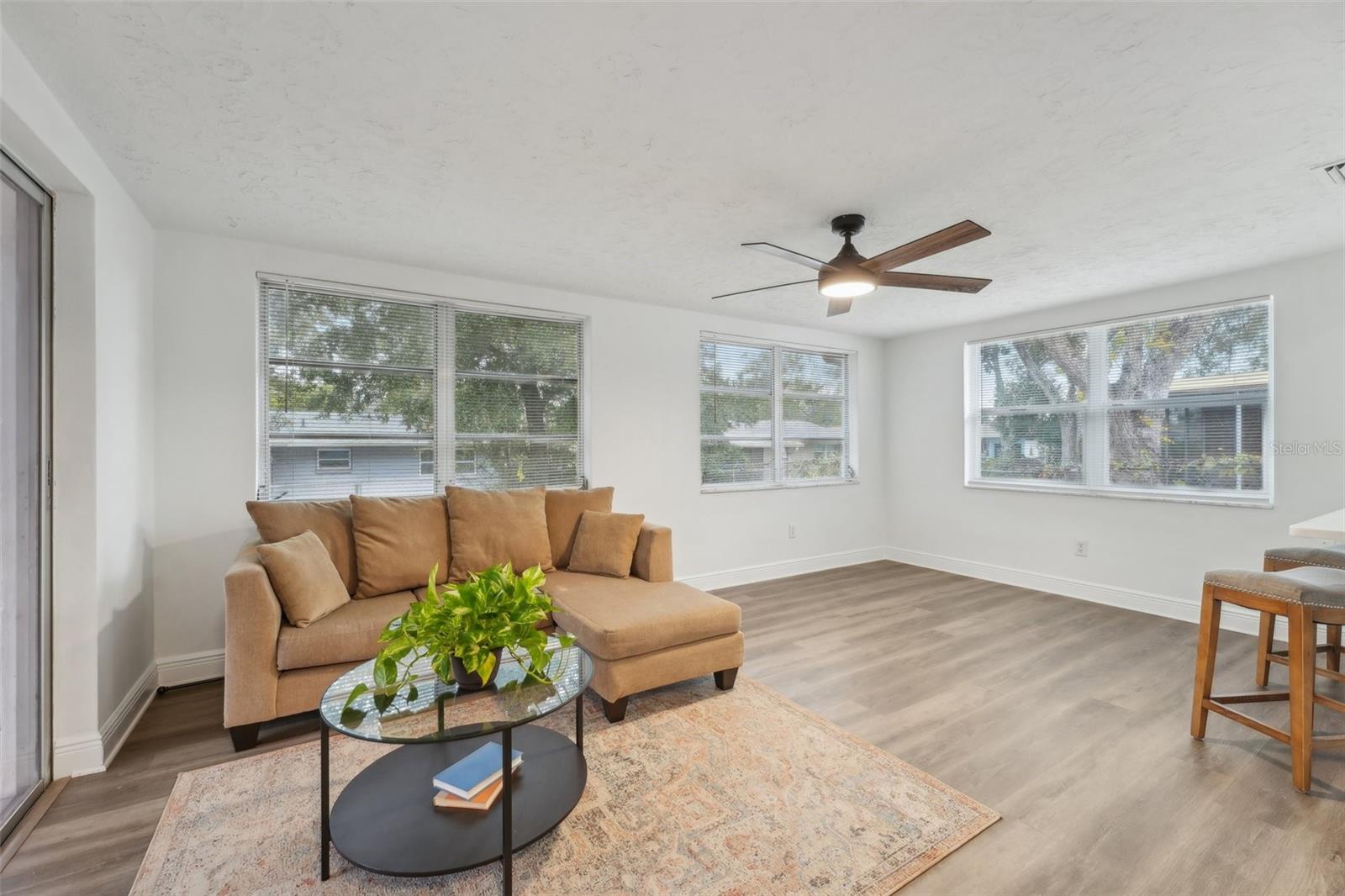 Seller will offer $5k buyer credit to use towards closing costs and/or buying down the rate. This beautifully updated home combines modern comforts with timeless charm, making it the perfect retreat for a small family or anyone seeking a low-maintenance lifestyle. Ideally located near shopping, dining, and major travel routes, this property offers unparalleled convenience and appeal. Step inside to discover elegant ceramic tile flooring in the living room and kitchen area and brand new laminate flooring in the bedrooms. The heart of the home is the upgraded kitchen, featuring sleek stainless steel appliances, stunning Quartz countertops, and ample space for meal prep and entertaining. Both bathrooms have been fully renovated, showcasing modern finishes and thoughtful design. Recent upgrades include a newer roof, fresh interior and exterior paint jobs, and energy-efficient LED lighting throughout. The garage has been expertly converted into a spacious office/laundry room, now equipped with a new split-unit air conditioner and newly replaced windows, making it an ideal space for remote work or hobbies. Five additional updated windows enhance the home’s natural light and energy efficiency. The lanai, complete with a nearly new grill, is perfect for hosting outdoor gatherings or enjoying quiet evenings. This home is truly move-in ready, with every detail thoughtfully addressed to provide a cozy and modern living experience. Don’t miss the chance to own this gem! Schedule your showing today and make it yours before it’s gone!