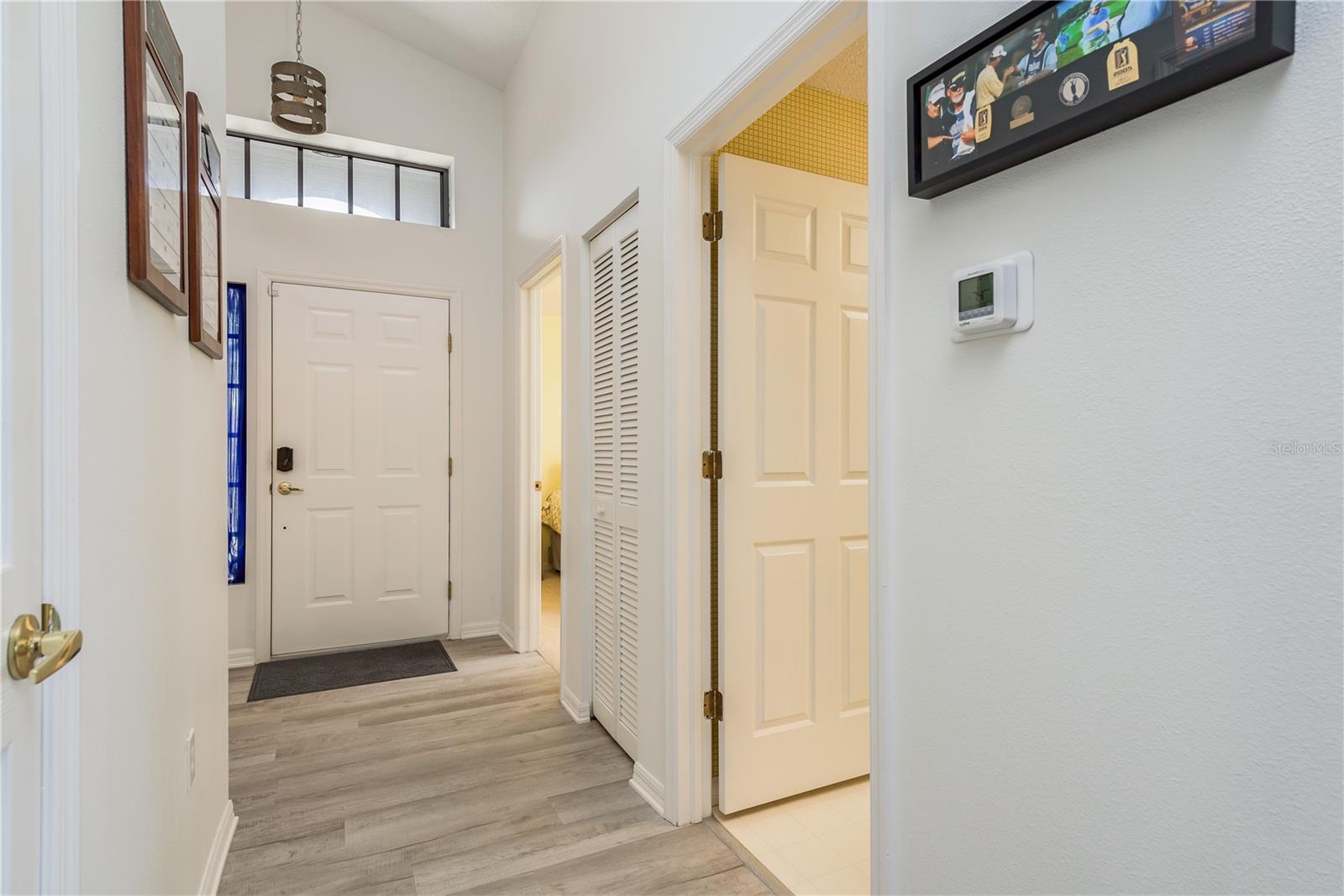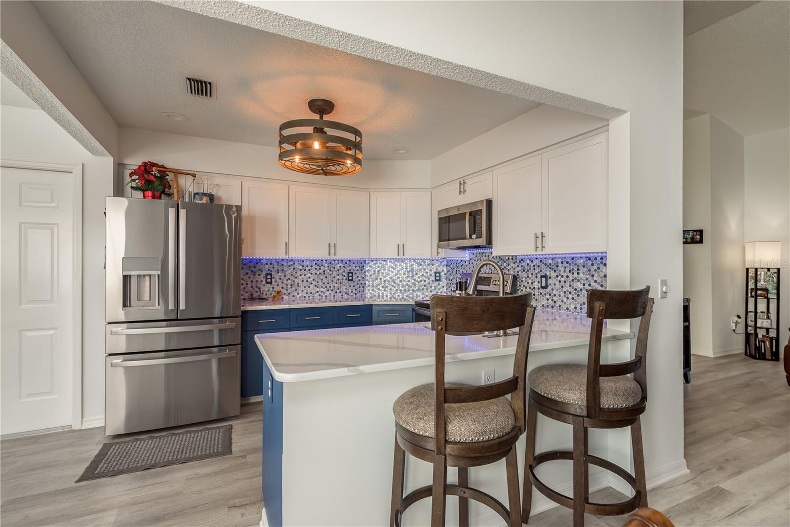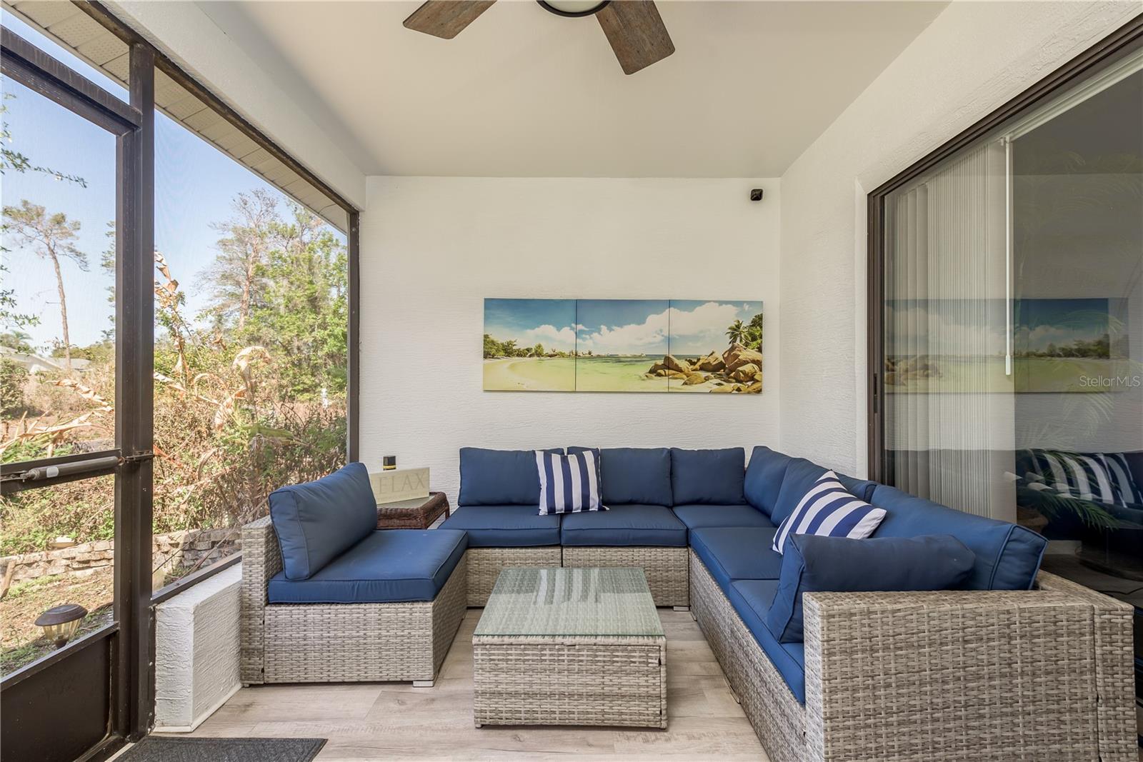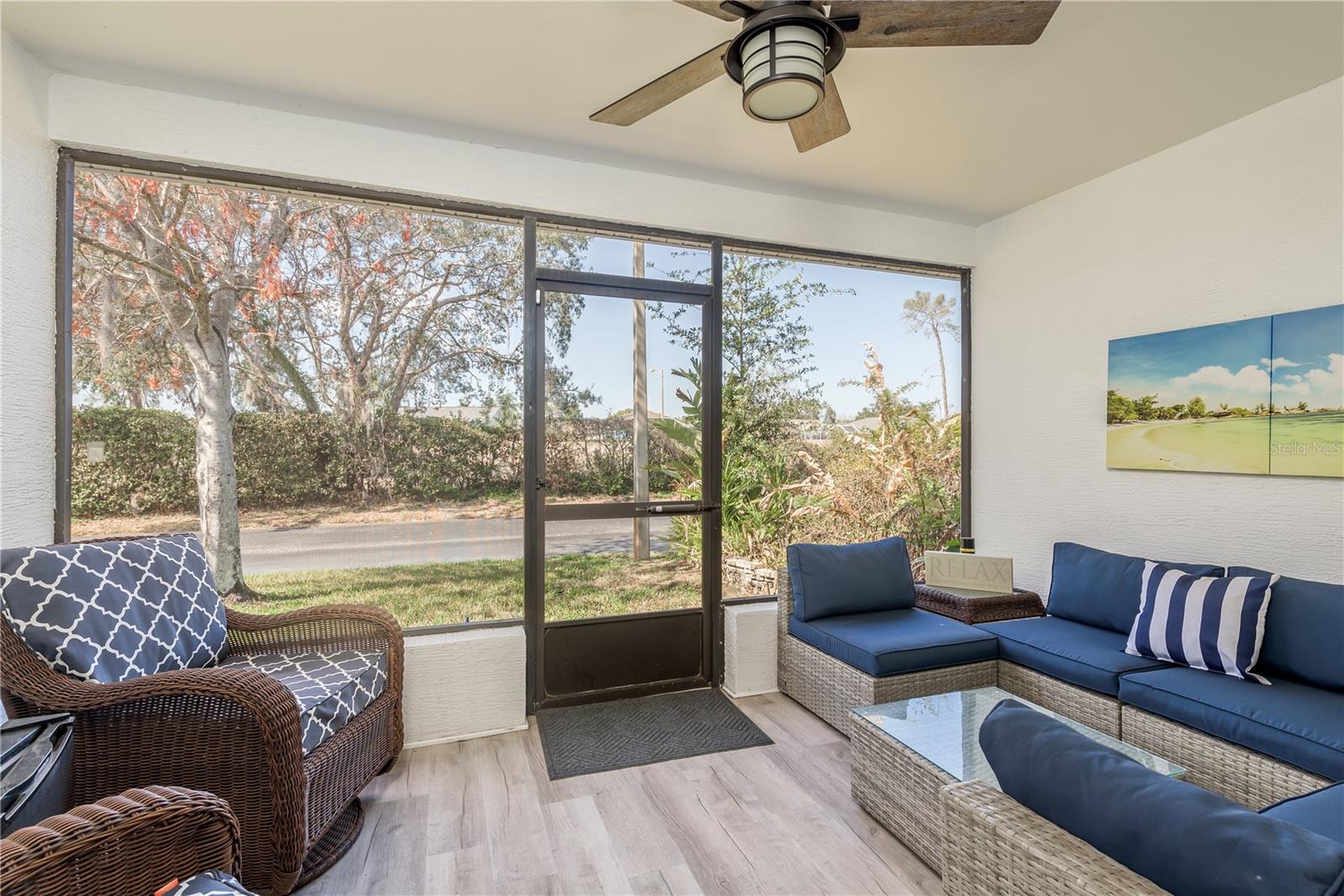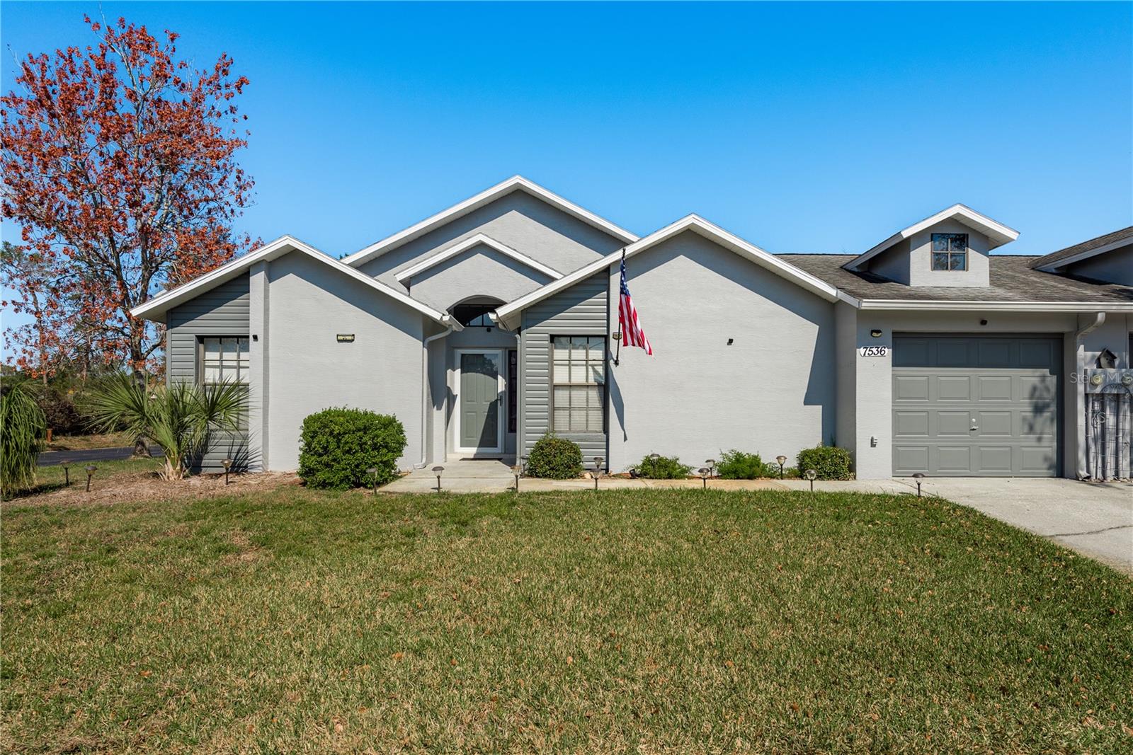 This updated 2-bedroom, 2-bath end-unit villa with a 1-car garage offers a comfortable layout and numerous recent improvements. Move-in ready and designed for easy living, this home combines thoughtful updates with a functional floor plan. Inside, vinyl plank flooring runs throughout the main living areas, including the foyer, living room, kitchen, and screened porch, all complemented by a freshly painted interior. Vaulted ceilings enhance the open feel, while two outdoor spaces—a screened porch and an additional open patio—provide flexible options for relaxing or entertaining. The kitchen has been fully updated with white shaker cabinetry, quartz countertops, a tiled backsplash, under-cabinet lighting, stainless steel appliances, including a double oven, a walk-in pantry, and a dedicated dining area. A spacious laundry closet is conveniently located nearby. The primary suite features a walk-in closet, updated en-suite bathroom, and upgraded carpeting. The secondary bedroom offers ample closet space and is situated near the second updated full bathroom. Additional highlights include a garage with epoxy flooring, an automatic opener, and space for an additional refrigerator. Recent updates also include lighting, ceiling fans, an updated A/C system, and added security features such as cameras, motion lighting, and window and door alarms. The community offers maintained grounds and exterior services with a low monthly HOA fee. Conveniently located near shopping, dining, medical facilities, golf, airports, and Gulf beaches, this property provides both comfort and accessibility. An added benefit is the opportunity to assume the seller’s existing mortgage with a low interest rate, offering potential savings for qualified buyers.