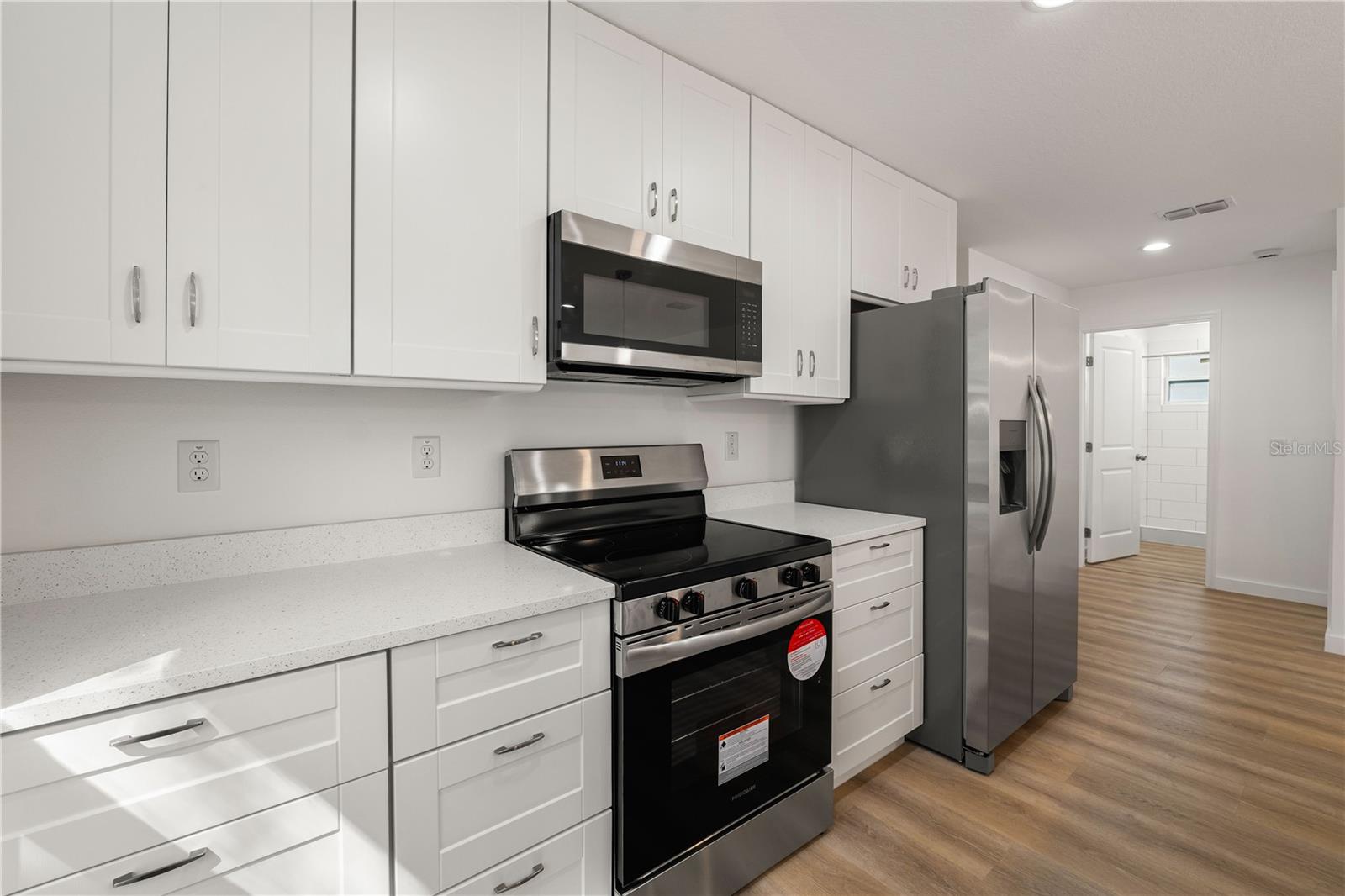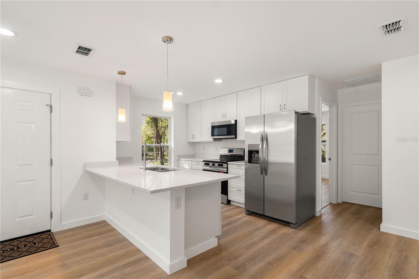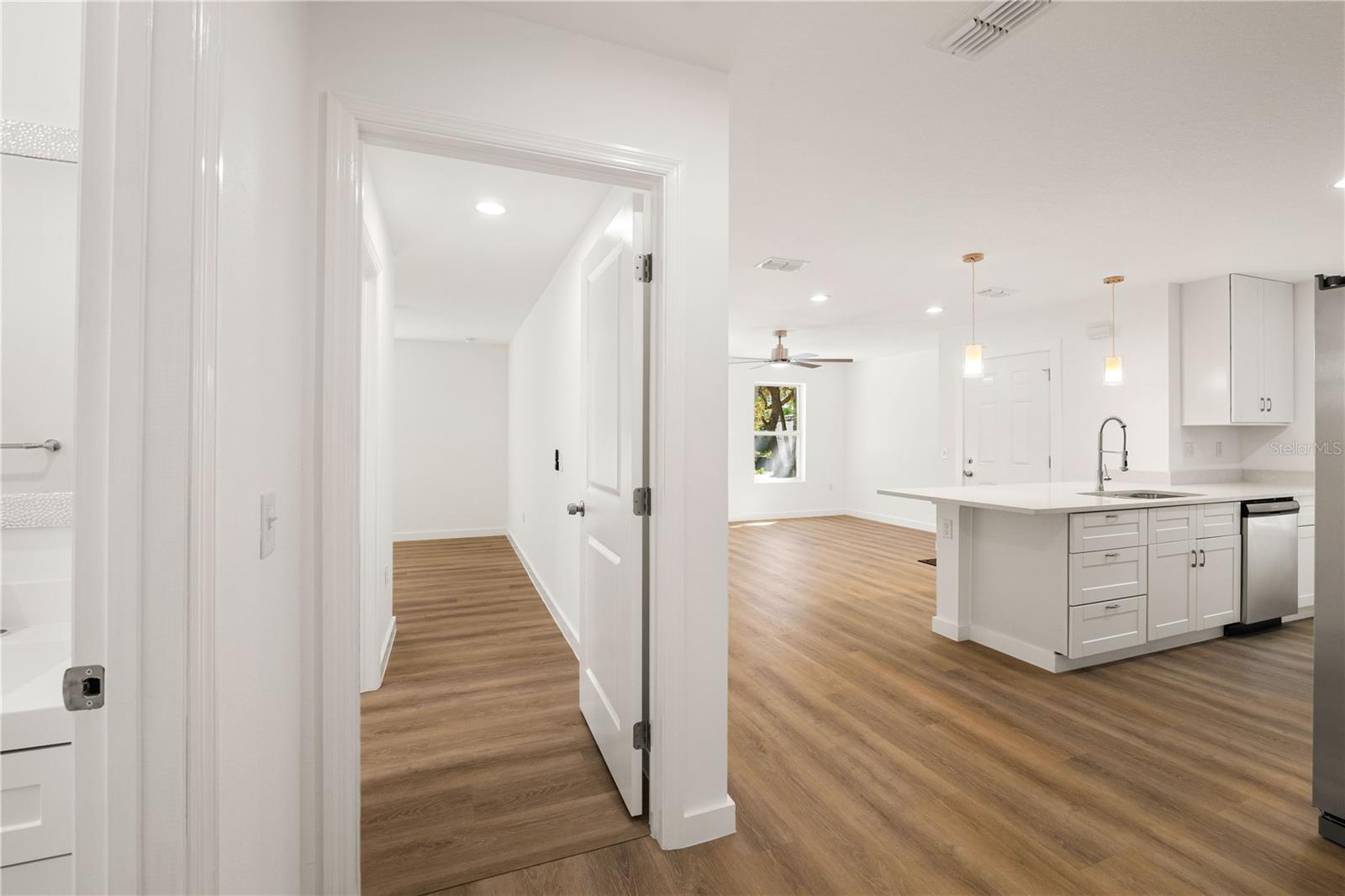 One or more photo(s) has been virtually staged. QUALIFIES FOR A SPECIAL FINANCING PROGRAM WITH UP TO 100% FINANCING, NO MORTGAGE INSURANCE, AND BELOW-MARKET INTEREST RATES. Affordable new construction home on a DOUBLE LOT. 0.36 acres offers endless possibilities for storage, parking, or building your ideal yard project. Fully completed and available now! Investors: potential rental income for this home is approximately $2,150/month. Buyers: Limited opportunity to keep costs down, making your mortgage cheaper than renting long term. As with all new construction homes, the home insurance premium is usually much lower than older homes. With a brand-new private well system, you'll also have no water/sewer bills, and being out of a high-risk flood zone, flood insurance is NOT required. No HOA here either, allowing you to maximize your property at your leisure. This builder prioritizes energy efficiency by using superior insulation, low-E windows, recessed LED lighting and ceiling fans which enhance comfort. Two exterior 110-V soffit outlets for easy installation of security cameras. The home offers 3 bedrooms, 2 bathrooms, and a thoughtfully designed open layout. Enjoy peace of mind with impact-resistant windows and exterior doors rated for hurricane-force winds, and 160-mph shingles, while the luxury vinyl plank flooring, premium quartz countertops, and contemporary bathroom tile add a touch of elegance. The kitchen is equipped with new stainless steel appliances, shaker cabinets with soft-close hinges, and undermount sink for easy clean up. The private laundry room includes a new stackable washer and dryer combo, plus a cabinet for storage and added convenience. Plus, a builder’s warranty is included which provides peace of mind, making this home the perfect blend of style, durability, and savings! Minutes from the home is beautiful Moon Lake Park where families can enjoy access to the lake with a boat ramp for boating, kayaking or canoeing. There are also picnic tables, BBQ grills, basketball hoop, playgrounds, and bathrooms available.