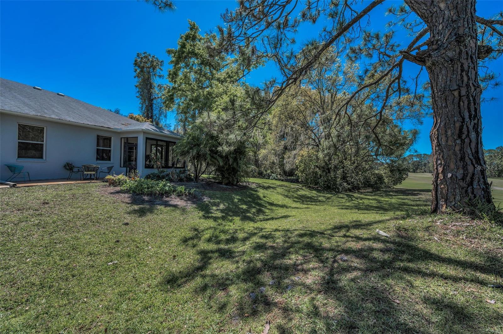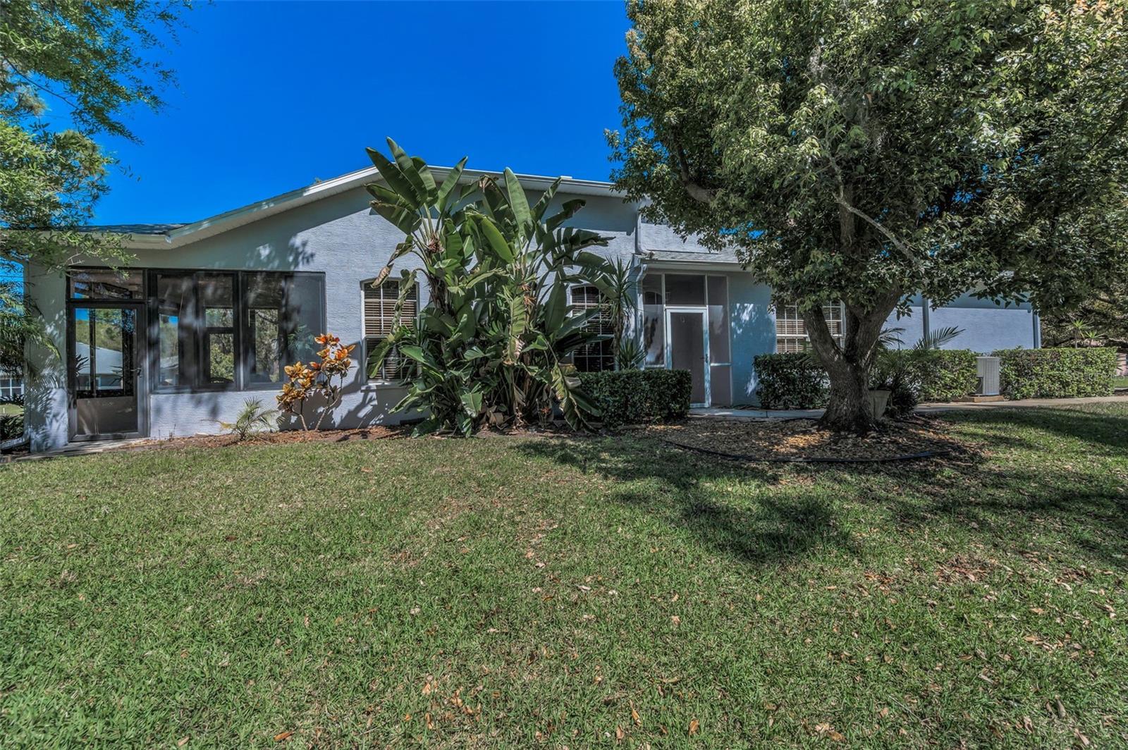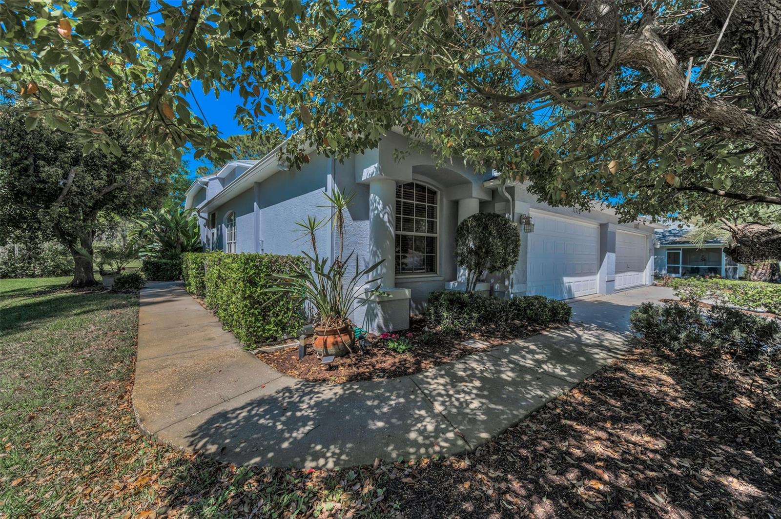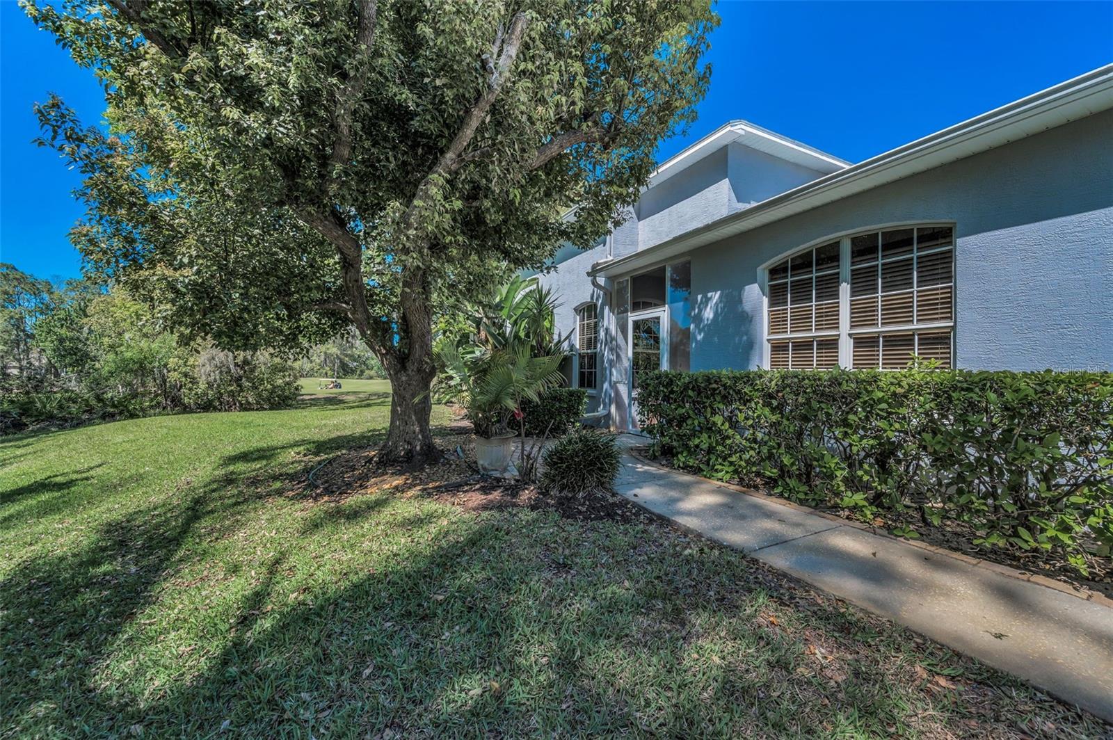 A sun-dappled yard welcomes you to this lovely villa in Summertree, a gated, 55+ subdivision in New Port Richey. Overlooking the golf course with no neighbors to the left, this 2-bedroom, 2 full bath home shines with pride of ownership. A NEWER roof was installed in 2019. Beyond the stately entrance topped with a transom window, sunlight illuminates a beautiful living room complete with vaulted ceilings and views straight out to the four-season lanai. To the right of the entry foyer, a unique cutout reveals the formal dining room, framed by a picture window. The adjacent eat-in kitchen is wide open and luminous, dressed in stunning white cabinetry and countertops. Recessed lighting and the breakfast bar add to the contemporary vibe. Two sets of doors - one leading to the well-appointed laundry room, and the other to a handy pantry closet - complete the picture. The spacious master suite boasts twin windows and sliders for private access to the lanai. Complete with a ceiling fan and large walk-in closet, the companion en suite bath offers ample storage, dual sinks, a shower room, and a deep soaking tub. As for the second bedroom, it is large enough to function for an array of purposes: as a guest room, home office, playroom, personal gym space, or a den. Sliders from both the master suite and the living room introduce this amazing space featuring tiled flooring, with windows showcasing the backyard. You’ll enjoy hours of relaxation in this versatile room. The patio is its wonderful extension, providing a platform for your BBQ and your sun lounging. With a NEWLY renovated clubhouse and a community pool, you’ve got your pick of a plethora of activities including tennis, pickleball, shuffleboard, bocce ball, horseshoes, sauna, hot tub, billiards, cards, fitness center, crafts, library, and a computer room. The reasonable HOA fees cover cable, internet, trash, exterior ground/building, and recreational amenities. This might just be the very home you’re seeking!