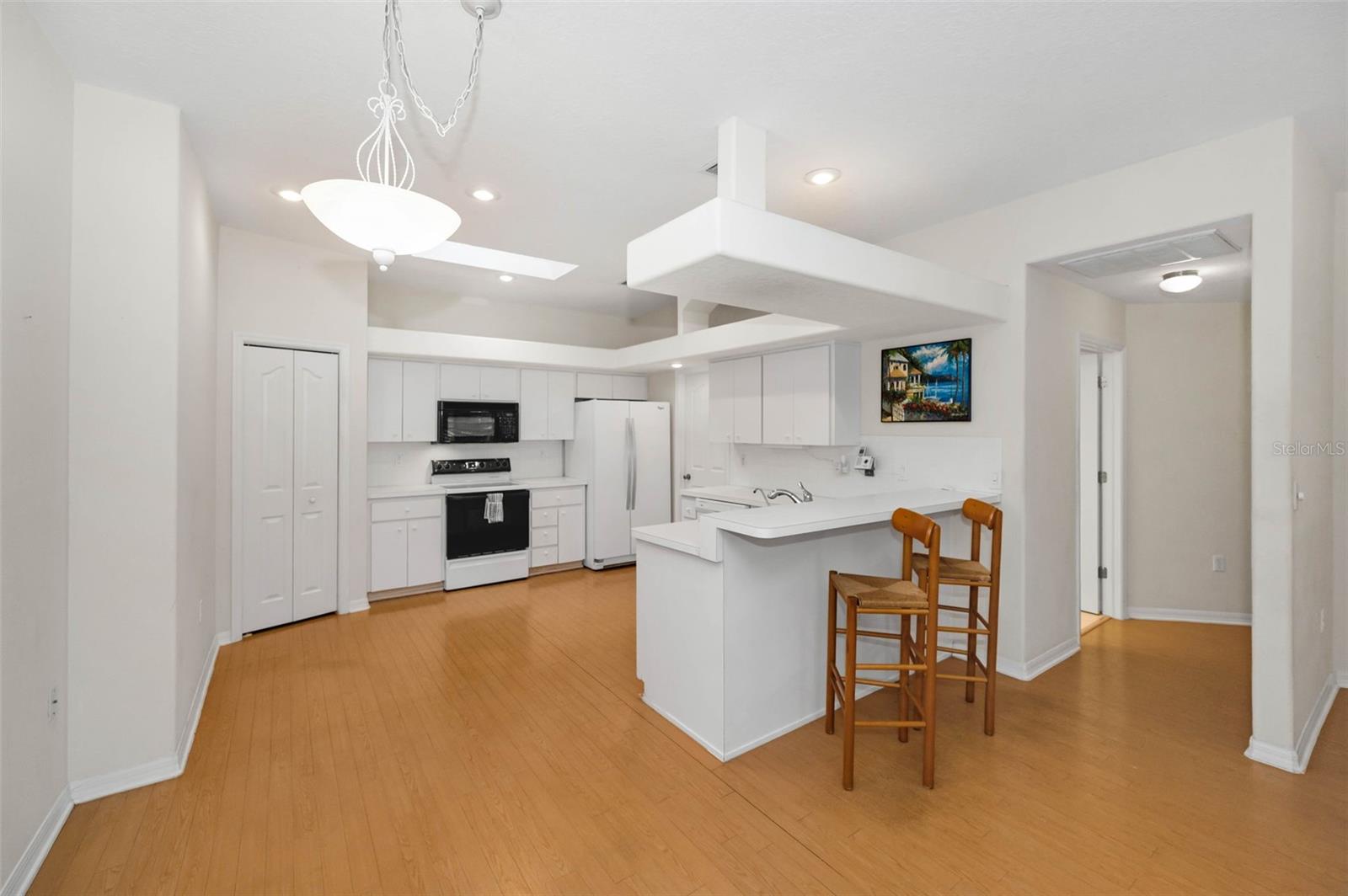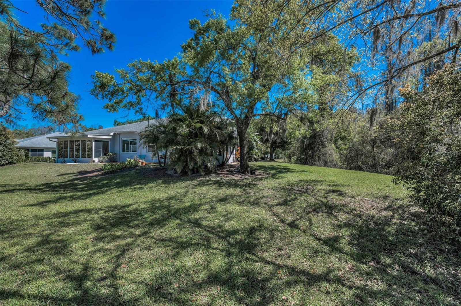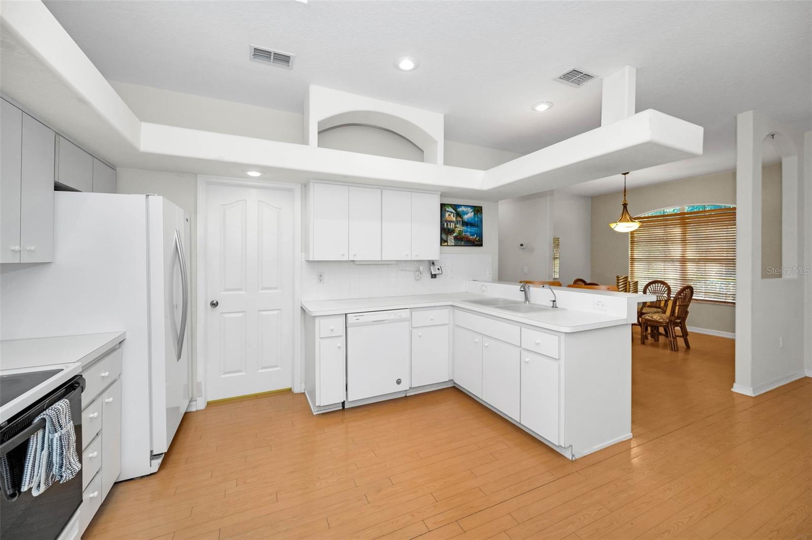 A sun-dappled yard welcomes you to this lovely villa in Summertree, a gated, 55+ subdivision in New Port Richey. Overlooking the golf course with no neighbors to the left, this 2-bedroom, 2 full bath home shines with pride of ownership. A NEWER roof was installed in 2019. Beyond the stately entrance topped with a transom window, sunlight illuminates a beautiful living room complete with vaulted ceilings and views straight out to the four-season lanai. To the right of the entry foyer, a unique cutout reveals the formal dining room, framed by a picture window. The adjacent eat-in kitchen is wide open and luminous, dressed in stunning white cabinetry and countertops. Recessed lighting and the breakfast bar add to the contemporary vibe. Two sets of doors - one leading to the well-appointed laundry room, and the other to a handy pantry closet - complete the picture. The spacious master suite boasts twin windows and sliders for private access to the lanai. Complete with a ceiling fan and large walk-in closet, the companion en suite bath offers ample storage, dual sinks, a shower room, and a deep soaking tub. As for the second bedroom, it is large enough to function for an array of purposes: as a guest room, home office, playroom, personal gym space, or a den. Sliders from both the master suite and the living room introduce this amazing space featuring tiled flooring, with windows showcasing the backyard. You’ll enjoy hours of relaxation in this versatile room. The patio is its wonderful extension, providing a platform for your BBQ and your sun lounging. With a NEWLY renovated clubhouse and a community pool, you’ve got your pick of a plethora of activities including tennis, pickleball, shuffleboard, bocce ball, horseshoes, sauna, hot tub, billiards, cards, fitness center, crafts, library, and a computer room. The reasonable HOA fees cover cable, internet, trash, exterior ground/building, and recreational amenities. This might just be the very home you’re seeking!