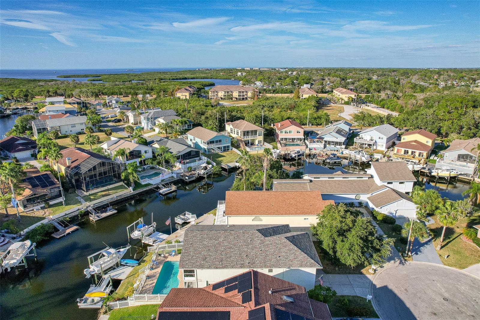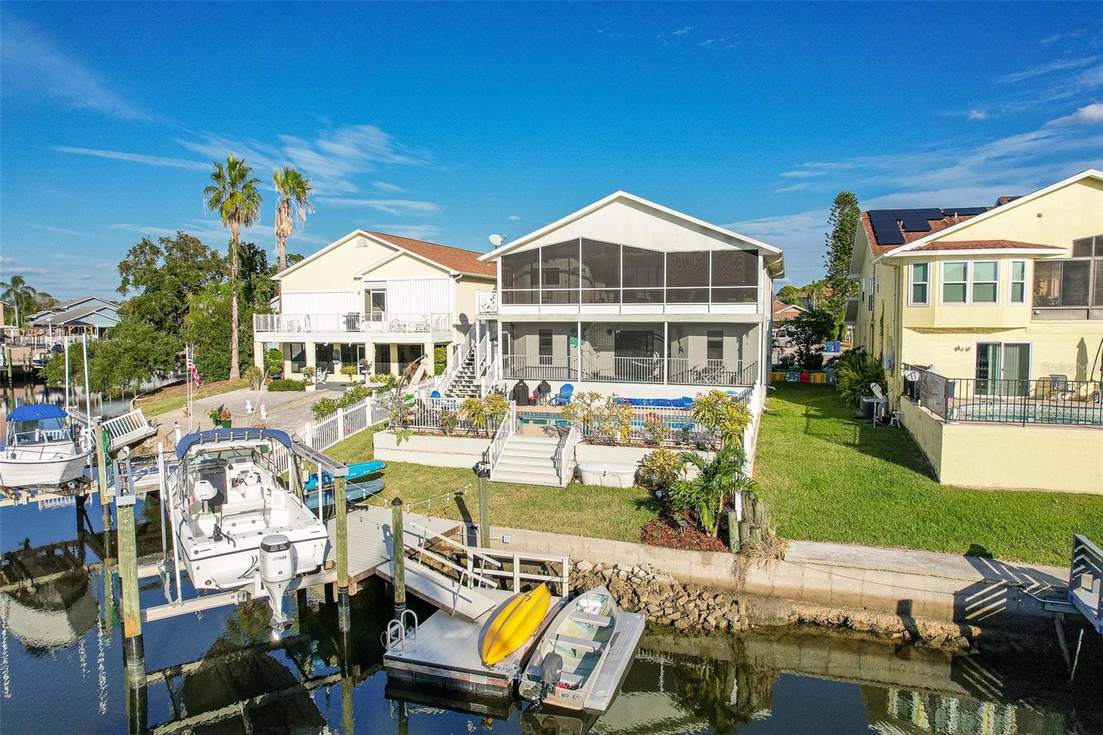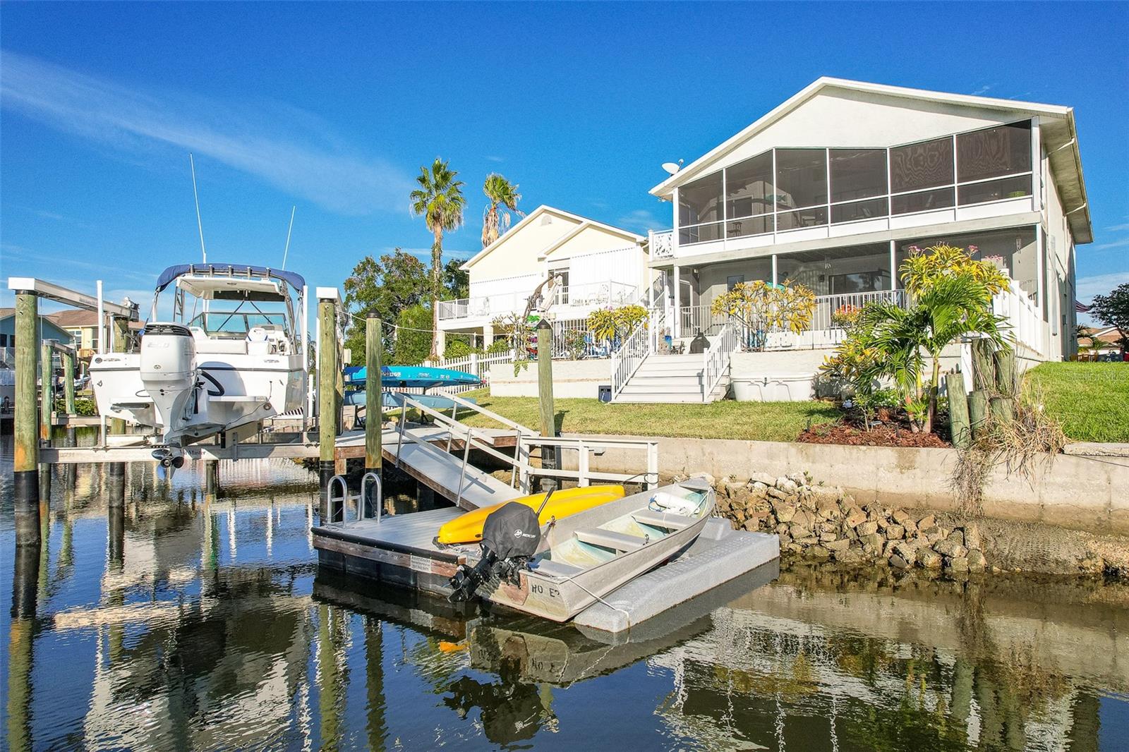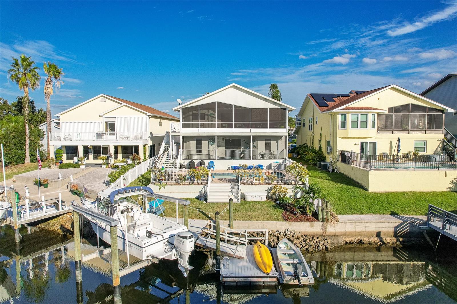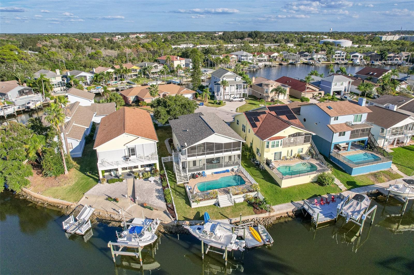NO FLOOD DAMAGE FROM MILTON OR HELENE. Catch fresh fish right off your dock for the perfect Taco Tuesday fish tacos every week, all while basking in sunsets every evening. You won't want to miss the opportunity to own a slice of the Florida dream. Make your dreams a reality with this Gulf Harbors waterfront home that has been renovated with a lot of love and thoughtfulness. The main, upper floor boasts an open floor plan with soaring ceilings and stunning canal views. The floor plan is open which makes it perfect for entertaining and enjoying company while cooking, relaxing in the living room or enjoying a meal. The kitchen features granite countertops, stainless appliances, alabaster 42" cabinets and a breakfast bar. The main upper floor has new luxury vinyl flooring, recent paint, all new fixtures, plenty of natural light that comes through all of the windows. The primary suite is separate from the two other bedrooms with a slider that opens to the back screened in balcony. His and her closets have been updated with custom closet organizers, the en suite bathroom has also been updated with a double vanity and a tub/shower combo. The secondary bedrooms boast plenty of space and feature sliding doors to the front shared screened in balcony. The main floor secondary bathroom has also been remodeled to include an accessible shower. The bottom floor has had a complete overhaul and is perfect for a multigenerational family, or even frequent guests making it the perfect in-law suite, including 2 bedrooms a bathroom, living room, dinette space, the main laundry and a kitchenette. The bottom floor has luxury vinyl throughout and has been completely remodeled in the last couple of years. The main floor A/C was replaced in 2021 and the bottom floor two mini-splits were installed 2021. Roll down blinds throughout the entire home, all slider blinds are remote operated. The oversized 2 car garage has plenty of space for your vehicles and a ton of storage for all of your toys and recreational gear. All new railing in the front and back of the home. The front and back balconies have all new screens. The back stairs are new with Treks. The dock was installed by Ameridocks and has a 10,000 lb. boat lift with electric and water. There is also a floating docks and kayak storage. The dock was completed in 2020 and Trek was also installed. When you aren't fishing or enjoying the ocean, you can take a dip in your salt water pool and sun yourself on the paver deck. Rinse off in the outdoor shower before coming back in the house to make your fish tacos. The windows all have film that is hurricane rated from 120-135 mph. Every details has been thought of with this home. If the details and updates aren't enough, you have access to a private beach at Gulf Harbors Beach Club. It doesn't get any better than this. Close to shopping, schools, medical and more. Schedule your private showing today.