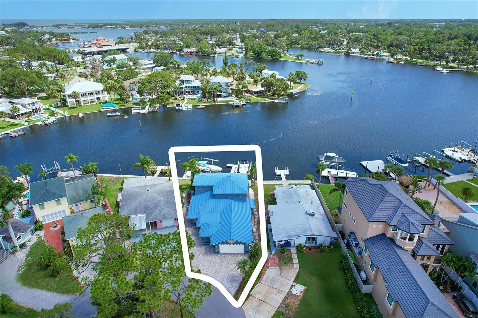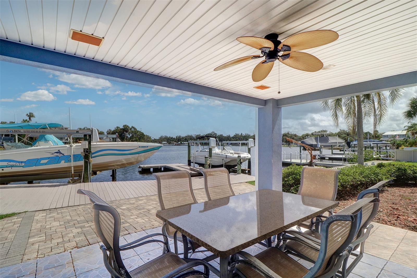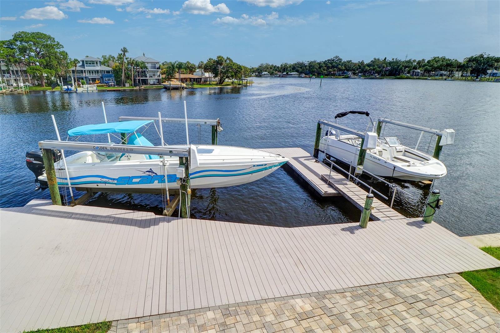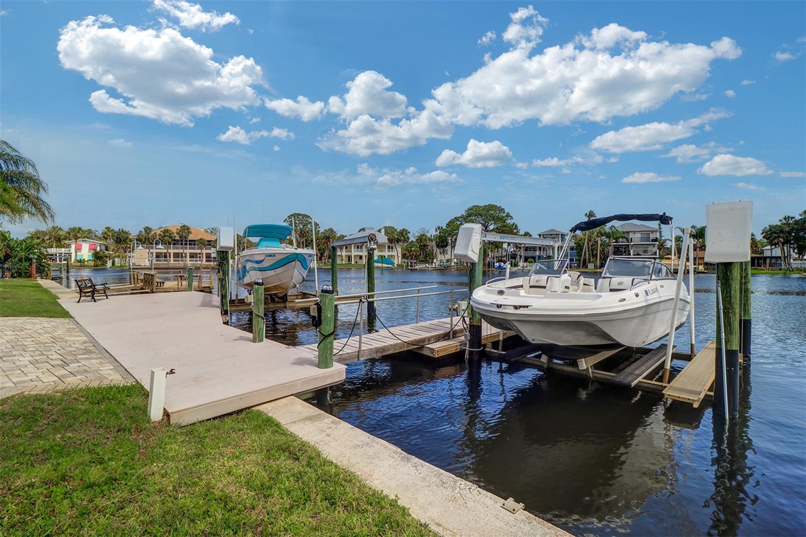Discover this stunningly renovated Cotee Riverfront residence with 65 feet of composite board dock, a floating dock, two boat lifts, (24,000/8,000 PDS) and a paver lounge area, this home offers unparalleled access to the ever-active Cotee River. A spacious 20x30 oversized garage with extra Storage accommodates all your toys, complemented by an additional paved parking area and a 10x9 finished storage space with stylish c-tile flooring. The garage houses a full bath/laundry room, complete with c-tile flooring, granite counters, and a walk-in shower. Modern oversized 15x13 updated gourmet kitchen boasts 36-inch cabinets, soft-close drawers, granite countertops, and new appliances, including a coveted GAS range. C-tile and wood-grain composite flooring extend throughout, blending durability with elegance. Enjoy the breathtaking panoramic views of the Cotee River from the expansive 33x25 great room, featuring a gas fireplace. The adjoining 16x15 dining area opens onto a 16x15 covered lanai, perfect for seamless indoor-outdoor living and entertaining by the river. Two spacious bedrooms on the main level provide comfort and convenience. Upstairs, the luxurious 15x32 ensuite offers a gas fireplace, an adjacent 15x15 private sitting area, and exclusive access to an 18x12 observation platform for stunning river vistas. The ensuite bathroom showcases a wraparound walk-in shower and dual c-tile sinks. A durable metal roof ensures peace of mind. Equipped with two AC units for optimal climate control. With three bedrooms, three baths, and 2,800 sq. ft. of refined living space, this home redefines modern riverfront living. And best of all, enjoy the golf cart friendly always active downtown New Port Richey with many upscale restaurants and unending riverfront activities for the whole family.