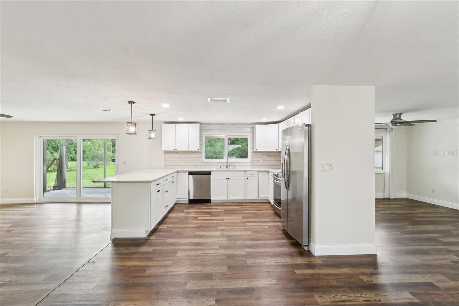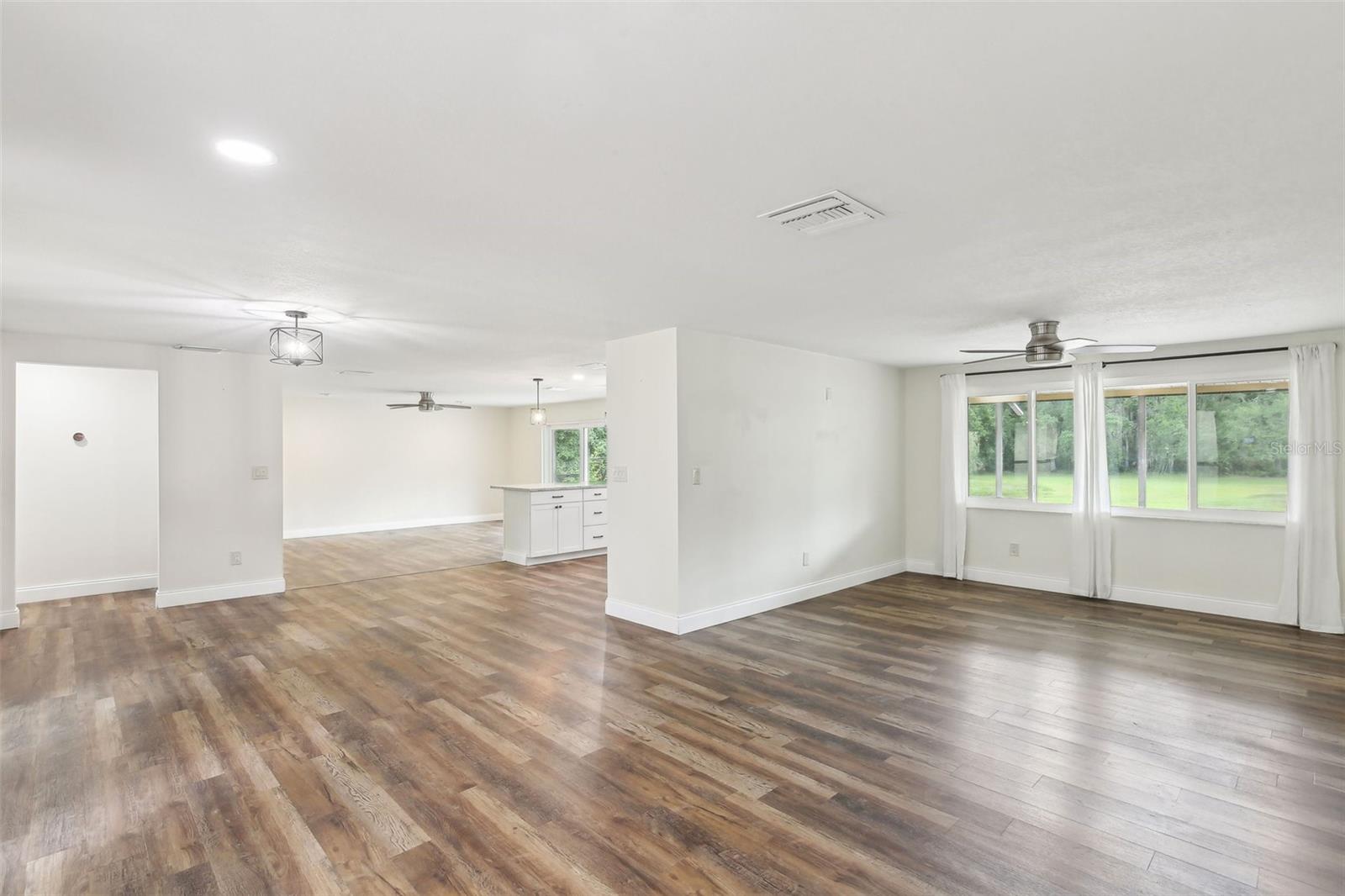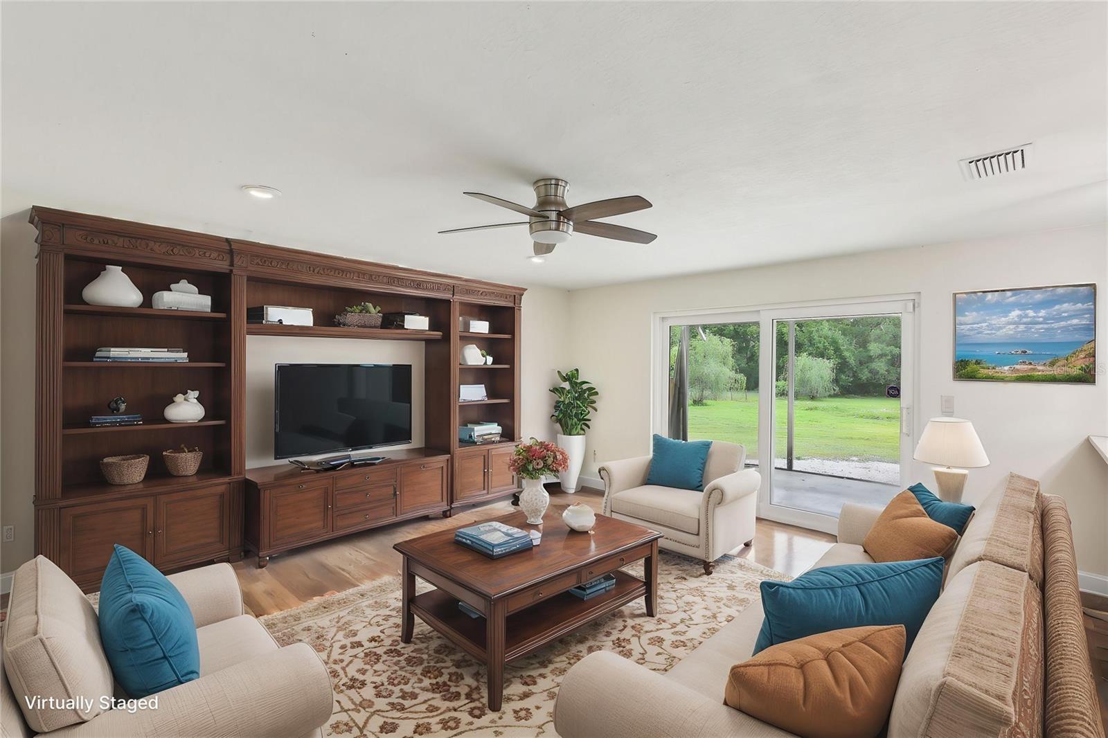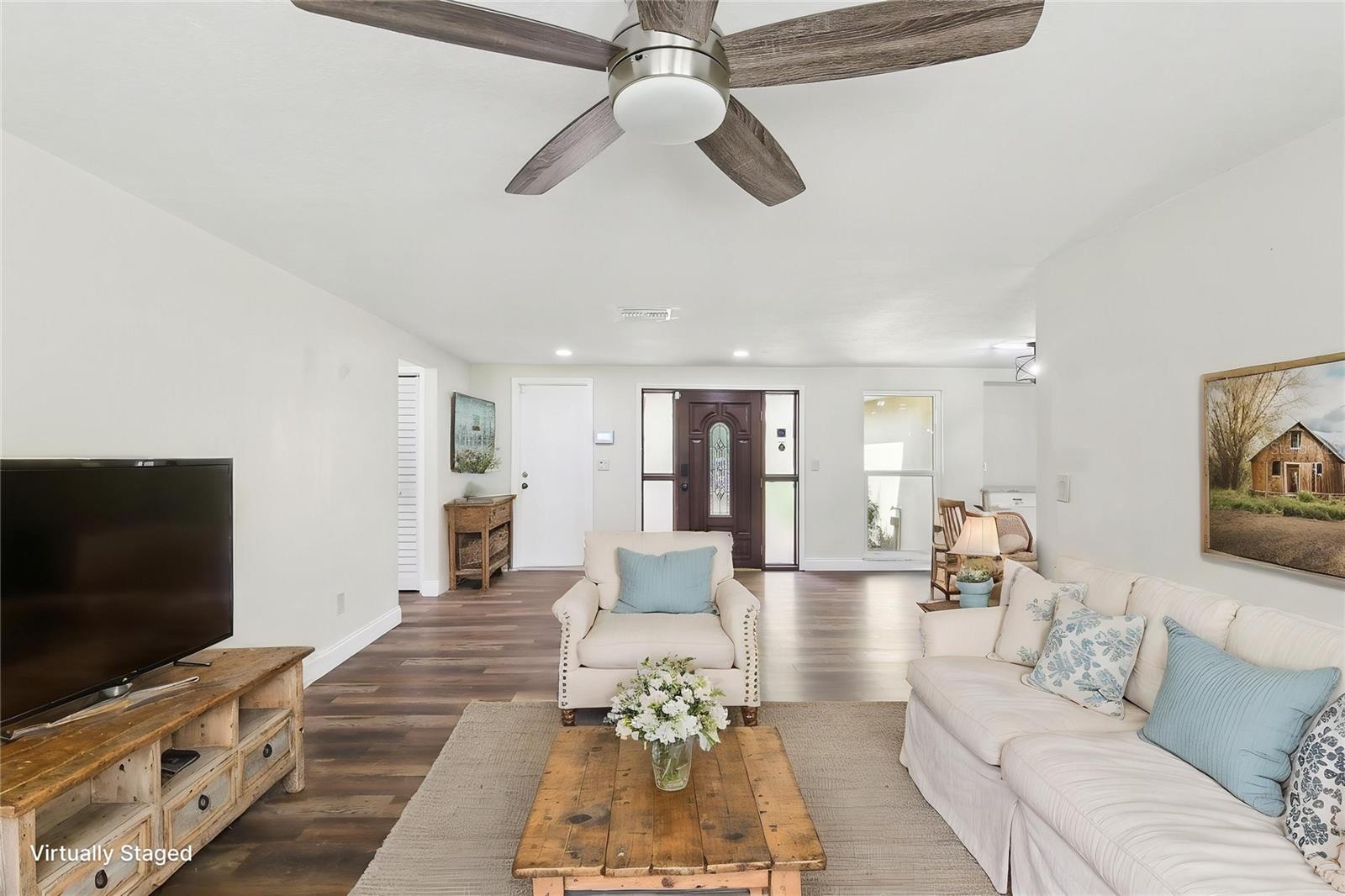 One or more photo(s) has been virtually staged. Welcome to 11630 Osceola Drive - Modern Country Living on Nearly 3 Acres (2 Lots Totaling 2.73 Acres) – Fully Renovated and Move-In Ready! This residence is tucked away on your own private oasis with circular driveway and over 2000SF of living space. It has been exceptionally updated, providing 3-bedrooms, 2-bathrooms combining modern comfort and country charm. Every inch of this property has been thoughtfully re imagined—from the 2021 roof installation to the sleek luxury vinyl flooring throughout—absolutely no carpet in sight! Step inside and be instantly drawn to the heart of the home: a bright, open kitchen featuring crisp shaker cabinets, granite countertops, a tile backsplash, and stainless steel appliances. Just off the kitchen, a versatile nook with a built-in dry bar offers the perfect space for a coffee station, buffet setup, or pantry expansion—tailored to your lifestyle. The split-bedroom layout ensures privacy, with a spacious primary suite that opens directly to an expansive screened-in patio stretching the full length of the home—ideal for morning coffee, evening relaxation, or entertaining under the stars. The en-suite bath is both tech-savvy and luxurious, featuring smart lighting and built-in speakers that sync with Alexa. Additional upgrades include hurricane shutters for peace of mind, a whole-home water softener system, updated duct-work, a 2021 Water Heater, updated electrical, new fixtures, ceiling fans, and lighting—truly move-in ready with no detail overlooked. Outside, your options are limitless: park your RV or boat with ease, let your animals roam freely with ER zoning, or get to work in the oversized workshop (40x26) with electric door opener—fully outfitted with electric, plumbing, and its own attic. There’s also an additional powered shed, a private pond, and best of all—No HOA, No CDD, and Non Flood Zone. This one-of-a-kind property offers space, freedom, and functionality—a rare combination you won’t want to miss (APNs 12-25-16-0020-00000-0220 and 12-25-16-0020-00000-0231 Included).