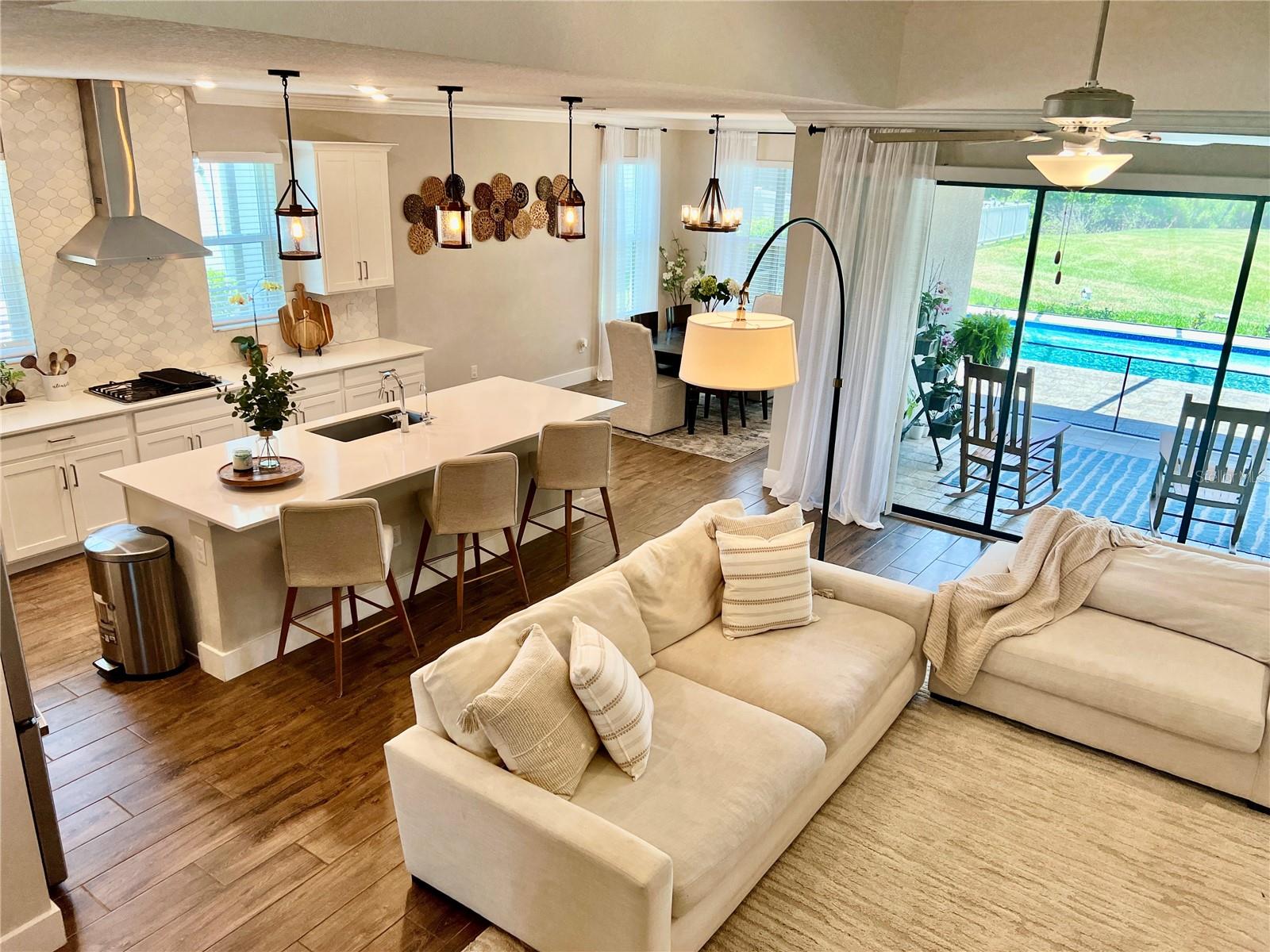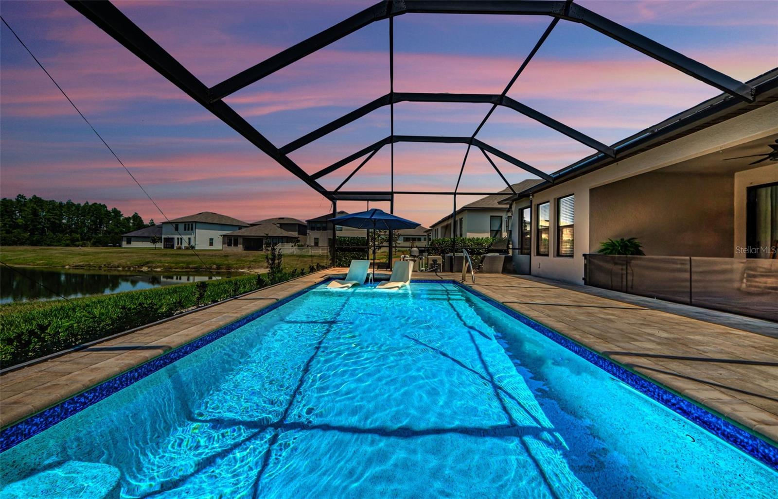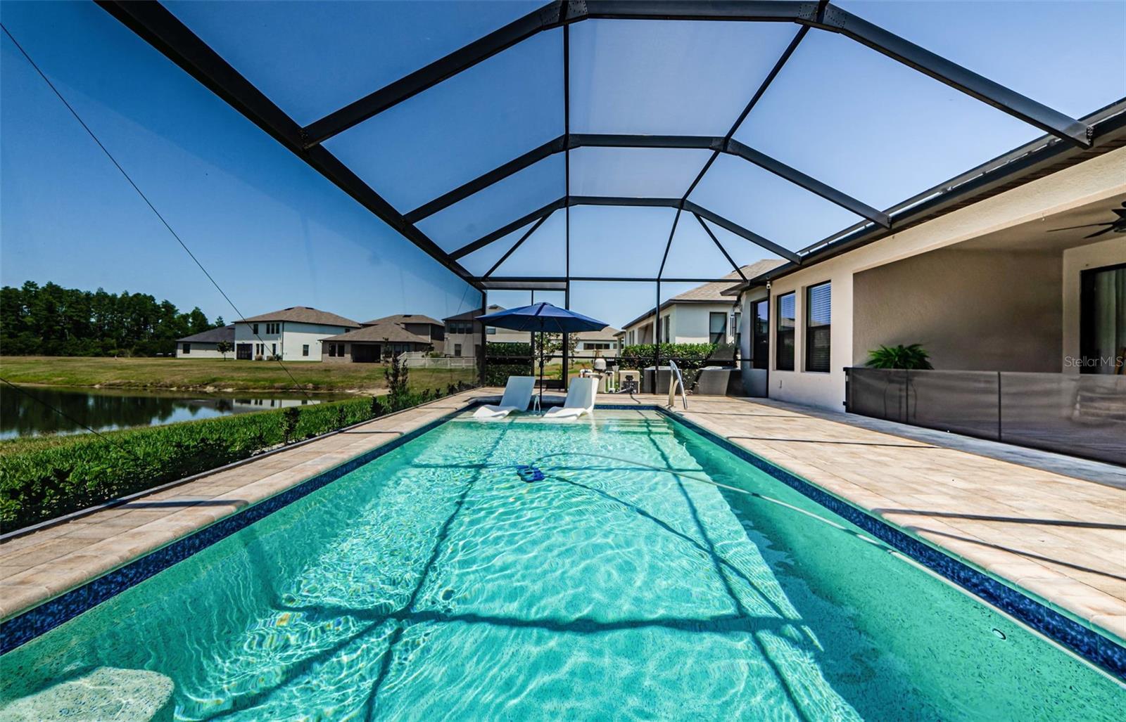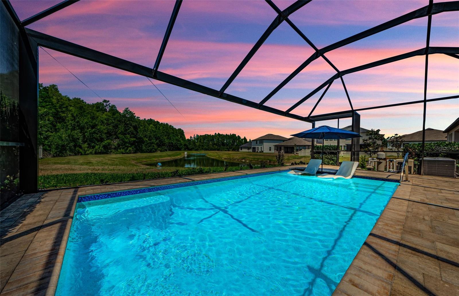 Seller is motivated! This 3,282 sq. ft. energy-efficient home offers 5 bedrooms, 4.5 bathrooms, and stunning pond and conservation views with ultimate privacy. The open-concept layout features vaulted ceilings, crown molding, wood plank tile flooring, and a custom built-in with electric fireplace. Pocket sliders in the living area open fully to reveal a heated saltwater pool with sun loungers, multi-colored lighting, and a panoramic screen enclosure. The gourmet kitchen boasts quartz countertops, stainless steel appliances, gas stove, reverse osmosis, butler’s pantry, and a massive walk-in pantry. The main-level primary suite includes a spa-like bath with dual sinks, garden tub, walk-in shower, and large walk-in closet. A second en-suite on the main floor is perfect for guests or in-laws. Upstairs includes three more bedrooms (one en-suite) and a large loft with built-in wet bar. Additional highlights include a two-car garage, paid-off solar panels (no electric bill), hurricane impact windows and shutters, tankless water heater, and a 10-stage Purity Bay water filtration system. No storm damage and located in a non-flood zone. Community amenities include two pools, playgrounds, low HOA, and proximity to shopping, dining, and top-rated schools.