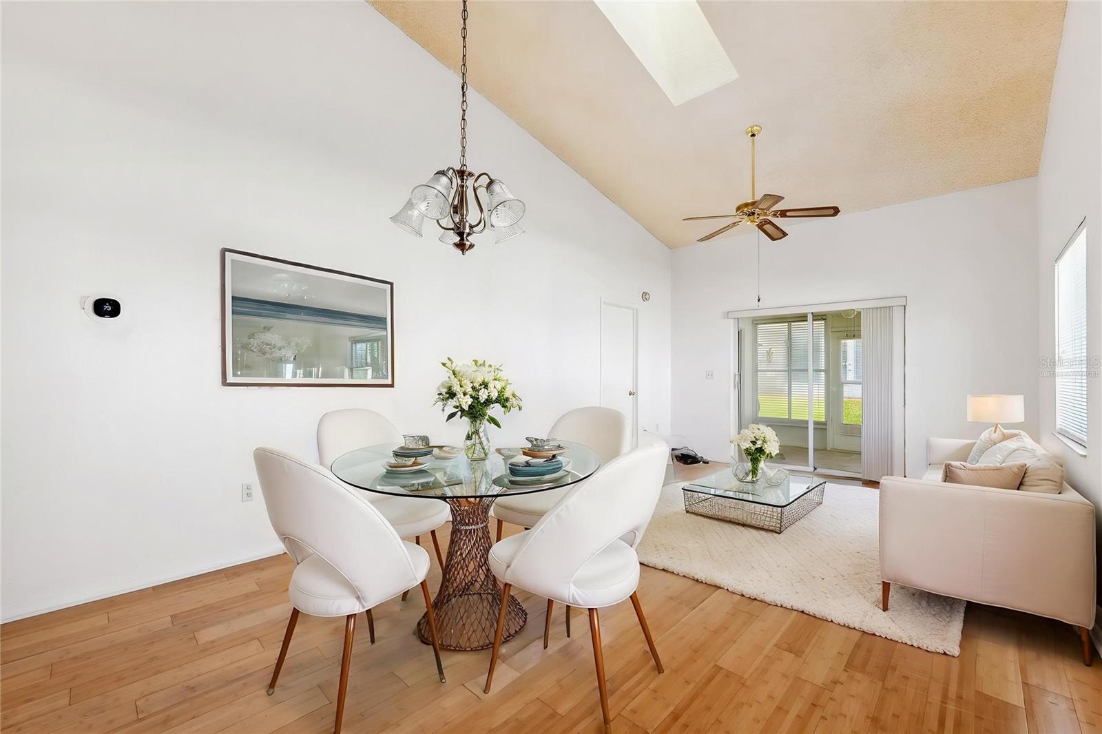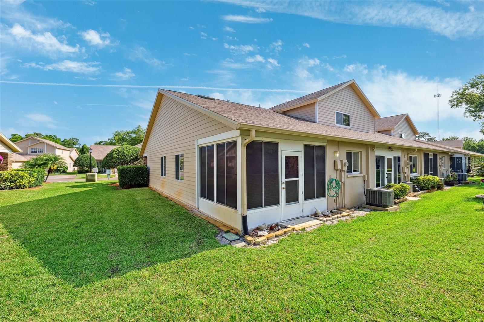 One or more photo(s) has been virtually staged. Welcome to this beautifully maintained villa nestled in the welcoming 55+ neighborhood of Briar Patch in New Port Richey! This charming end-unit, 2-bedroom, 2-bath home delivers easy, single-story living with an inviting open floorplan, high vaulted ceilings, and abundant natural light enhanced by skylights. Thoughtfully updated with a brand new A/C (2024) and new roof (2024), this home is move-in ready and designed for comfort and ease. Enjoy the serenity of a landscaped garden view from your front porch, or unwind under the enclosed back patio, surrounded by rain gutters, flower beds, and sliding doors that blend indoor and outdoor living. Inside, you’ll find a split bedroom layout for added privacy, a spacious living/dining combo, and a bright kitchen with an informal dining nook, laminate countertops, and electric appliances — perfect for both daily living and entertaining. Retreat to the owner’s suite, featuring a custom built-in closet system and a large en suite bath with a seamless tile shower stall. Additional perks include an inside utility room, ample storage, and guest-friendly parking options including a driveway, garage with opener, and guest parking. Located directly across from the community pool and clubhouse, this villa provides unbeatable access to amenities in a friendly inviting neighborhood. The HOA is refreshingly low and covers exterior maintenance, as well as the roof, making for truly hassle-free living. Whether you're looking for a seasonal escape or your forever Florida home, this vibrant and friendly community awaits. Don’t miss your chance to live the lifestyle you deserve!