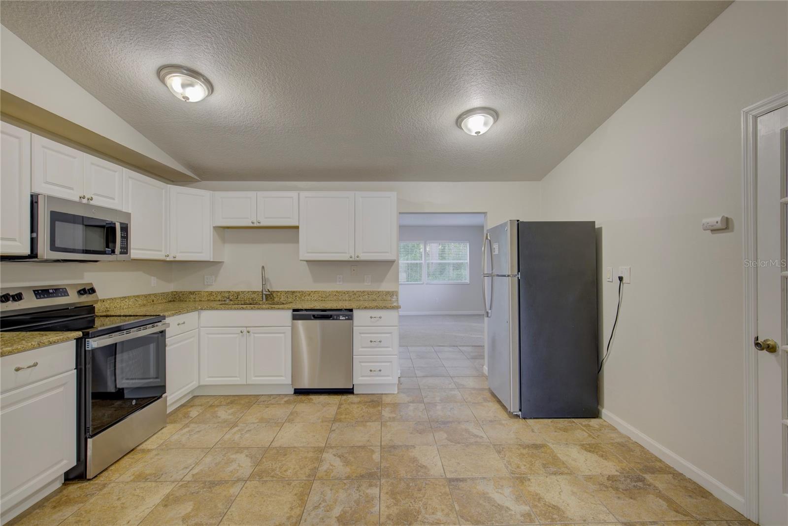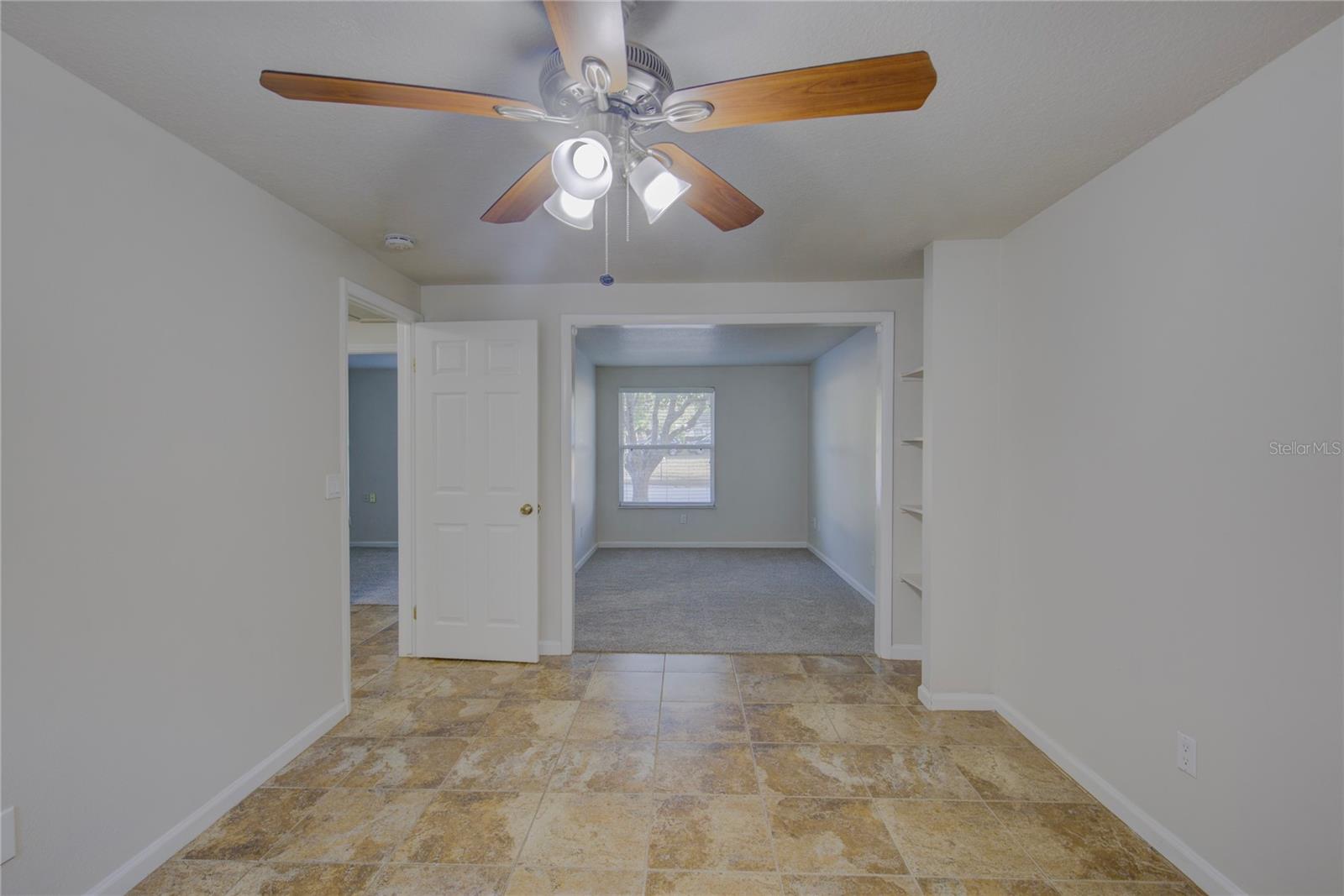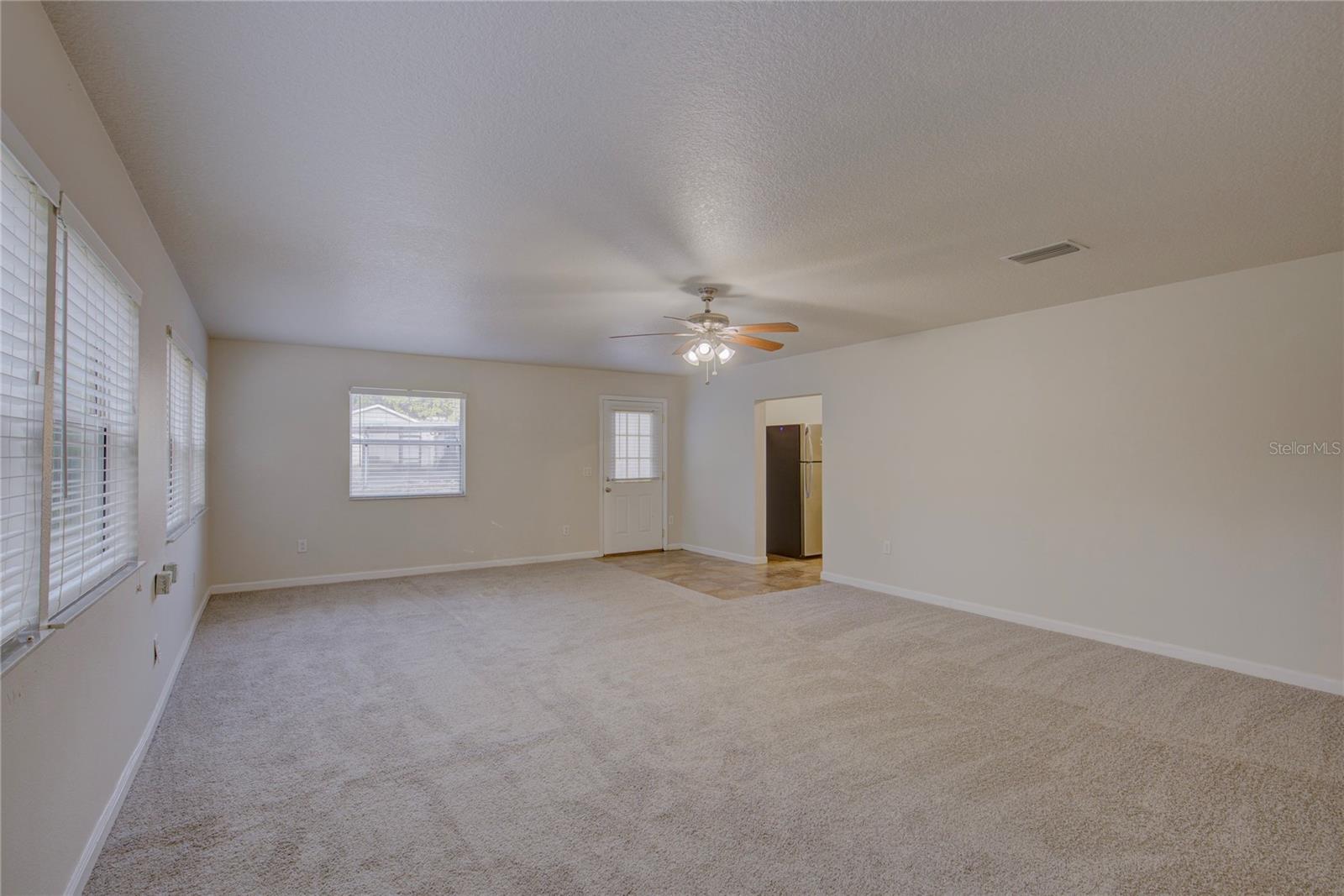 This well-maintained home features a spacious and versatile interior layout with two generous living areas, both filled with natural light and equipped with ceiling fans for year-round comfort. The kitchen is appointed with granite countertops, white cabinetry, and stainless steel appliances, seamlessly connecting to the adjacent dining space and one of the main living rooms. Durable tile flooring runs through much of the home, while select rooms feature plush carpeting for added warmth. Multiple bedrooms offer ample closet space, and the bathrooms are upgraded with tiled shower surrounds, modern vanities, and built-in shelving. Additional highlights include a hallway with built-in storage, a rear entry for convenient outdoor access, and a clean, neutral color palette throughout—making the home move-in ready and adaptable to a variety of lifestyles. Conveniently located, the property is approximately 10 minutes from Jay B. Starkey Wilderness Park, 15 minutes from downtown New Port Richey, 20 minutes from Gulf View Square Mall, and about 45 minutes from Tampa International Airport.