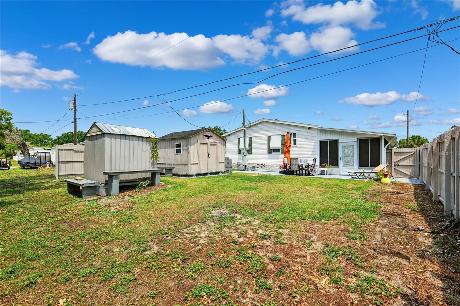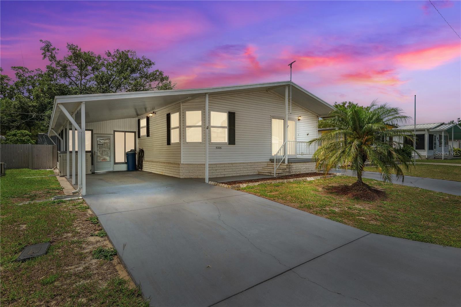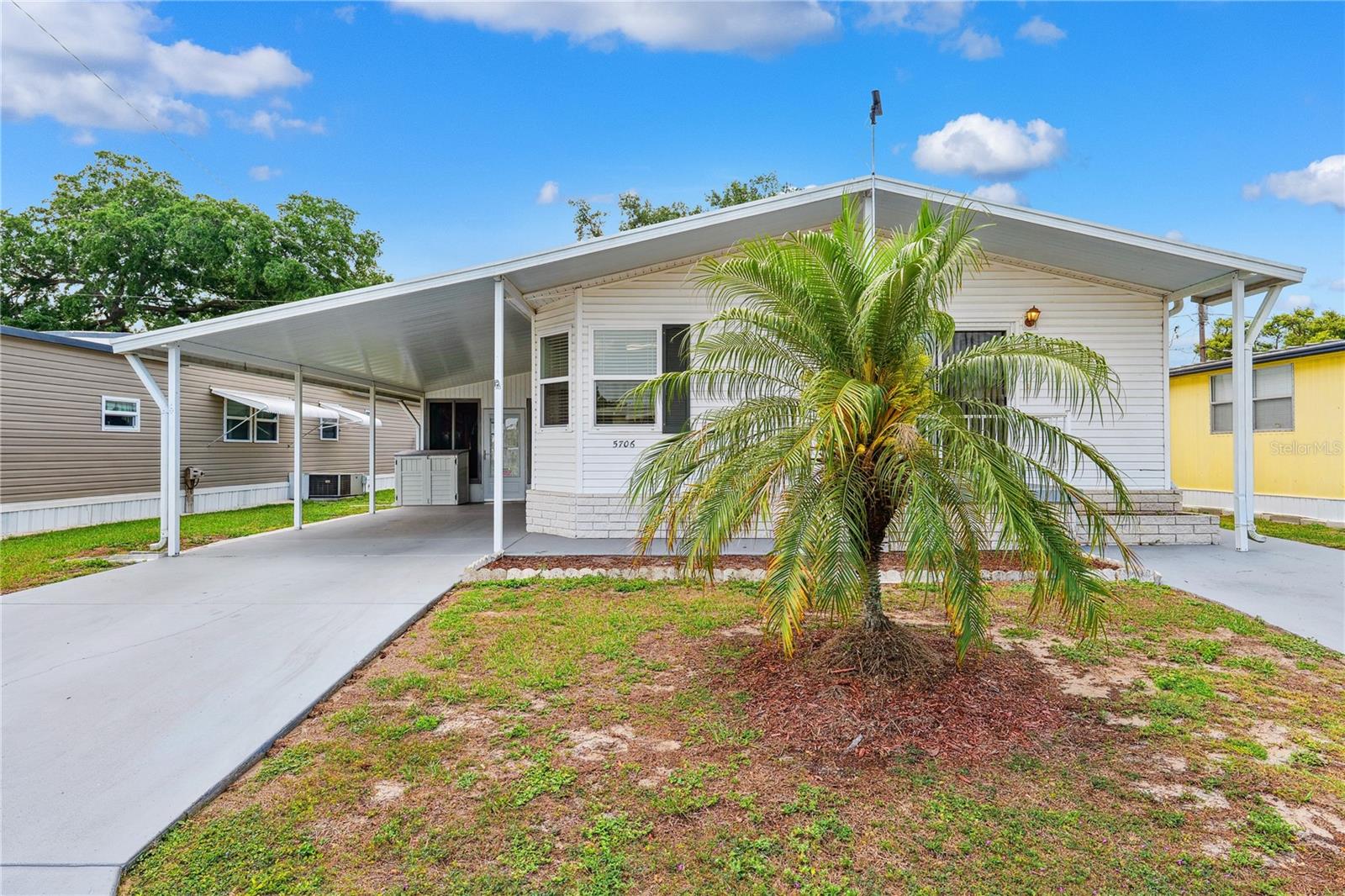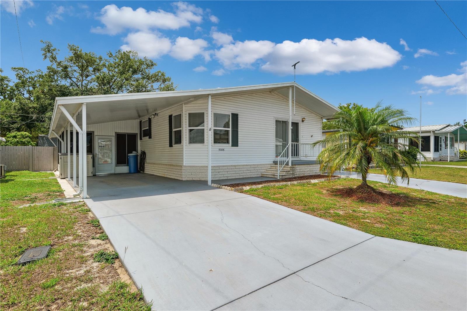 YOU OWN THE LAND! This well-maintained 2-bedroom, 2-bath Palm Harbor Model manufactured home offers 1,242 sq ft of living space with solid 2x6 construction and no storm damage from recent hurricanes. Built in 1997, the home has been recently updated with over $35k in upgrades. The kitchen features refaced real wood cabinet doors, quartz countertops, new stainless steel appliances, updated plumbing, a new sink, and recessed lighting. The living room includes a custom stone mantle with a mounted TV (included) and two large built-in alcoves for books or display. Throughout the home, you’ll find LED lighting, new ceiling fans, updated blinds with real wood valances, upgraded baseboards, and freshly textured and painted walls. The bathrooms have quartz countertops and weatherproof tile. Major systems are in excellent shape: the roof was replaced in 2023, the A/C is four years old, and the water heater is under five years old. The home also features insulated, impact windows for added comfort and efficiency. Outdoor highlights include a large screened lanai, two sheds, a spacious carport, and a fully fenced yard. Move-in ready with all the key updates already done—just bring your personal touch.