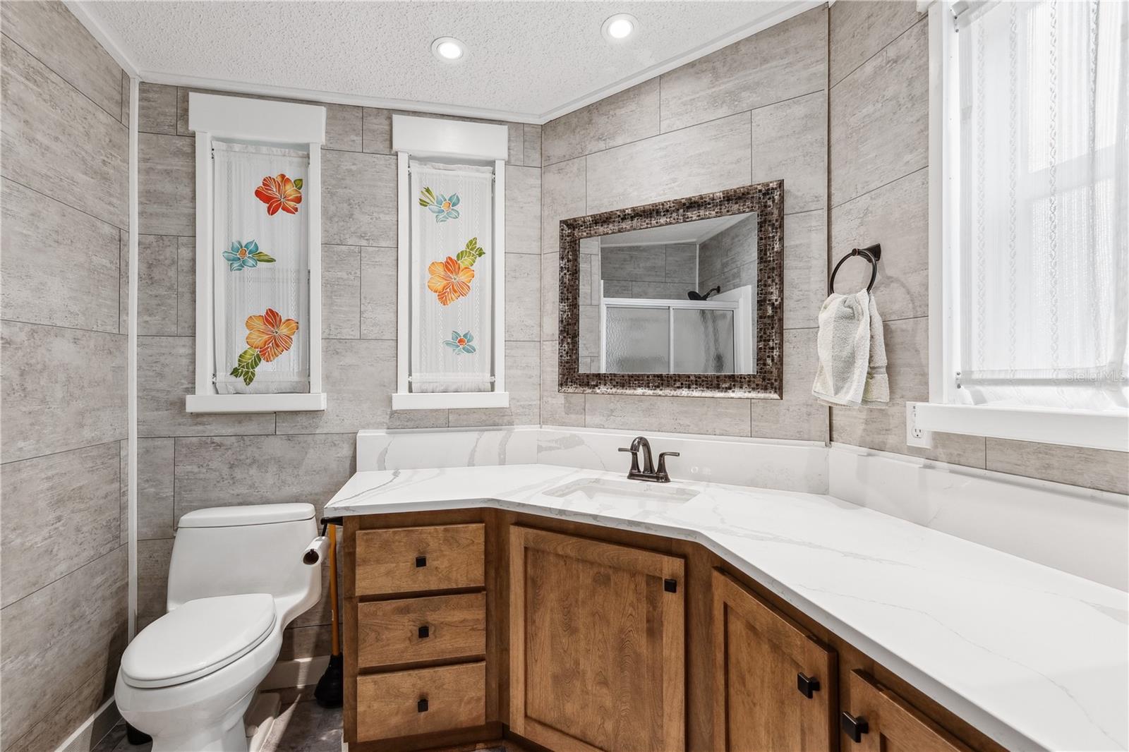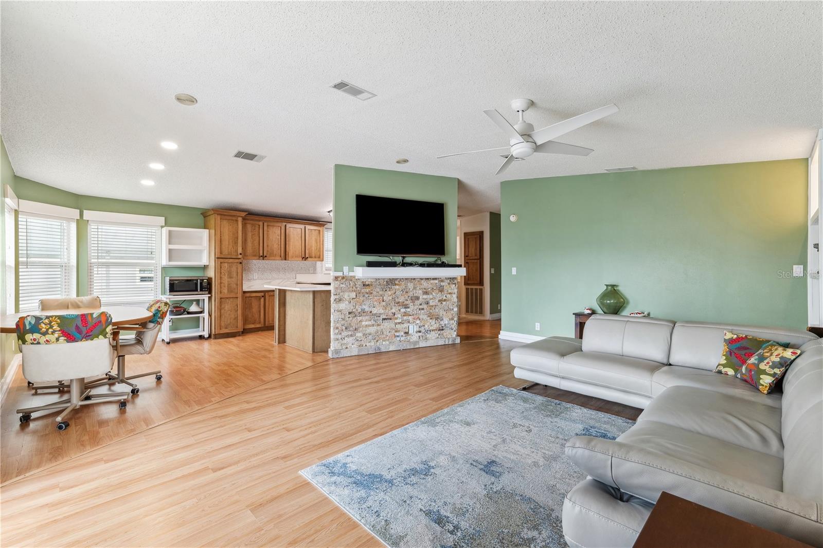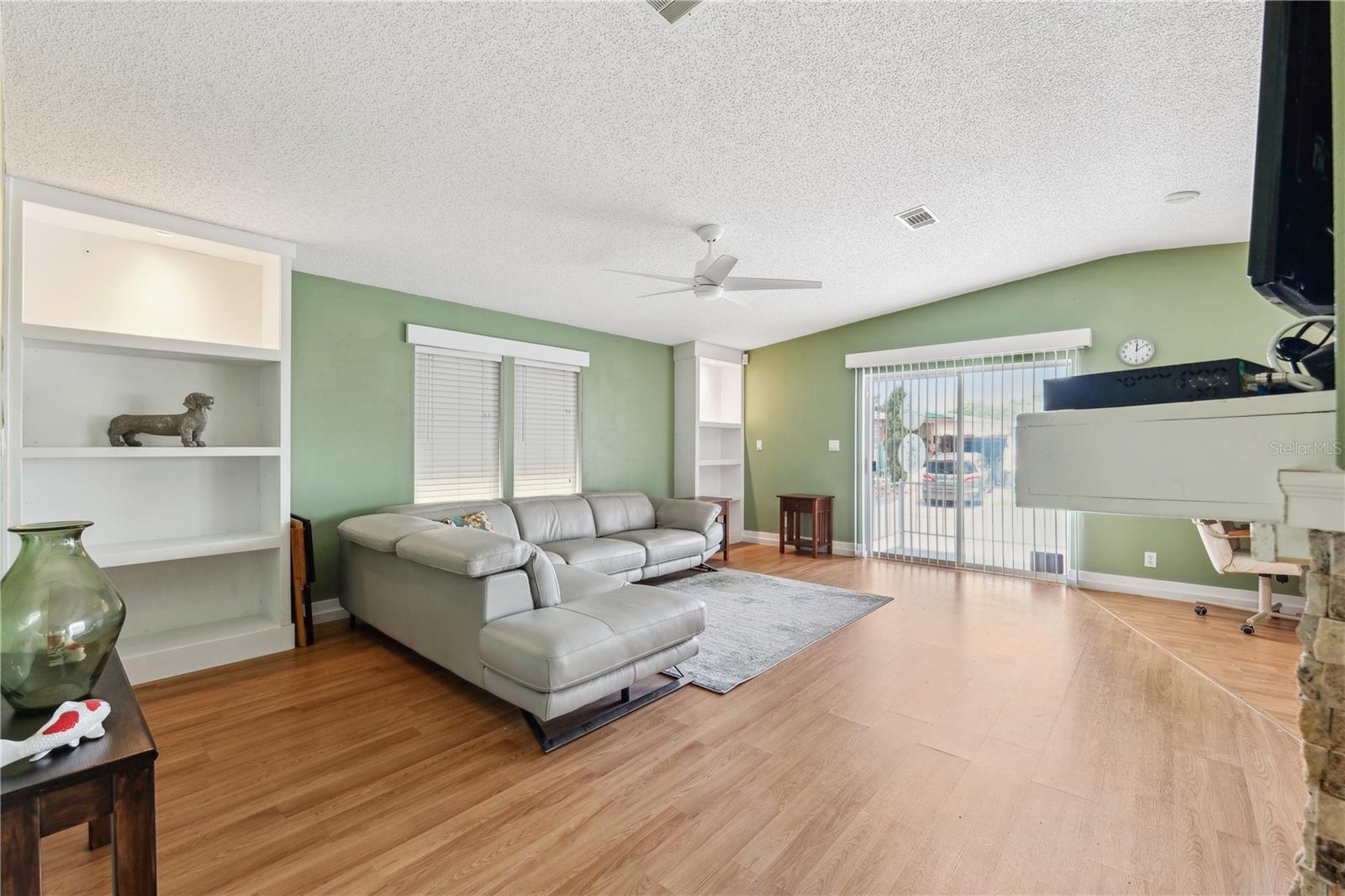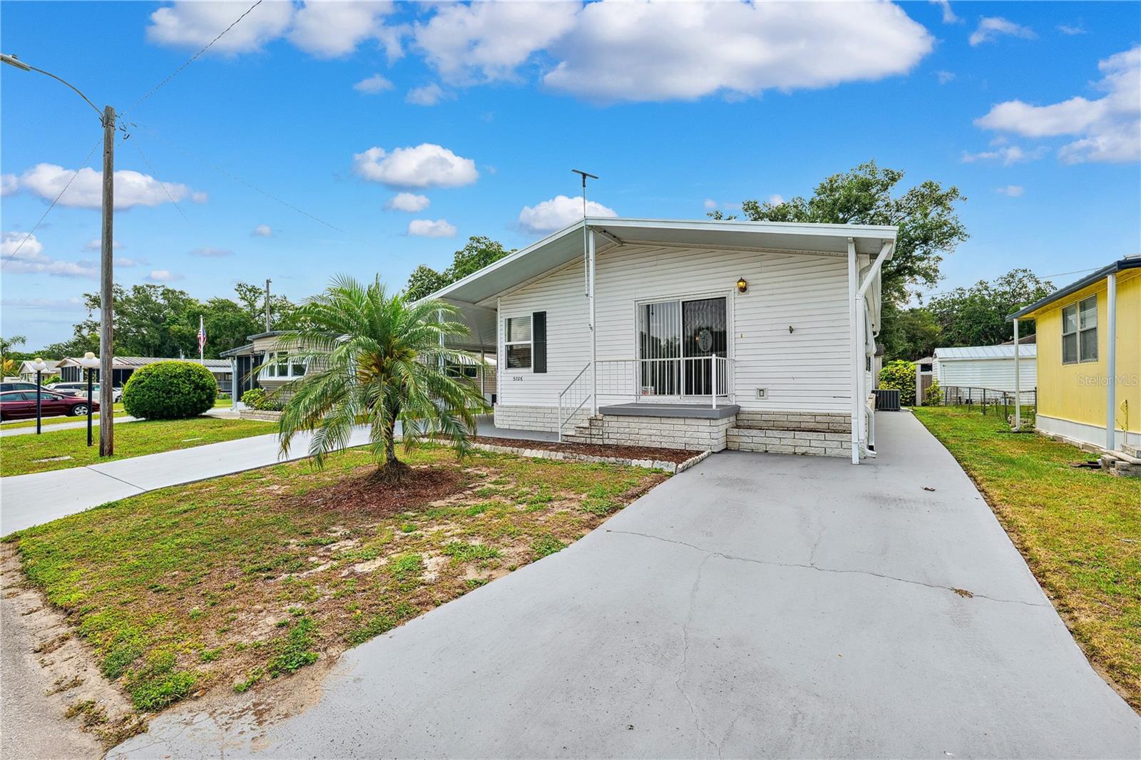 YOU OWN THE LAND! This well-maintained 2-bedroom, 2-bath Palm Harbor Model manufactured home offers 1,242 sq ft of living space with solid 2x6 construction and no storm damage from recent hurricanes. Built in 1997, the home has been recently updated with over $35k in upgrades. The kitchen features refaced real wood cabinet doors, quartz countertops, new stainless steel appliances, updated plumbing, a new sink, and recessed lighting. The living room includes a custom stone mantle with a mounted TV (included) and two large built-in alcoves for books or display. Throughout the home, you’ll find LED lighting, new ceiling fans, updated blinds with real wood valances, upgraded baseboards, and freshly textured and painted walls. The bathrooms have quartz countertops and weatherproof tile. Major systems are in excellent shape: the roof was replaced in 2023, the A/C is four years old, and the water heater is under five years old. The home also features insulated, impact windows for added comfort and efficiency. Outdoor highlights include a large screened lanai, two sheds, a spacious carport, and a fully fenced yard. Move-in ready with all the key updates already done—just bring your personal touch.
