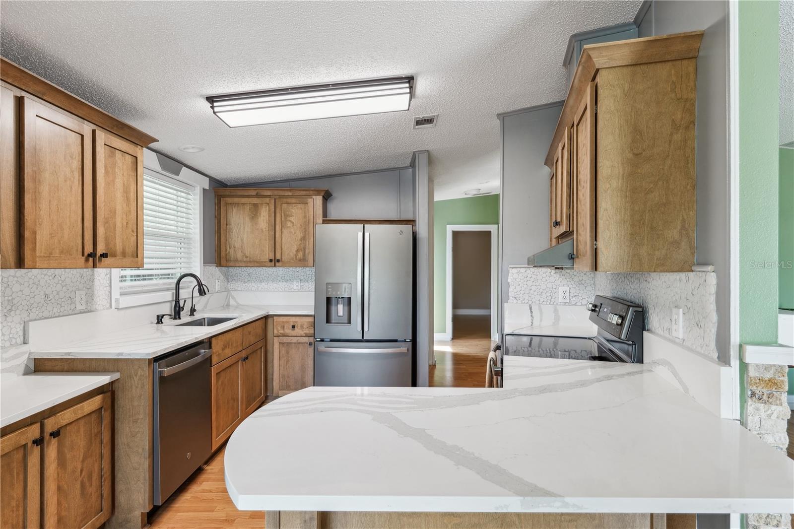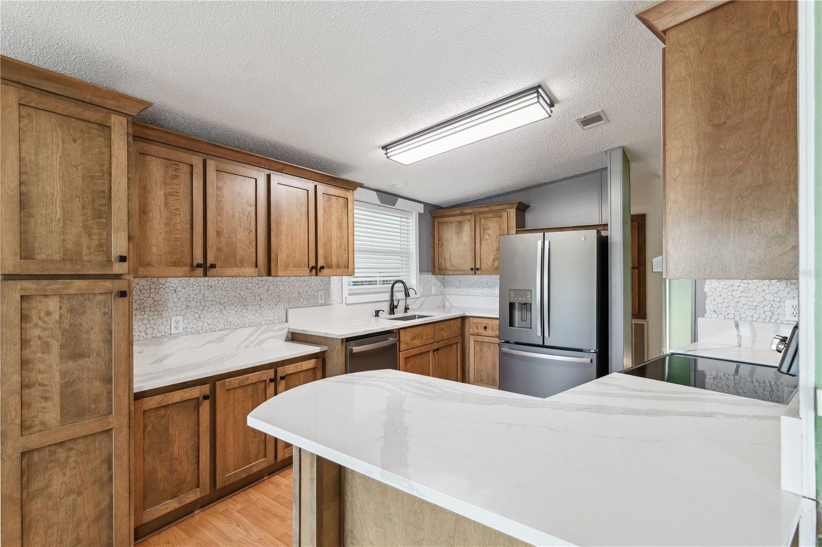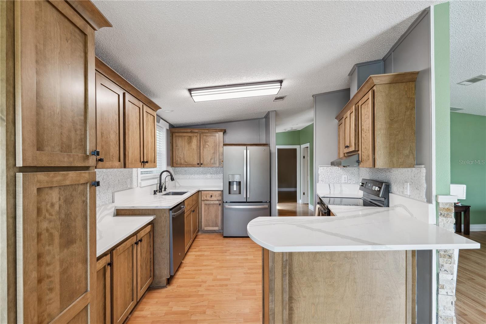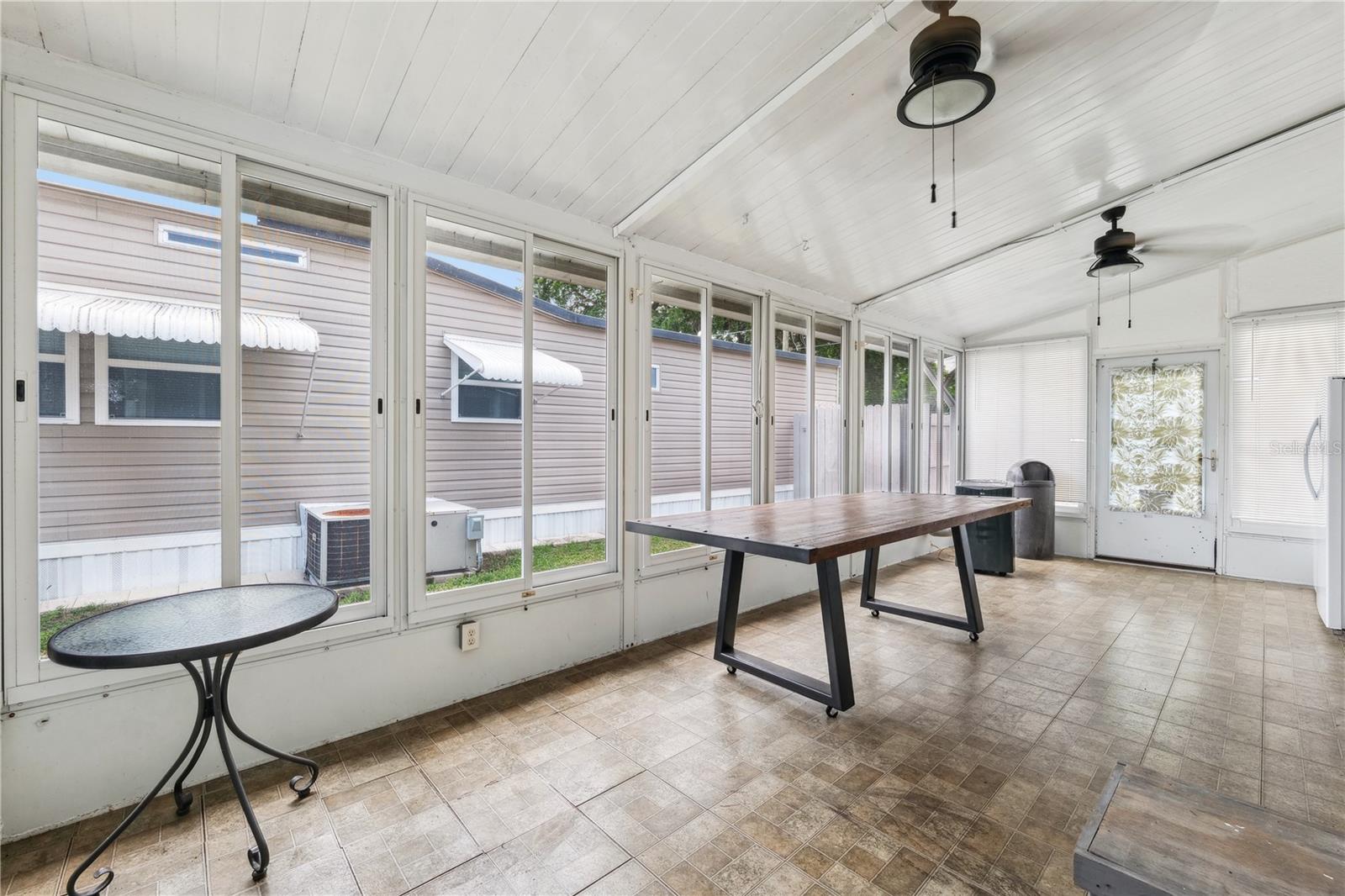 YOU OWN THE LAND! This well-maintained 2-bedroom, 2-bath Palm Harbor Model manufactured home offers 1,242 sq ft of living space with solid 2x6 construction and no storm damage from recent hurricanes. Built in 1997, the home has been recently updated with over $35k in upgrades. The kitchen features refaced real wood cabinet doors, quartz countertops, new stainless steel appliances, updated plumbing, a new sink, and recessed lighting. The living room includes a custom stone mantle with a mounted TV (included) and two large built-in alcoves for books or display. Throughout the home, you’ll find LED lighting, new ceiling fans, updated blinds with real wood valances, upgraded baseboards, and freshly textured and painted walls. The bathrooms have quartz countertops and weatherproof tile. Major systems are in excellent shape: the roof was replaced in 2023, the A/C is four years old, and the water heater is under five years old. The home also features insulated, impact windows for added comfort and efficiency. Outdoor highlights include a large screened lanai, two sheds, a spacious carport, and a fully fenced yard. Move-in ready with all the key updates already done—just bring your personal touch.