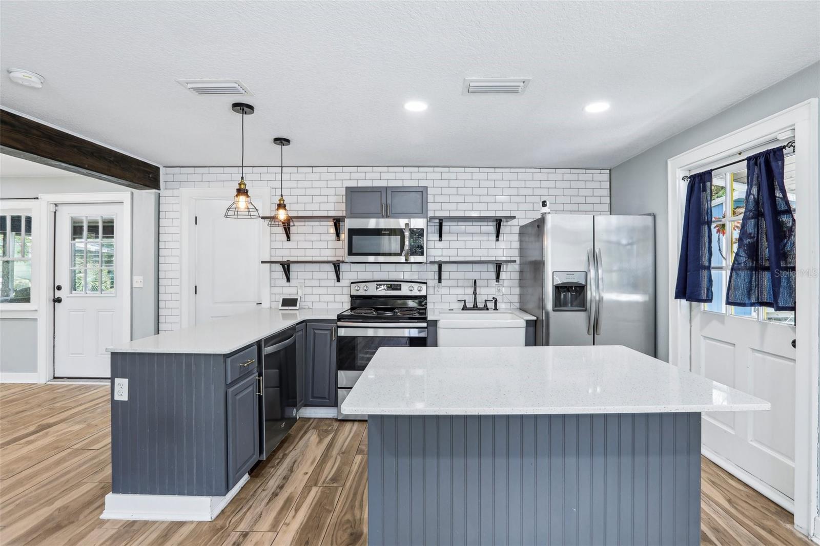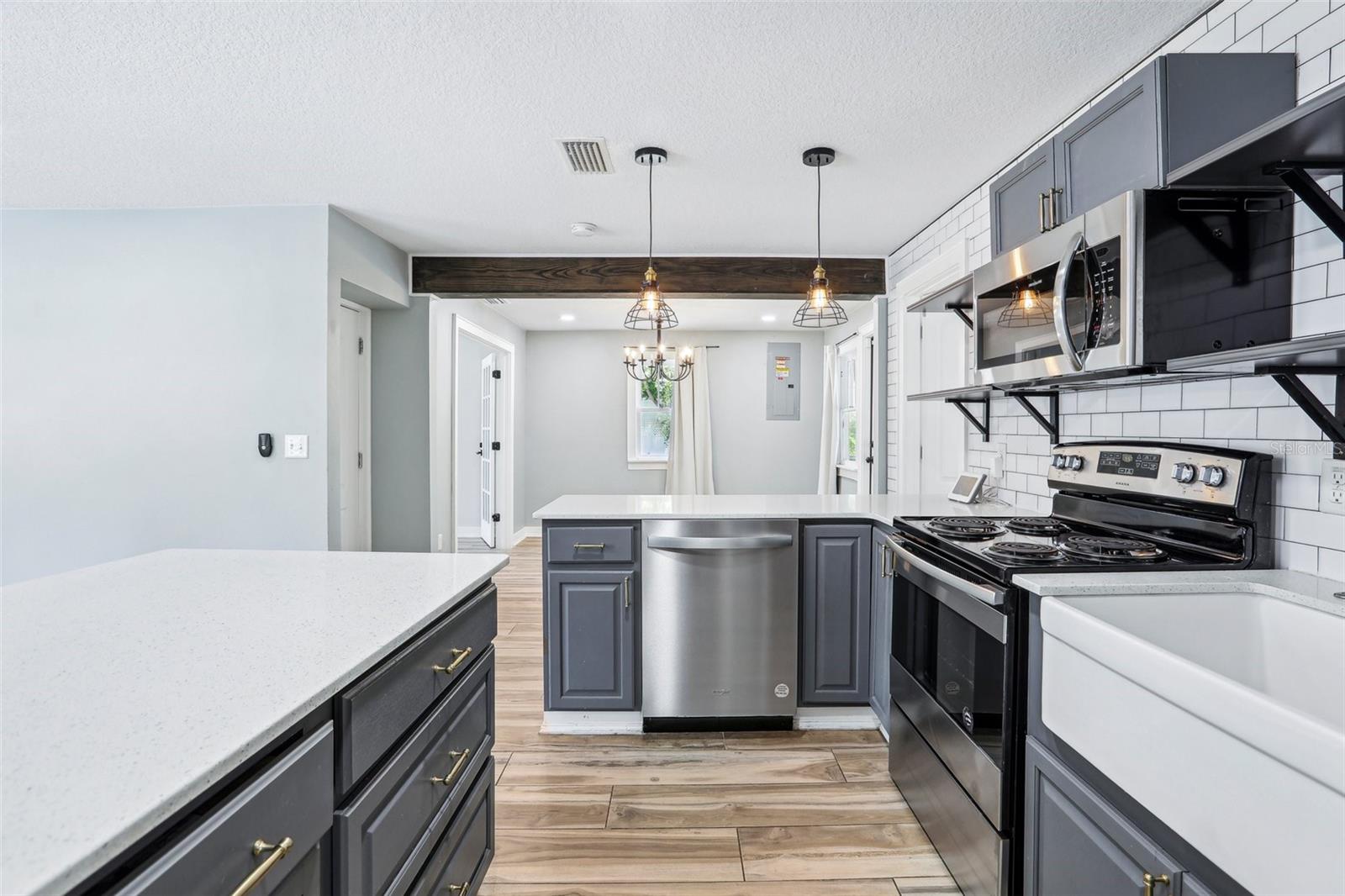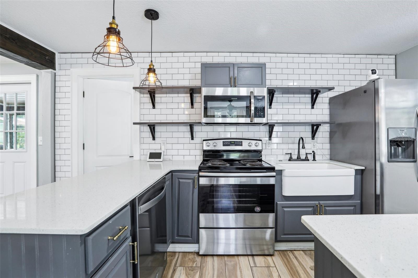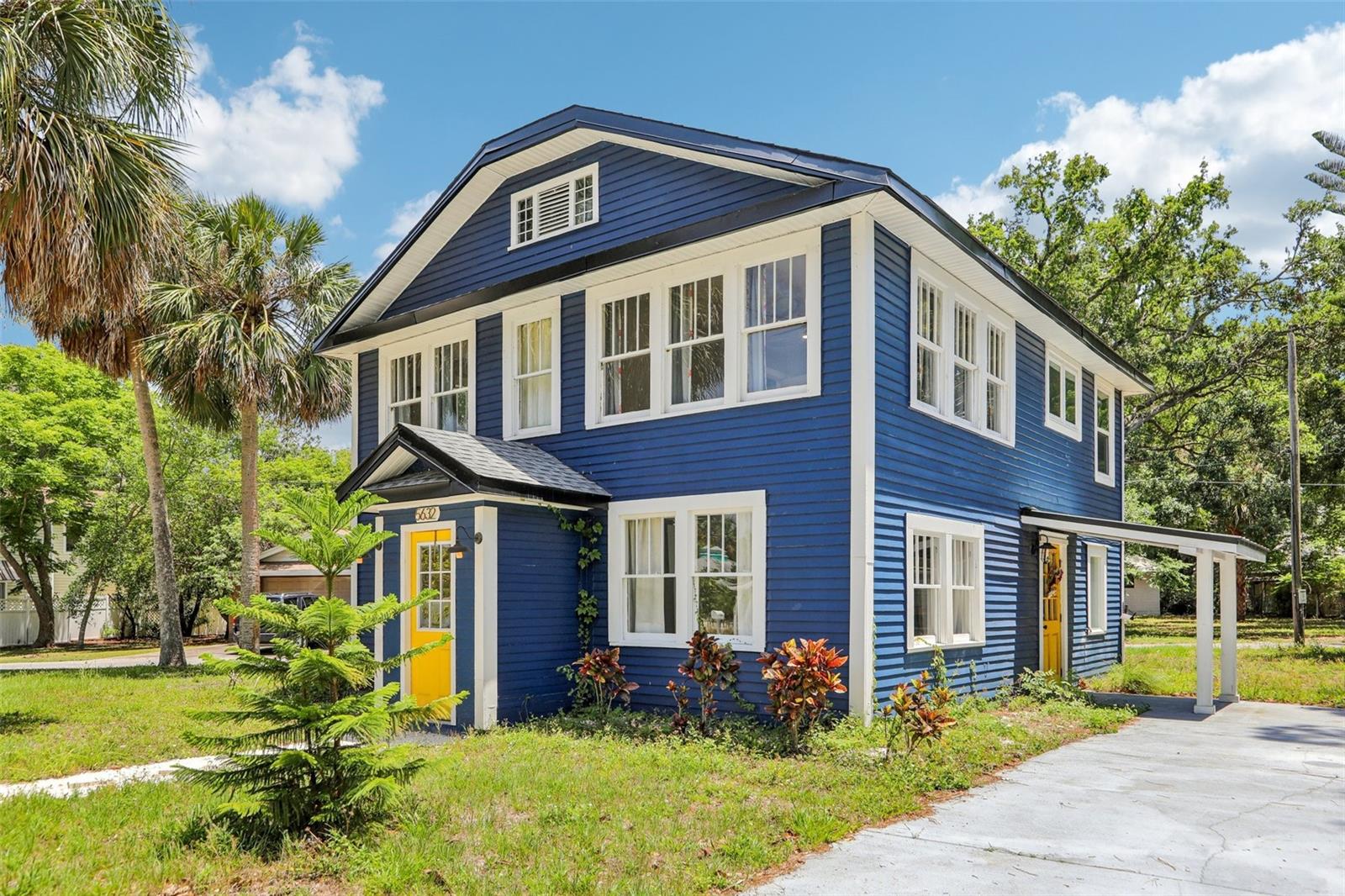 Charming and beautifully restored 3-bed, 3-bath home just minutes from downtown New Port Richey. Originally built in 1940, this residence blends timeless character with modern updates. The open-concept kitchen boasts a subway tile backsplash, open shelving, solid surface countertops, and a large single basin sink. The spacious primary bath offers a soaking tub and dual vanities. A first-floor guest bath features a walk-in shower, while the second-floor bath includes dual vanities. Ample third-floor attic space offers excellent storage.