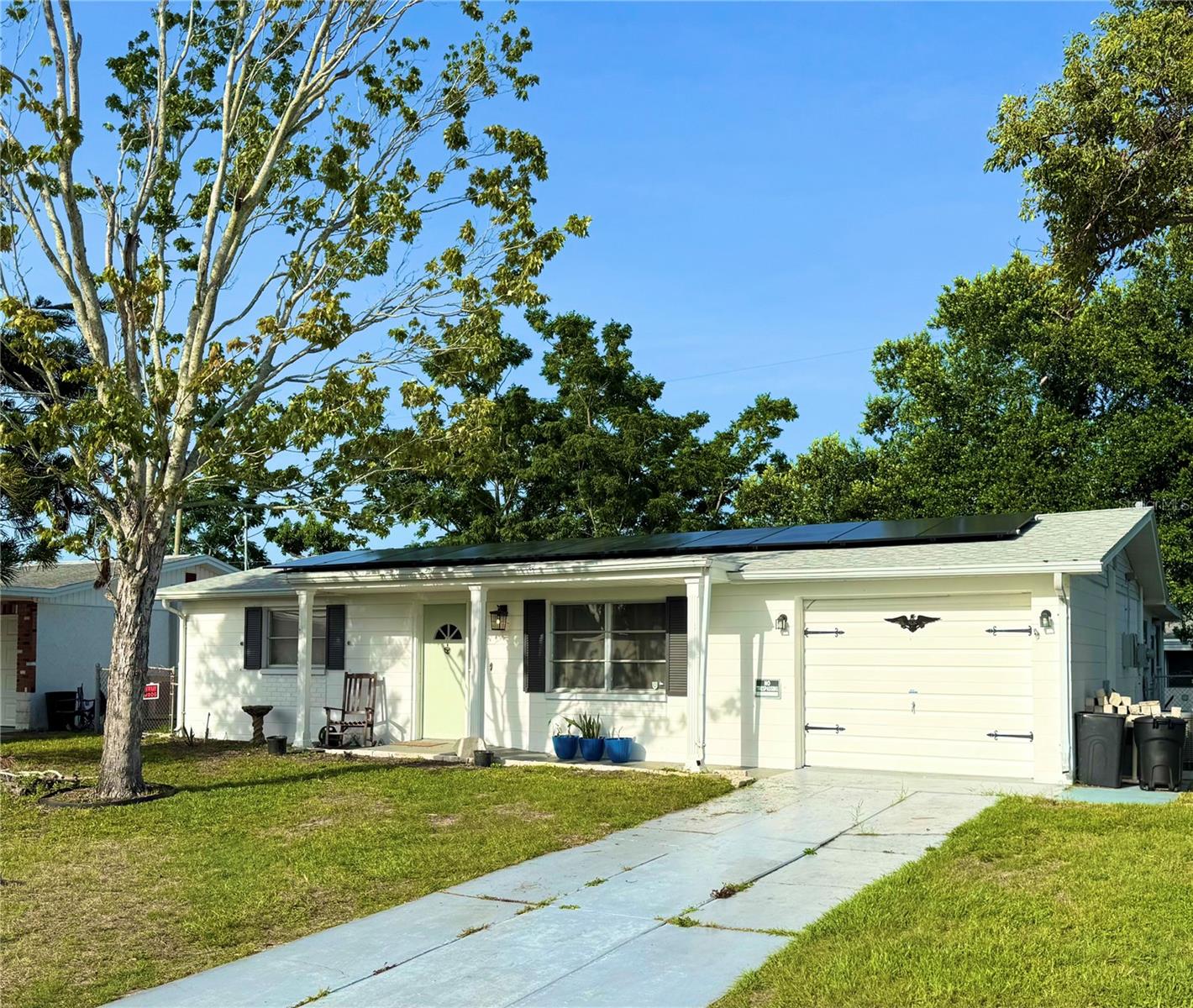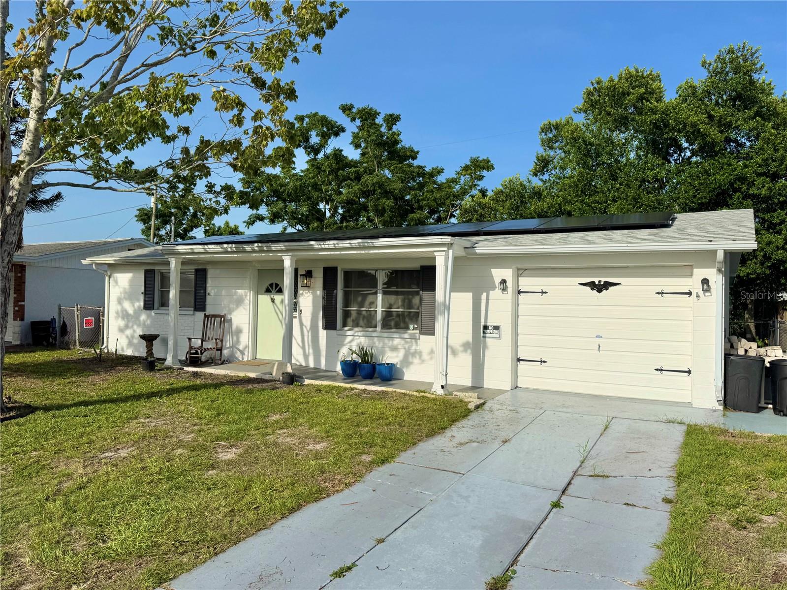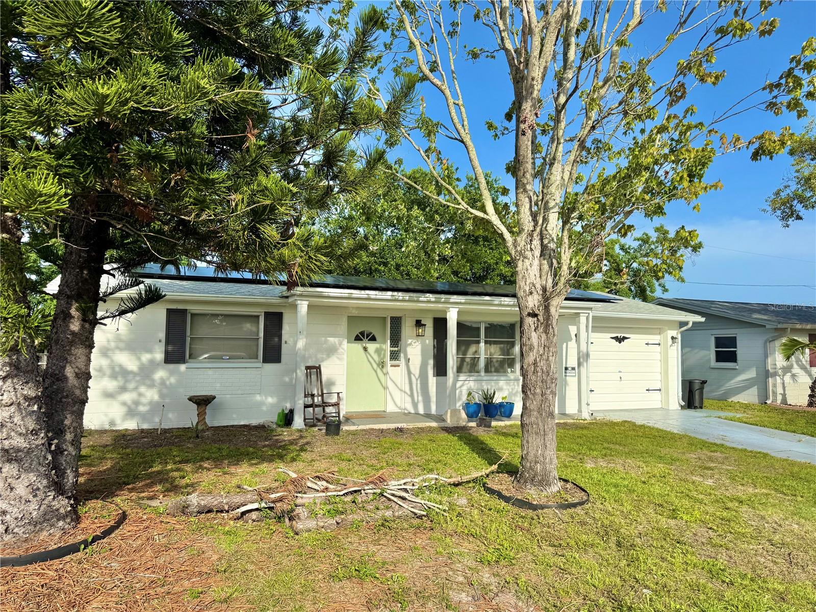 BUY THIS HOME WITH NO MONEY DOWN! Florida financing programs are available for eligible buyers—call today for more details! This solid block 2 bedroom, 1 bath, 1 car garage home is ideally situated near the vibrant Downtown New Port Richey and Downtown Tarpon Springs. The kitchen has been redesigned with solid wood cabinets, granite countertops, stainless steel appliances, and a breakfast bar that seamlessly connects to the spacious living room—perfect for entertaining. Light and bright, the bedrooms are generously sized and feature cedar plank-lined closets. The main bathroom has been nicely updated, and there’s also a brand new shower and pedestal sink that conveniently connects to both the main living area and the air-conditioned Florida/bonus room. Additional highlights include a new roof (2023), new HVAC (2024), solar panels installed in (2024), and a non-flood zone location—all with no HOA or CDD fees. This is also a great opportunity to turn into a rental property. Schedule your showing today! VA Assumable Mortgage is available too.