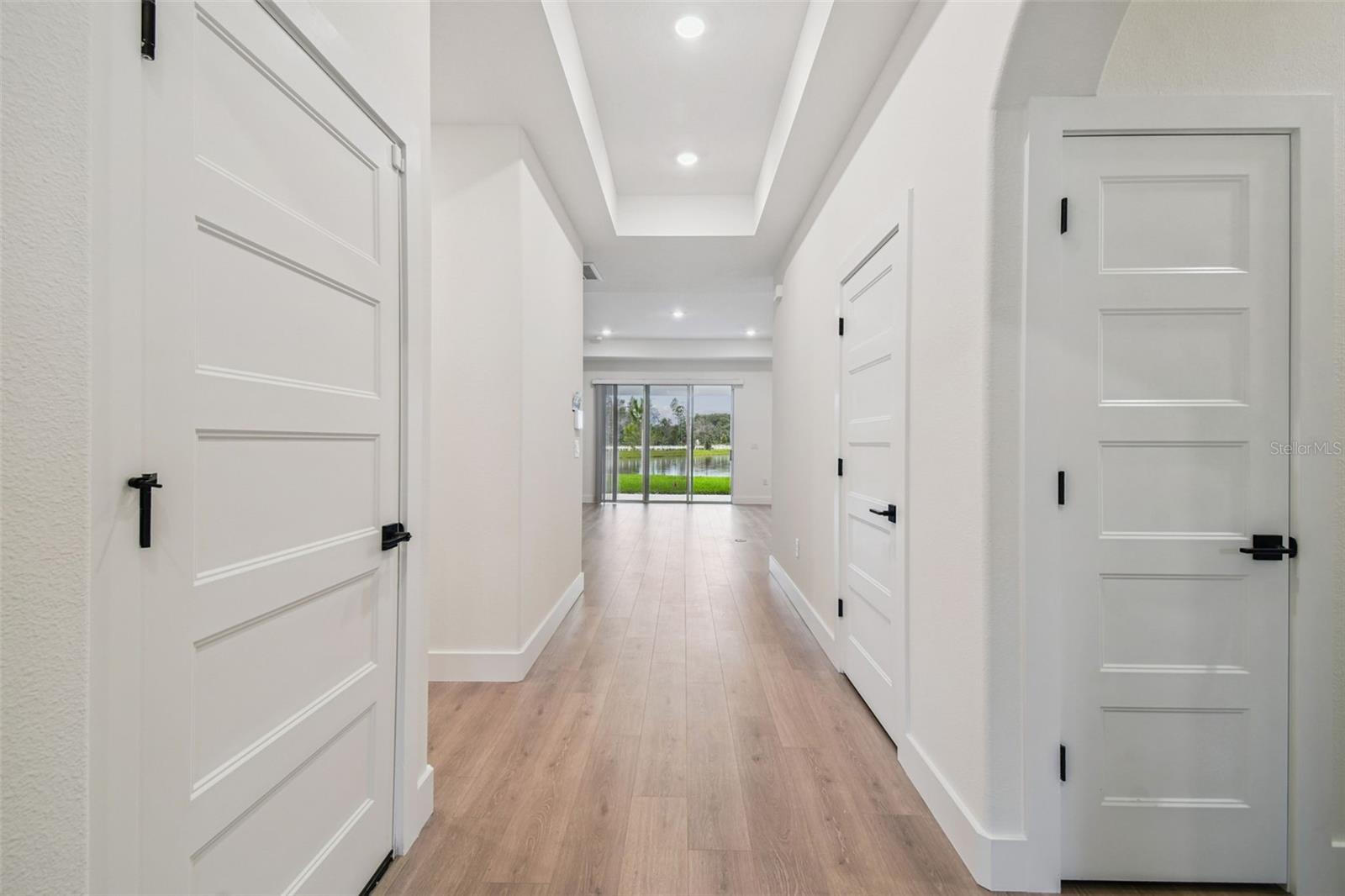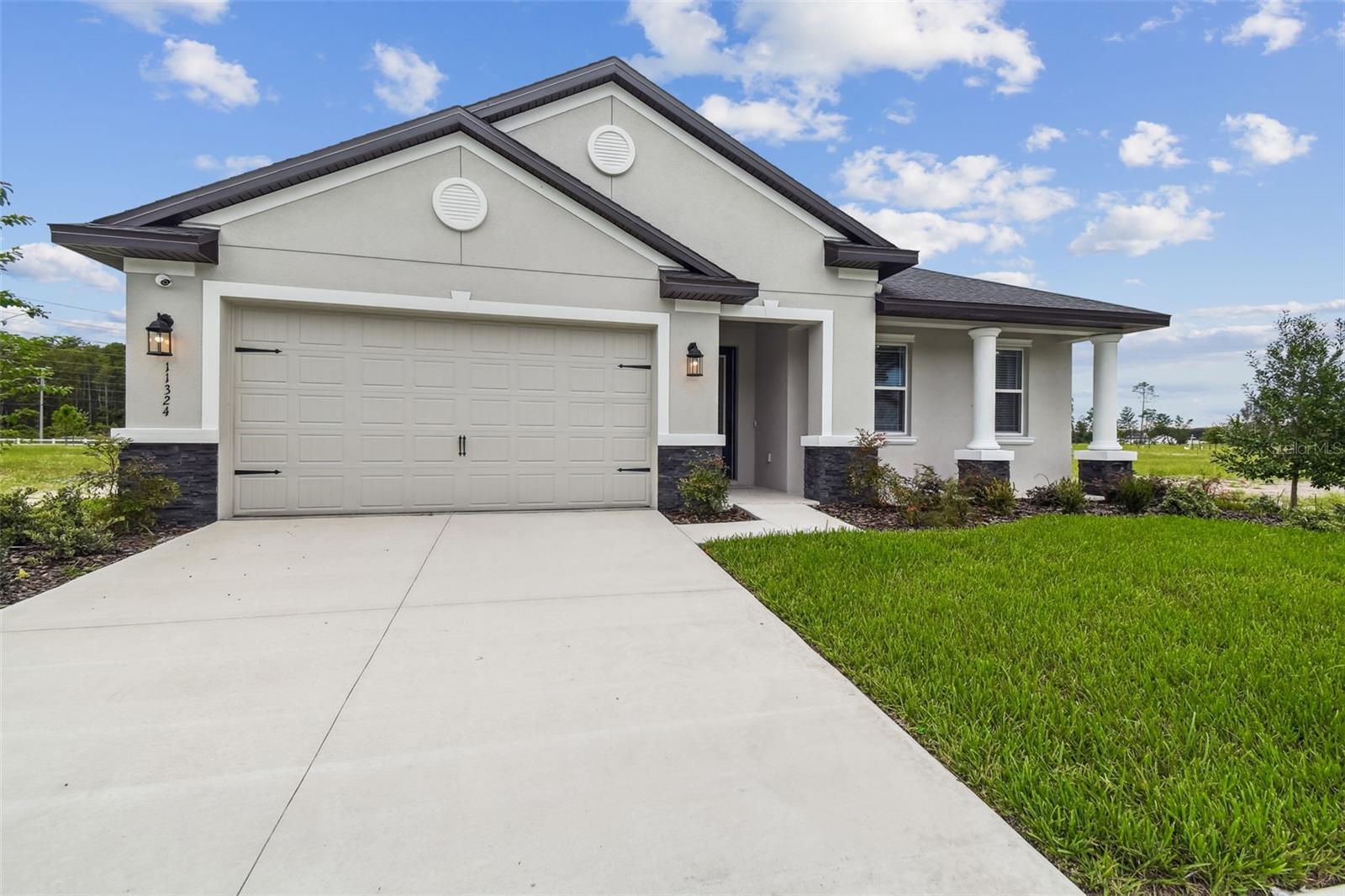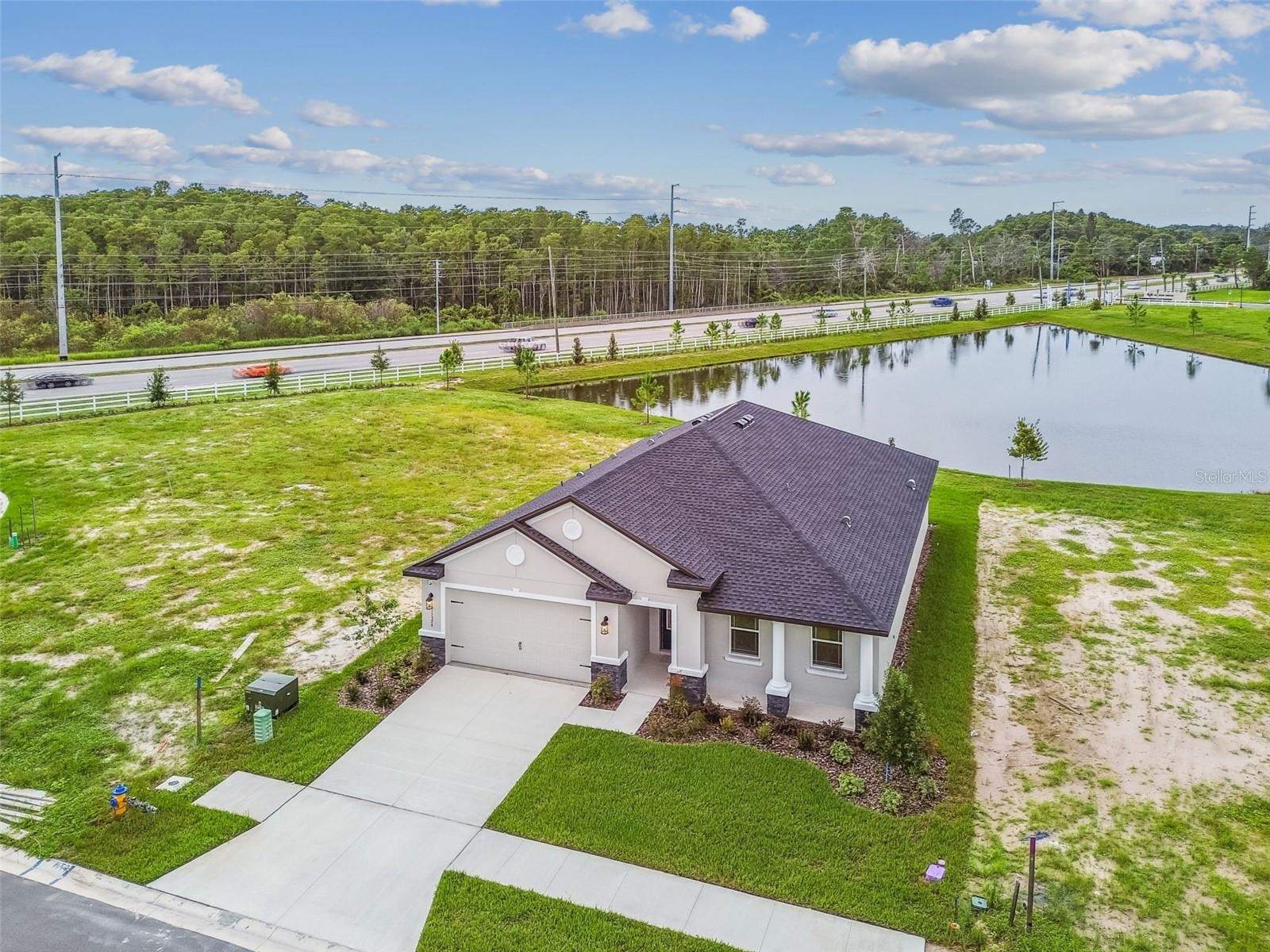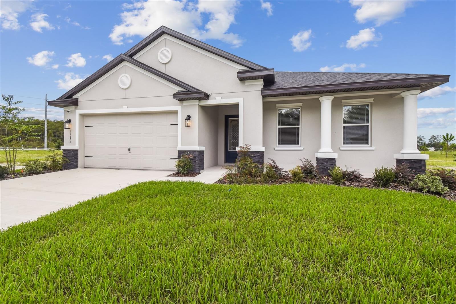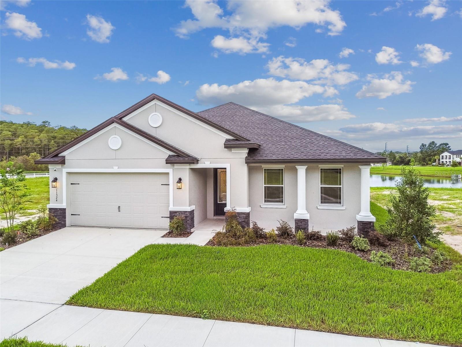 New Price - Don't Miss This Opportunity! This Vitale luxury home offers exceptional curb appeal the moment you arrive on its peaceful cul-de-sac street. The exterior is highlighted by a welcoming front porch with columns, the perfect spot to relax outdoors in the evenings. The lot backs onto a serene pond, providing privacy with no rear neighbors and tranquil views right from your backyard. The Donatello, a brand-new floor plan in this exciting new community, features a spacious and open layout designed for modern living. With three bedrooms, two and a half baths, a dining room, and a large great room, the home blends comfort and style in every detail. Step inside through the front porch into a beautiful foyer with a view extending across the open living areas to the covered lanai beyond. Both the dining room and great room provide access to the lanai, creating an effortless flow for indoor-outdoor entertaining. Tray ceilings add architectural interest throughout the great room, which offers generous space for gathering with family and friends. The main living areas are finished with luxury vinyl plank flooring, while the bathrooms feature designer tile. The home showcases stylish black fixtures, LED lighting, upgraded cabinetry, and thoughtful design touches throughout. In the kitchen, a large center island with seating, ample cabinetry, granite countertops, a tiled backsplash, stainless steel appliances, and a walk-in pantry make it as functional as it is elegant. The resort-style owner’s suite is a retreat of its own, with an expansive bedroom, optional tray ceiling, and an optional private door leading to the lanai. The spa-like bathroom features dual vanities, a corner soaking tub, a spacious tiled walk-in shower with glass enclosure, and a massive walk-in closet. The guest bedrooms are tucked away on one side of the home for privacy and share a full bathroom with the same elevated finishes, while a powder bath near the foyer provides added convenience for visitors. A large laundry room with storage space adds to the home’s functionality. Additional features include five-inch baseboards, luxury vinyl flooring in the main living areas, tile flooring in wet spaces, stainless steel appliances, Low-E double-pane windows, R-38 insulation, irrigation, and other energy-efficient details. With these high-end finishes and modern efficiencies, the Donatello delivers both beauty and value. This residence is part of Hidden Ridge, one of New Port Richey’s newest communities. With easy access to the Suncoast Parkway from Ridge Road, commuting to Tampa is a breeze. The neighborhood is conveniently located just west of Decubellis Road, close to shopping, dining, medical centers, golf courses, and both state and community parks. As the area continues to grow with new construction and commercial centers, now is the perfect time to invest in this enclave community.