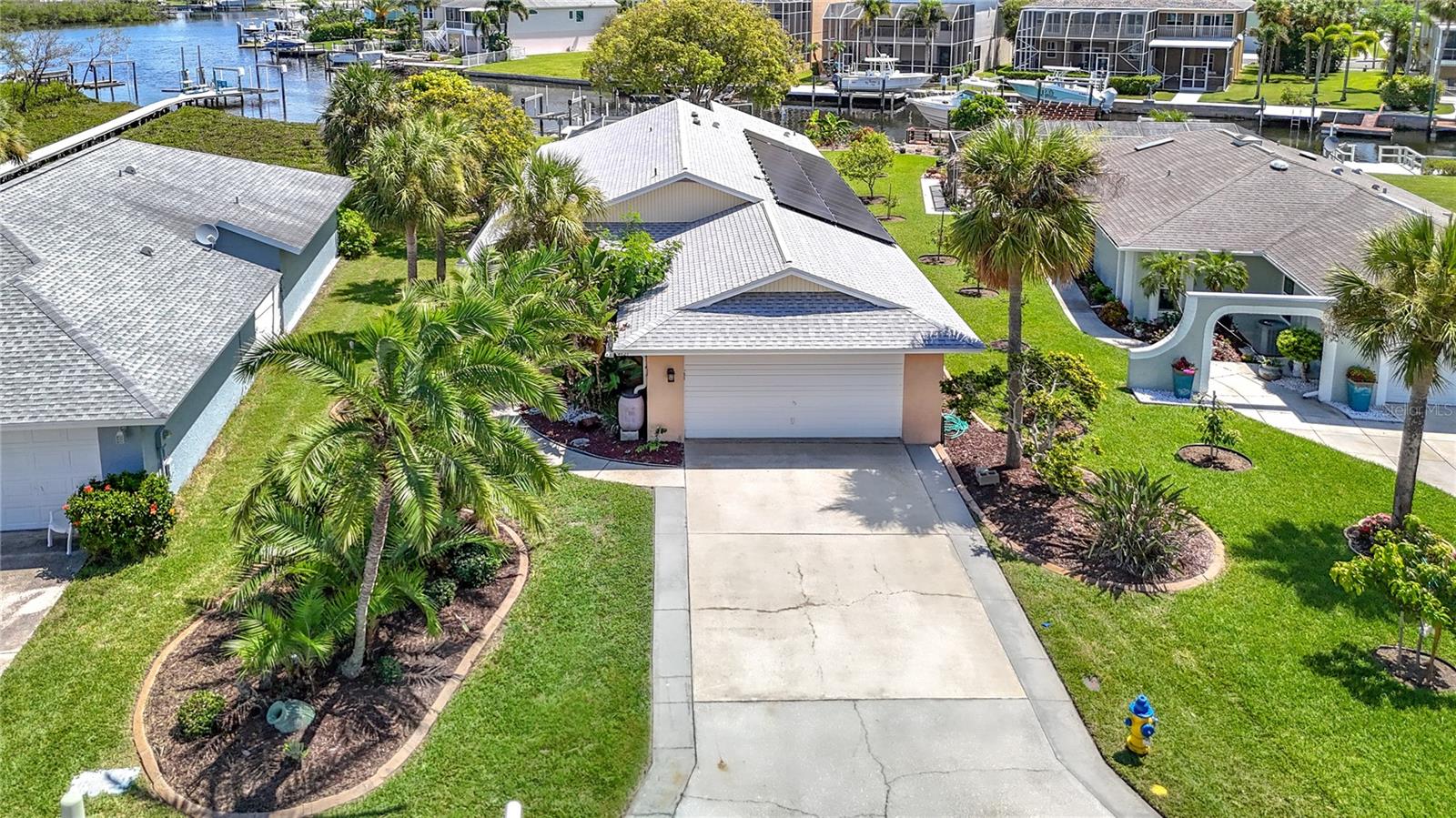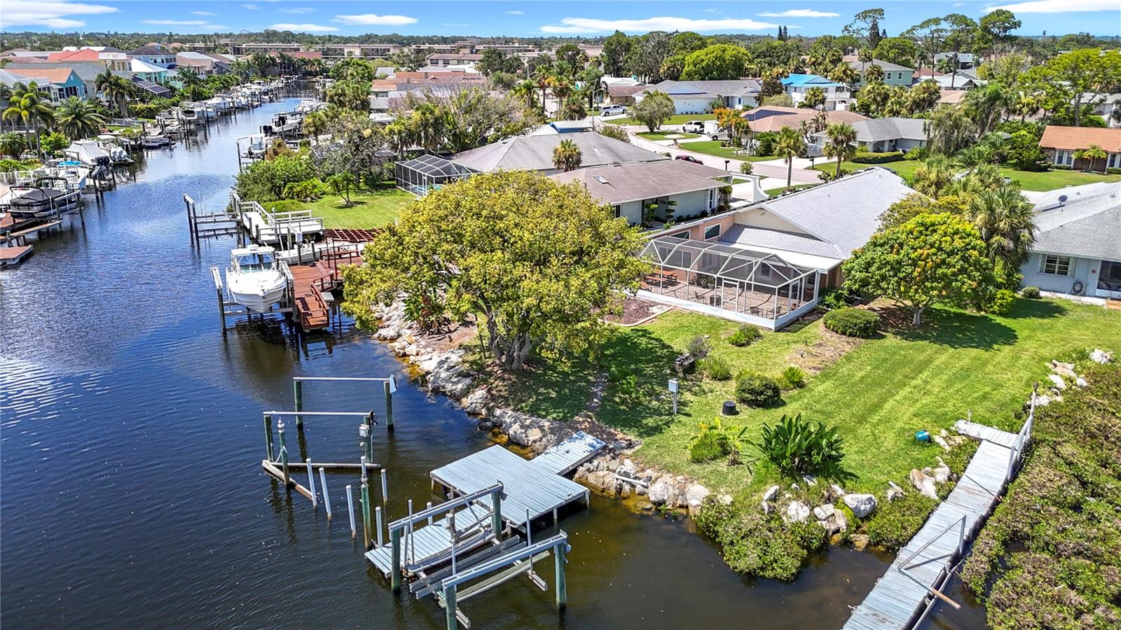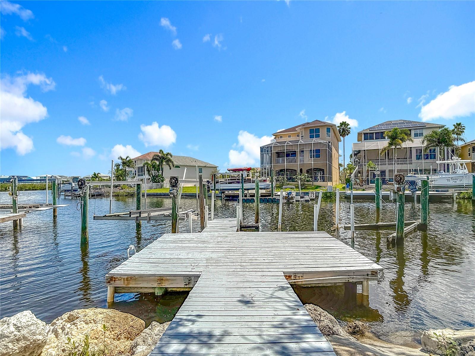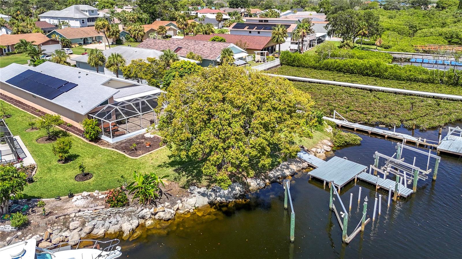 Listed to sell below appraised value! Welcome to your WATERFRONT oasis in the highly sought-after Gulf Harbors Woodlands. This rare 3 bed, 3 bath, plus an office, offers 2,359 sq ft of living space on a private, oversized lot with lush landscaping, fruit trees, and serene views. The home also comes equipped with paid-off solar panels, offering energy efficiency and significant cost savings for years to come. Inside, enjoy an open Great Room layout with vaulted ceilings, hardwood floors, and two sets of French doors that lead to a massive 37’ x 24’ screened lanai, perfect for indoor-outdoor living. The beautifully designed kitchen features quartz counters and brand-new stainless appliances. The spacious primary suite includes hardwood floors, crown molding, walk-in closet, and two full bathrooms. One includes spa-like features and lanai access. Secondary bedrooms are generously sized, with hardwood or carpeted floors, ideal for guests or a home office. The third bathroom is a showstopper, featuring travertine finishes and a custom rain shower. Boaters will love the 84’ seawall, private dock with lift, and direct Gulf access. With low-maintenance living enhanced by the home's fully owned solar energy system, you can enjoy comfort without sacrifice. Community amenities include a pool, tennis courts, clubhouse, and boat ramp. Move-in ready and made for relaxing, just unpack and enjoy.