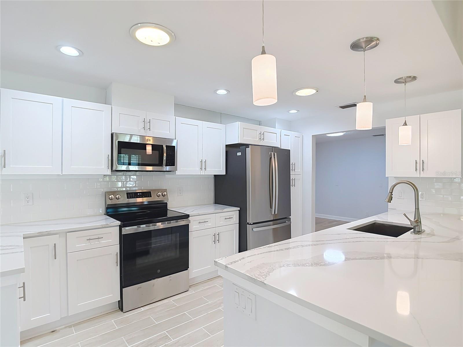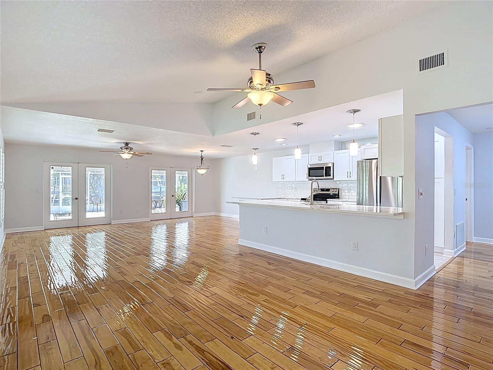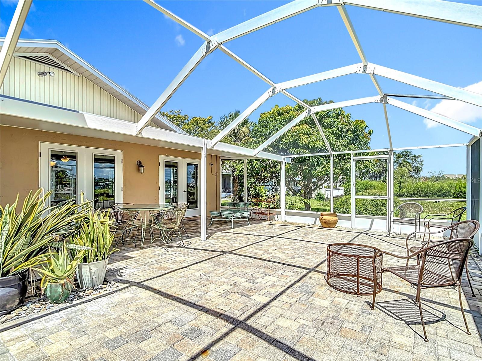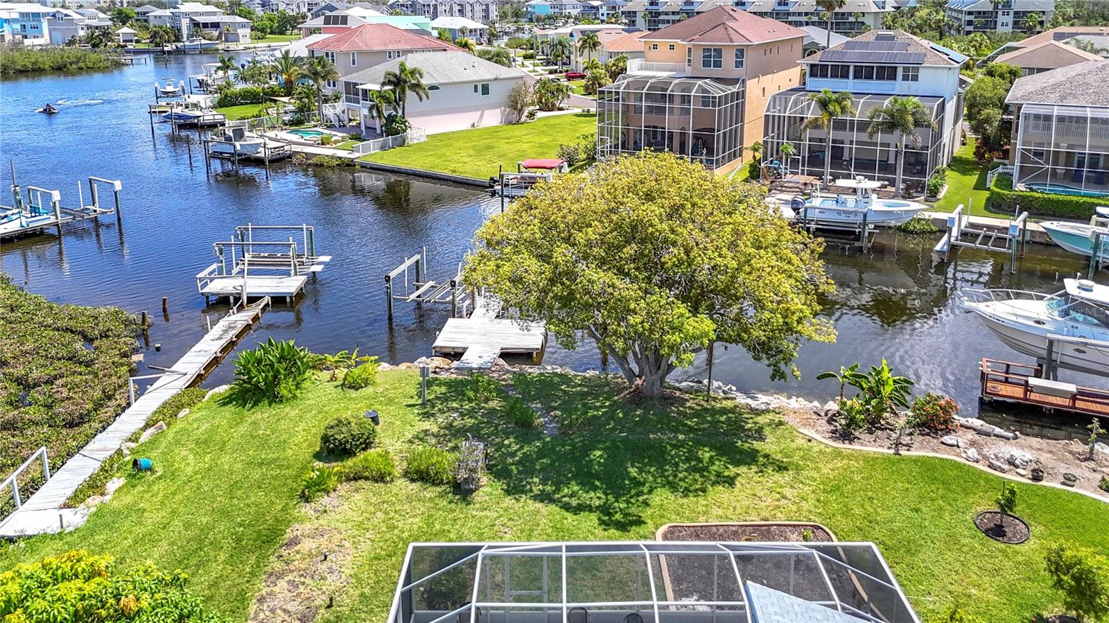 Listed to sell below appraised value! Welcome to your WATERFRONT oasis in the highly sought-after Gulf Harbors Woodlands. This rare 3 bed, 3 bath, plus an office, offers 2,359 sq ft of living space on a private, oversized lot with lush landscaping, fruit trees, and serene views. The home also comes equipped with paid-off solar panels, offering energy efficiency and significant cost savings for years to come. Inside, enjoy an open Great Room layout with vaulted ceilings, hardwood floors, and two sets of French doors that lead to a massive 37’ x 24’ screened lanai, perfect for indoor-outdoor living. The beautifully designed kitchen features quartz counters and brand-new stainless appliances. The spacious primary suite includes hardwood floors, crown molding, walk-in closet, and two full bathrooms. One includes spa-like features and lanai access. Secondary bedrooms are generously sized, with hardwood or carpeted floors, ideal for guests or a home office. The third bathroom is a showstopper, featuring travertine finishes and a custom rain shower. Boaters will love the 84’ seawall, private dock with lift, and direct Gulf access. With low-maintenance living enhanced by the home's fully owned solar energy system, you can enjoy comfort without sacrifice. Community amenities include a pool, tennis courts, clubhouse, and boat ramp. Move-in ready and made for relaxing, just unpack and enjoy.