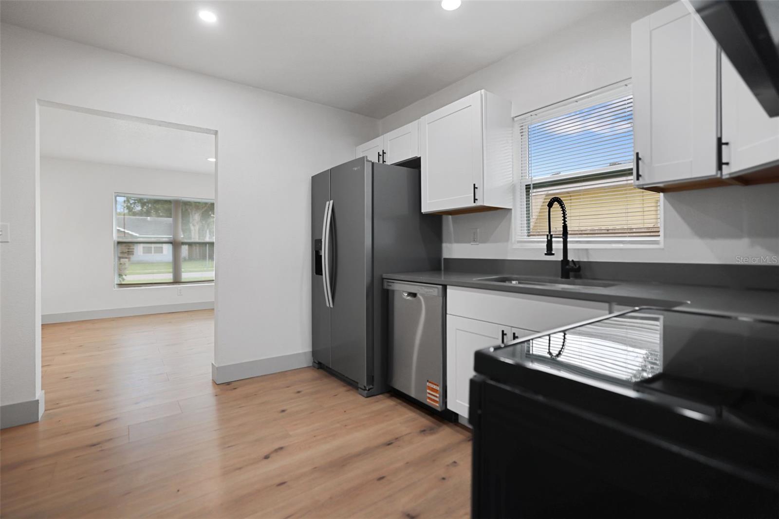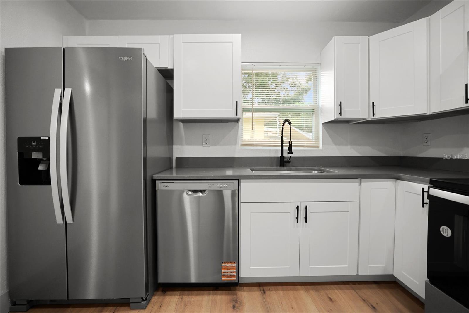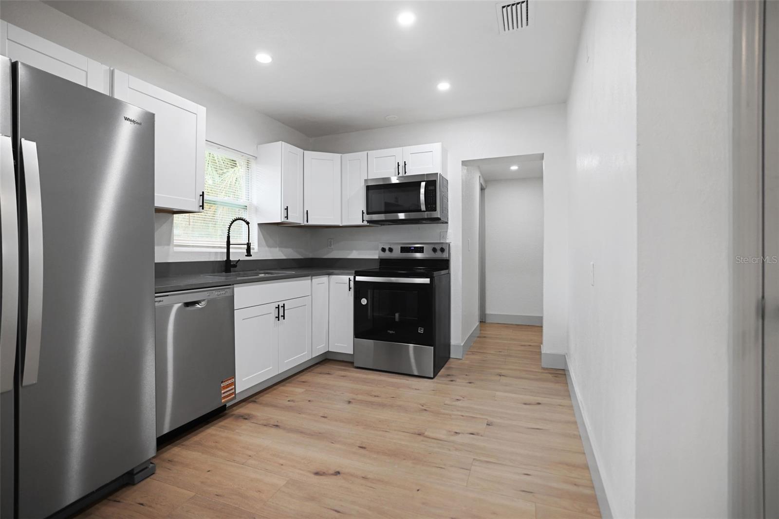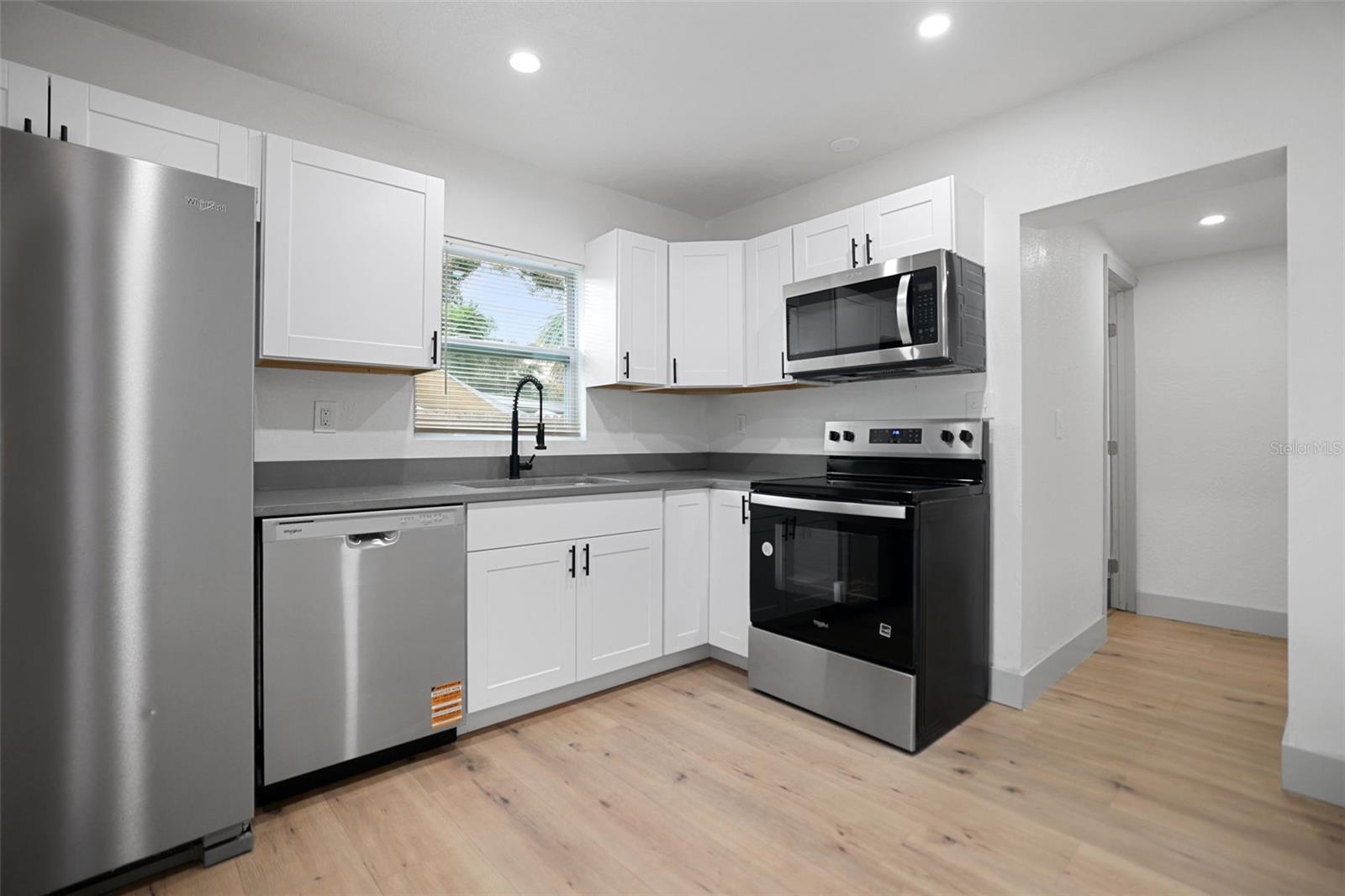 Welcome Home! Discover this beautifully remodeled 3-bedroom, 2-bath residence that perfectly blends charm, functionality, and endless potential. Step inside to find a bright and airy open layout adorned with stunning waterproof wood laminate flooring, fresh paint throughout, and stylish recessed lighting. The modern kitchen boasts new cabinetry, luxurious quartz countertops, and brand-new appliances, while both bathrooms have been tastefully updated with elegant tile finishes and contemporary vanities. The abundant natural light that fills the living areas creates a warm and inviting atmosphere. This home is equipped with a new roof, brand-new AC, New Windows, new wood fencing, and fresh paint both inside and out. Every detail has been thoughtfully addressed with new bathrooms, new windows, new light fixtures, and new doors—essentially, it's all new! A standout feature is the detached 2-car garage with electric convenient alley access, complemented by a versatile bonus outbuilding that can serve as a storage space or even a future pool bath if you decide to add a pool. The 0.17-acre lot provides ample space for gardening, entertaining, or expanding your outdoor living area. Conveniently situated near downtown New Port Richey, you'll be just moments away from shops, restaurants, Sims Park, local festivals, and the picturesque riverfront. Quick access to US-19 and the Suncoast Parkway makes commuting a breeze, and the stunning Gulf beaches are only a short drive away.