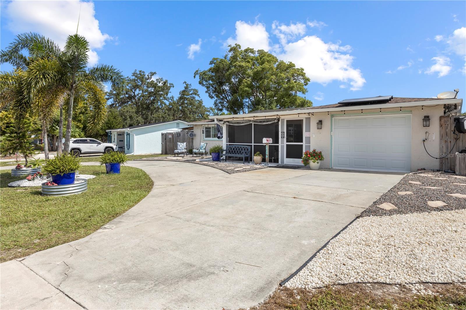 NO HOA OR CDD. Discover this beautifully maintained 3-bedroom, 2-bathroom single-family home in the heart of New Port Richey. Designed with efficiency and convenience in mind, this home features paid-off solar panels that keep the electric bill at just ~$35/month, a new upgraded electric service panel, a newer HVAC (2019), roof (2018), and storm impact windows for lasting peace of mind. The plumbing has been upgraded to current building materials and functionality. Inside, the upgraded kitchen and bathrooms showcase granite countertops, custom finishes, and modern touches throughout. A thoughtful addition provides a huge walk-in closet in the primary suite and a spacious walk-in pantry off the kitchen, creating both style and functionality. The home also features plantation shutters, which highlight the abundant natural light and further add to the home’s appeal!. The above-ground pool has been integrated seamlessly into the backyard, providing a cool oasis on a sunny day. A circular driveway ensures ample parking for you and your guests and the golf cart carport provides a space for your smaller vehicles. The home's enhanced landscape includes customized drainage and a communal area in the front yard. Perfectly located around the corner from Gulf High School and a local fire station, the home also offers quick access to downtown New Port Richey, shops, dining, Gulf beaches, and the scenic Pithlachascotee River. Move-in ready and filled with smart upgrades, this home is the perfect blend of comfort, convenience, and long-term value.