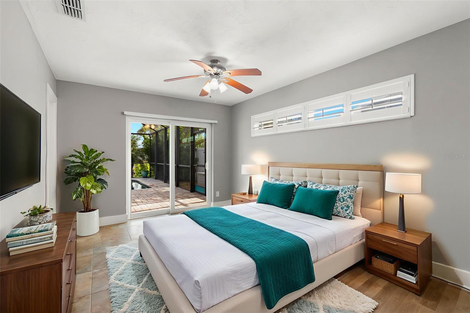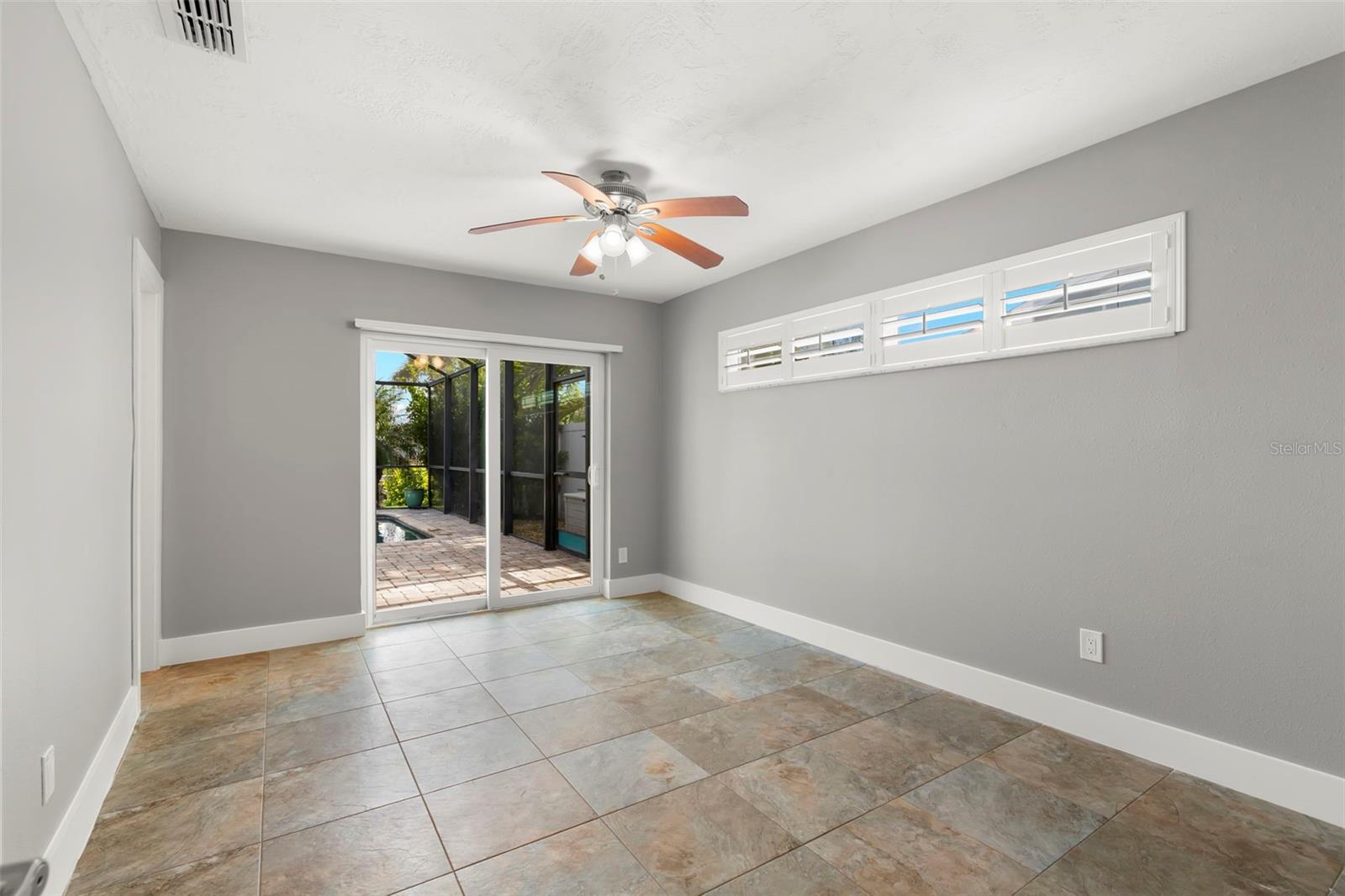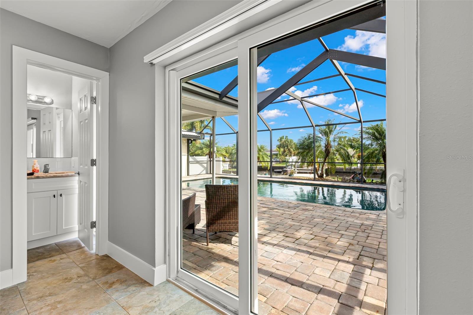 Deck, In Ground, Outside Bath Access, Pool Sweep, Salt Water, Screen Enclosure, Solar Cover, Vinyl