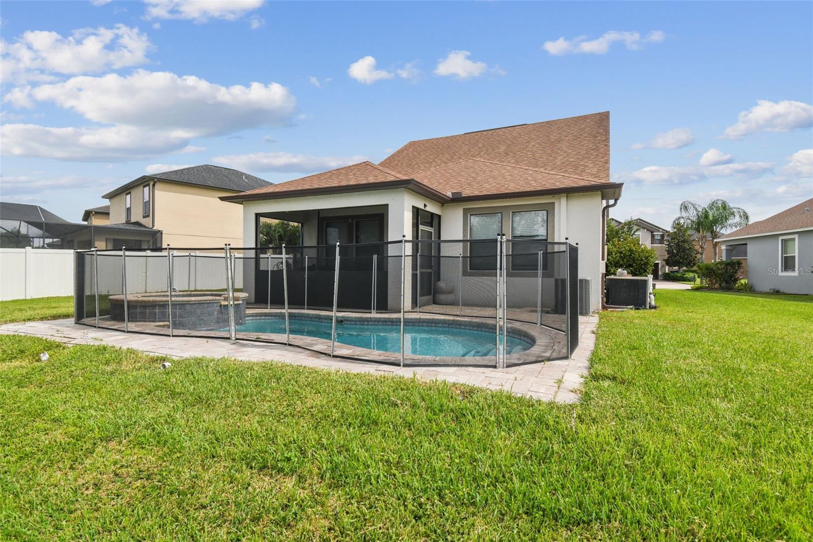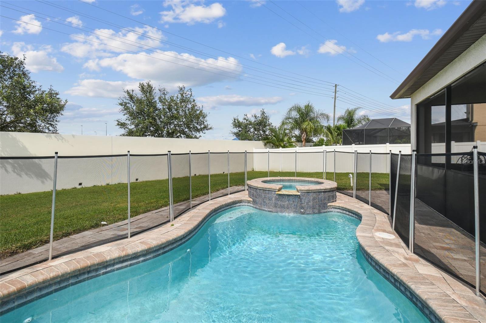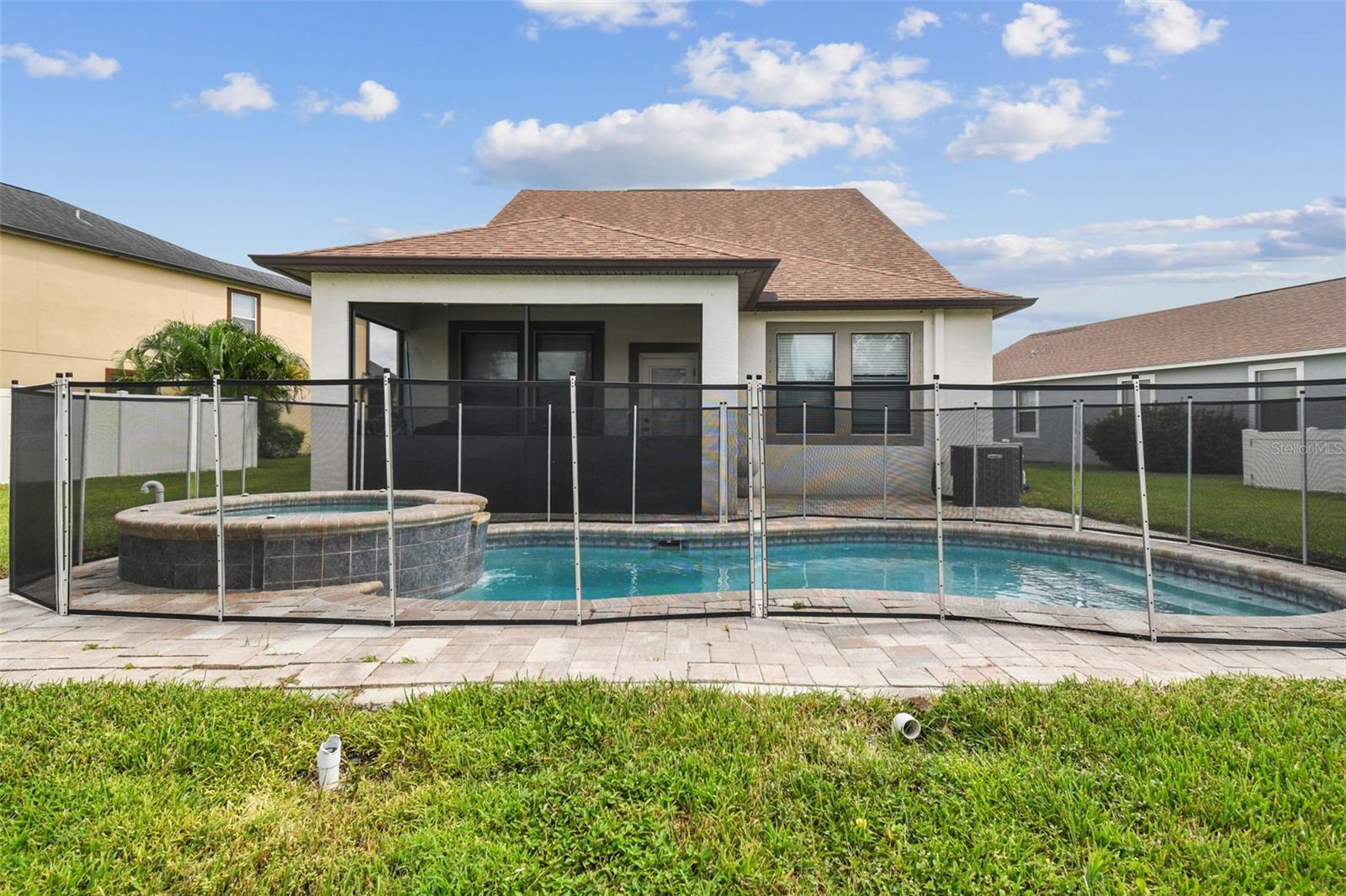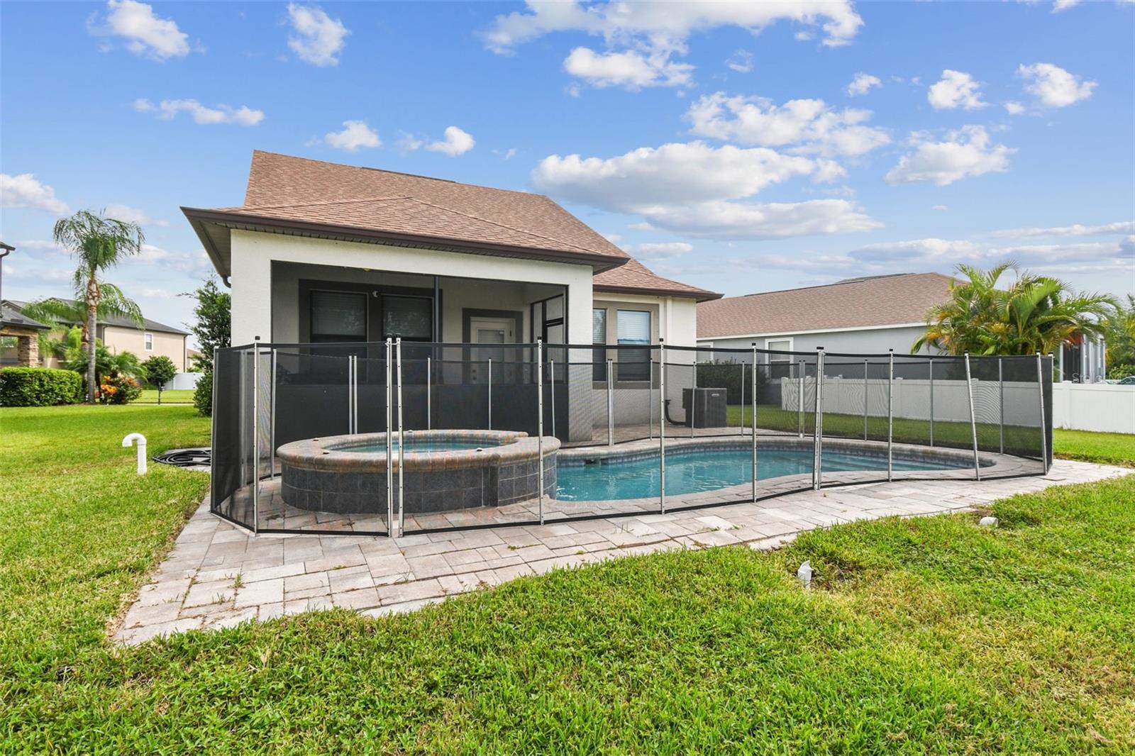 Welcome to this beautifully designed 3 bedroom, 3 bathroom home located in the desirable gated community of the Villages at Trinity Lakes. This two story residence offers the perfect blend of comfort and style, with the primary suite conveniently located downstairs. The spacious open floor plan features a large kitchen with an island that flows seamlessly into the living and dining areas, making it ideal for entertaining. Step outside to your private oasis with a covered patio, pavered deck, and a sparkling pool with jacuzzi, perfect for relaxing or hosting gatherings. The pool is heated with a variable speed and energy efficient pool pump and motor. There are no rear neighbors which affords additional privacy. The primary suite includes a walk-in closet and en suite bathroom, creating a tranquil retreat. Upstairs, you’ll find two additional bedrooms with fill walk in closets, a versatile loft space ideal for a home office, playroom, or media area, and a full bathroom. Importantly, none of the upstairs bedrooms are located over the garage or directly over the primary bedroom, providing a quieter and more private atmosphere for everyone. In most two-story homes, the bedrooms are over the garage which makes them a lot hotter or over the living room and primary bedroom where you can hear footsteps at night. In this home, this does not happen. This is a very convenient and awesome part of this set up. For even more peace of mind, this home comes with transferable warranties for the AC unit and pool heater along with the structural roof and foundation warranty from the original builder. With a pavered driveway, a well-maintained neighborhood, and the safety of a gated community, this home truly has it all.