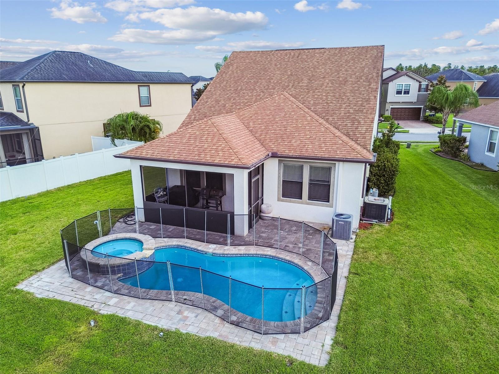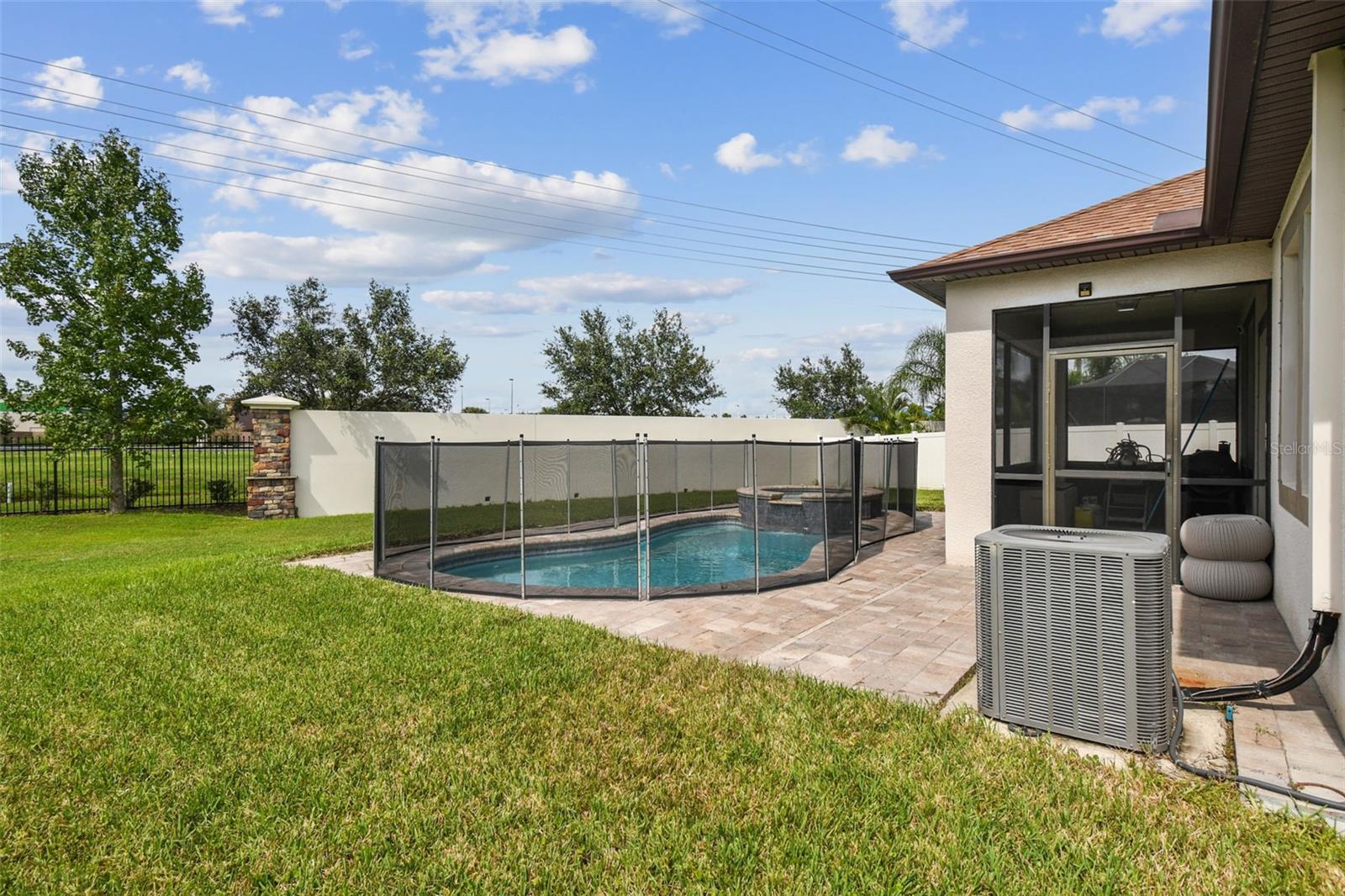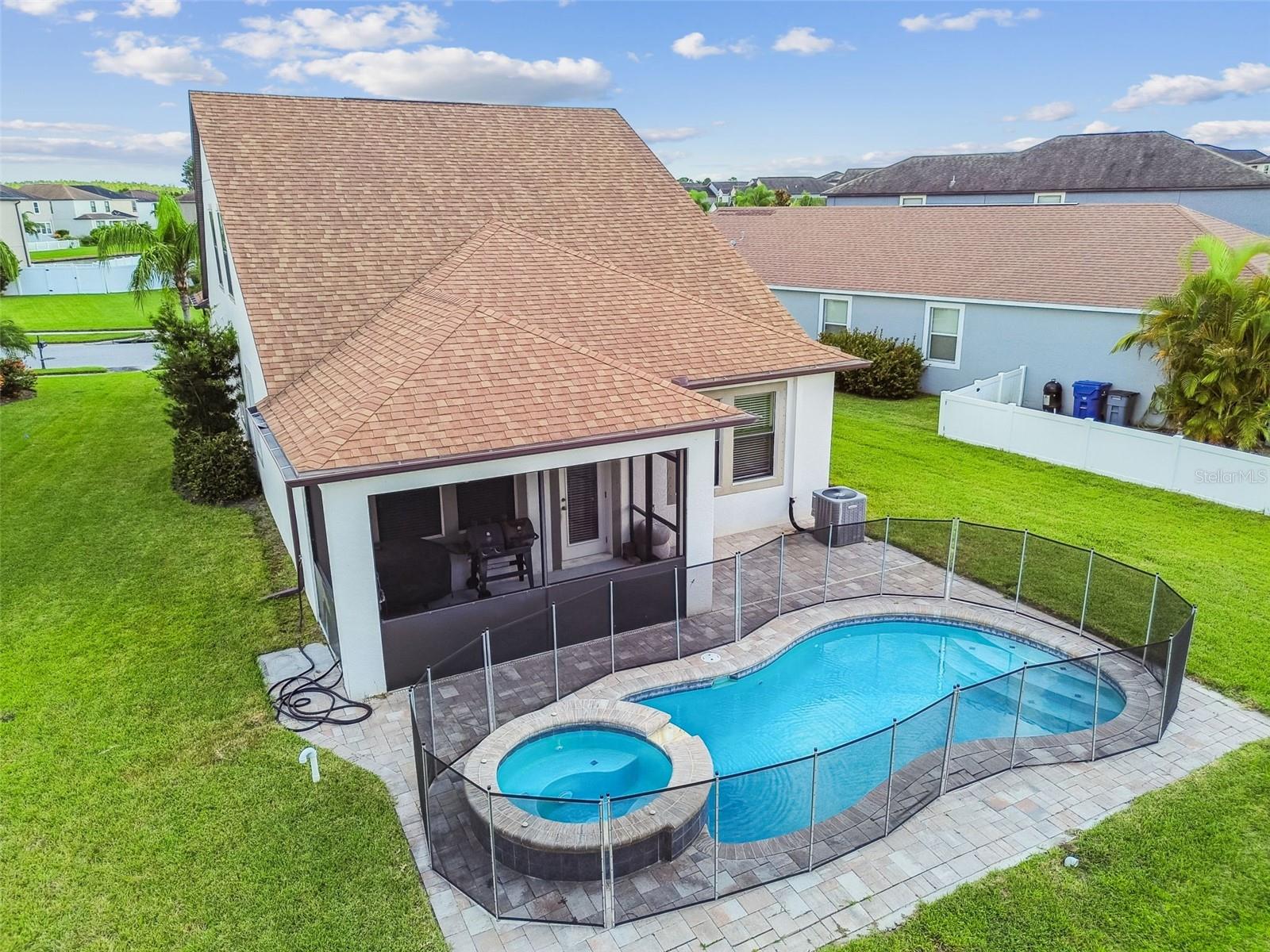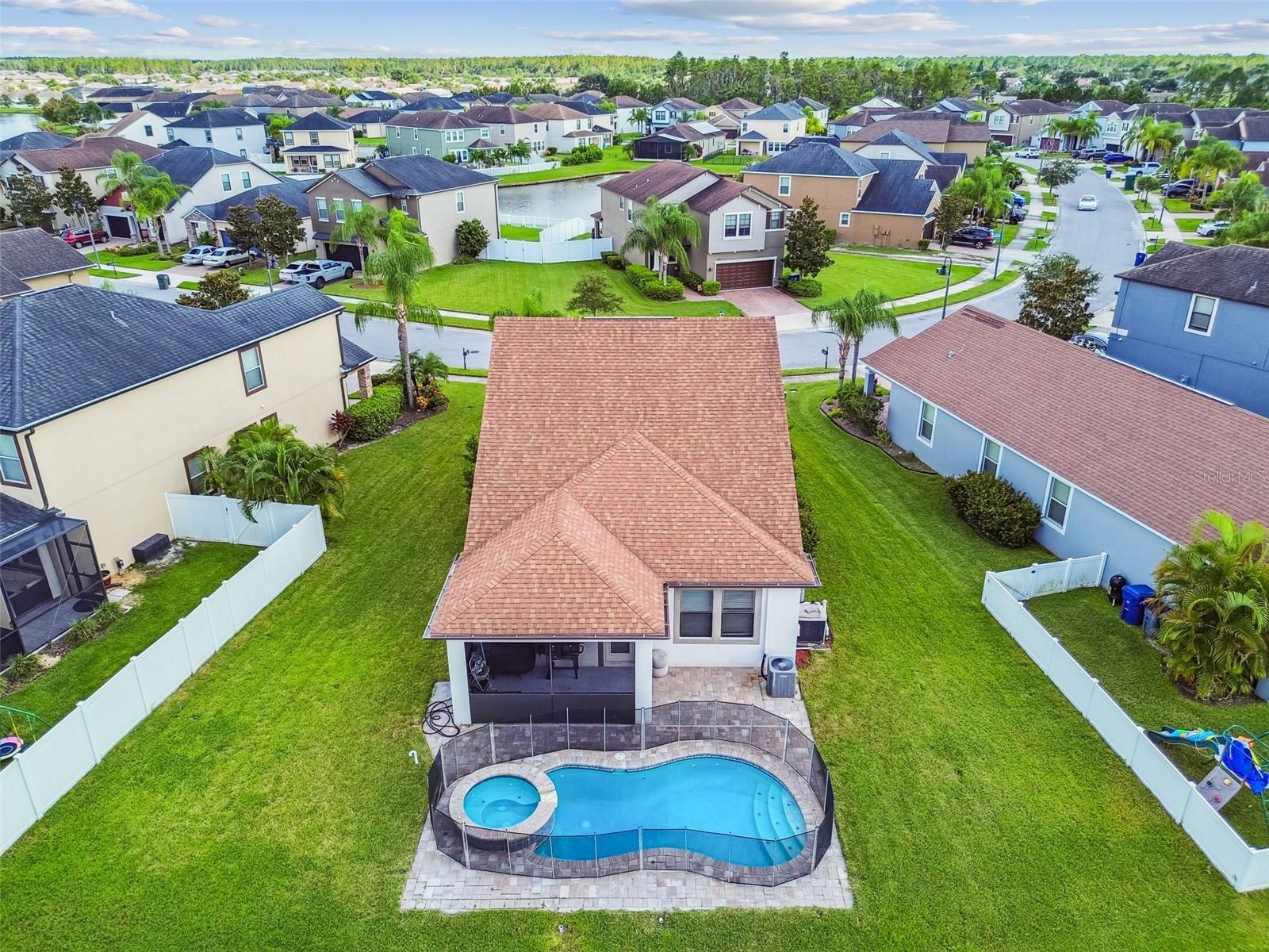 Welcome to this beautifully designed 3 bedroom, 3 bathroom home located in the desirable gated community of the Villages at Trinity Lakes. This two story residence offers the perfect blend of comfort and style, with the primary suite conveniently located downstairs. The spacious open floor plan features a large kitchen with an island that flows seamlessly into the living and dining areas, making it ideal for entertaining. Step outside to your private oasis with a covered patio, pavered deck, and a sparkling pool with jacuzzi, perfect for relaxing or hosting gatherings. The pool is heated with a variable speed and energy efficient pool pump and motor. There are no rear neighbors which affords additional privacy. The primary suite includes a walk-in closet and en suite bathroom, creating a tranquil retreat. Upstairs, you’ll find two additional bedrooms with fill walk in closets, a versatile loft space ideal for a home office, playroom, or media area, and a full bathroom. Importantly, none of the upstairs bedrooms are located over the garage or directly over the primary bedroom, providing a quieter and more private atmosphere for everyone. In most two-story homes, the bedrooms are over the garage which makes them a lot hotter or over the living room and primary bedroom where you can hear footsteps at night. In this home, this does not happen. This is a very convenient and awesome part of this set up. For even more peace of mind, this home comes with transferable warranties for the AC unit and pool heater along with the structural roof and foundation warranty from the original builder. With a pavered driveway, a well-maintained neighborhood, and the safety of a gated community, this home truly has it all.